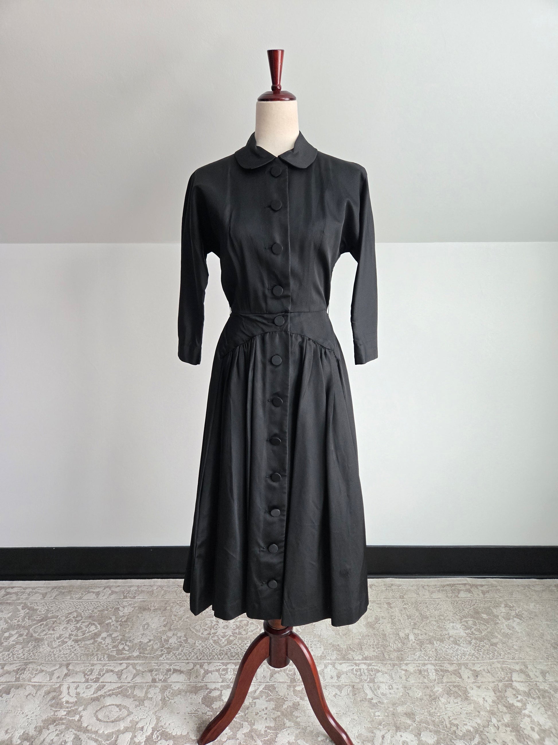 Vintage 1940s thick satin black dress with large fabric covered buttons down center front and the cutest peter pan collar. This dress has the most gorgeous seaming that I have seen. It is tailored perfectly around the waistline. It is in perfect condition which is very rare for its age. Was definitely hand made and done really well.