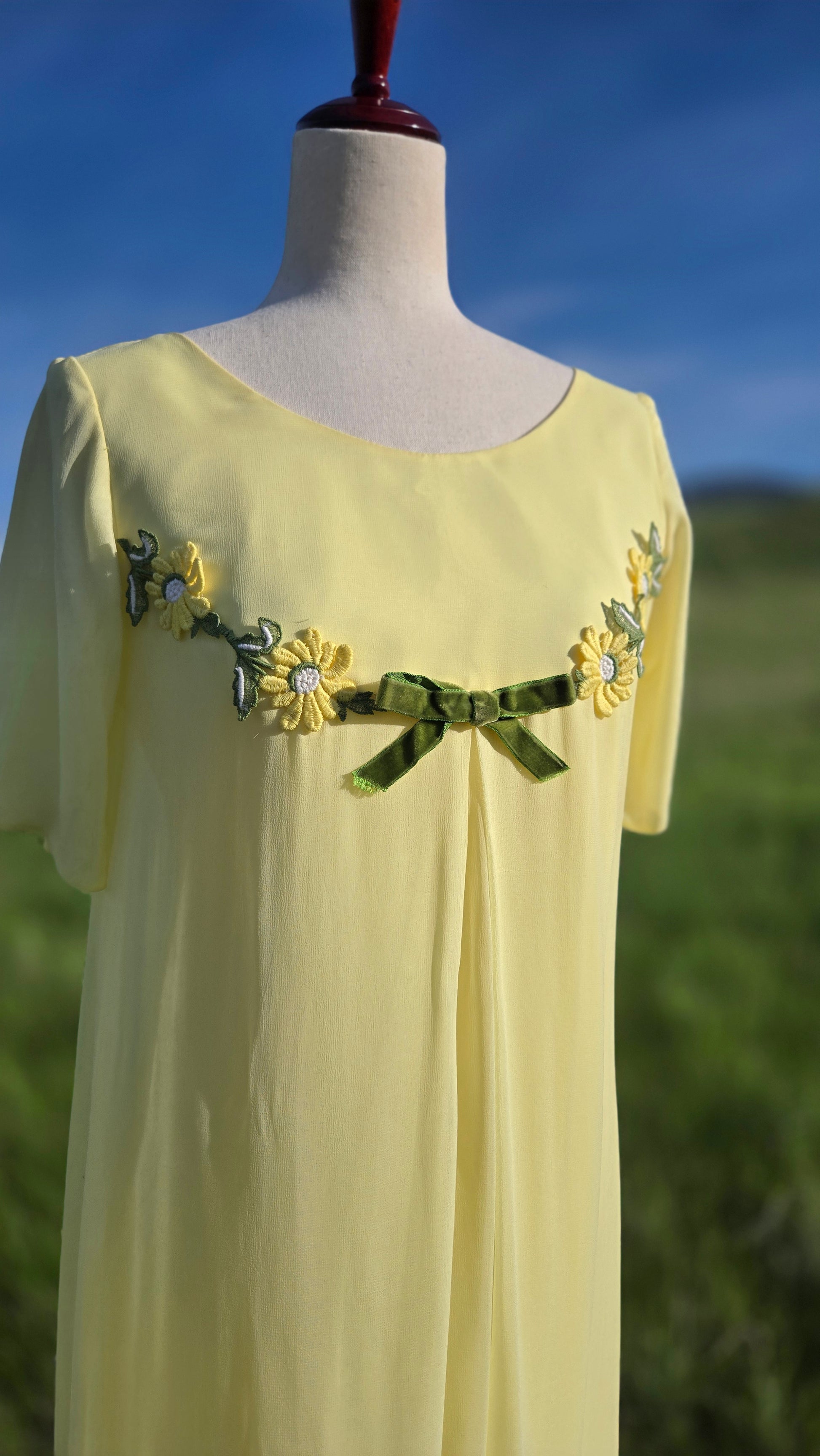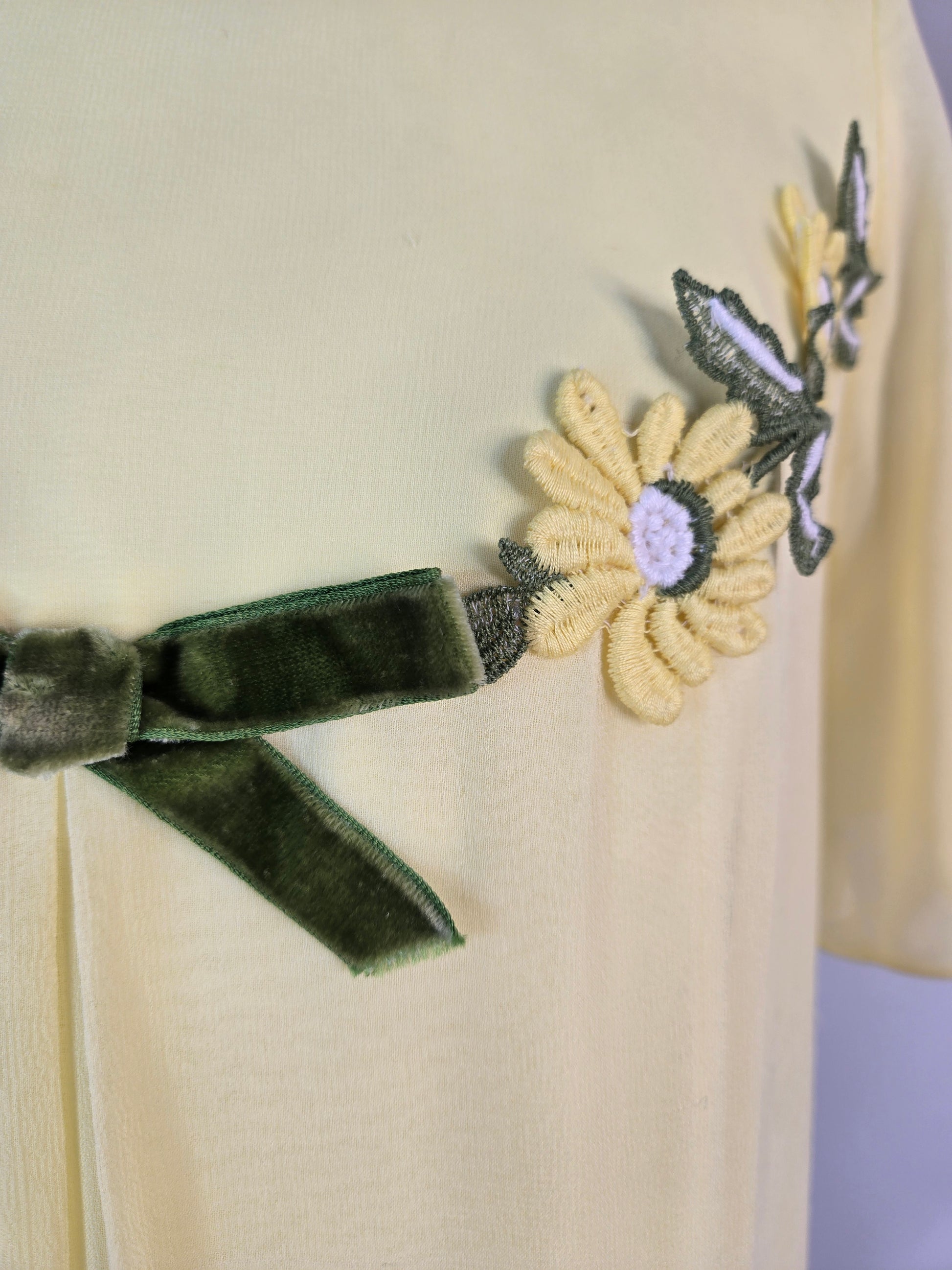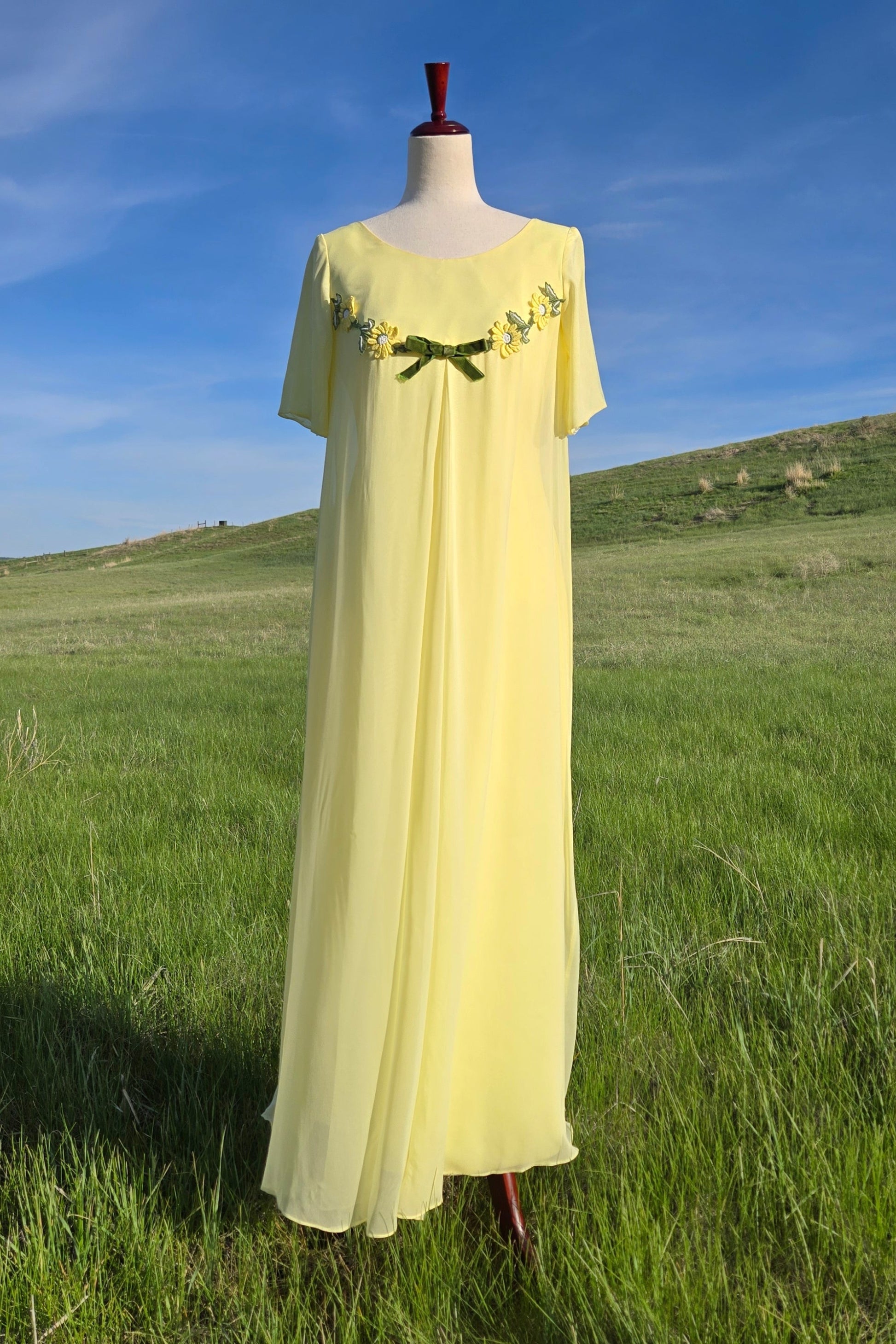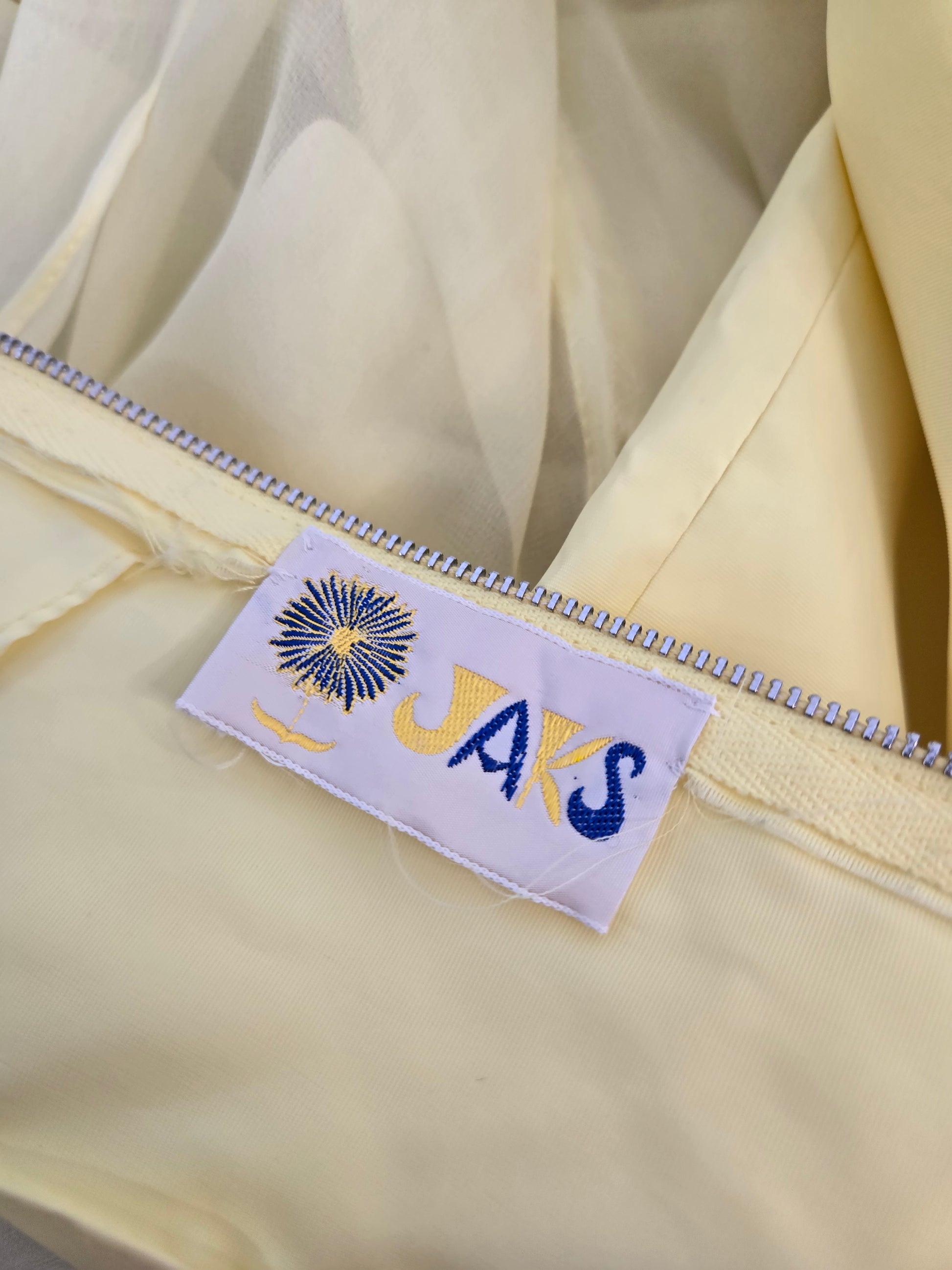 Jaks vintage 1960s formal yellow dress with an acetate liner and a gorgeous draping chiffon fabric overlay with center pleat for fullness. It has small shear chiffon sleeves and a gorgeous pattern of floral embroideries around the front neckline, finished with a olive green velvet bow in the center. It has a metal zipper down the back and crispy vintage tags on the inside. It is in amazing condition and has been personally dry cleaned by myself.