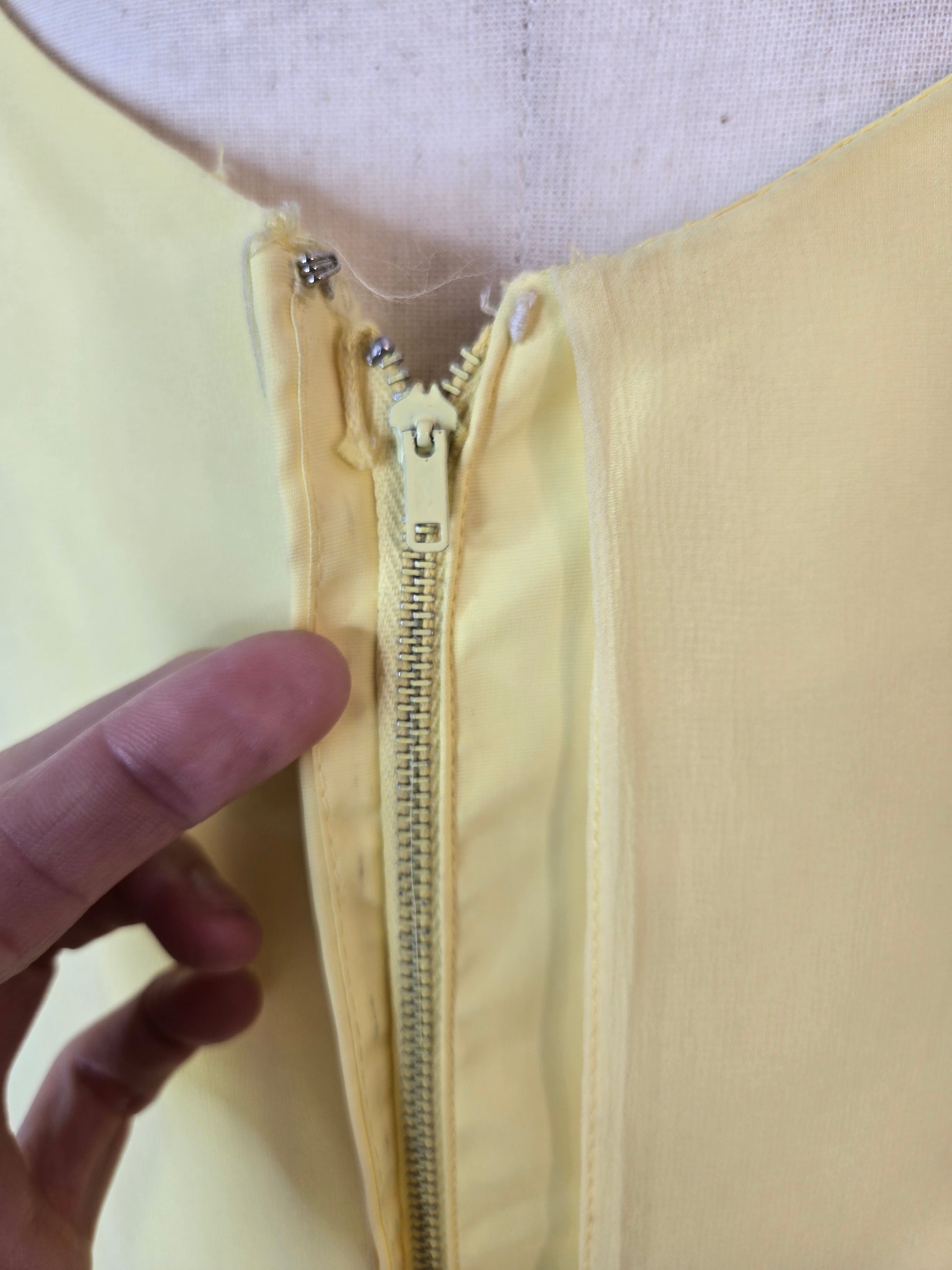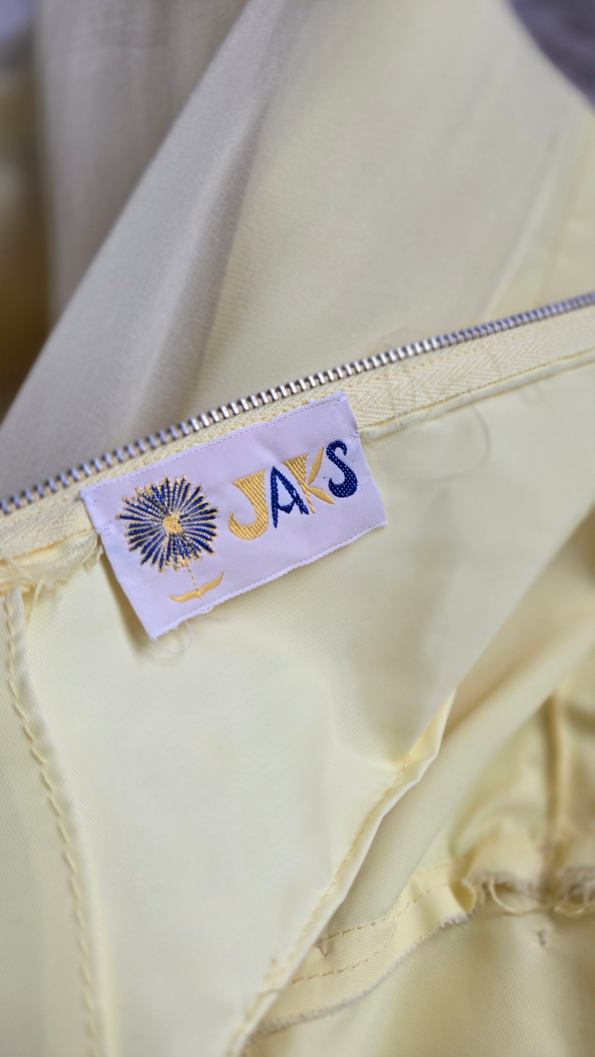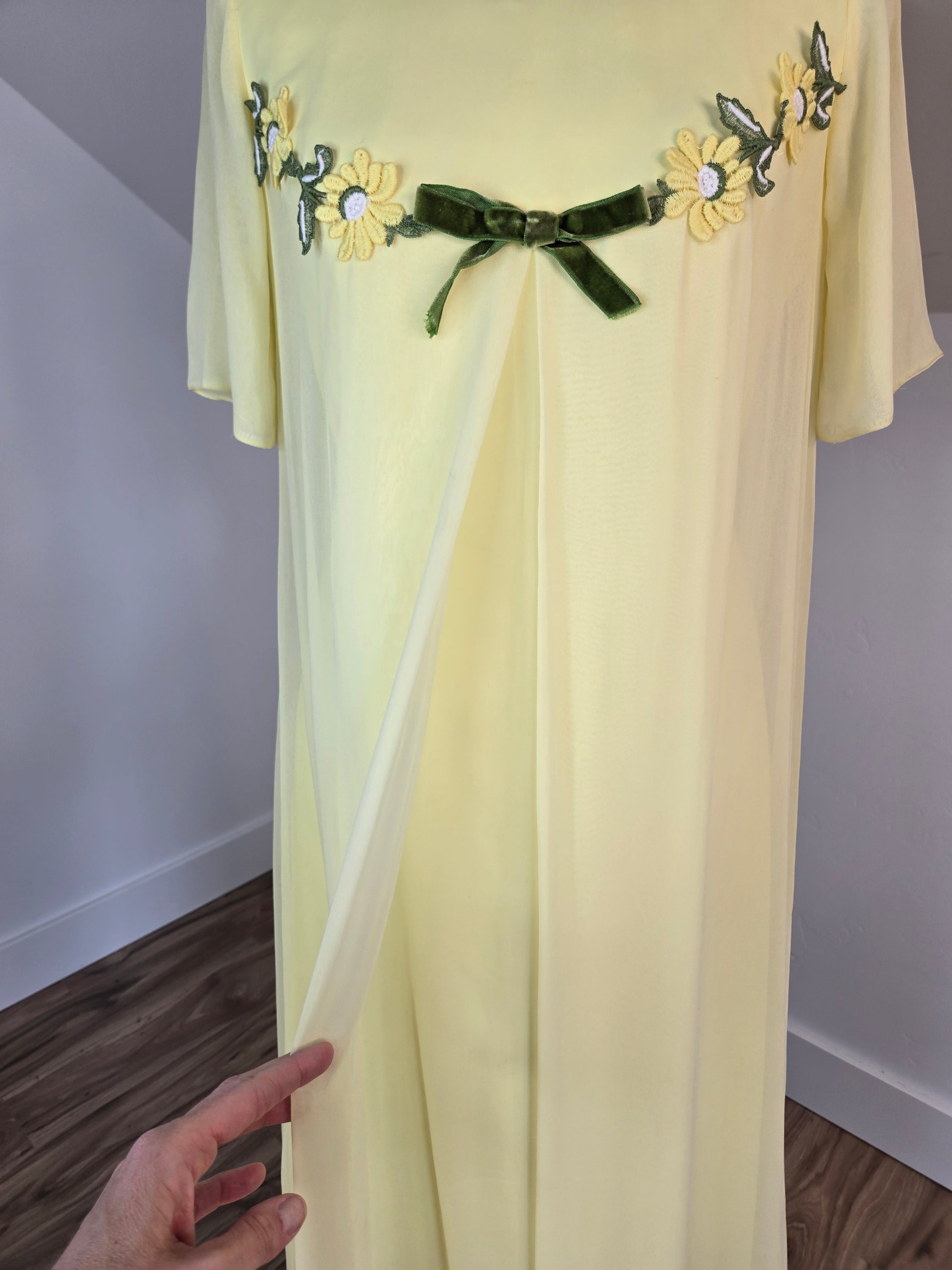 Jaks vintage 1960s formal yellow dress with an acetate liner and a gorgeous draping chiffon fabric overlay with center pleat for fullness. It has small shear chiffon sleeves and a gorgeous pattern of floral embroideries around the front neckline, finished with a olive green velvet bow in the center. It has a metal zipper down the back and crispy vintage tags on the inside. It is in amazing condition and has been personally dry cleaned by myself.