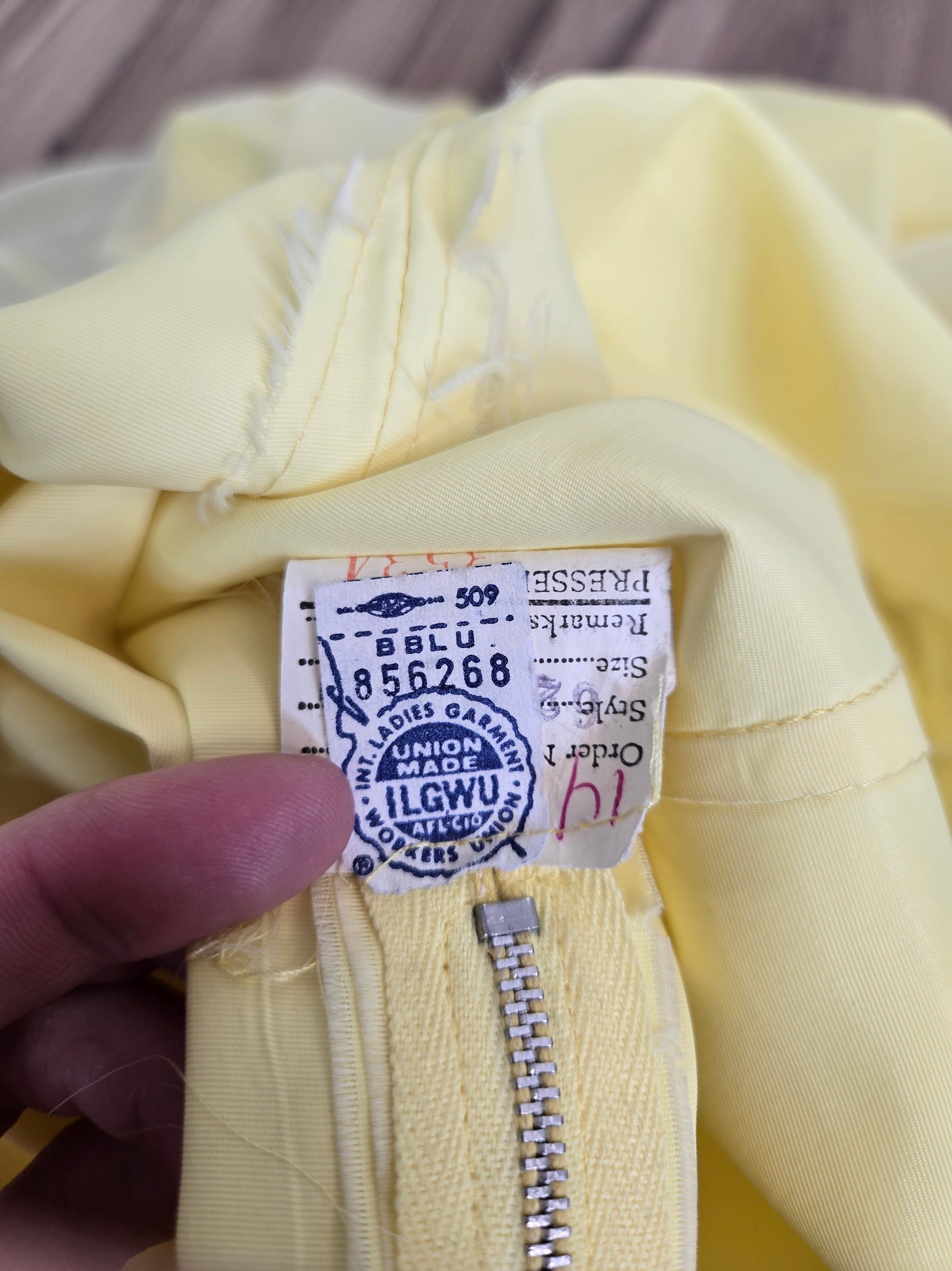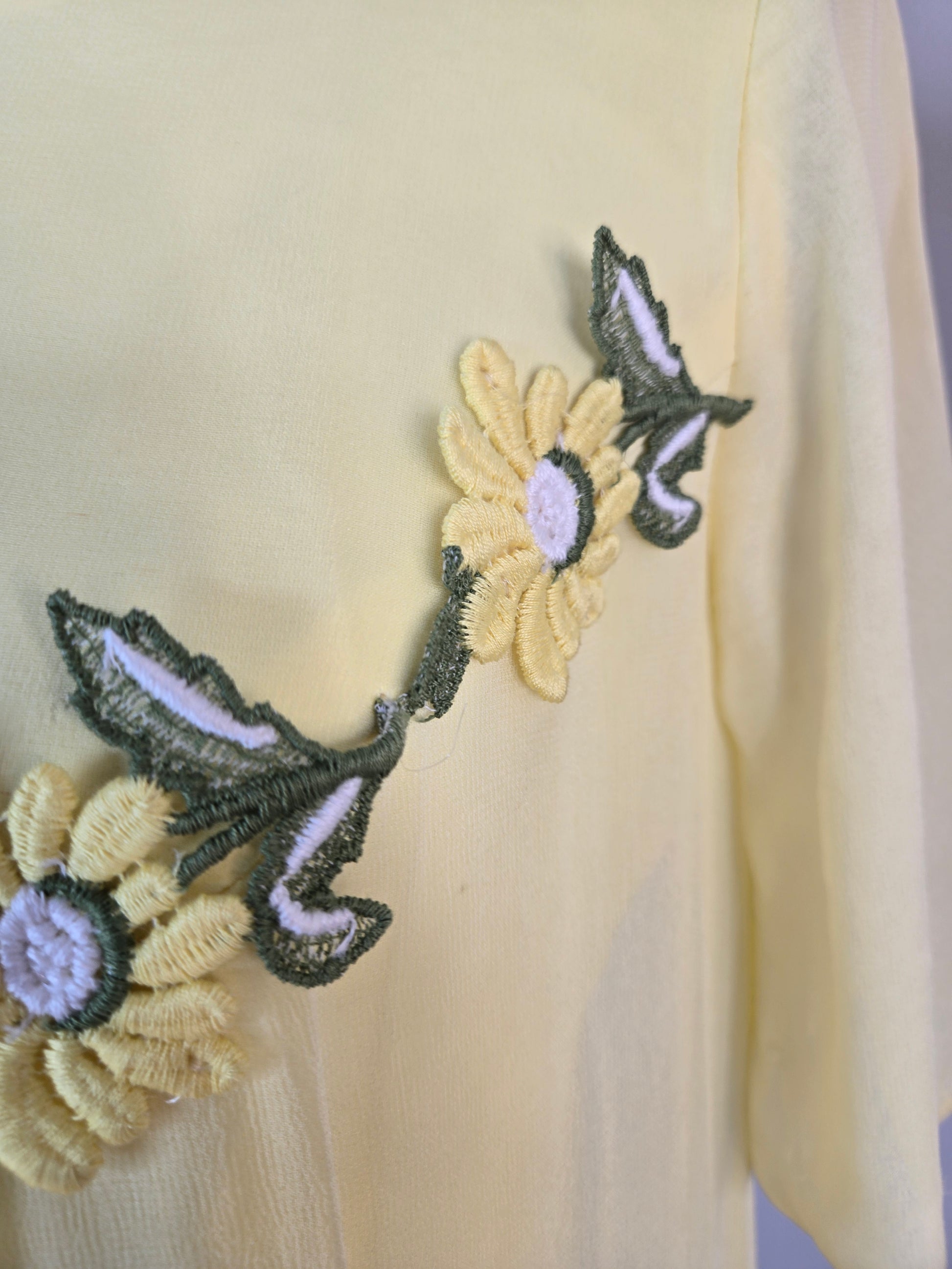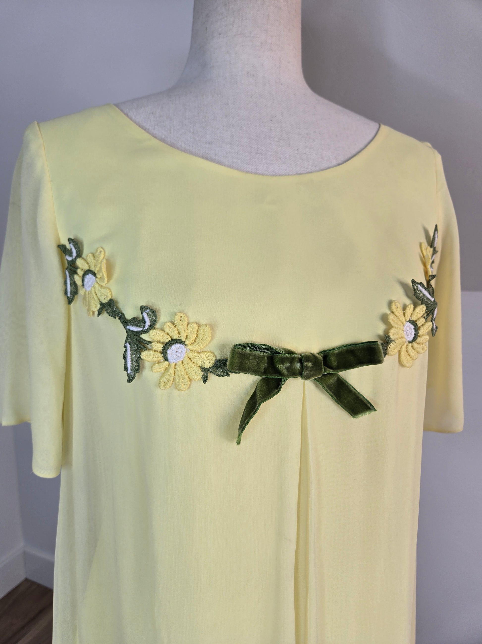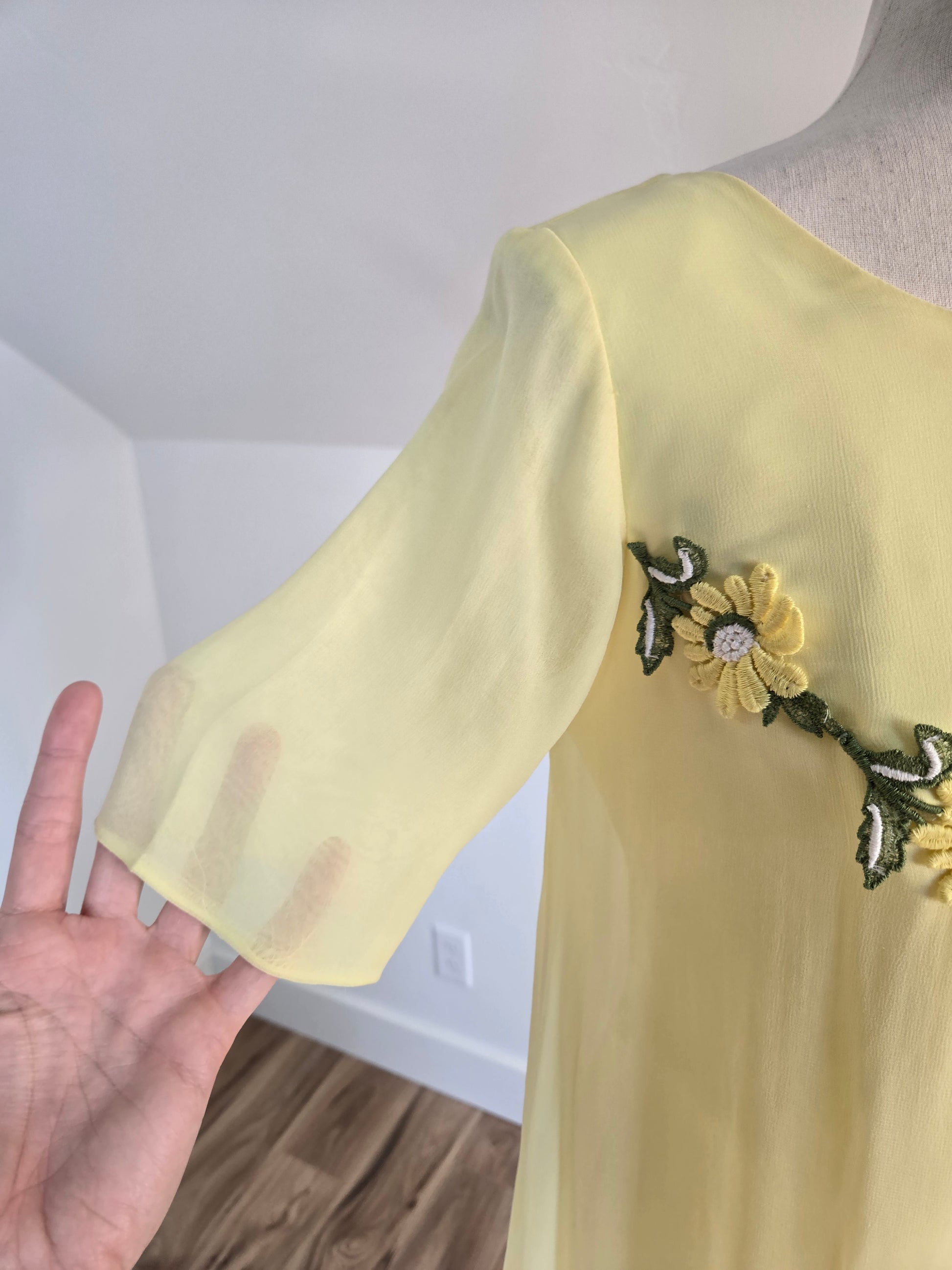 Jaks vintage 1960s formal yellow dress with an acetate liner and a gorgeous draping chiffon fabric overlay with center pleat for fullness. It has small shear chiffon sleeves and a gorgeous pattern of floral embroideries around the front neckline, finished with a olive green velvet bow in the center. It has a metal zipper down the back and crispy vintage tags on the inside. It is in amazing condition and has been personally dry cleaned by myself.