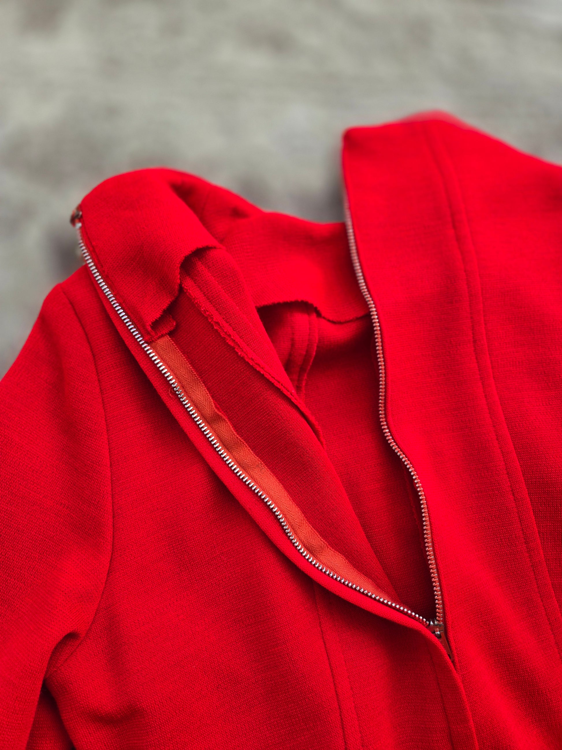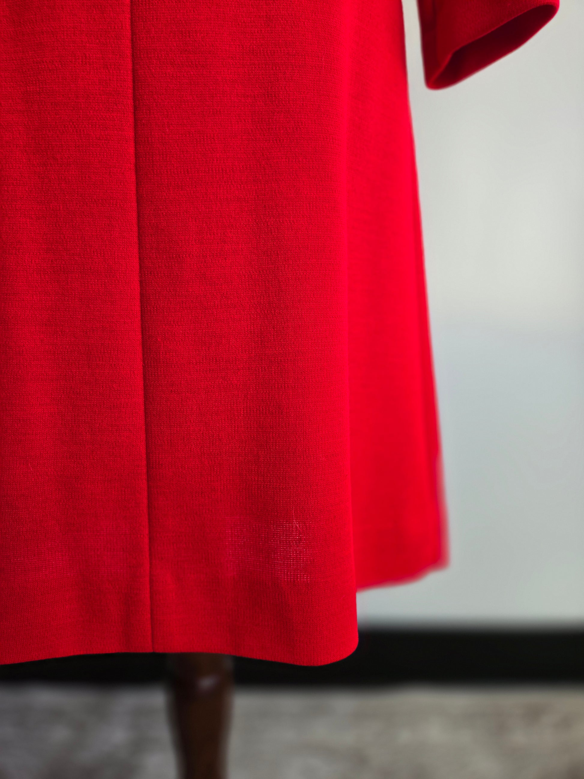 Gorgeous fire red 1960s poly knit long sleeve dress. It has tailored darting that starts at then neckline and goes all the way to the waist of the dress and then has some ruching at the back to create the flare. The belt at the waist is technically removable and attaches at each button on the side. There is a metal zipper in the back and it is in perfect condition. I have washed and steamed it and it is ready to wear!