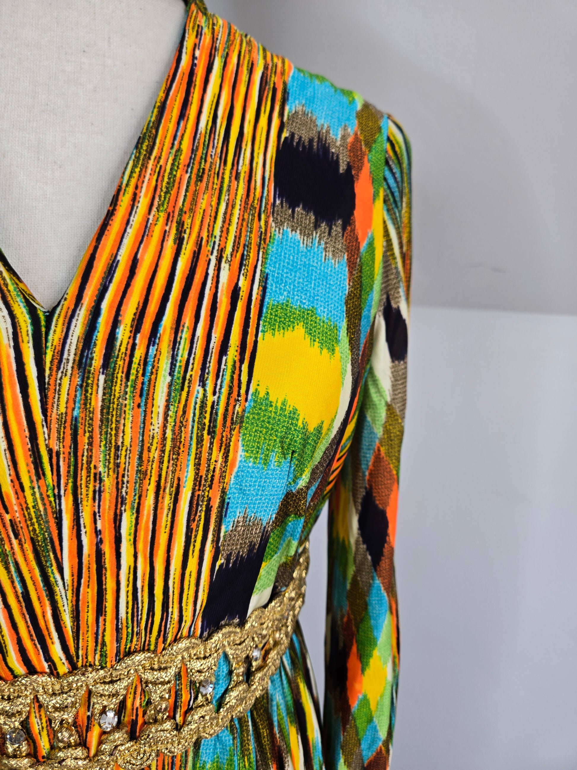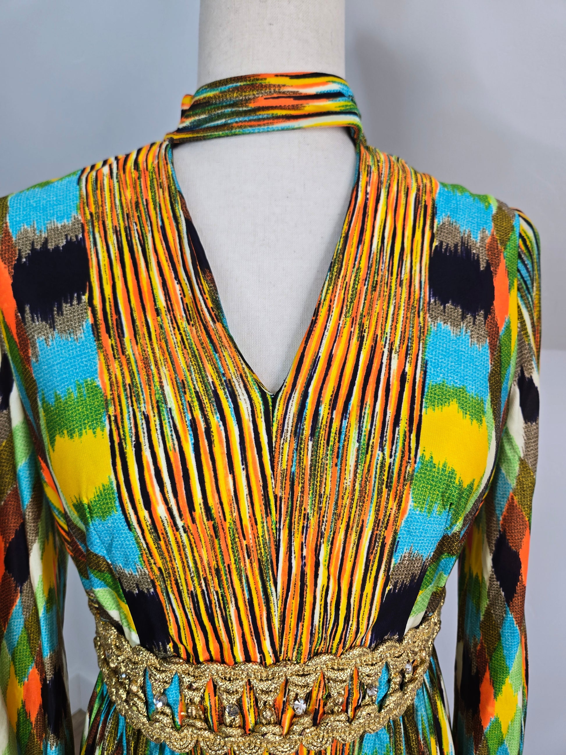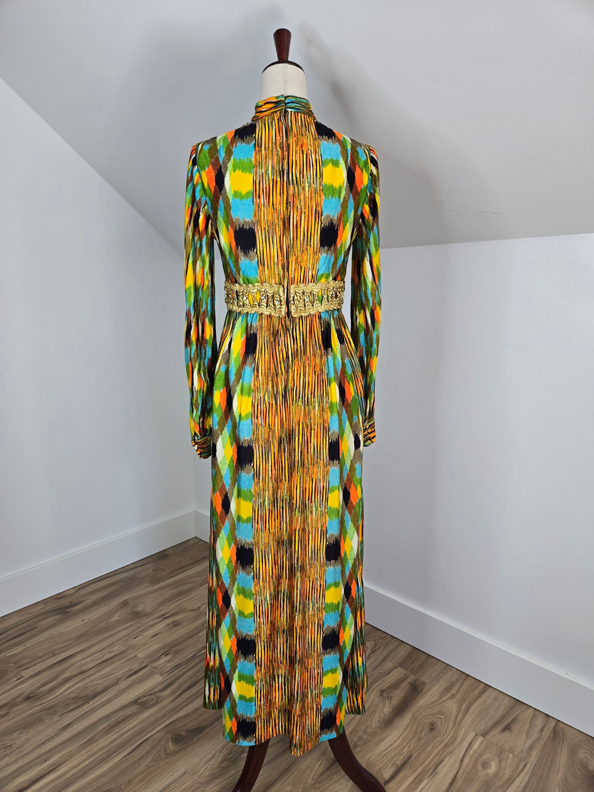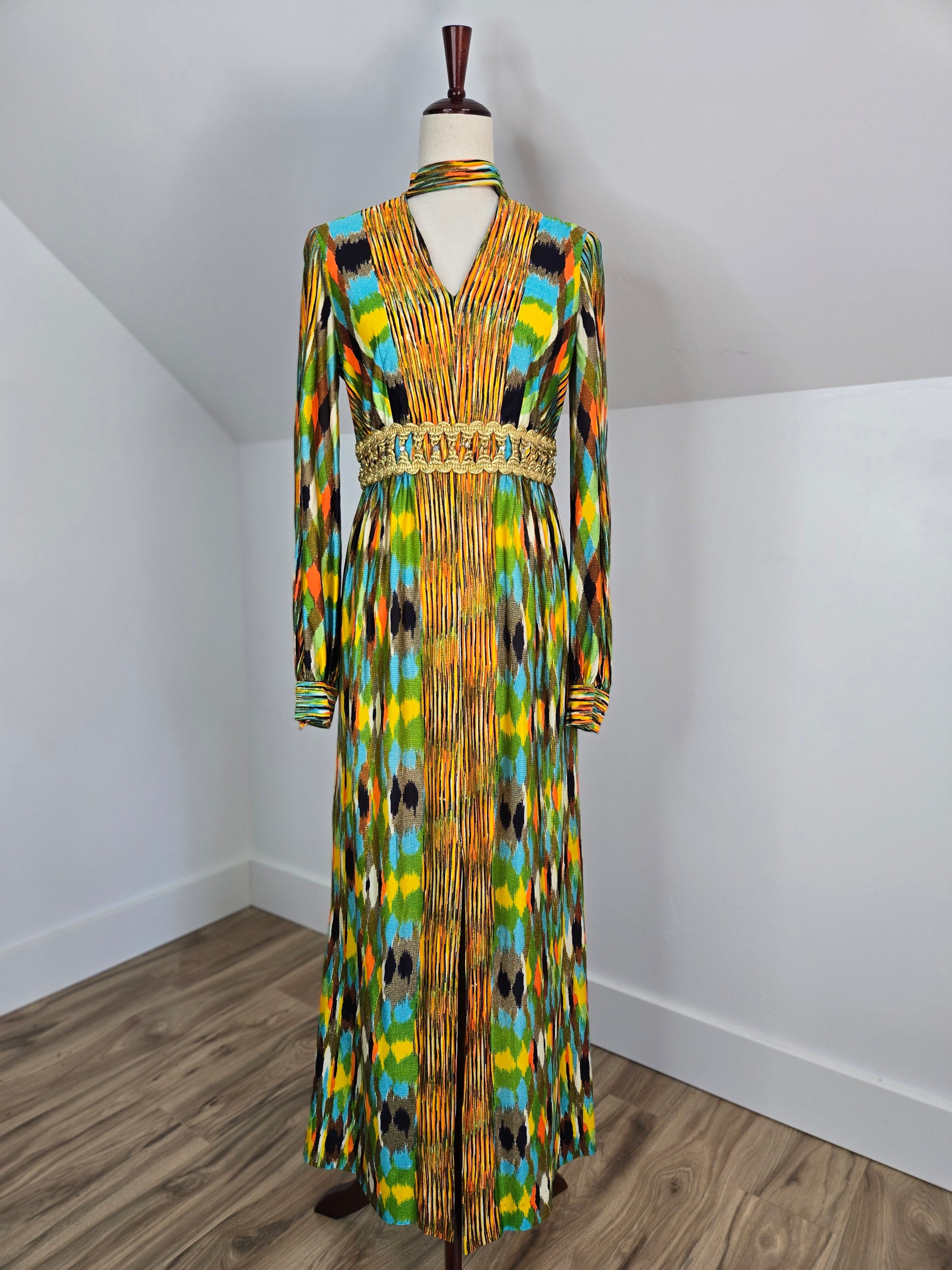 1970s Psychedelic Print Dress with Goddess Waist Belt - small/medium