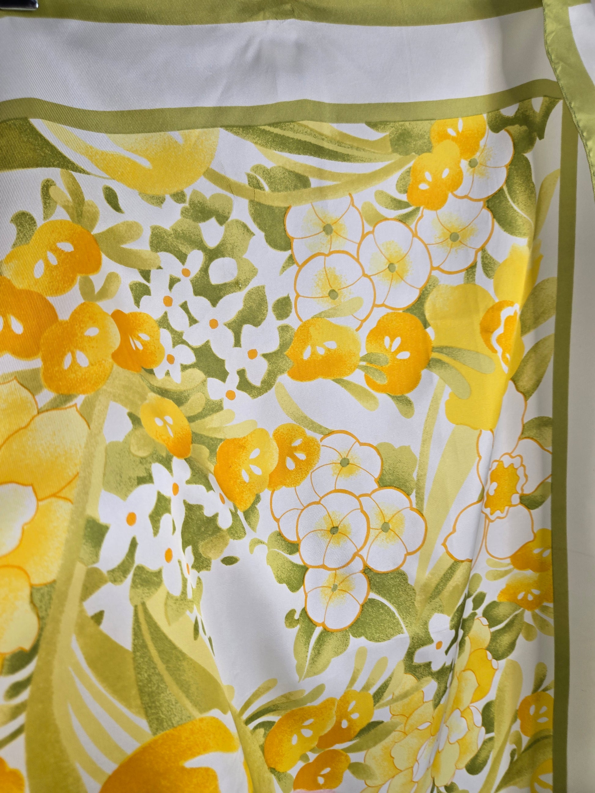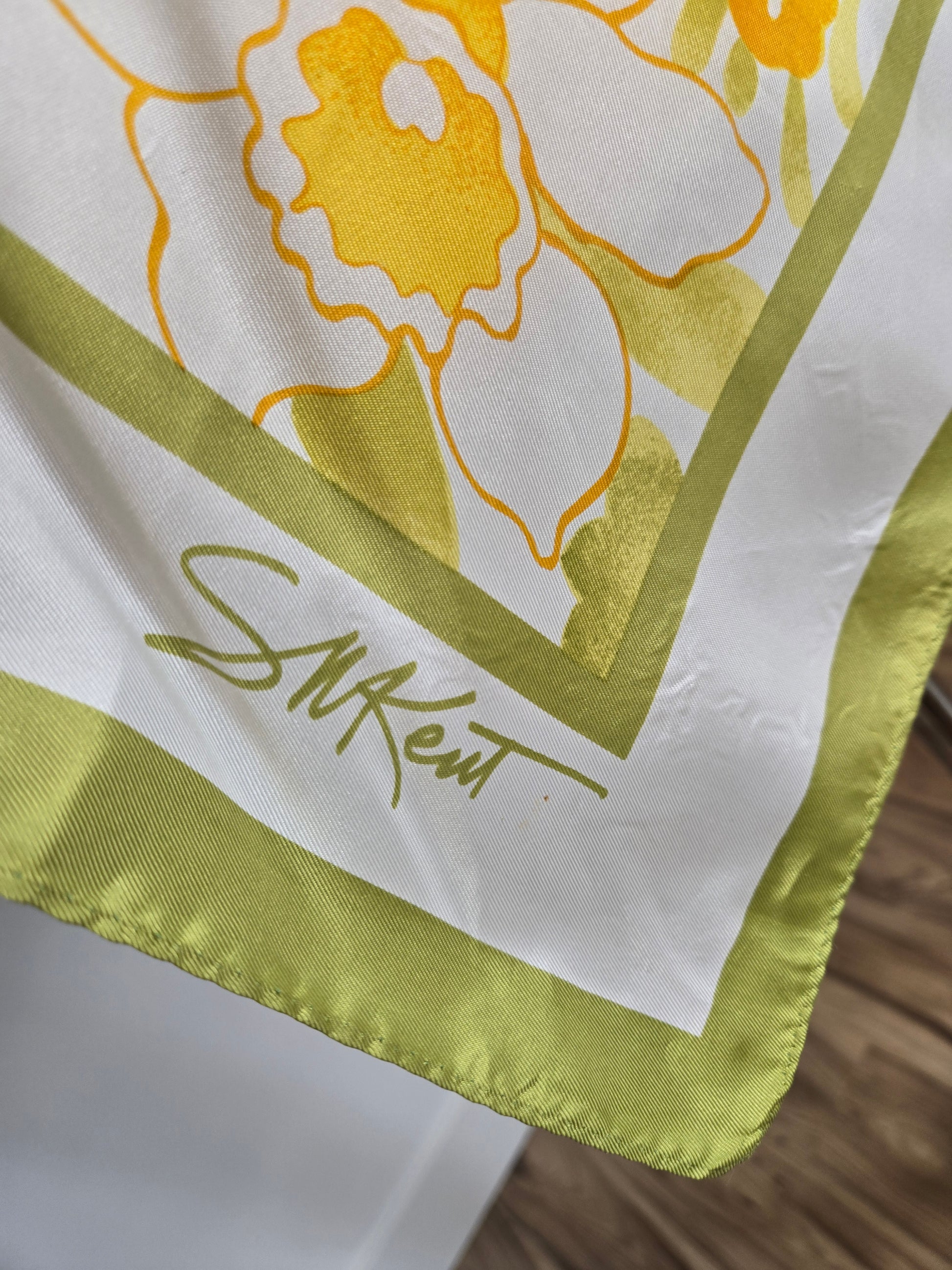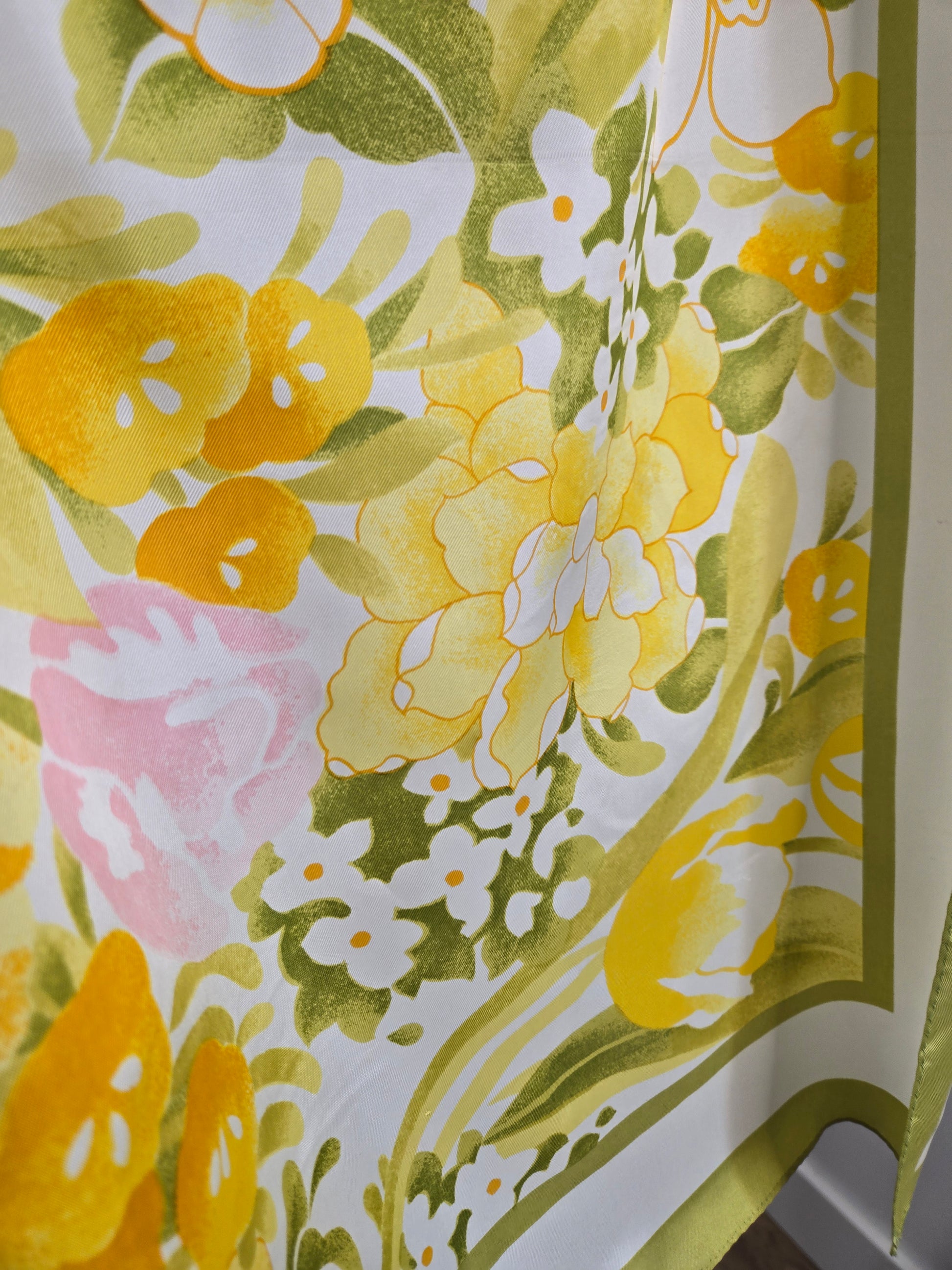 Vintage Avon bright yellow and pink floral scarf with an olive green edge. It has an artist signature on the print, hand rolled edge, and is in great condition with no flaws to note.