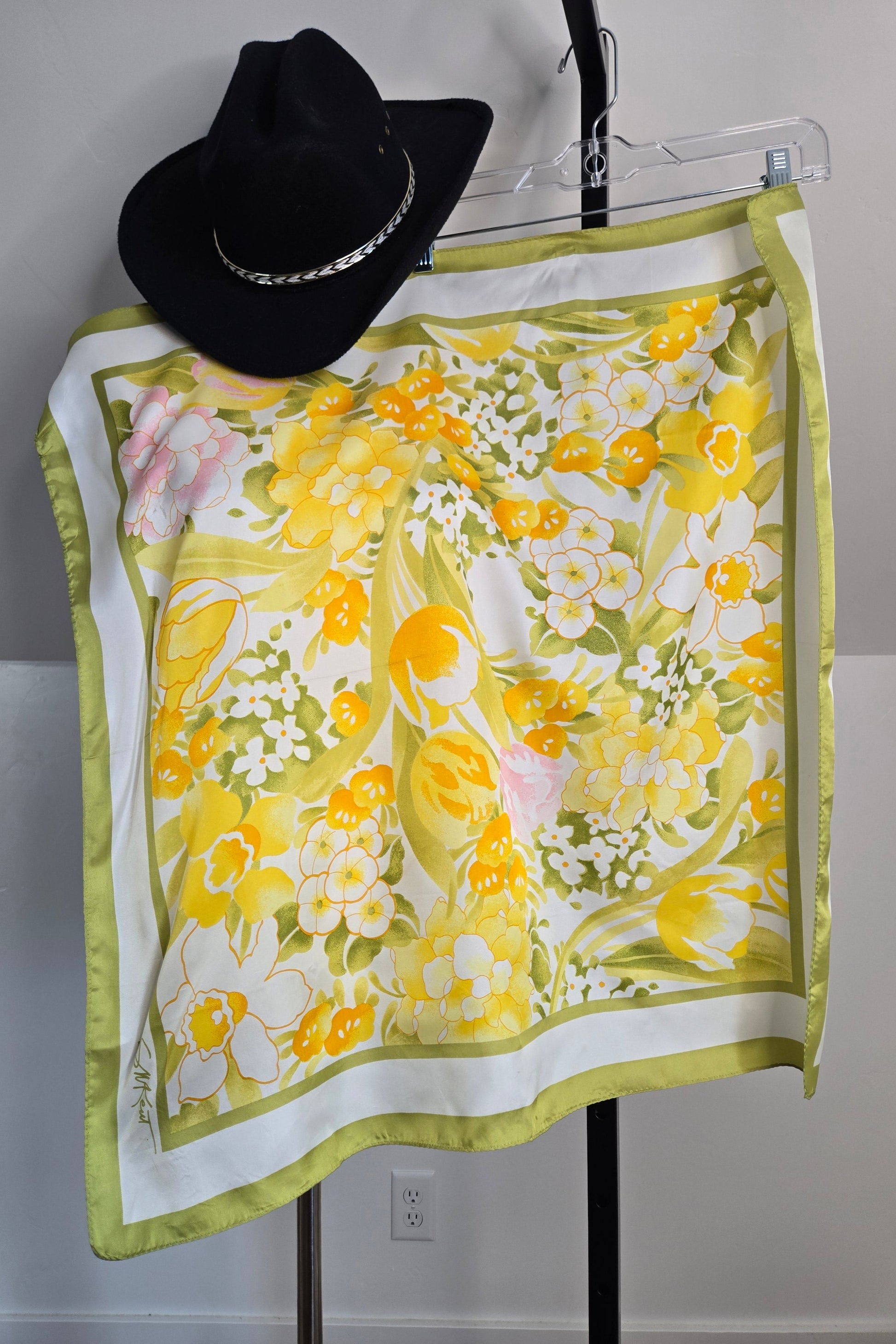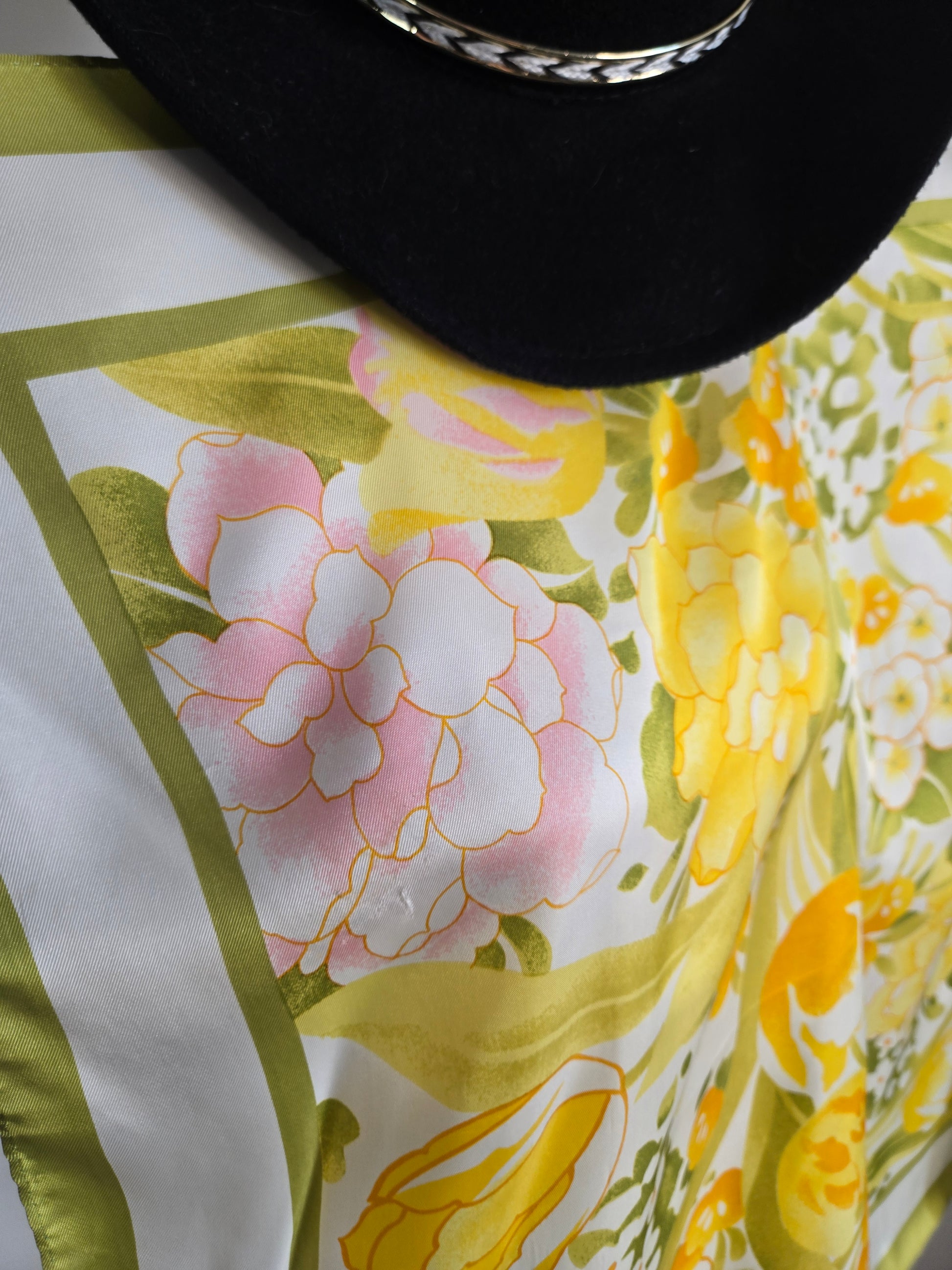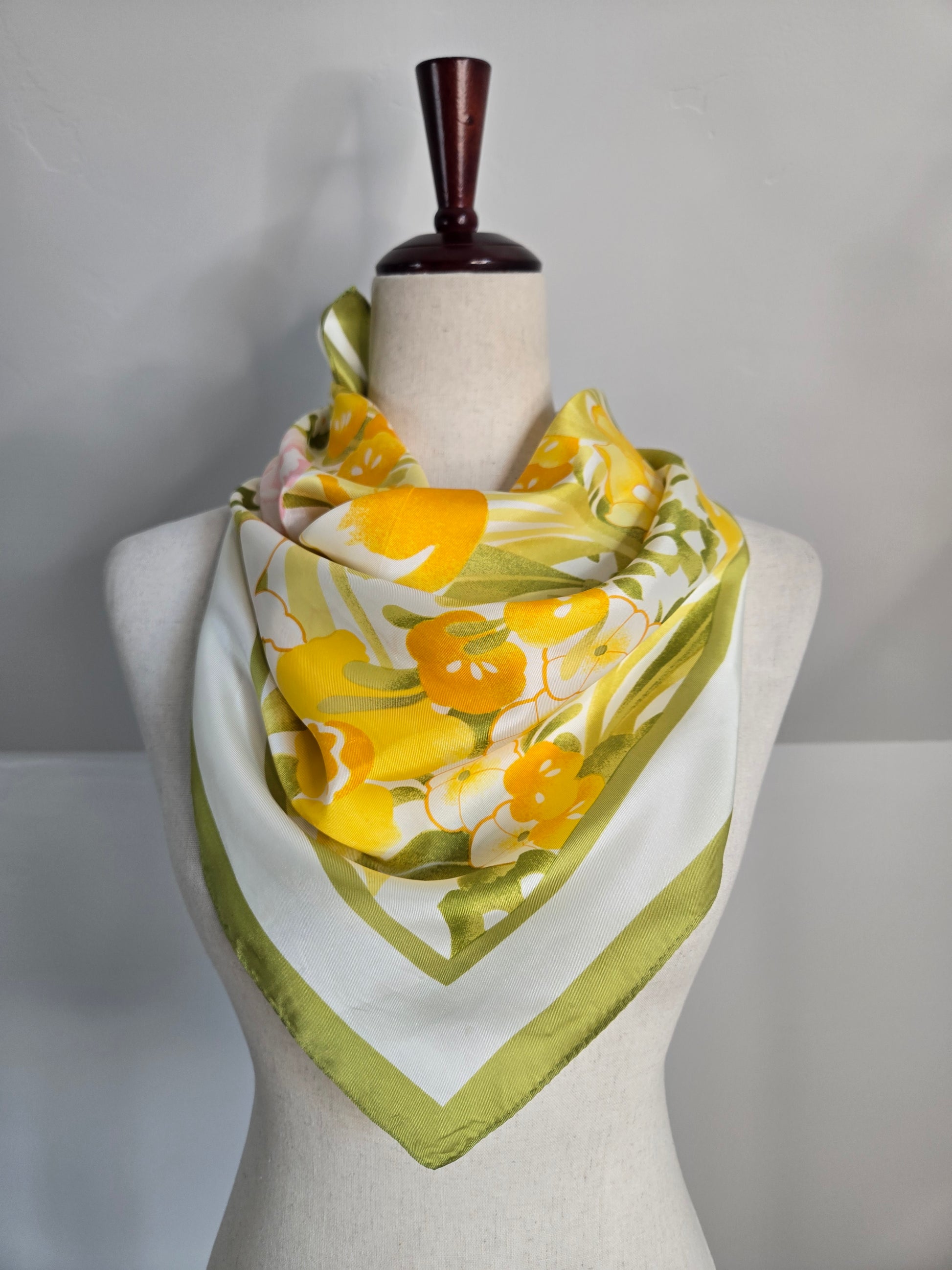 Vintage Avon bright yellow and pink floral scarf with an olive green edge. It has an artist signature on the print, hand rolled edge, and is in great condition with no flaws to note.