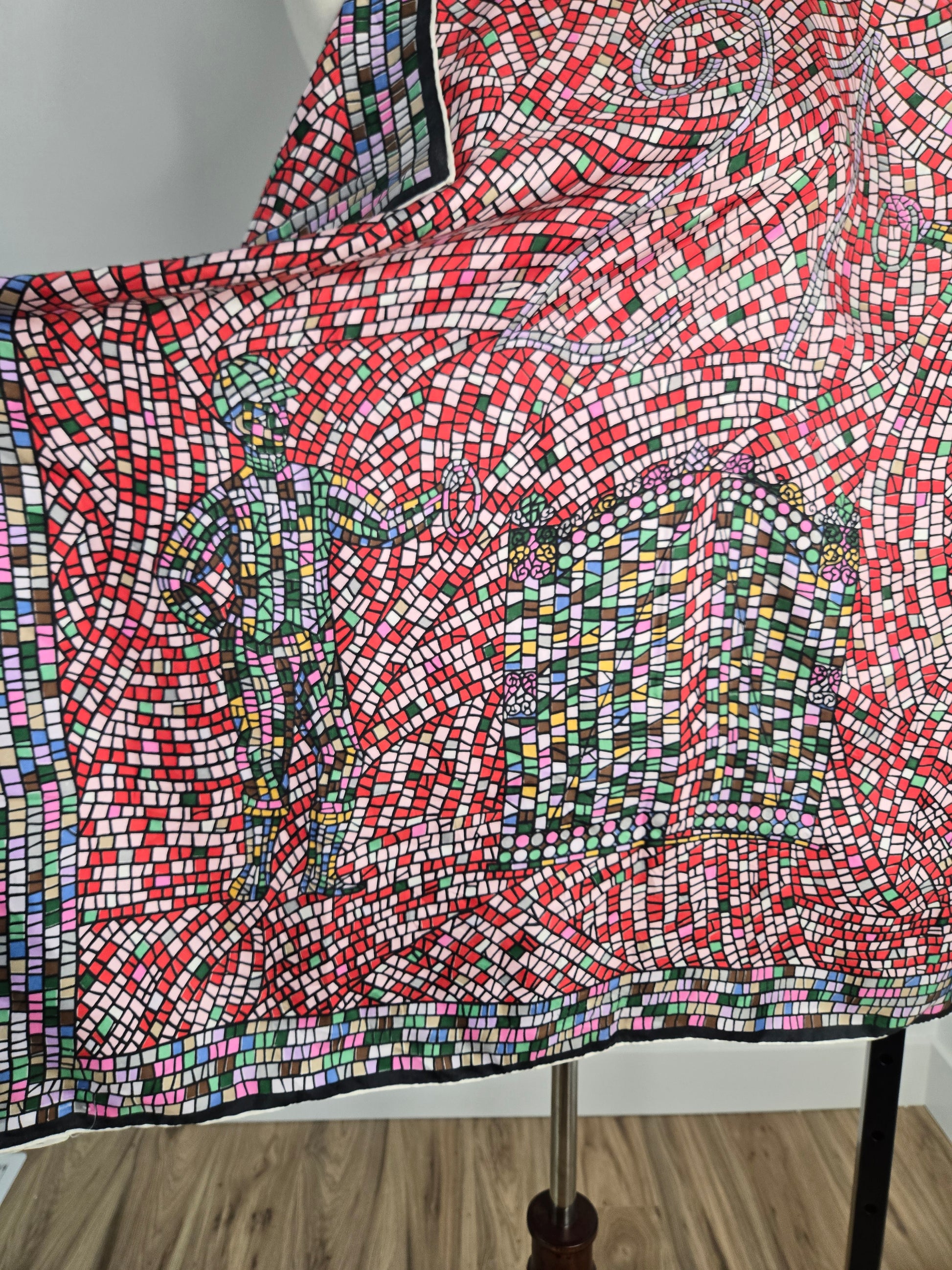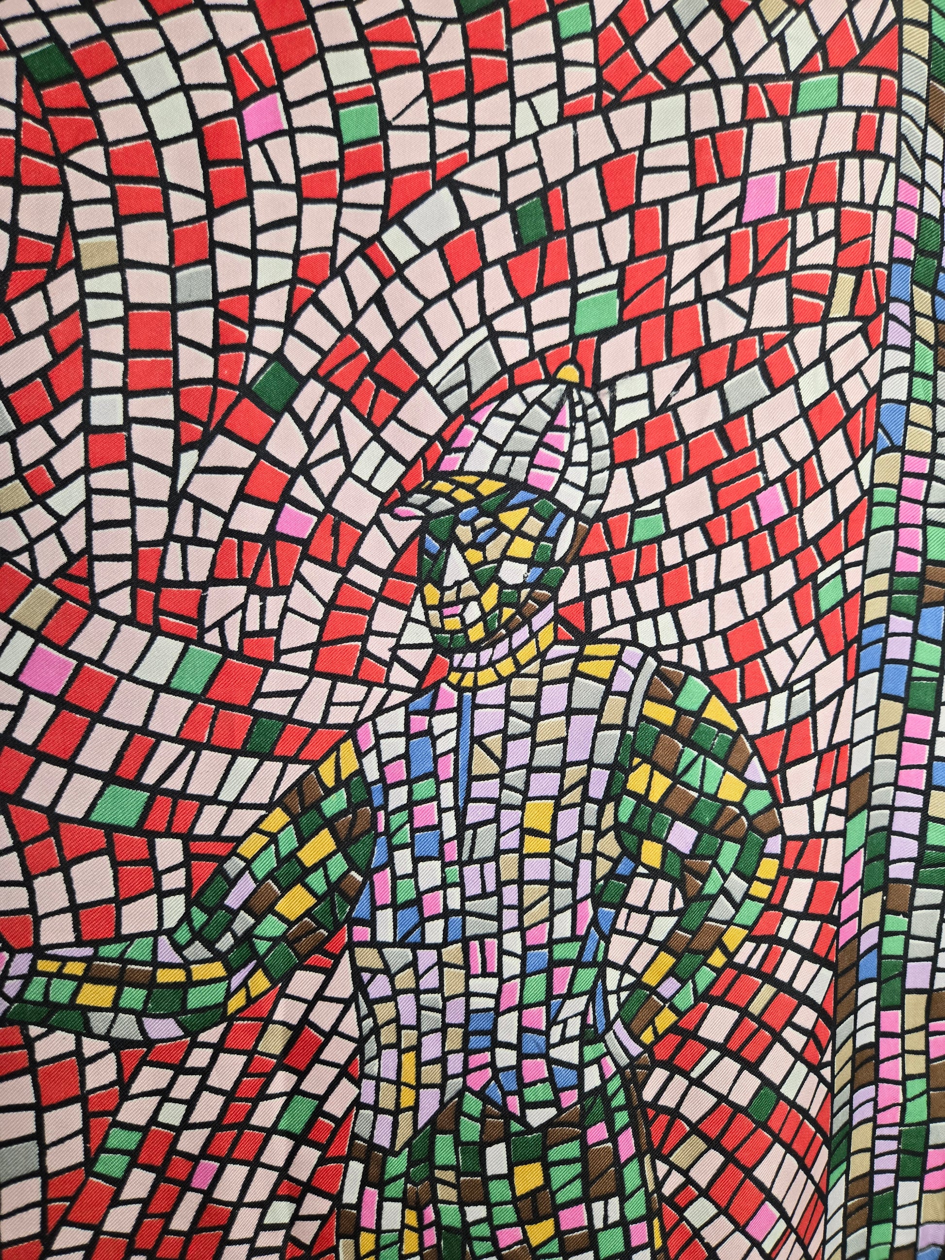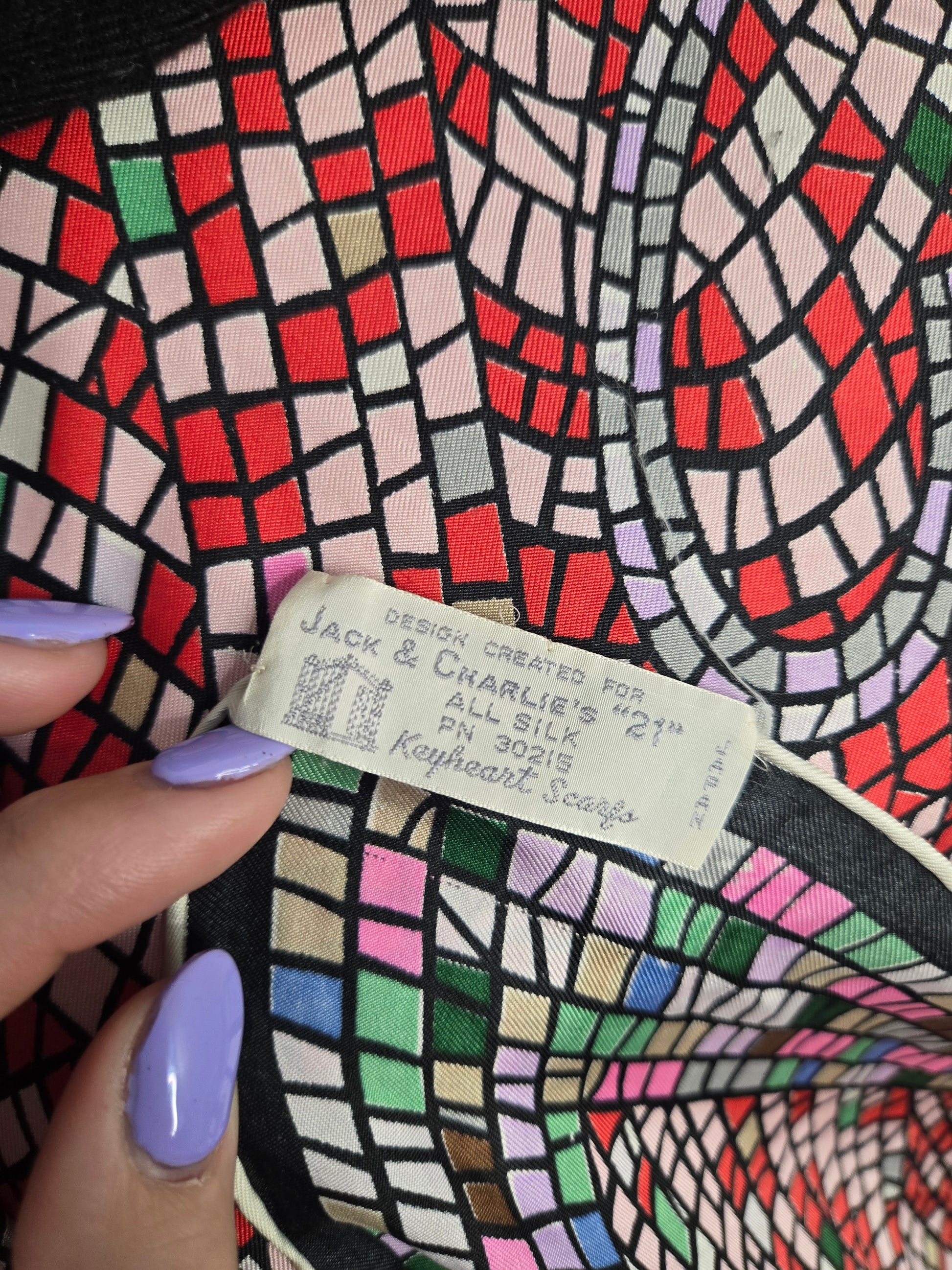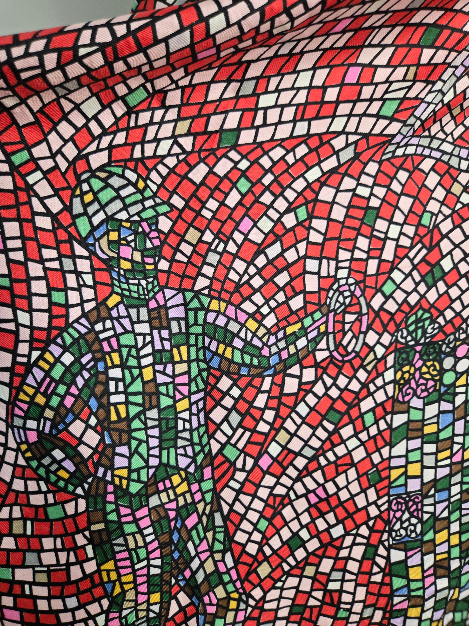 Rare vintage 100% silk scarf by Keyheart Scarfs. This one was created for Jack and Charlie's "21" which was a club in New York City, and features a mosaic style scene of two jockeys. It has hand rolled edges and is made in Japan. Amazing condition with no flaws to note. They range from $350-$850 online and are deemed "collectable".