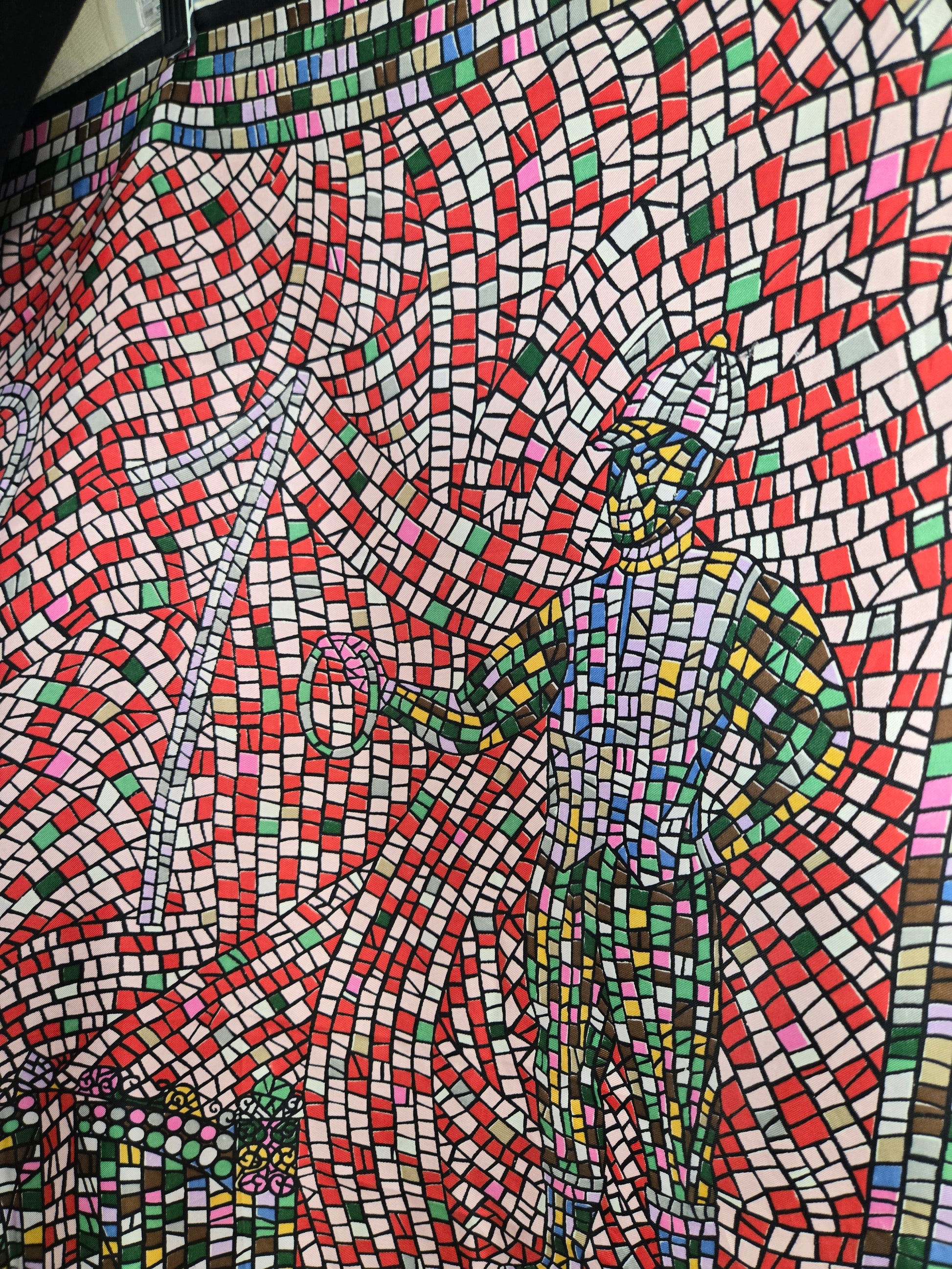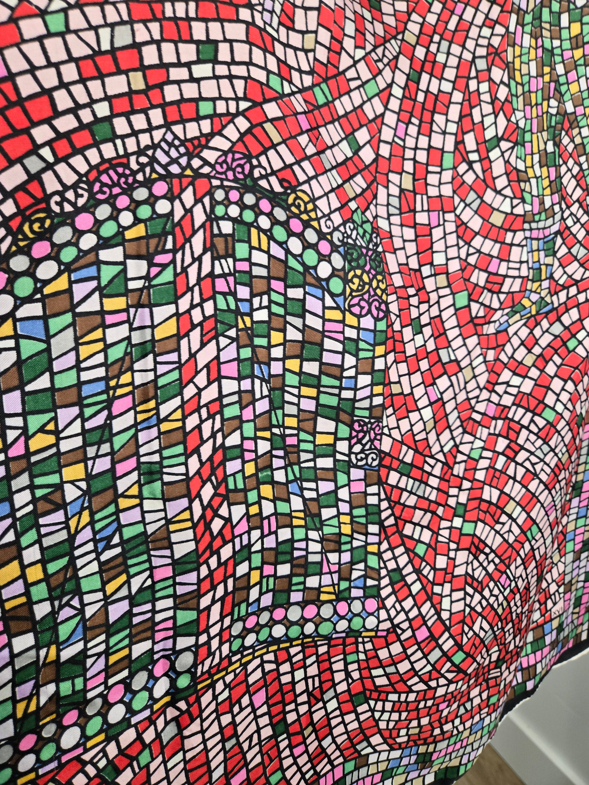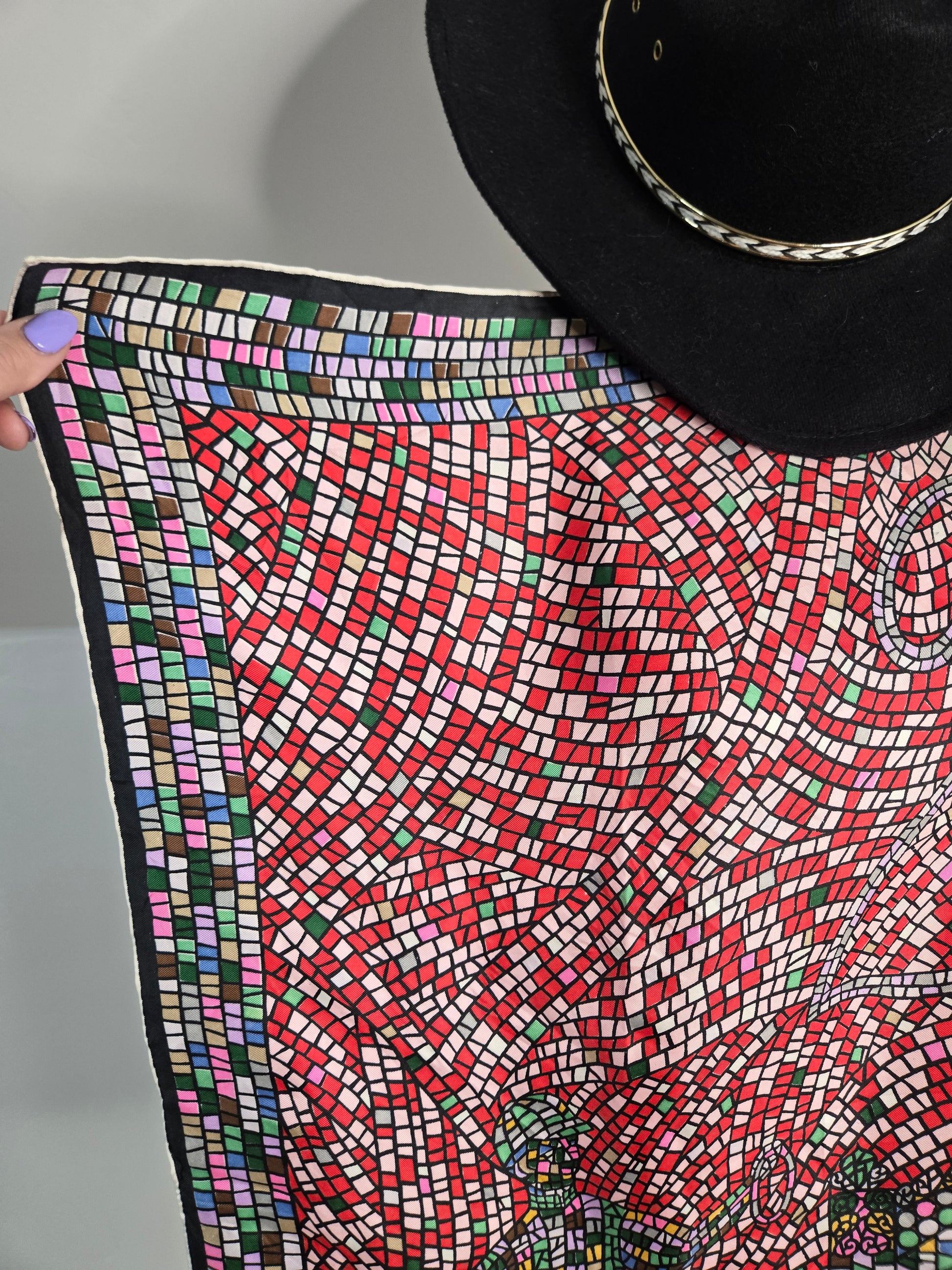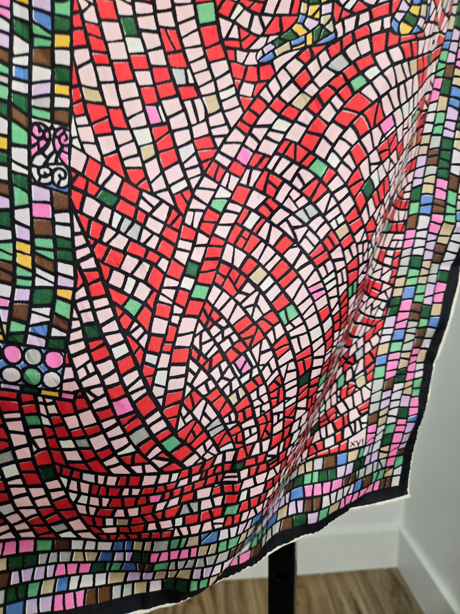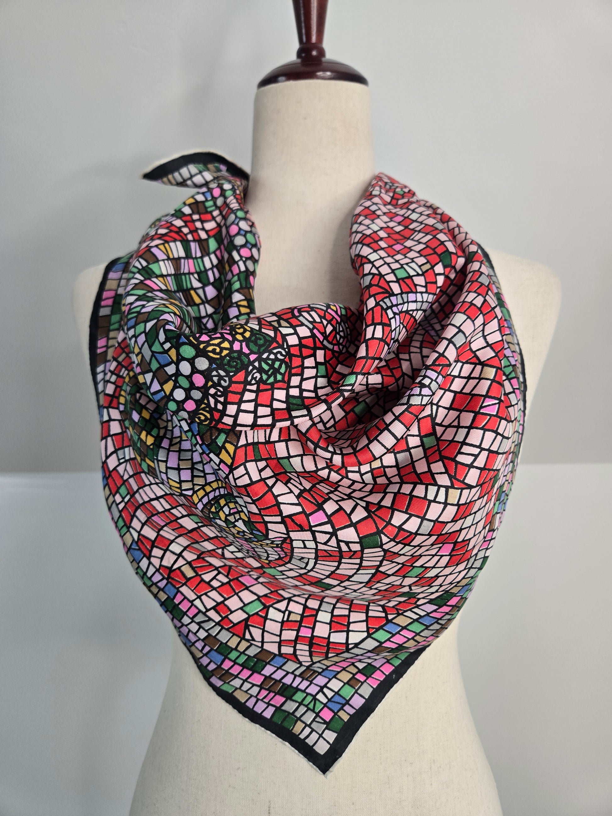 Rare vintage 100% silk scarf by Keyheart Scarfs. This one was created for Jack and Charlie's "21" which was a club in New York City, and features a mosaic style scene of two jockeys. It has hand rolled edges and is made in Japan. Amazing condition with no flaws to note. They range from $350-$850 online and are deemed "collectable".