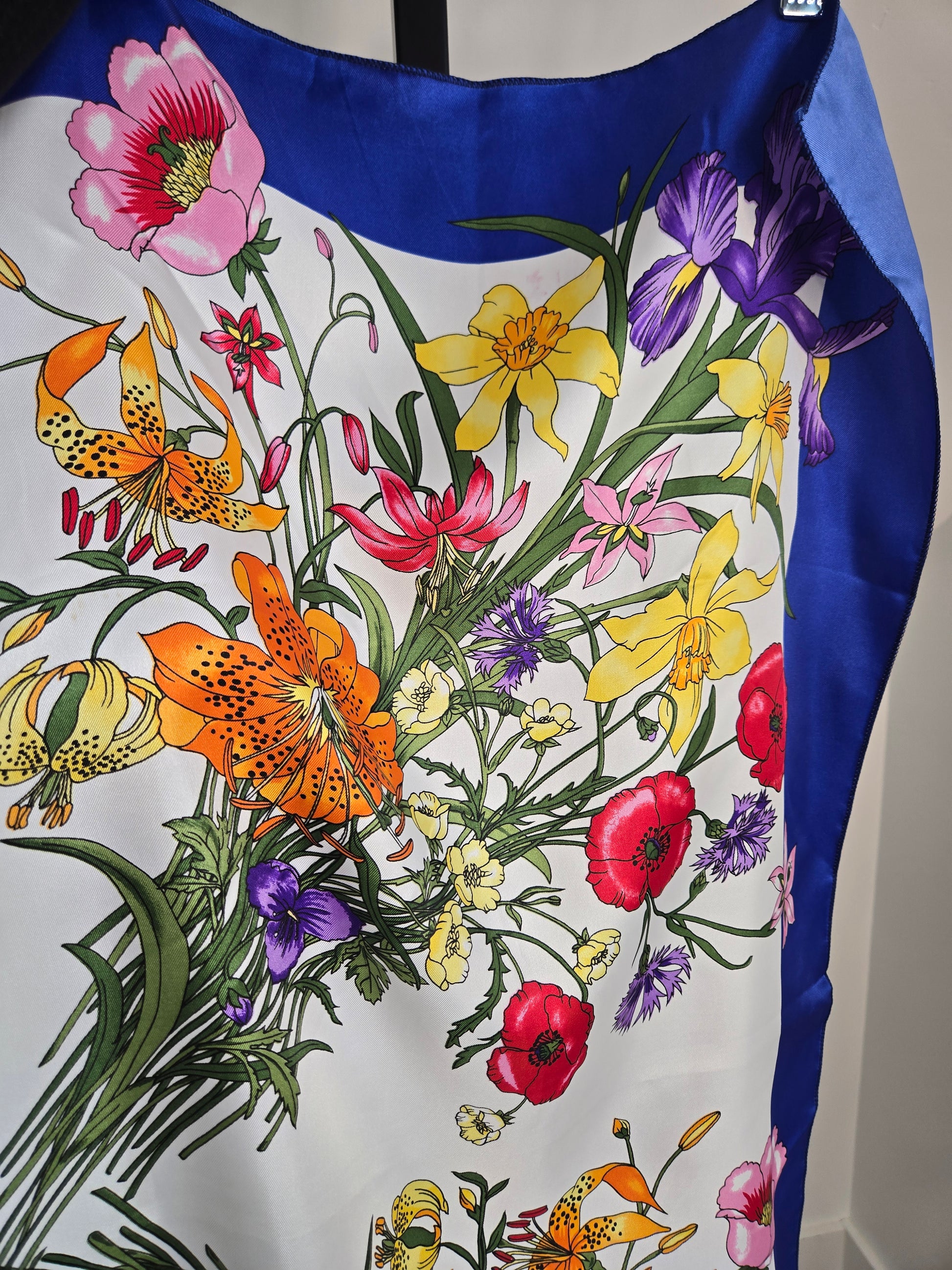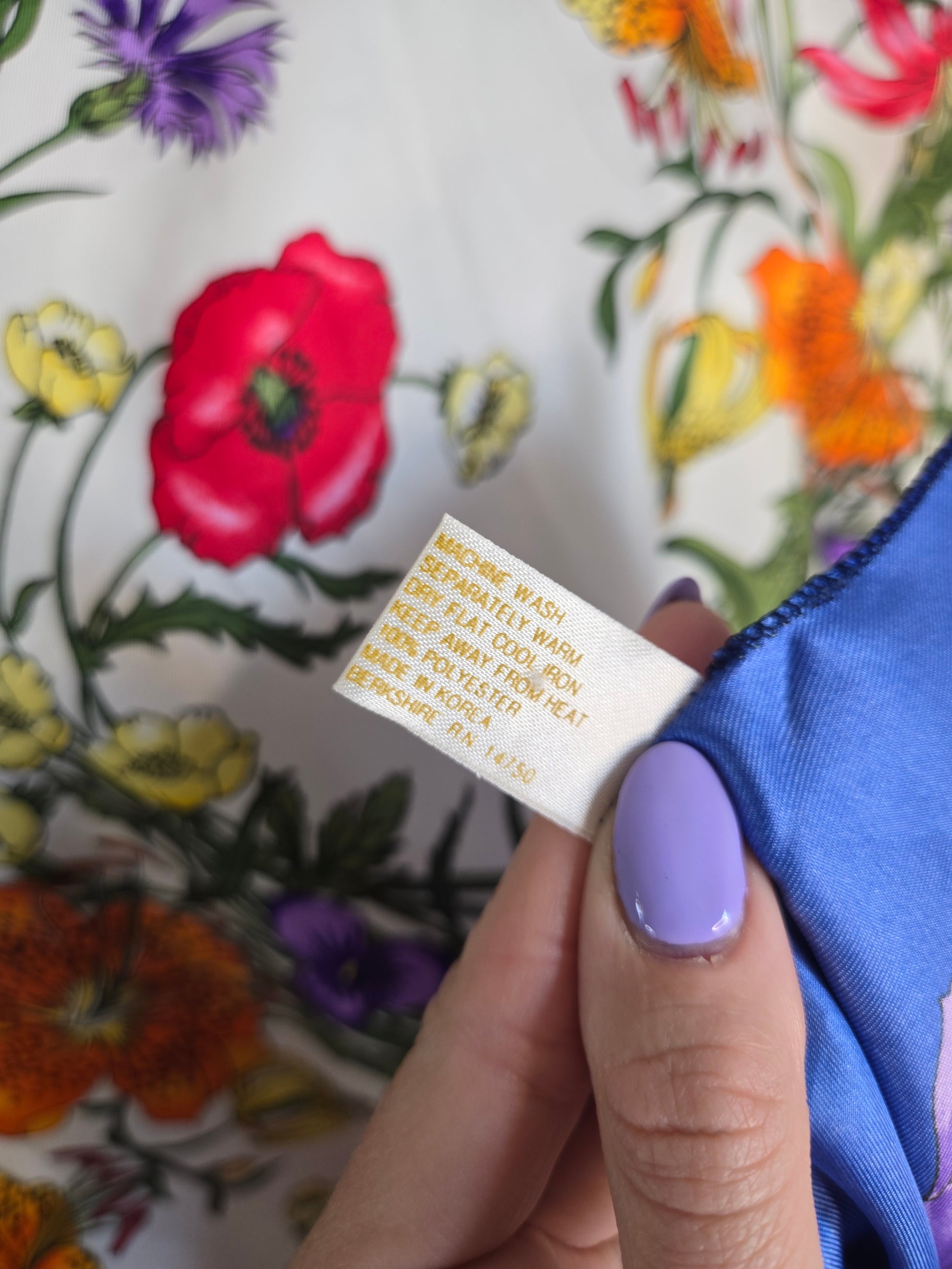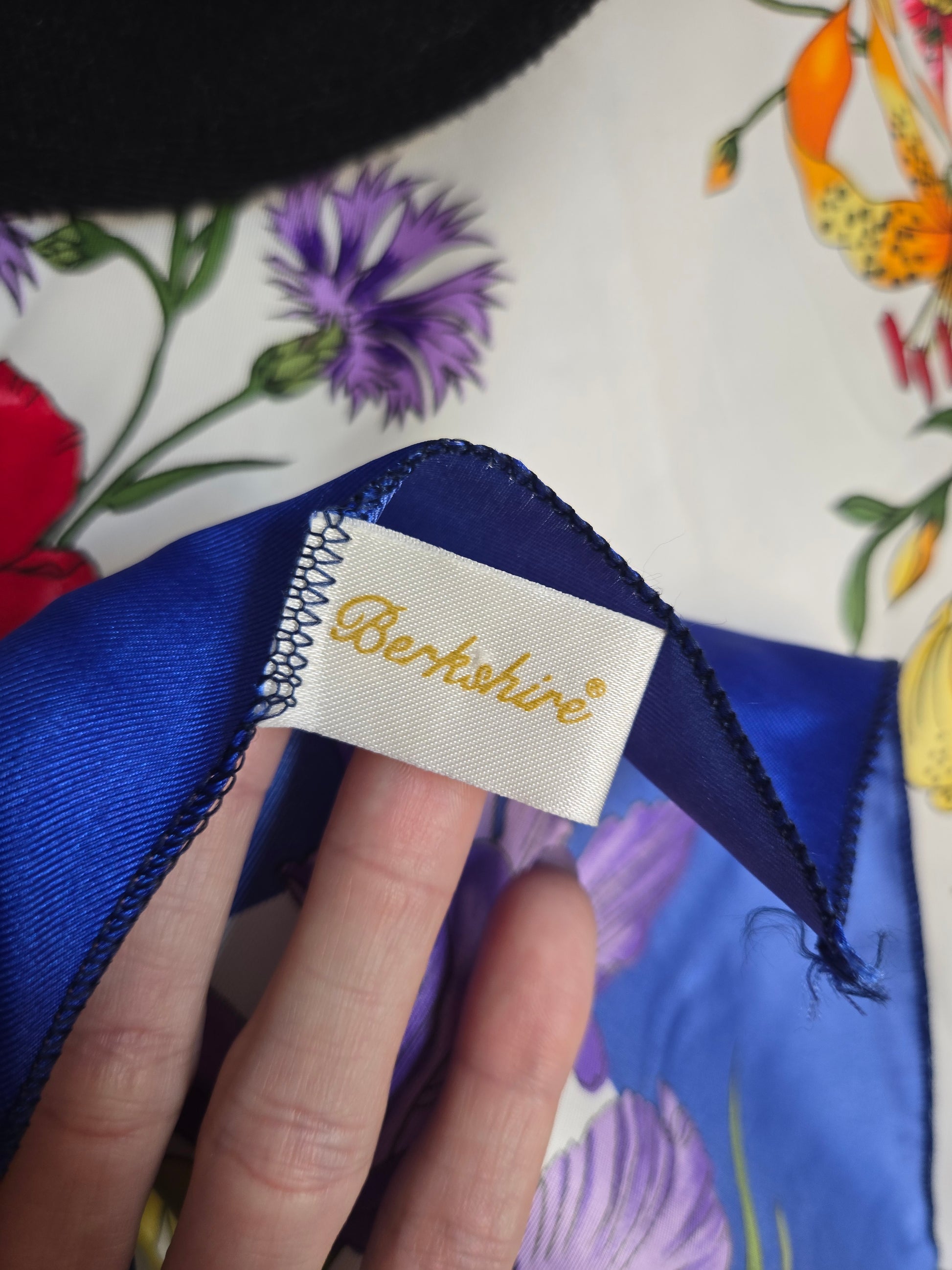 Vintage Berkshire bright floral scarf made in Korea. It is a very silky and shiny polyester material and is in great condition with no flaws to note.