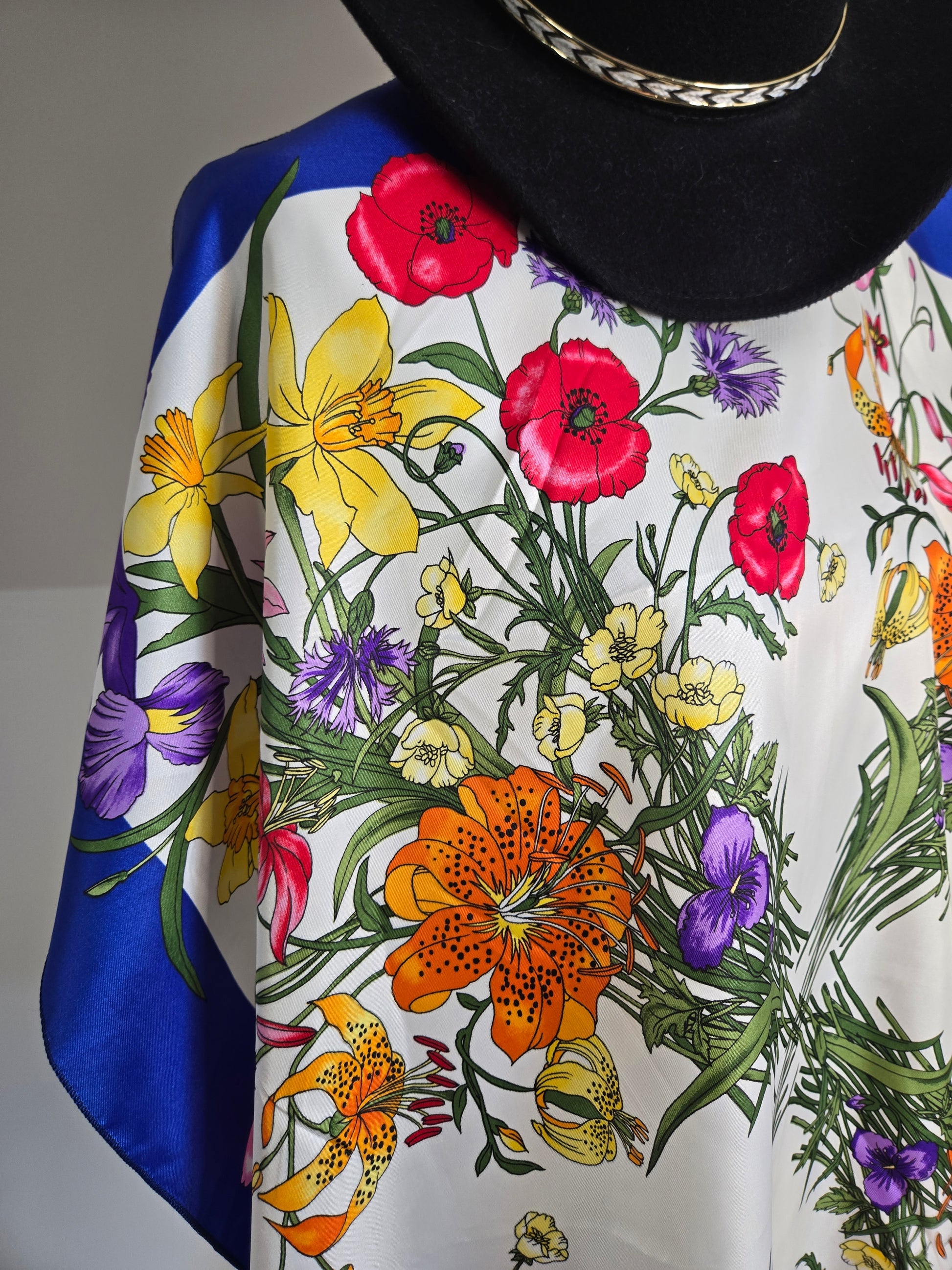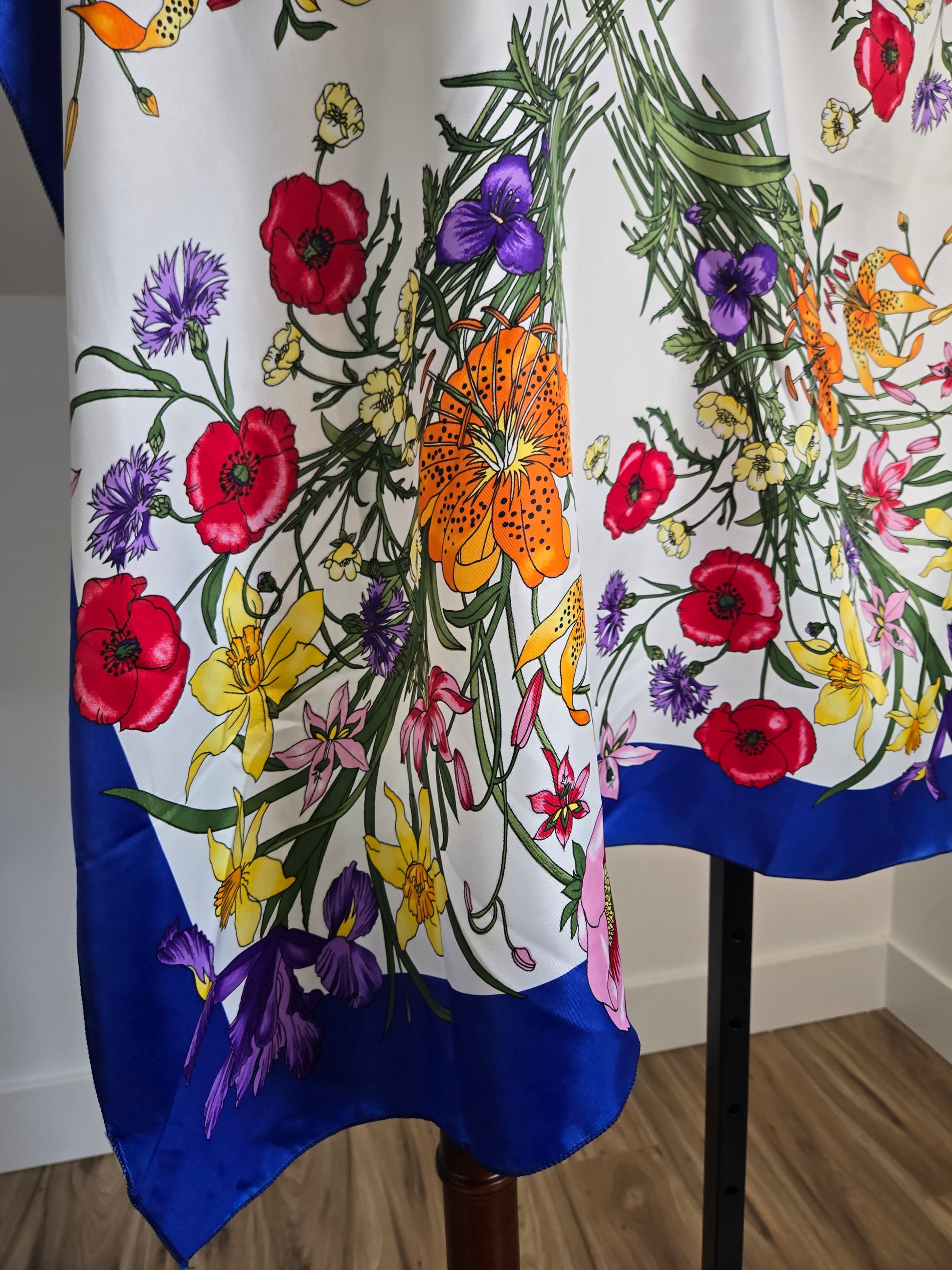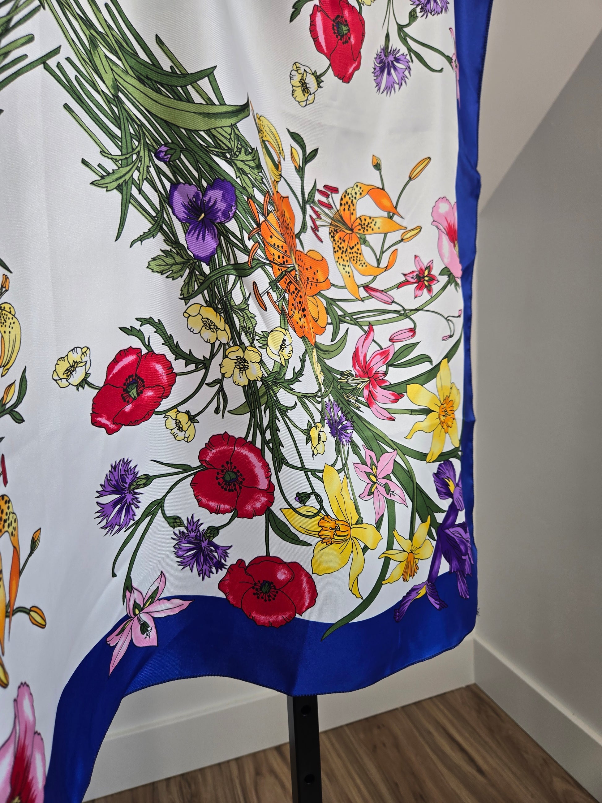 Vintage Berkshire bright floral scarf made in Korea. It is a very silky and shiny polyester material and is in great condition with no flaws to note.