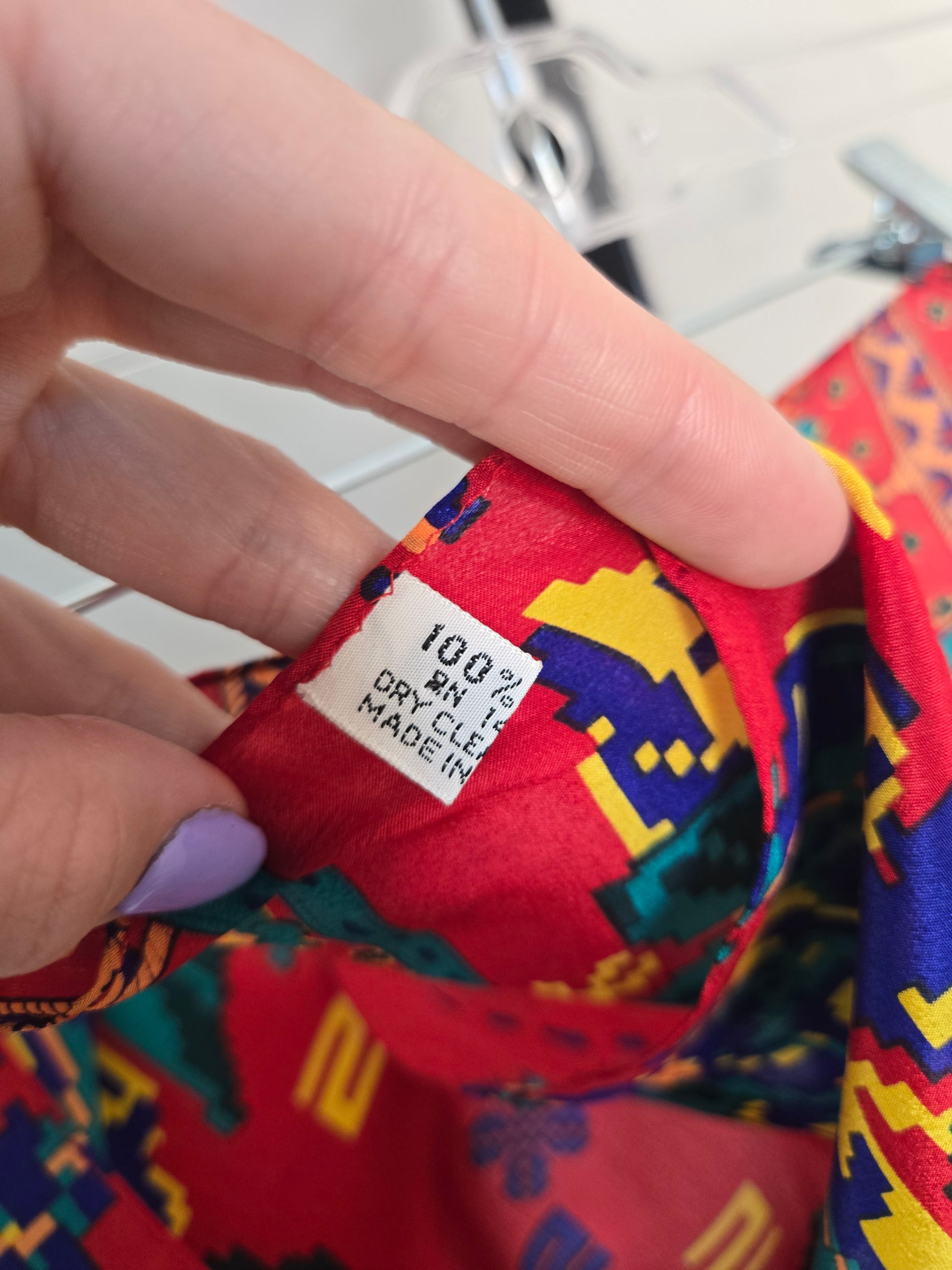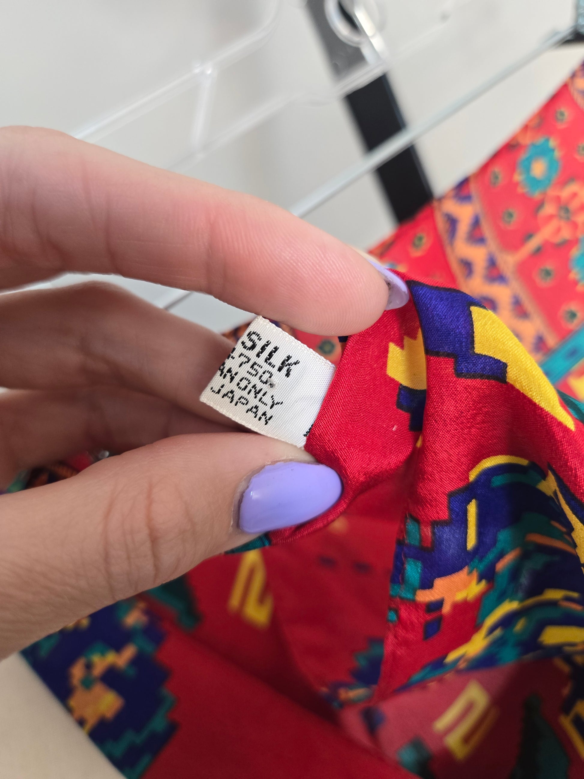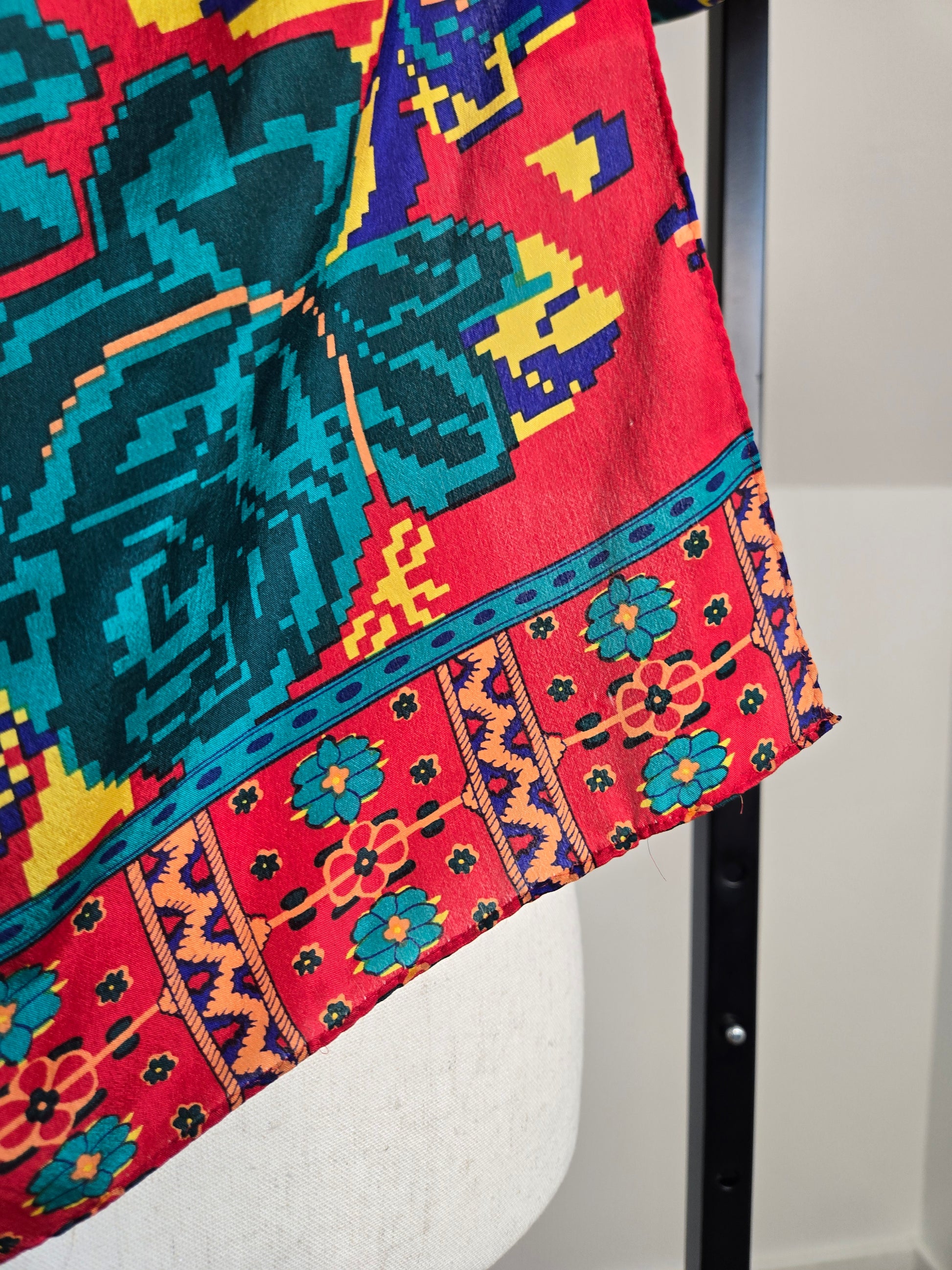 Vintage red digi floral print 100% silk scarf that is made in Japan. It has a hand rolled edge and is in amazing condition with no flaws to note.