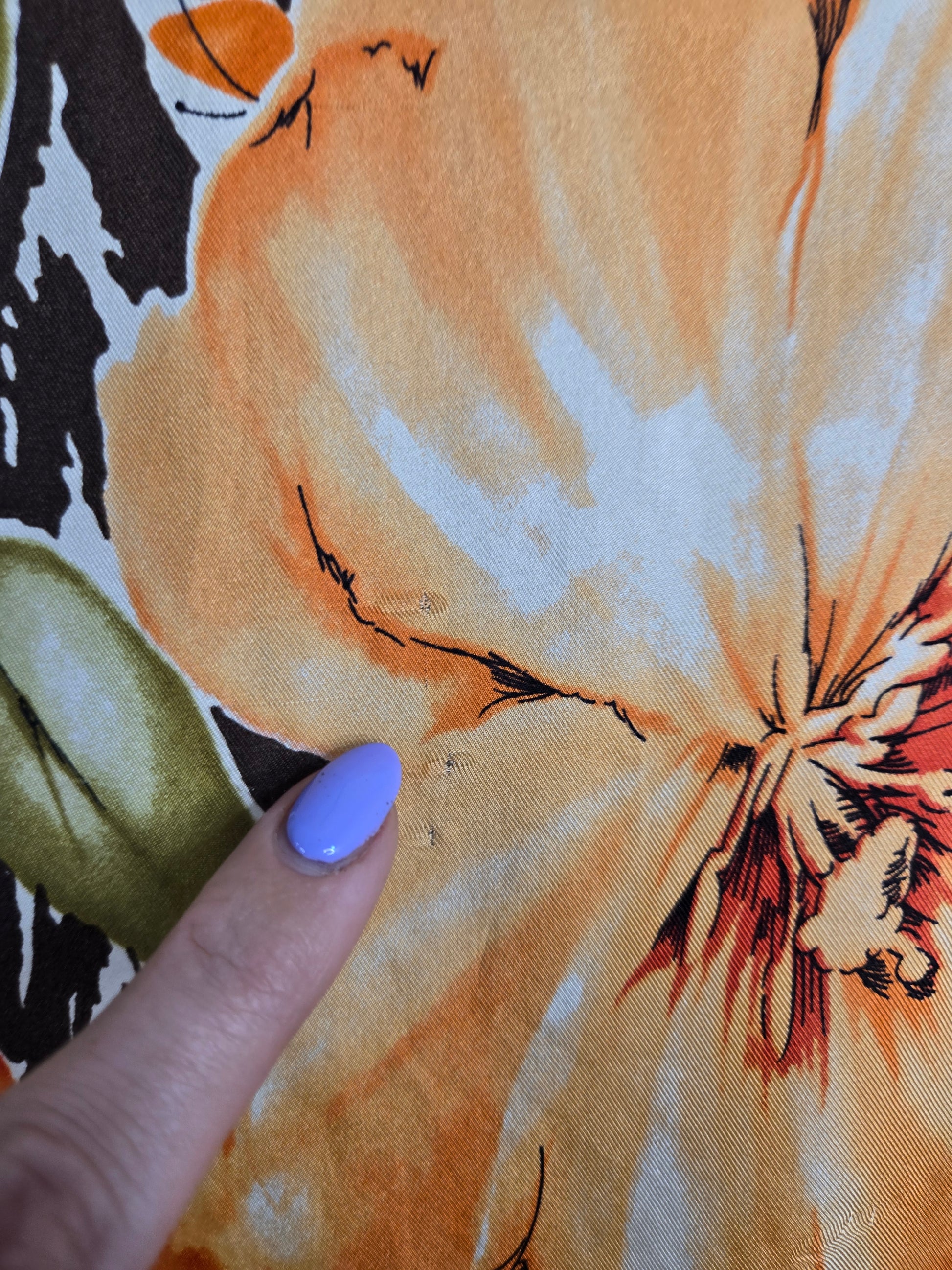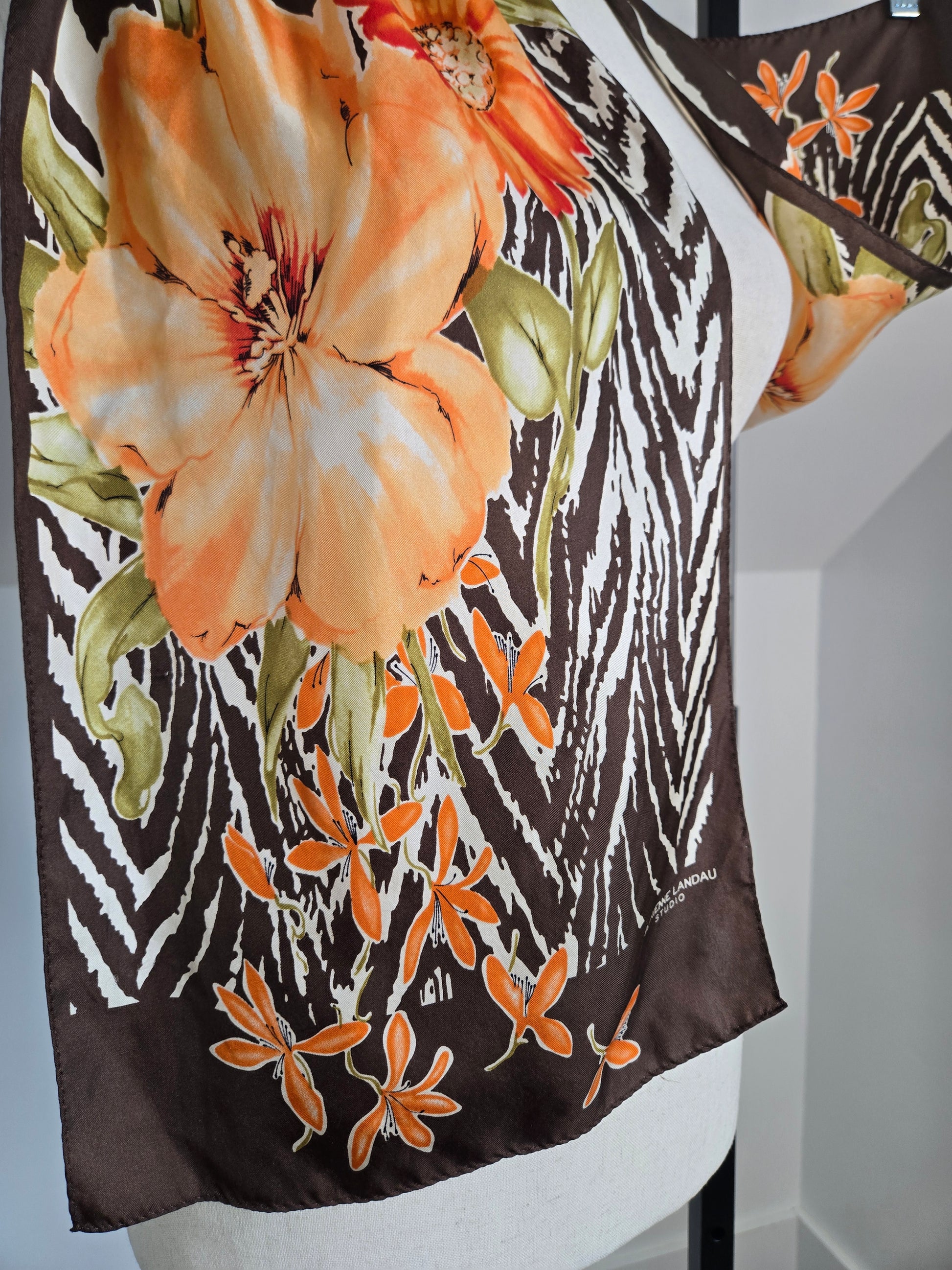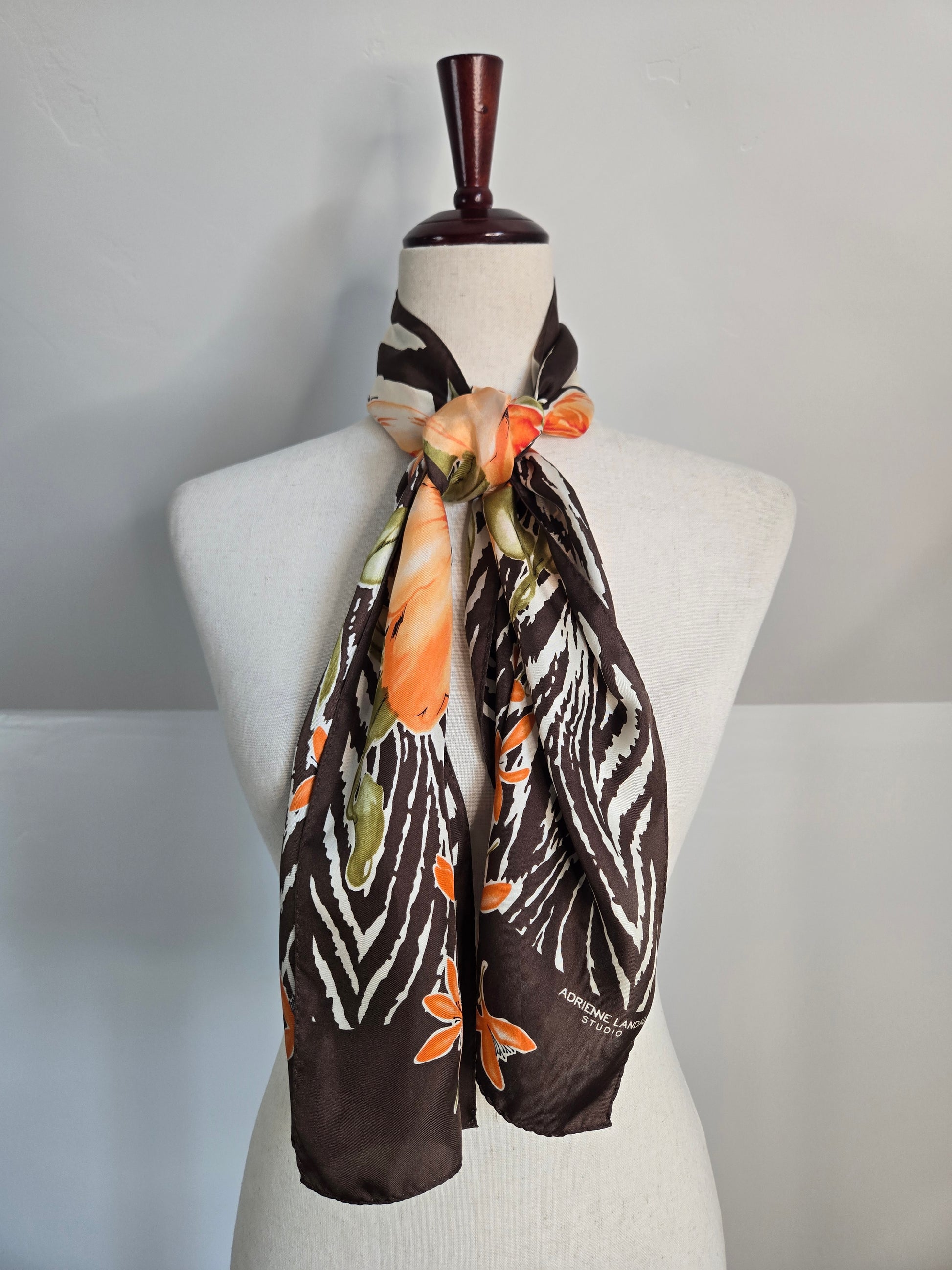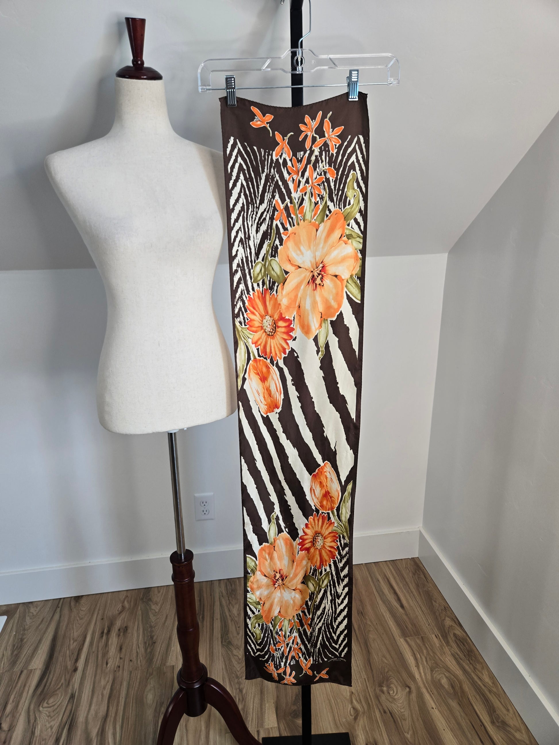 Adrienne Landau vintage 100% silk scarf in a brown and ivory zebra like print with a bright orange floral design on each end. It is in great condition, just one minor pinhole pointed out in the last image.