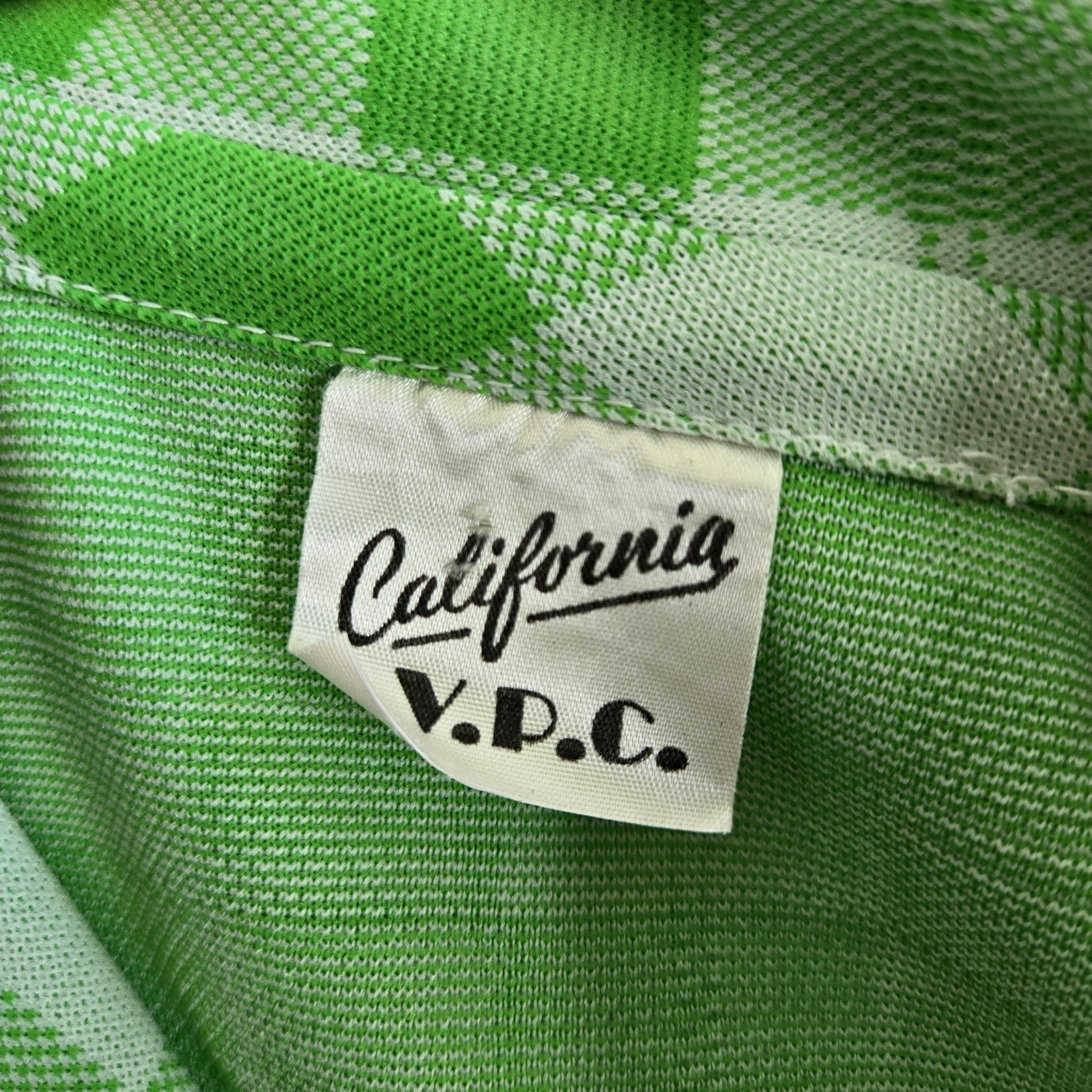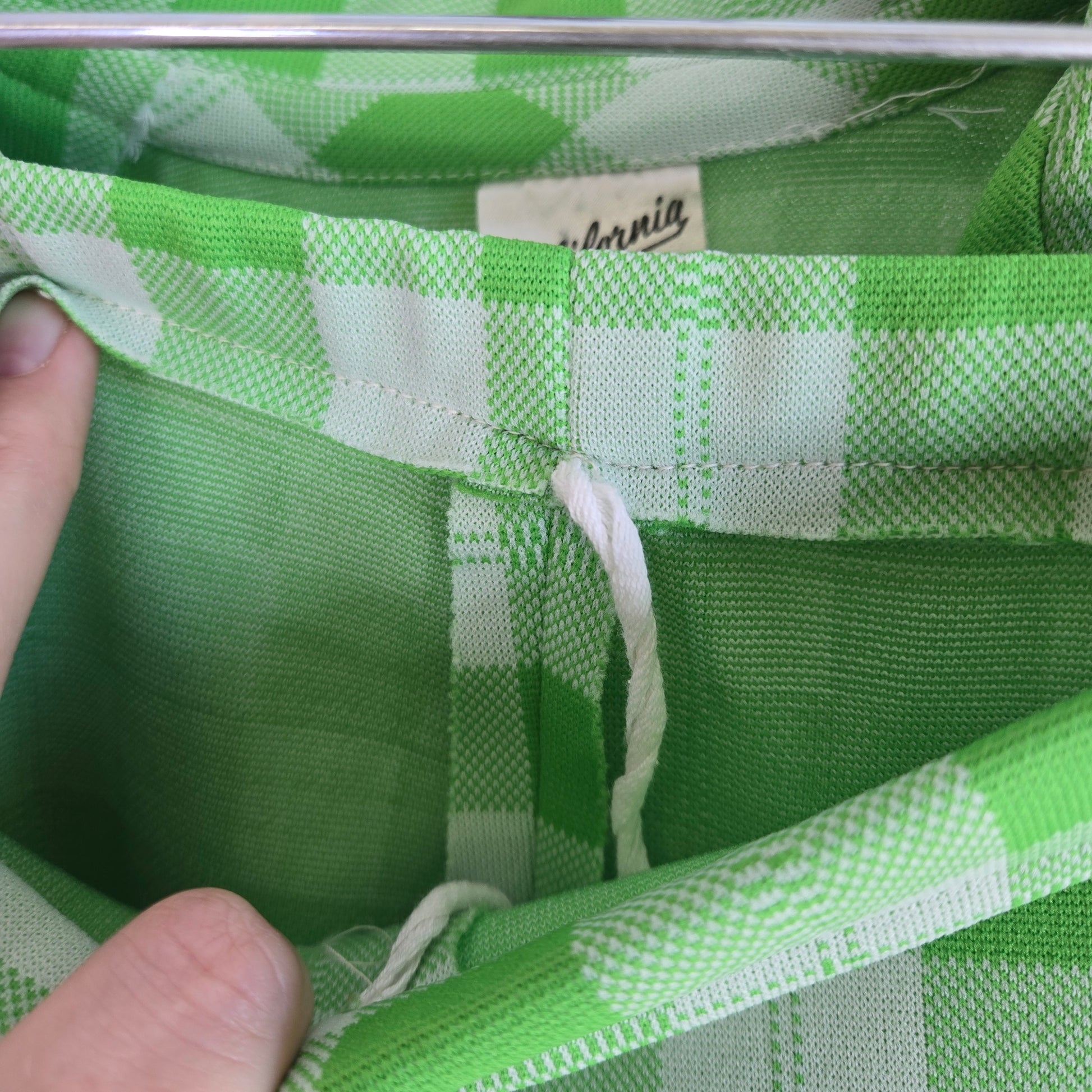 Vintage green and white plaid 1960s button down top and flare pant set. The top has hig white buttons, drop hand pockets, and a dagger collar. The pants have an elastic waistband and flare at the end slightly.