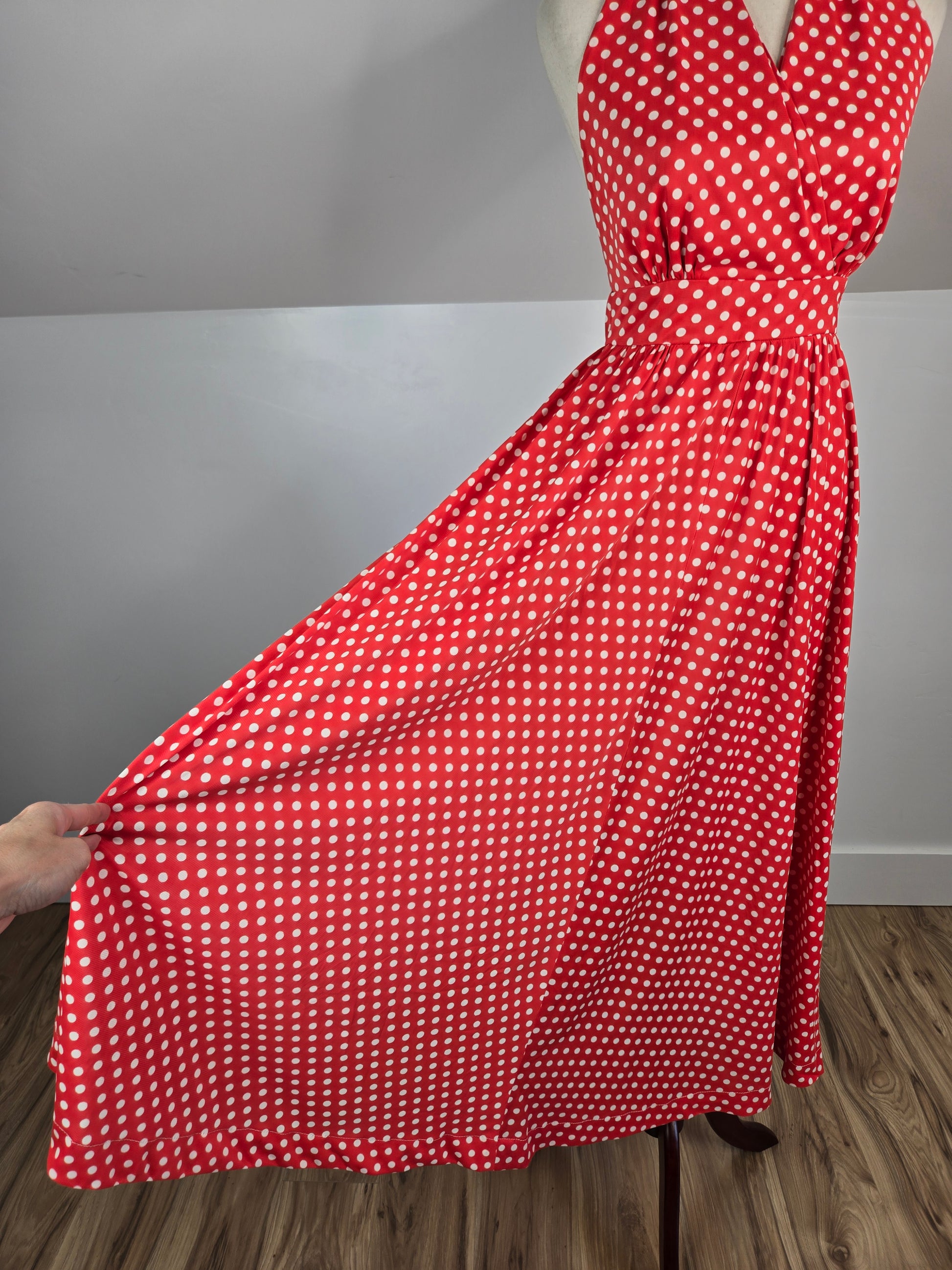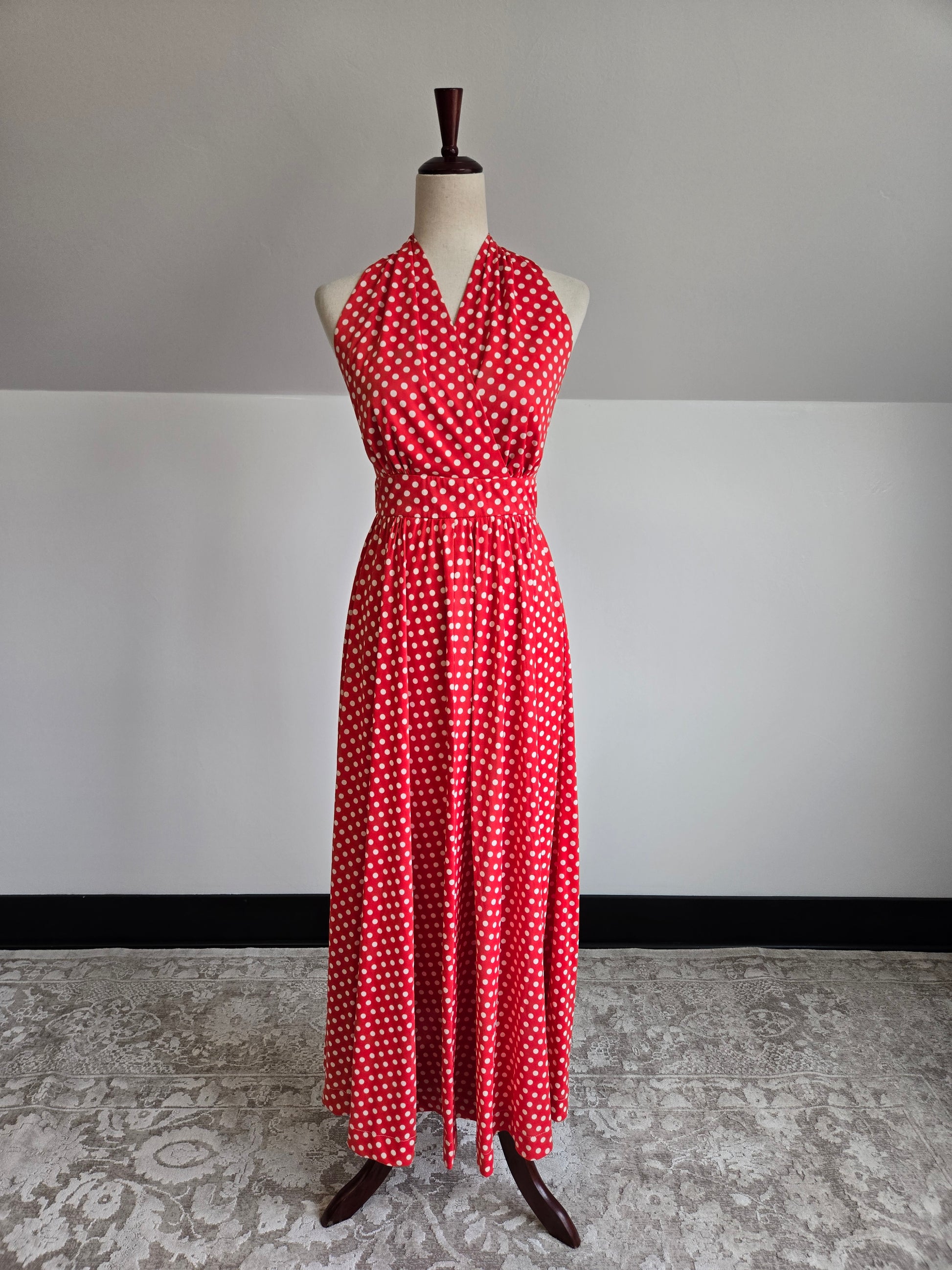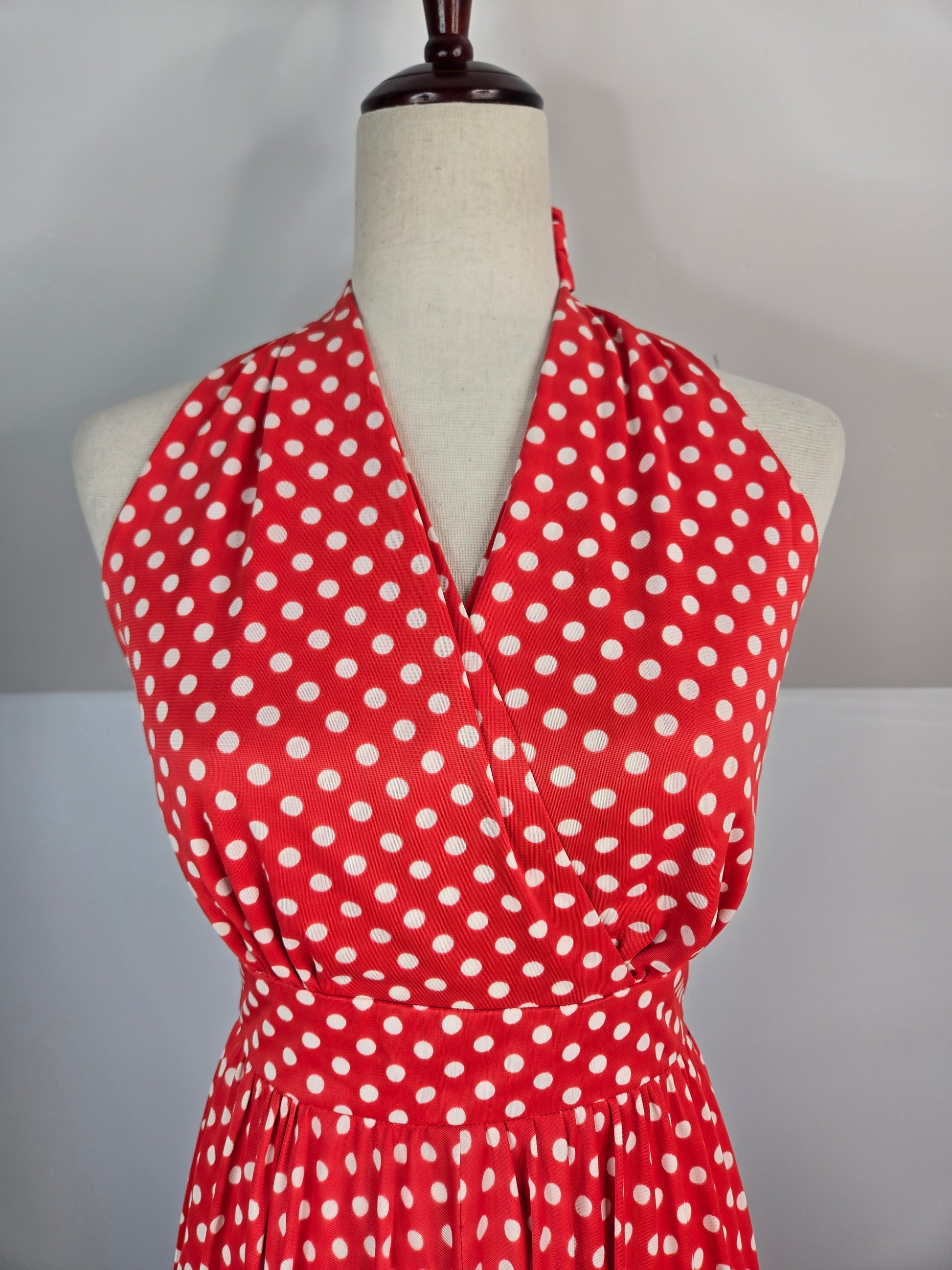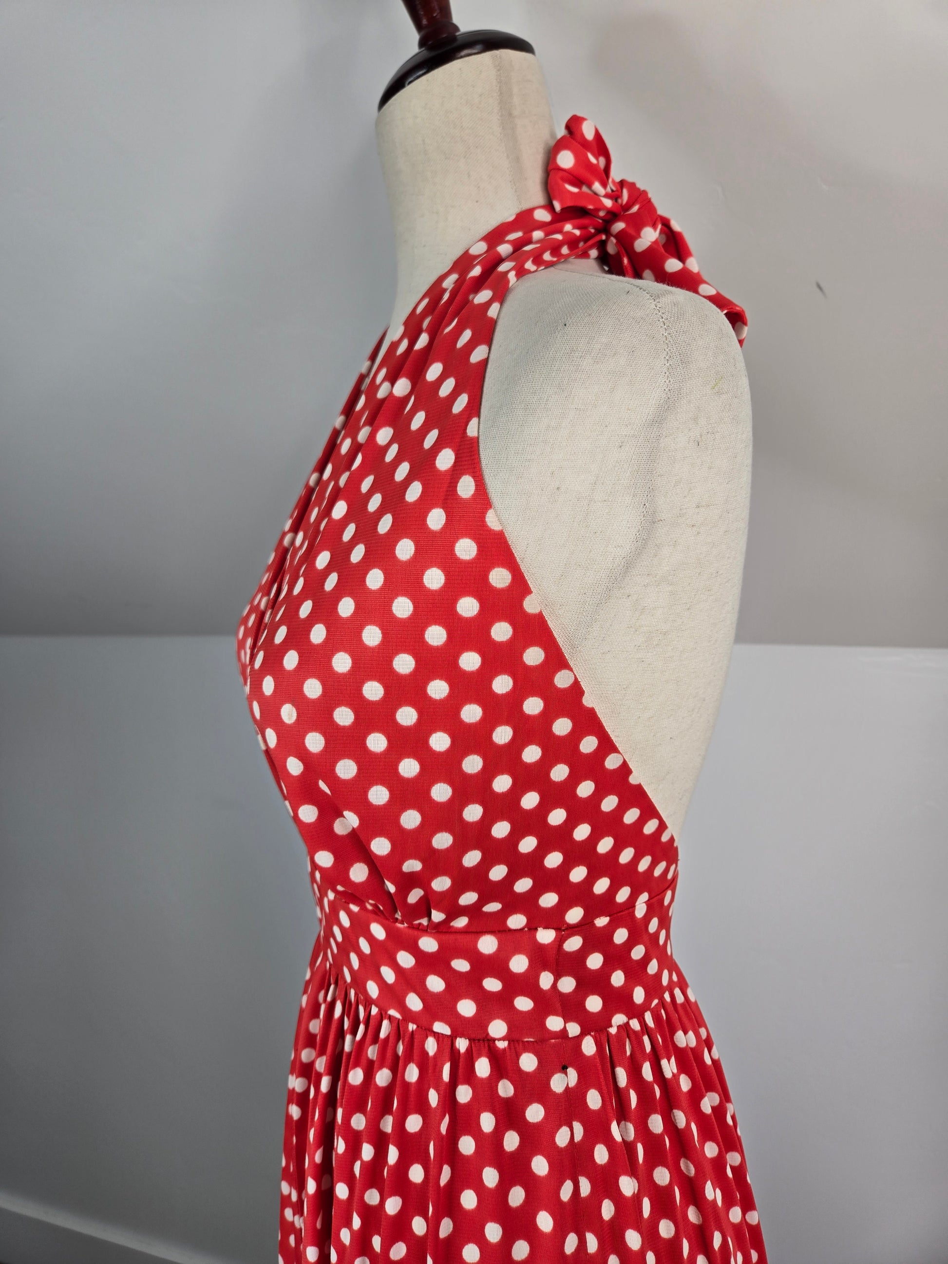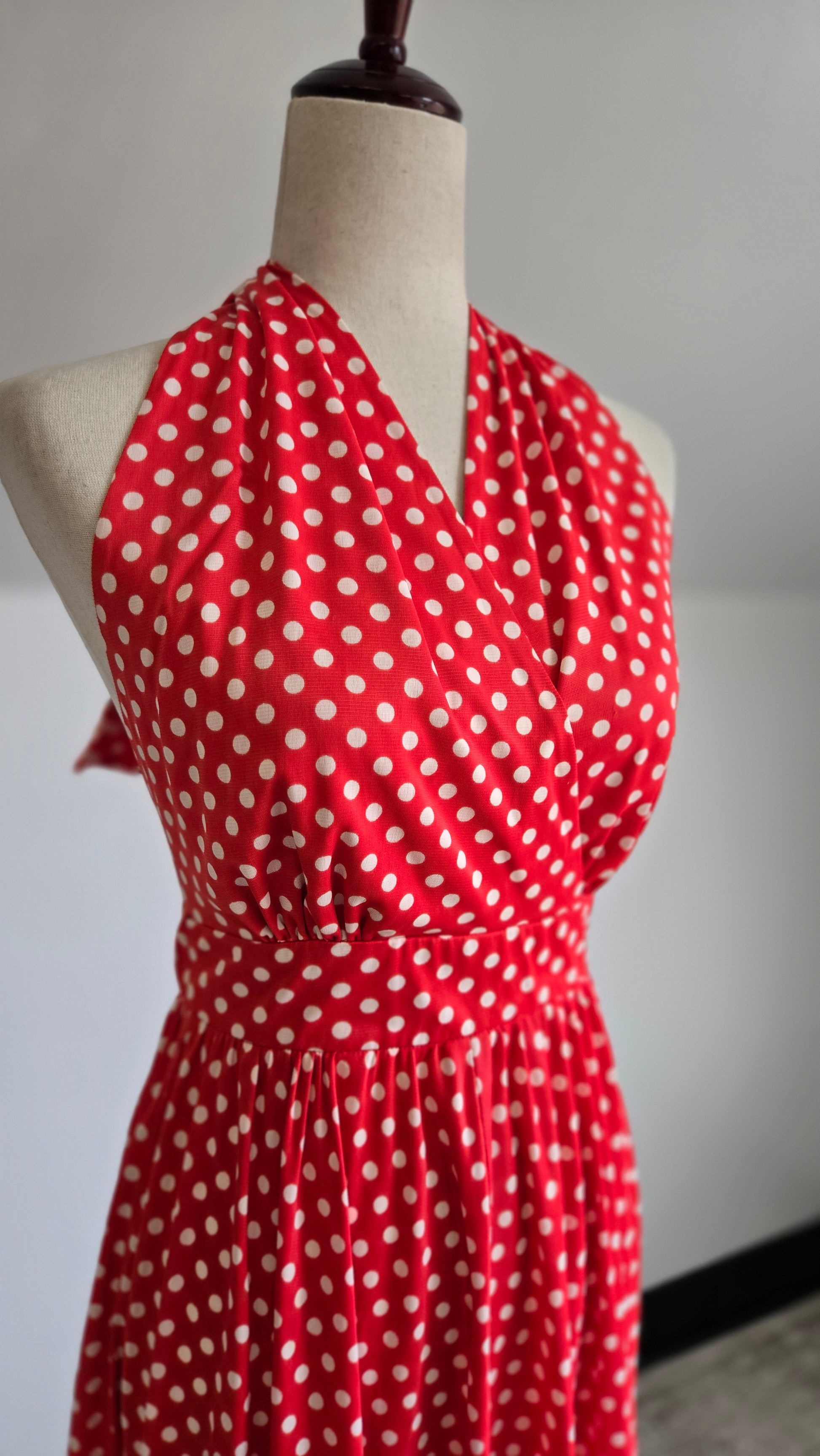 Vintage 1960s red with white polka dots nylon halter dress. It has a zipper in the back for the waistline and it ties on the top. Looks like the tag has been cut out but this is definitely a vintage nylon material, and she is stunning!!