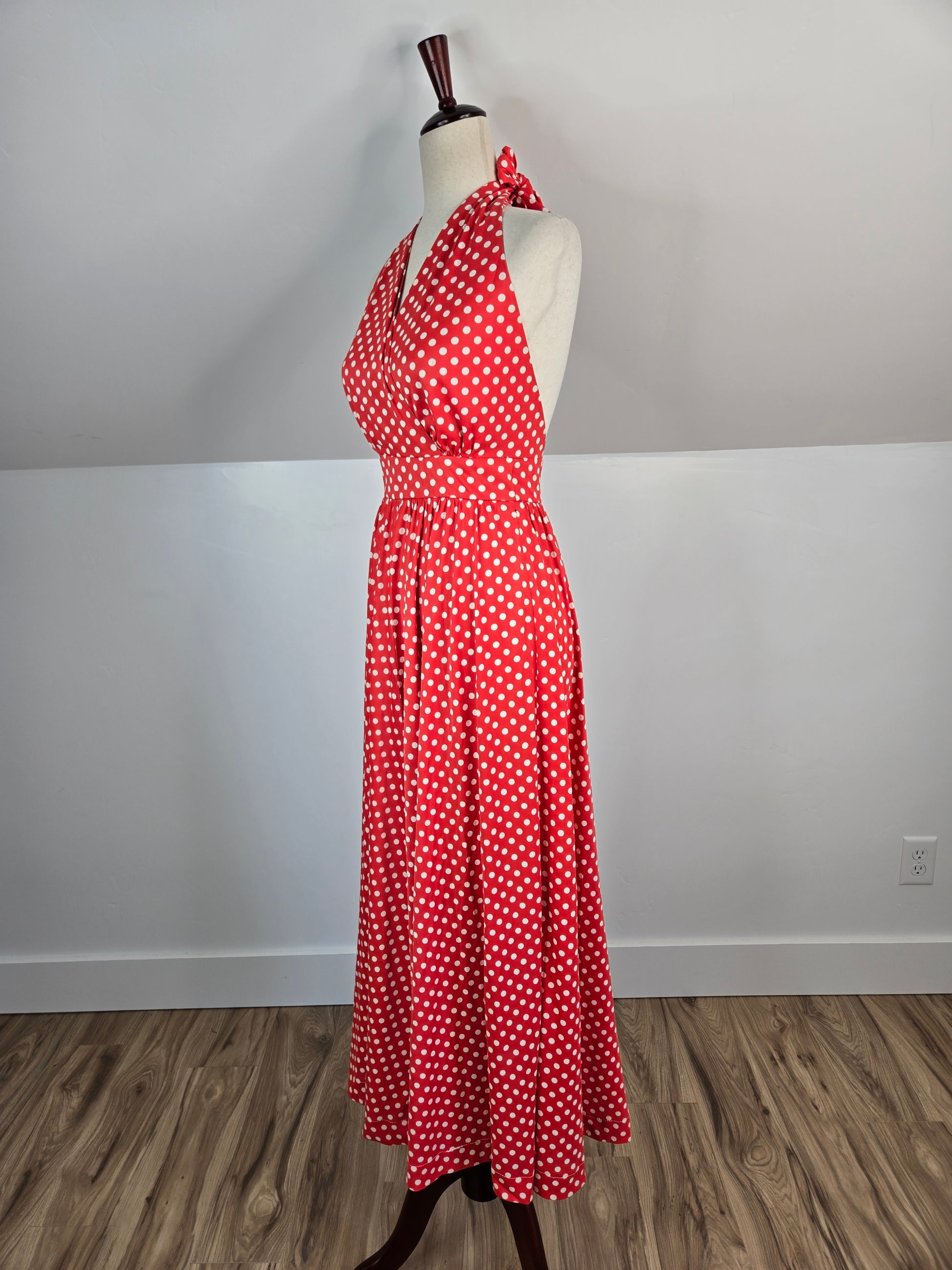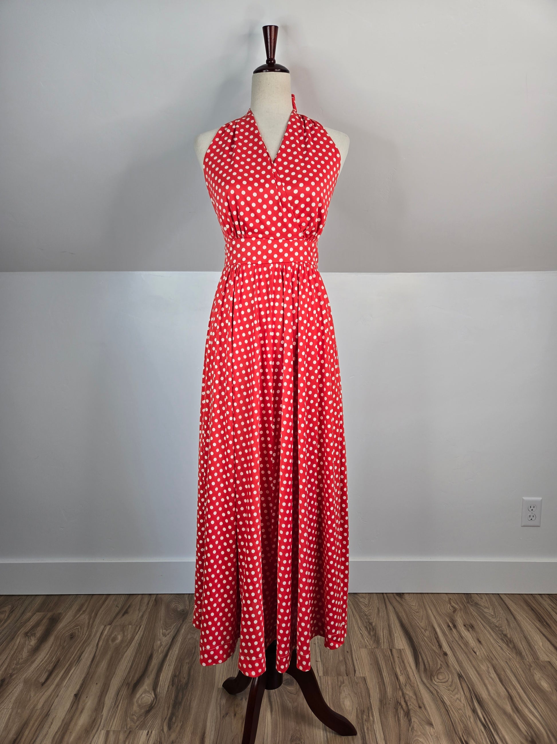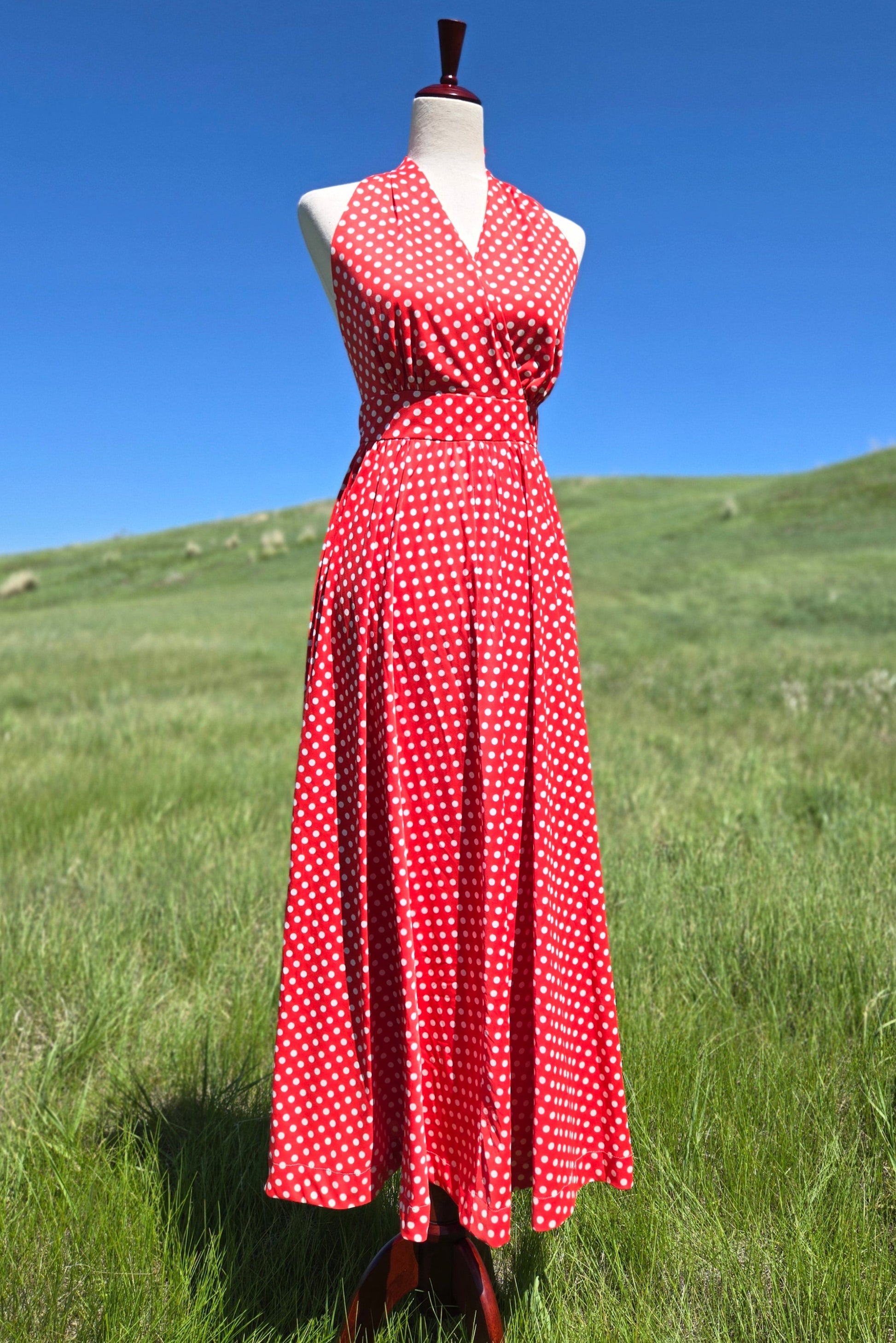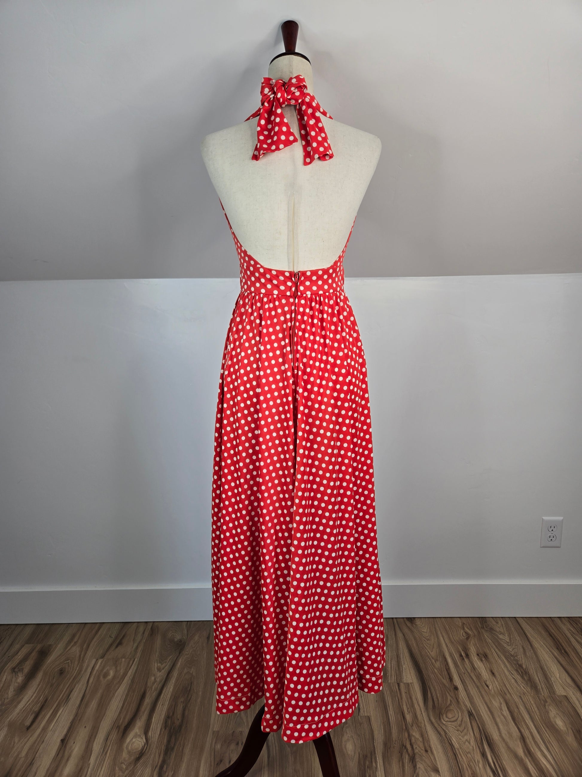 Vintage 1960s red with white polka dots nylon halter dress. It has a zipper in the back for the waistline and it ties on the top. Looks like the tag has been cut out but this is definitely a vintage nylon material, and she is stunning!!