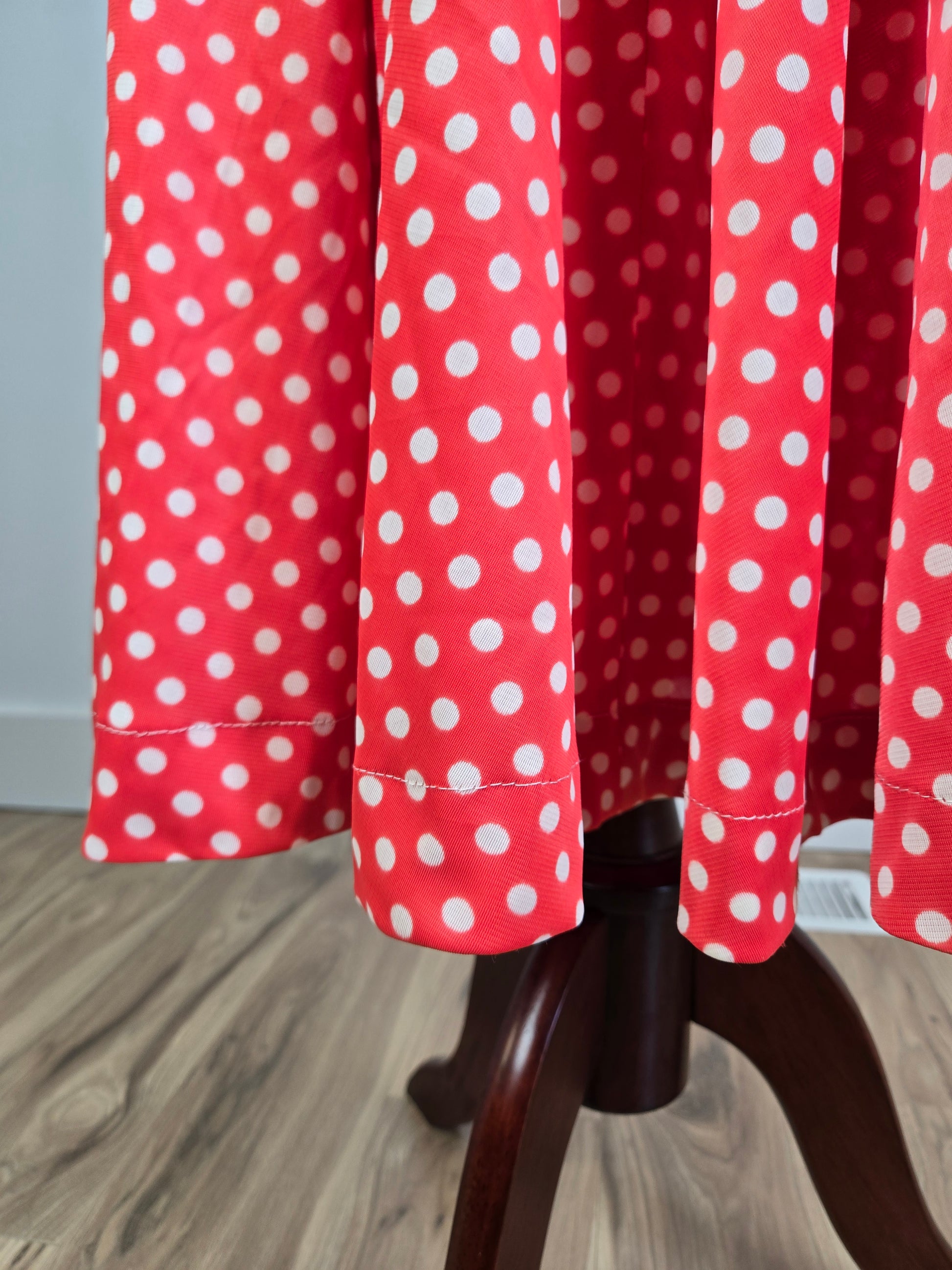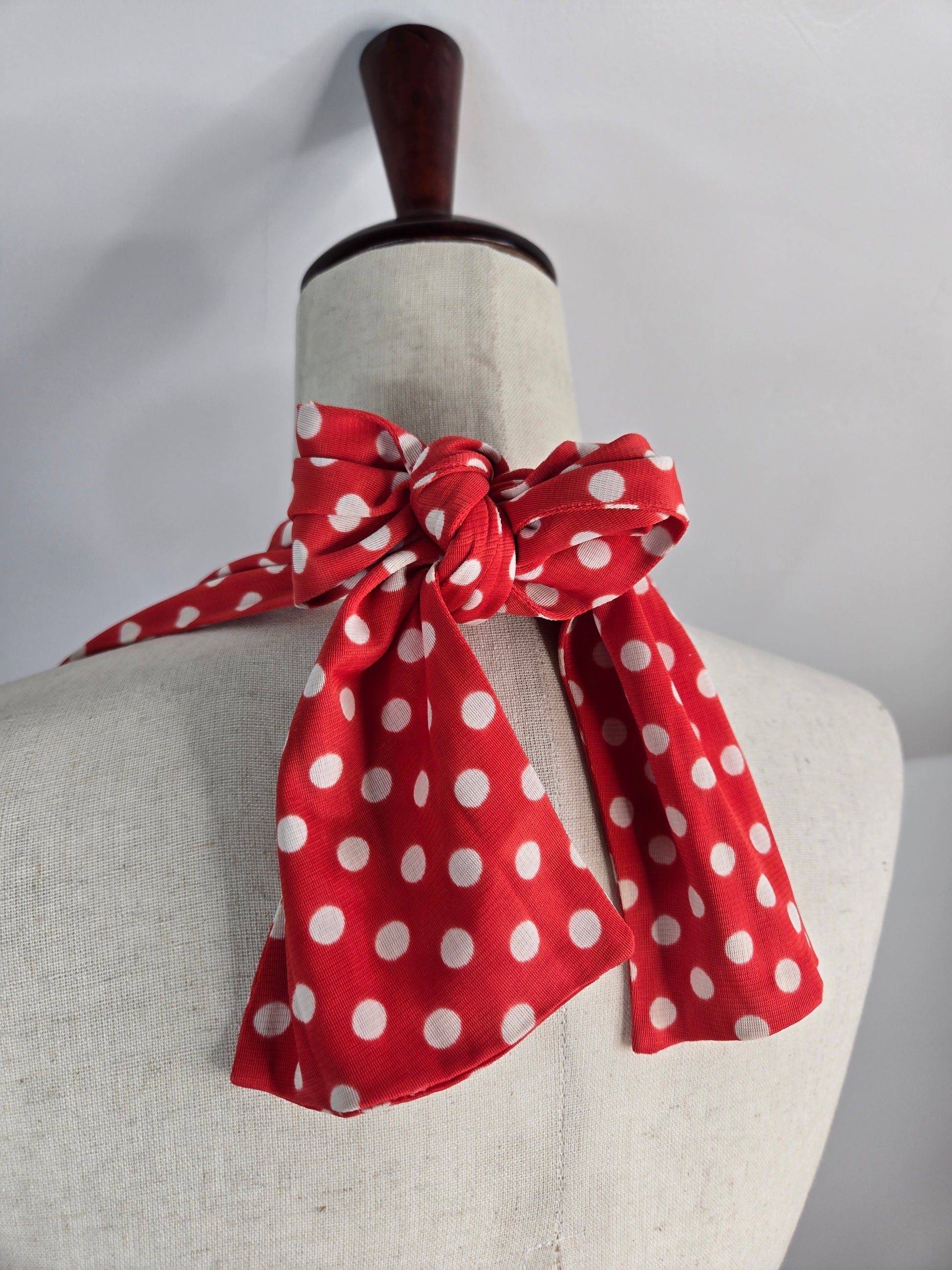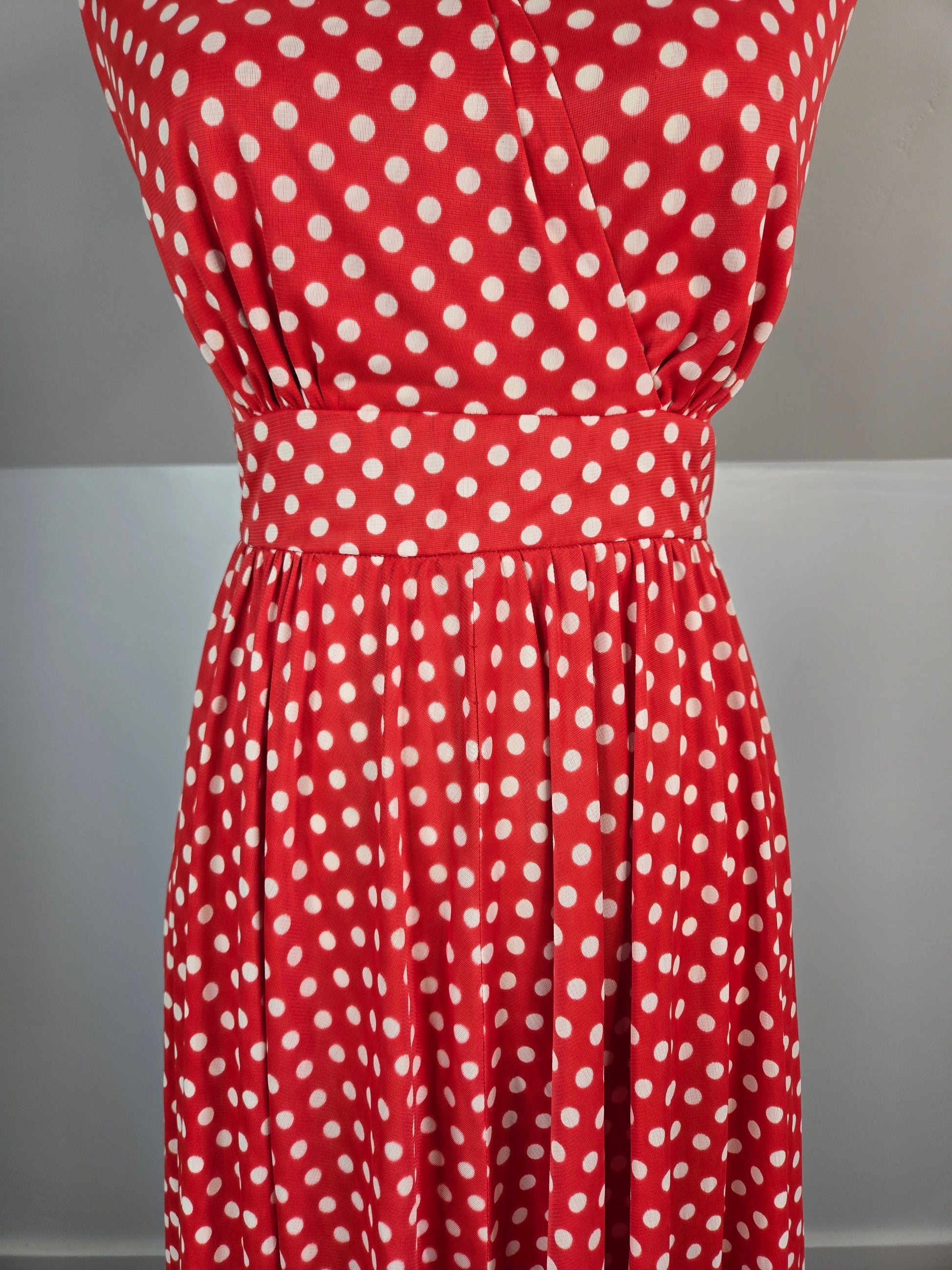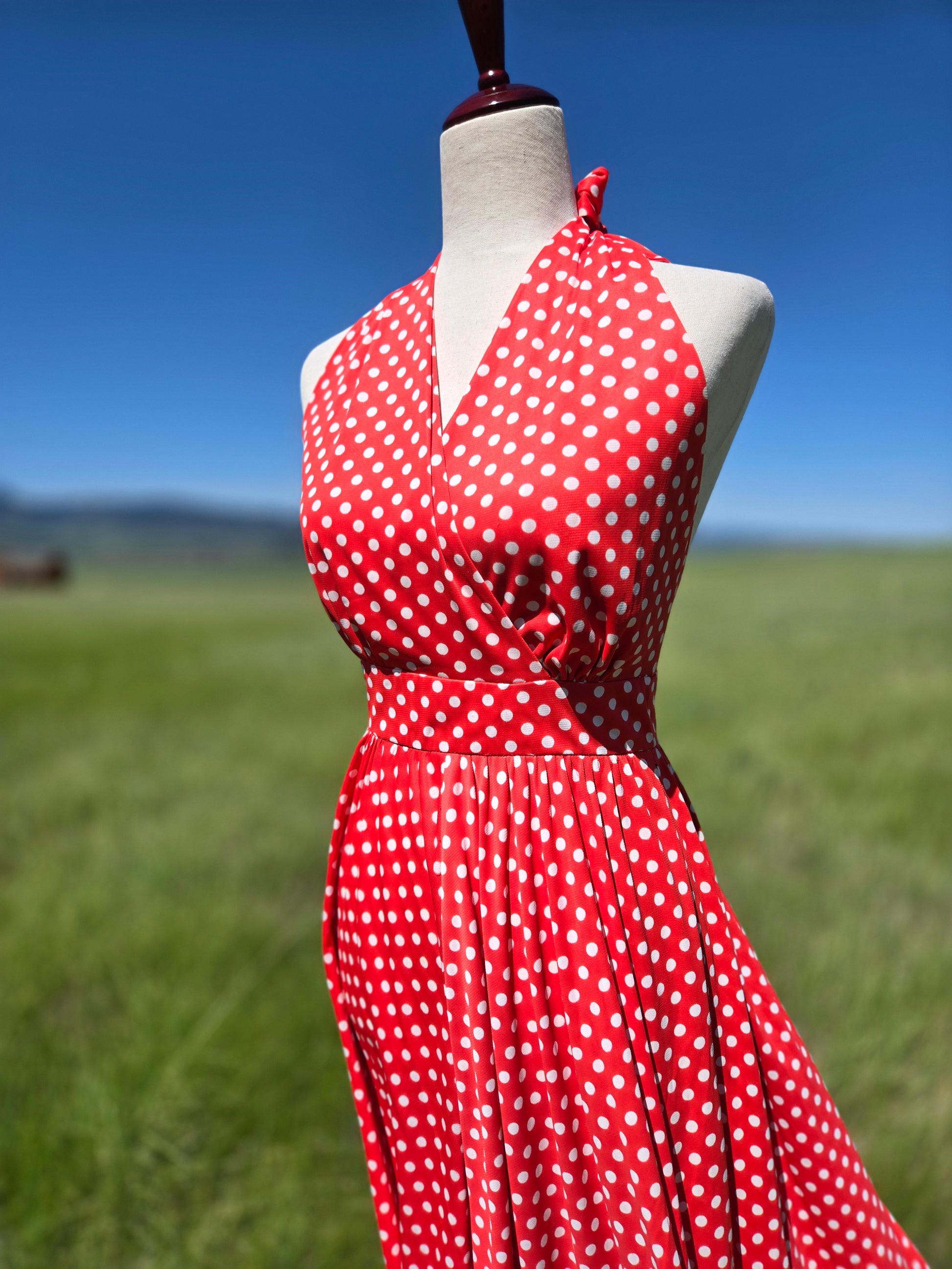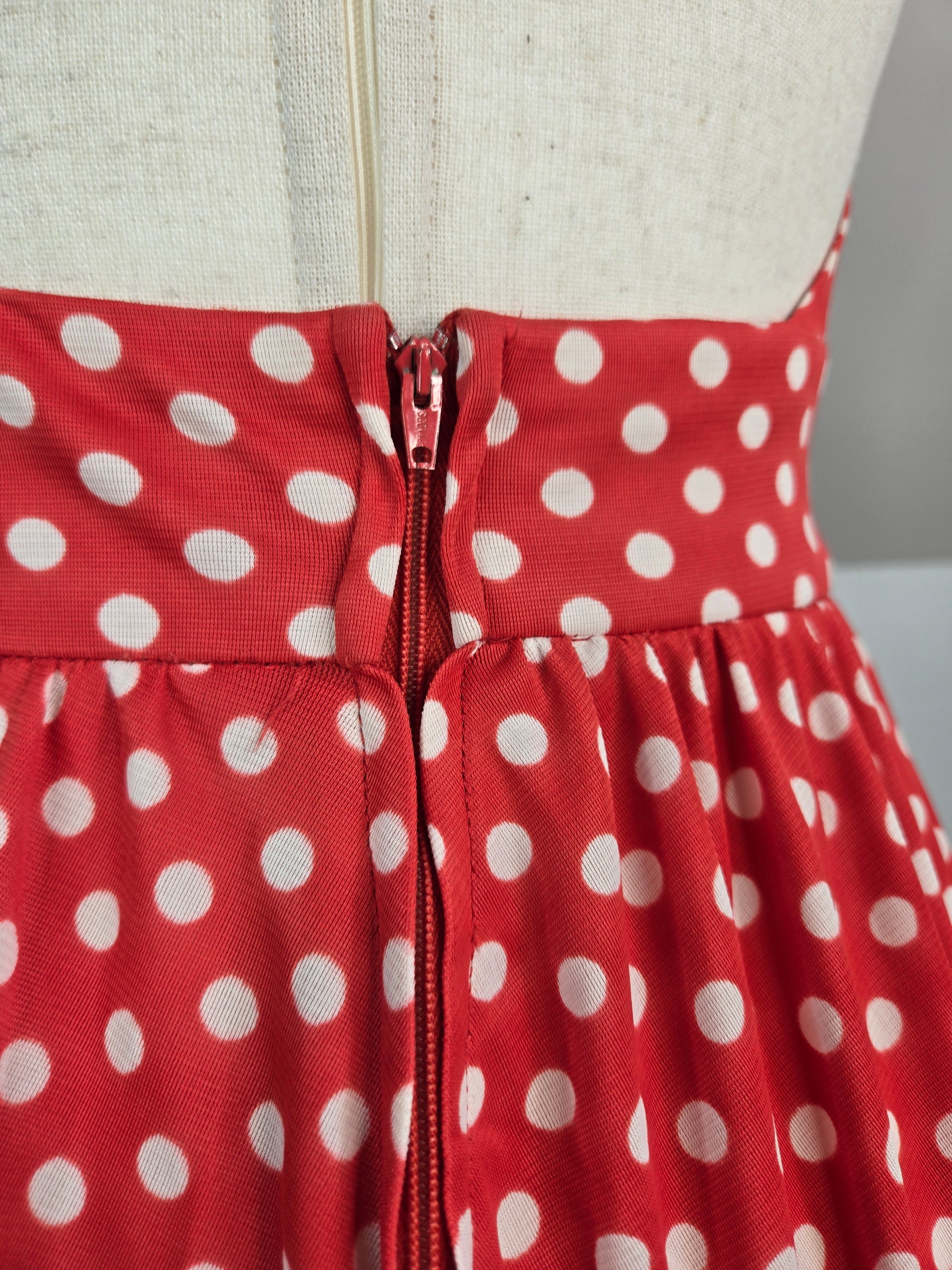 Vintage 1960s red with white polka dots nylon halter dress. It has a zipper in the back for the waistline and it ties on the top. Looks like the tag has been cut out but this is definitely a vintage nylon material, and she is stunning!!