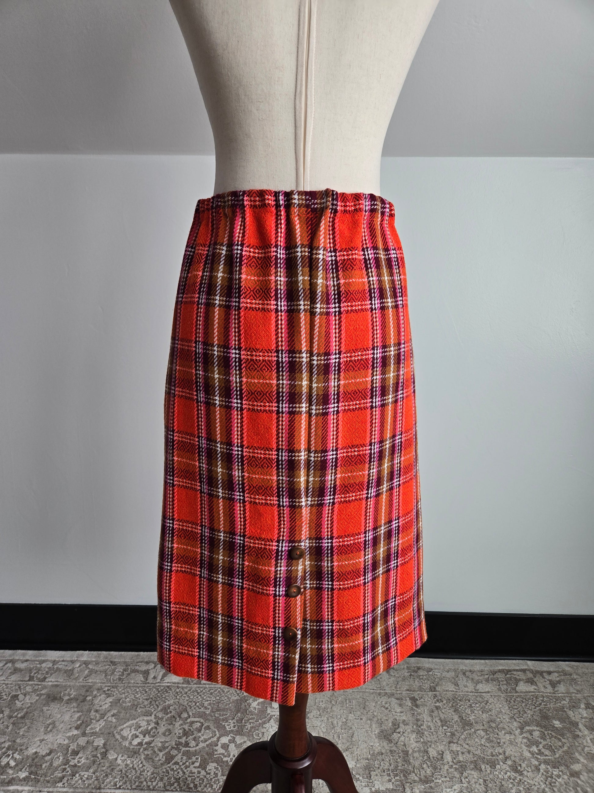 Vintage 70s colorful plaid double knit polyester skirt with elastic waistband. It is a hand made piece and most likely was part of a set. It has cute button details down the kick split at the back hem. It's the colors for me! Would be so cute hemmed short too! The elastic is healthy and it is in great condition. I'm calling it a "small" because of the hip measurement.