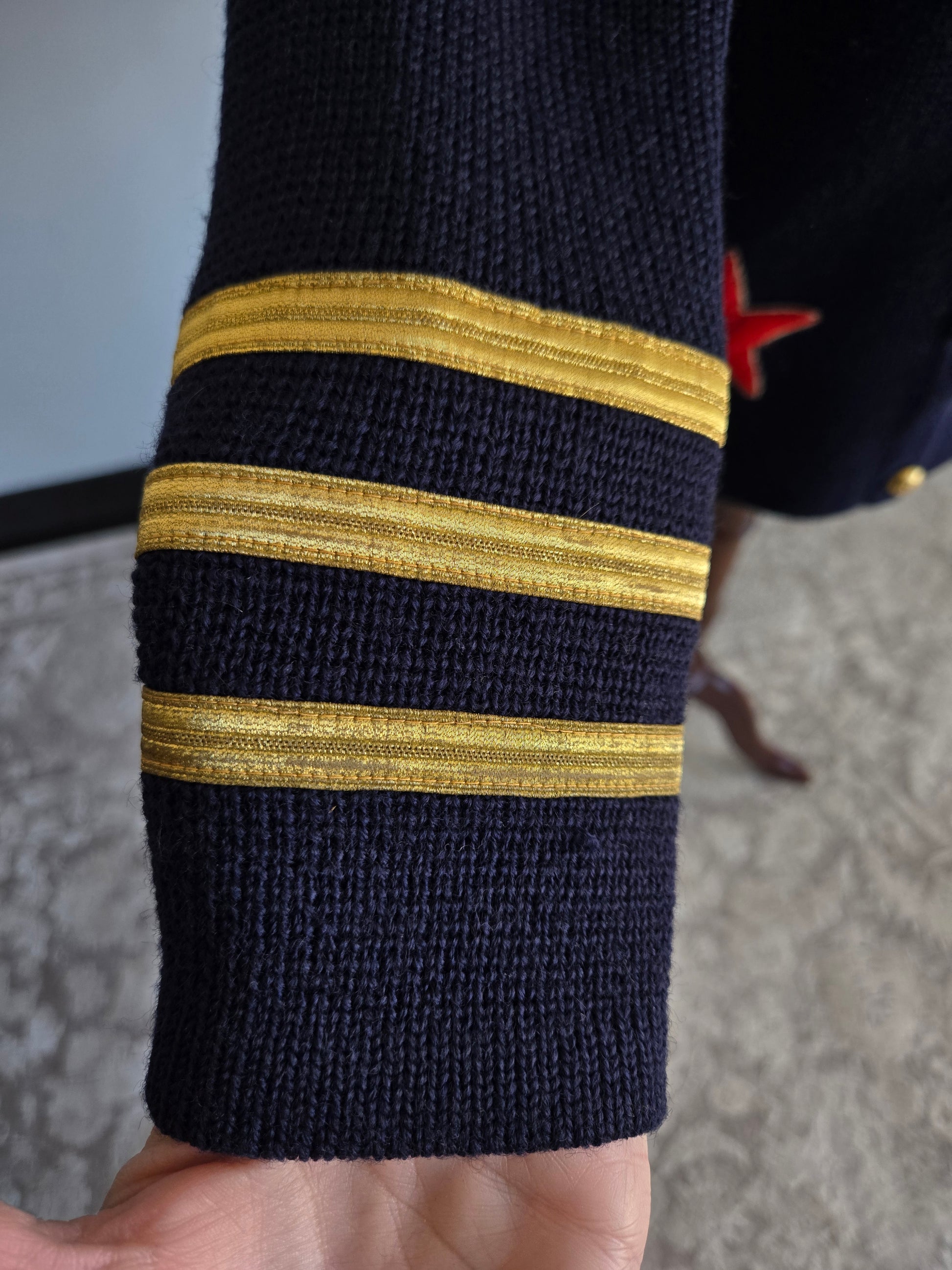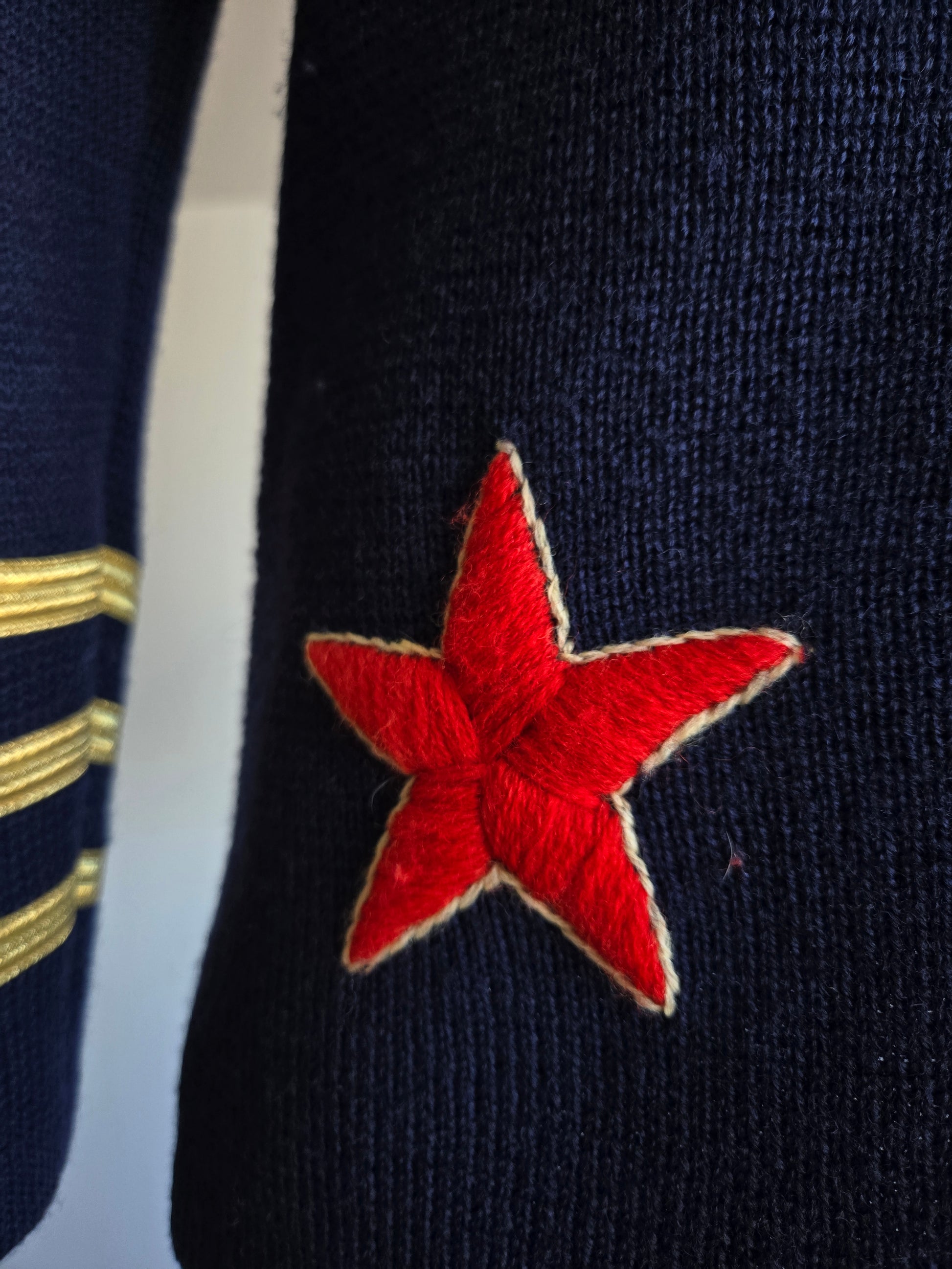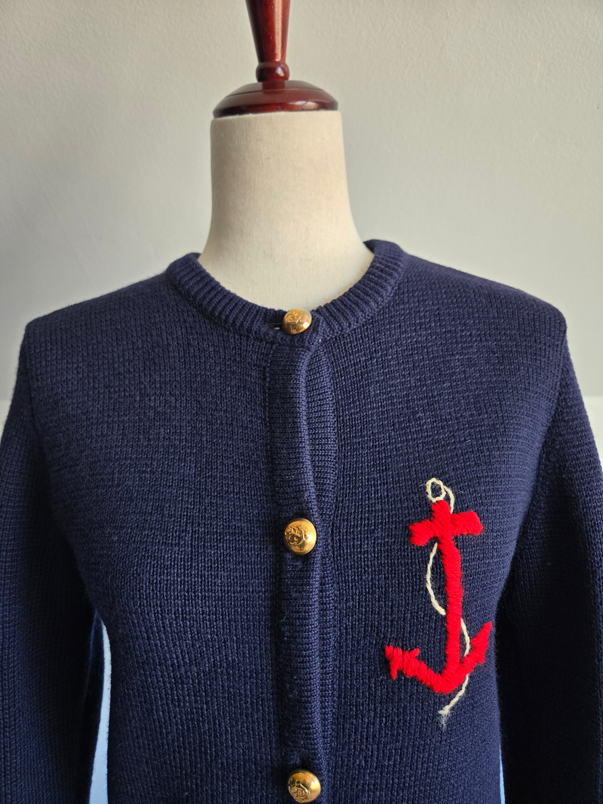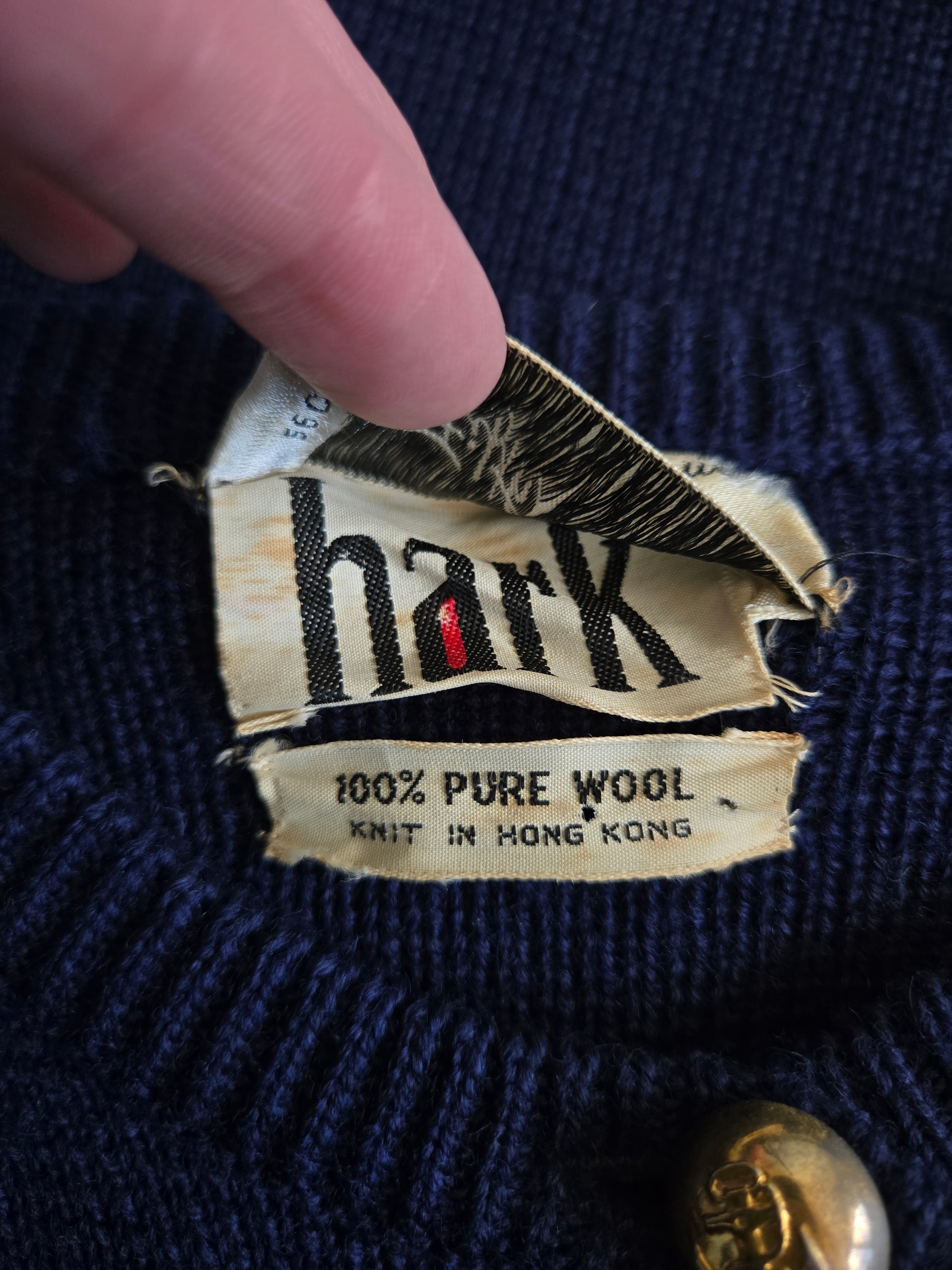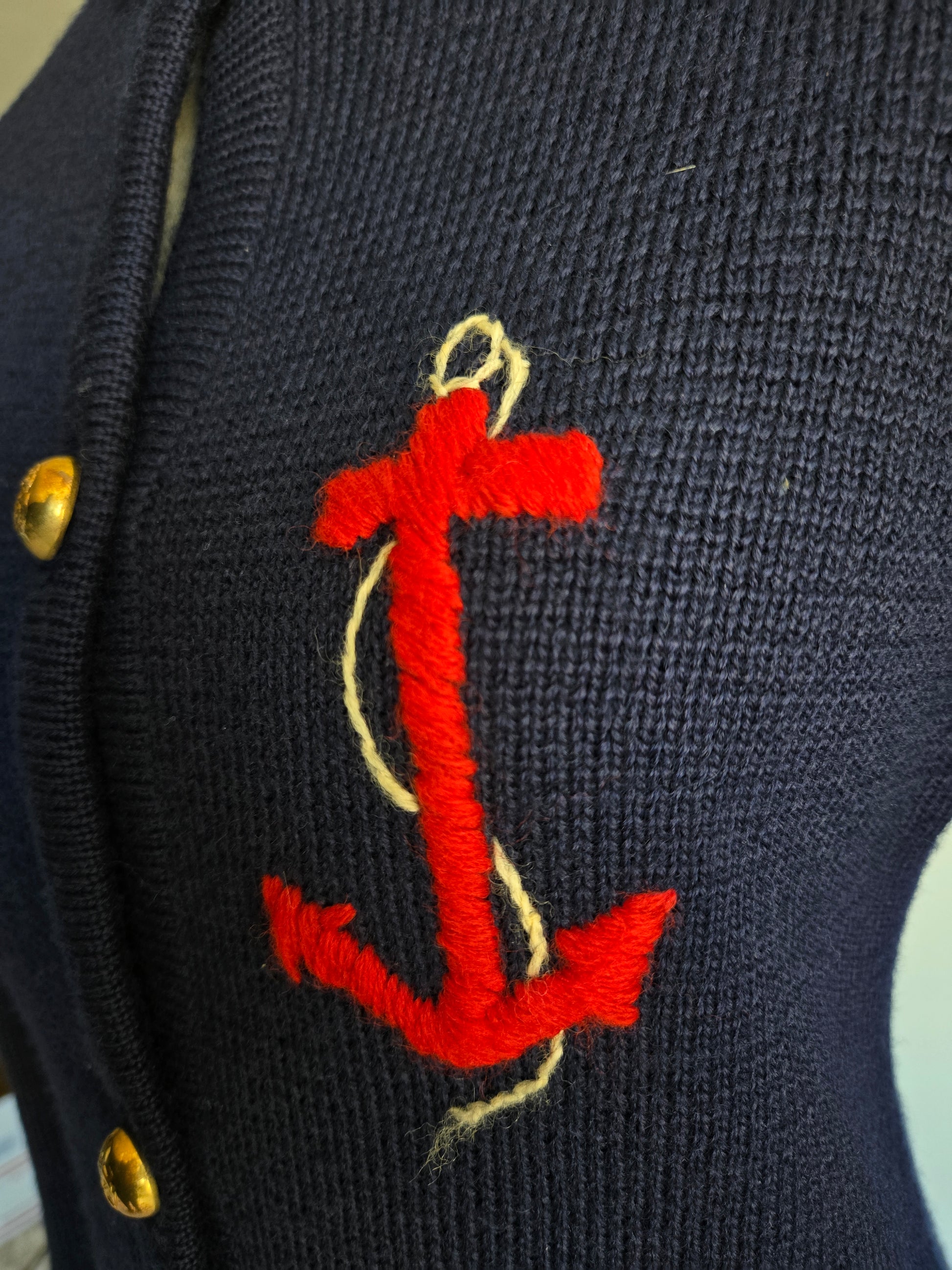Vintage 50s Hark for Saks Fifth Avenue 100% pure wool cardigan. It is hand knit in Hong Kong and is a navy base with red knit anchor and star accents. The gold striping at the cuffs is sewn on to the fabric and the buttons are solid brass so there is some weight to them and a little bit of patina! The buttons also have little anchors on them as well. The details feel endless!