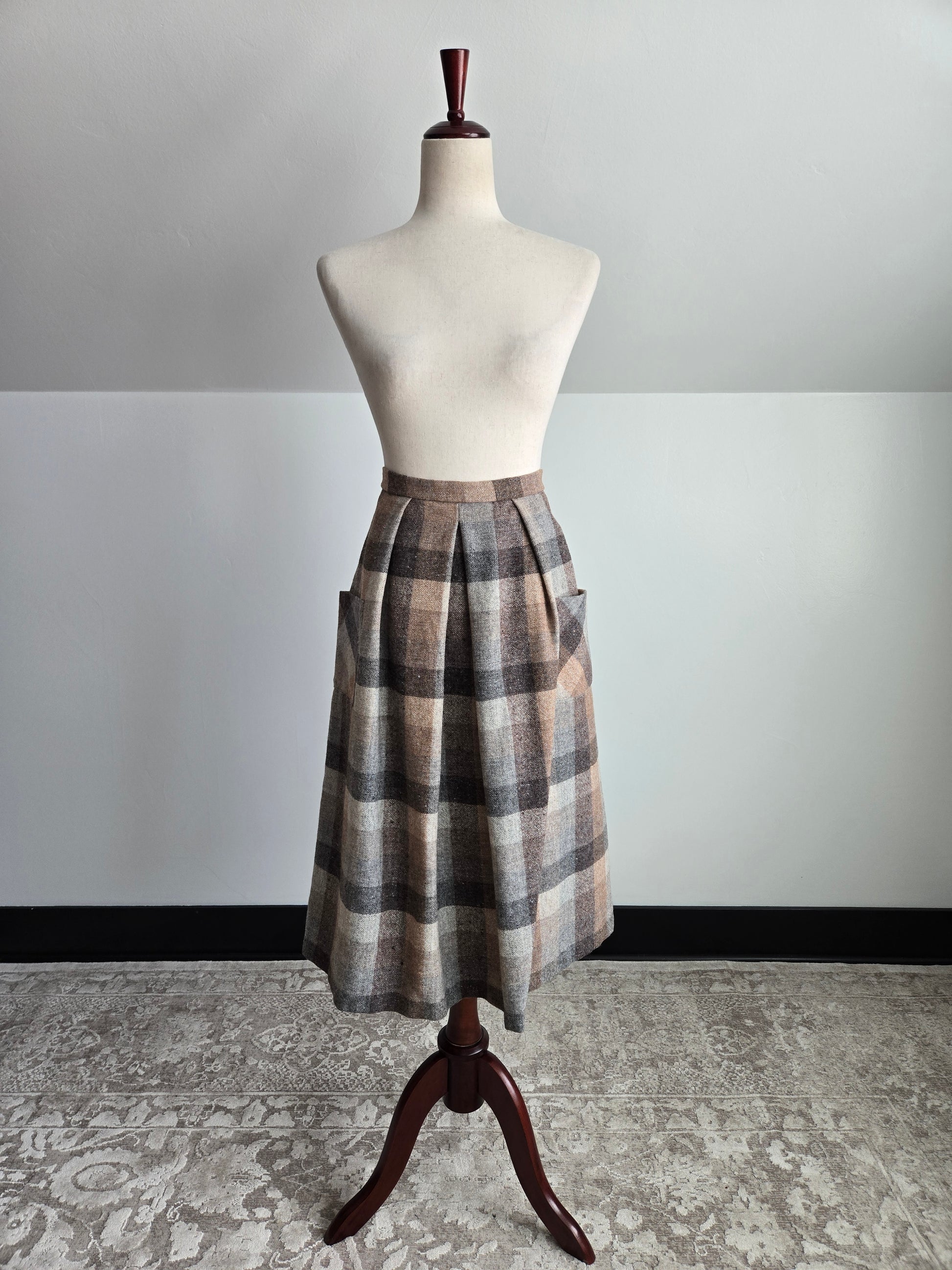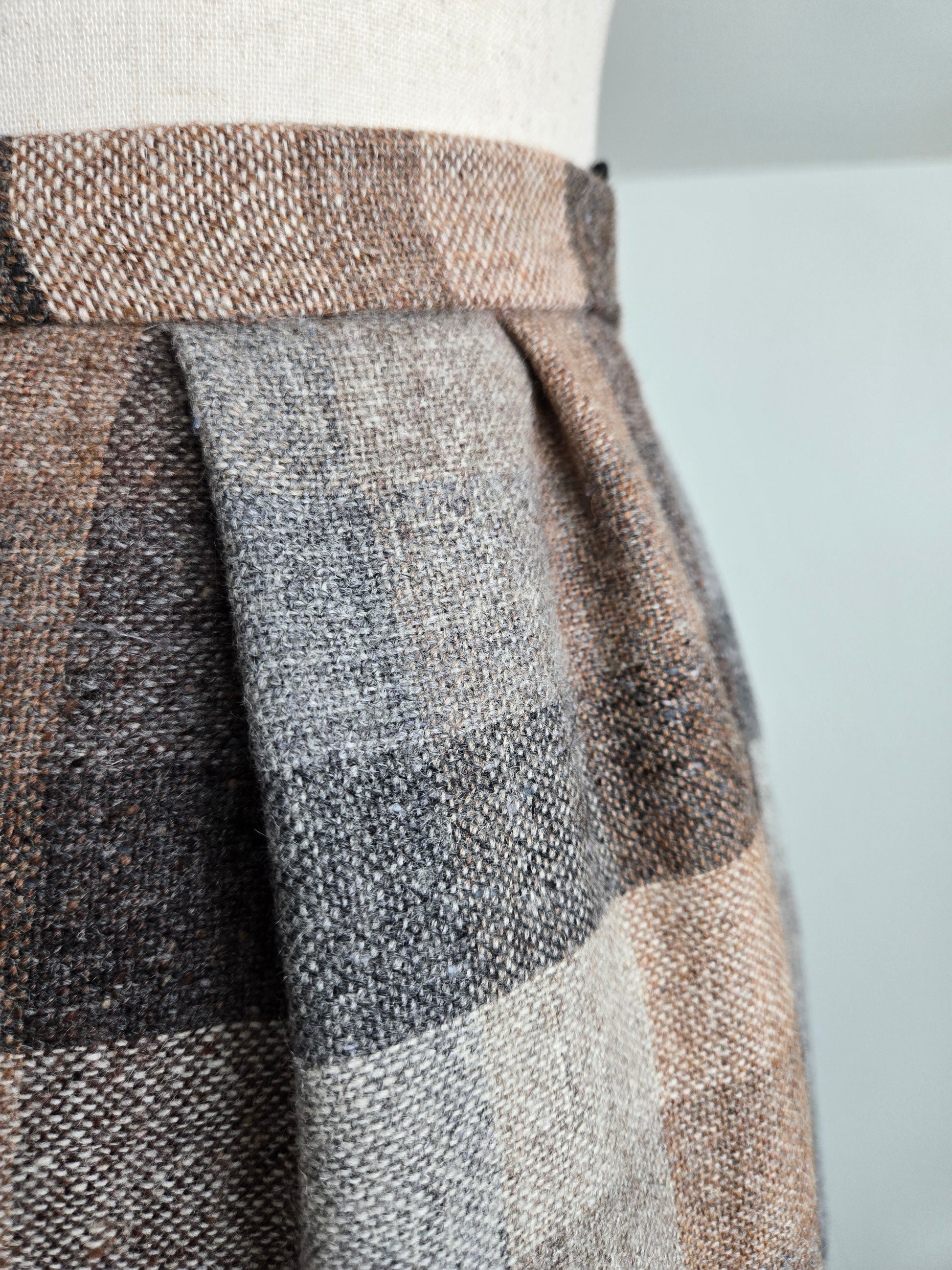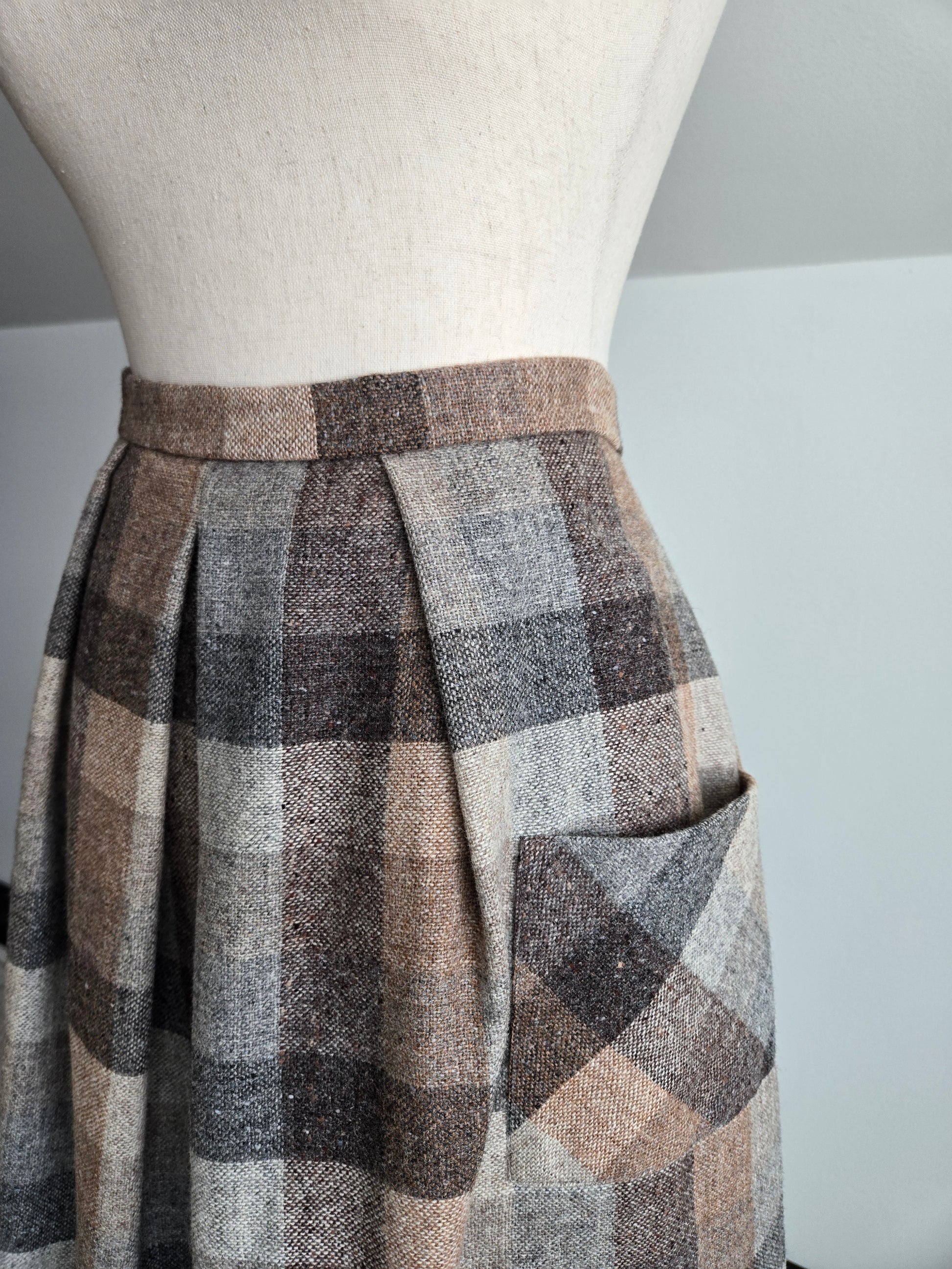 Vintage Scottish wool neutral plaid skirt from the Edinburgh Woolen Mill made in Great Britain. This skirt!!!! It is a gorgeous palette of grays and browns and has beautiful pleat work at the front with two side utility drop pockets. It zips and buttons in the back to get into it and has a full liner. I have thoroughly washed it and it has been steamed as well, so it is clean and ready to wear. I love the bias cut plaid at the side pockets! It is in perfect condition and a very hard to find size.