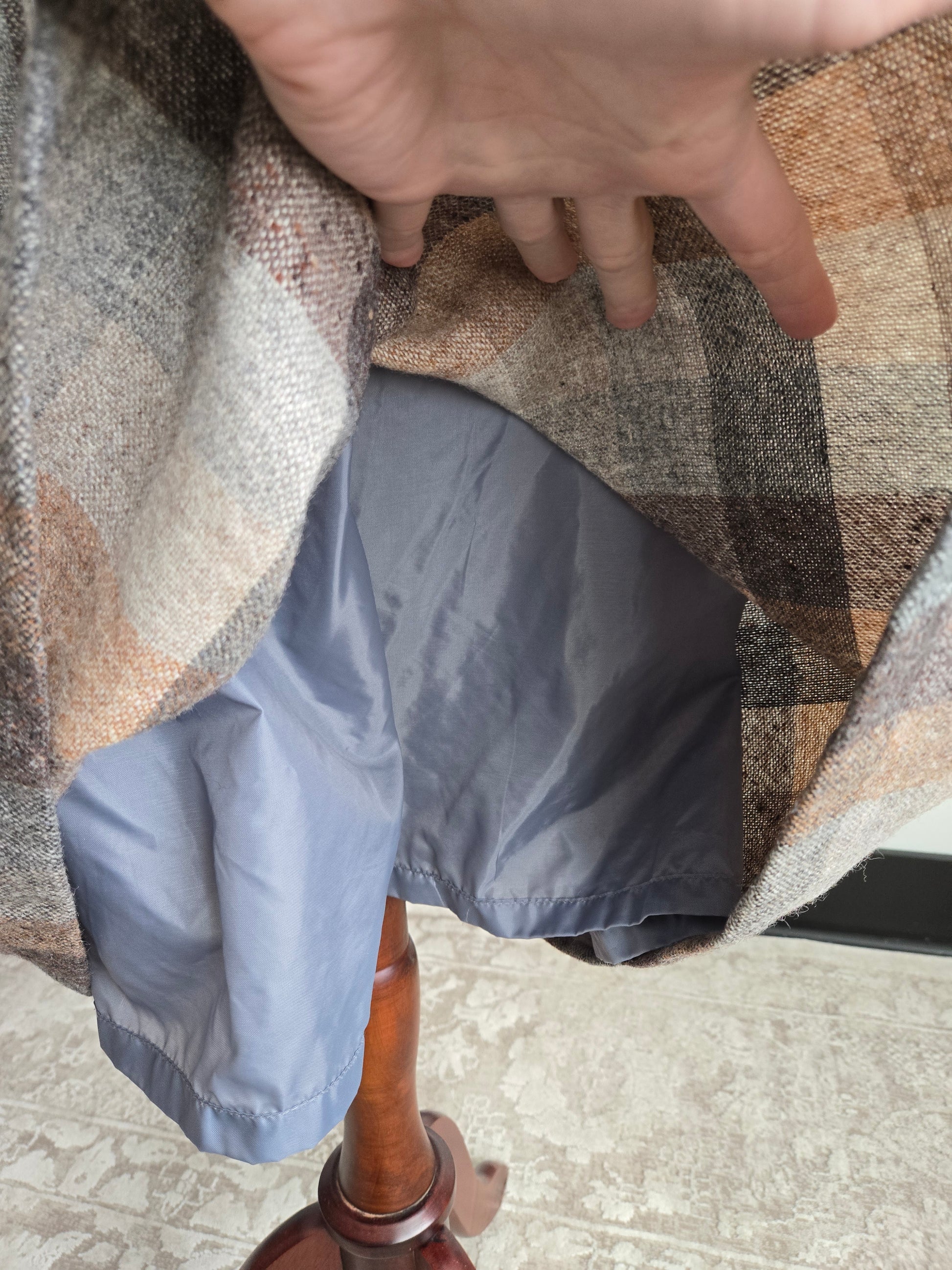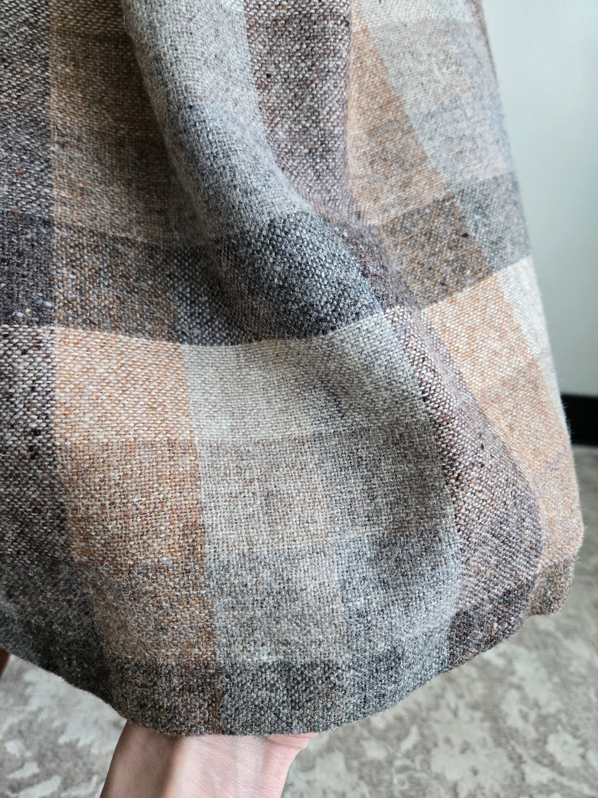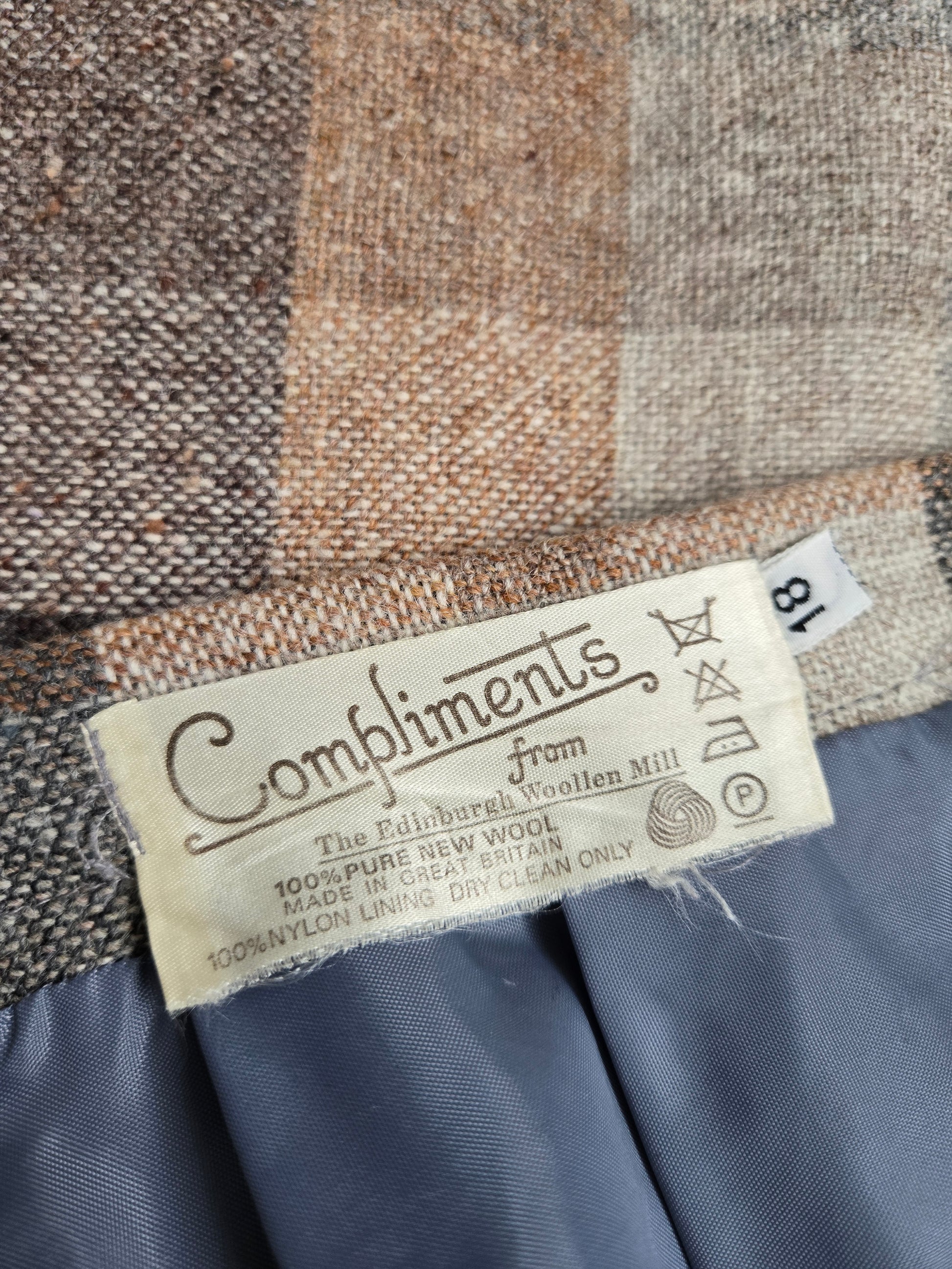 Vintage Scottish wool neutral plaid skirt from the Edinburgh Woolen Mill made in Great Britain. This skirt!!!! It is a gorgeous palette of grays and browns and has beautiful pleat work at the front with two side utility drop pockets. It zips and buttons in the back to get into it and has a full liner. I have thoroughly washed it and it has been steamed as well, so it is clean and ready to wear. I love the bias cut plaid at the side pockets! It is in perfect condition and a very hard to find size.