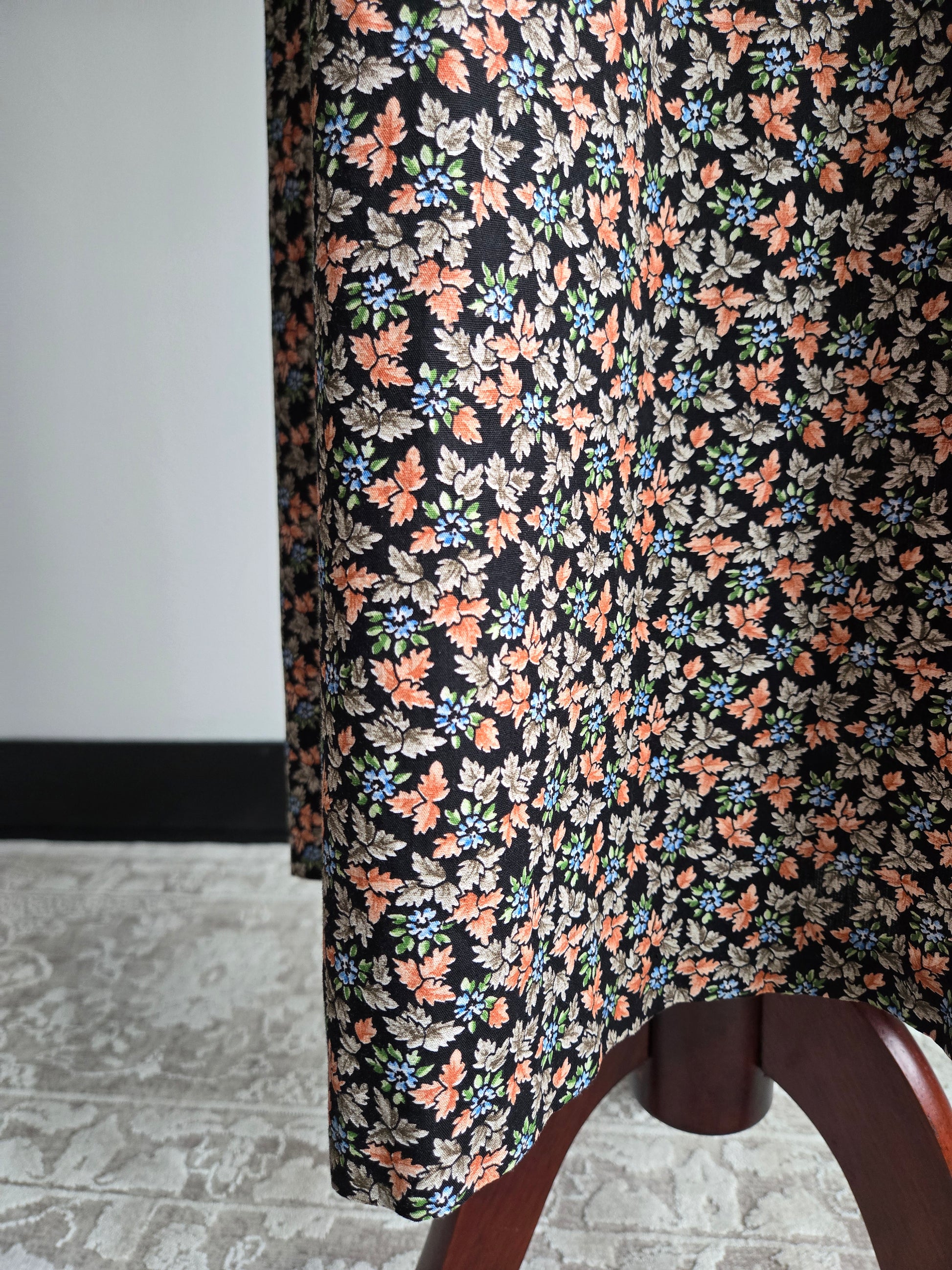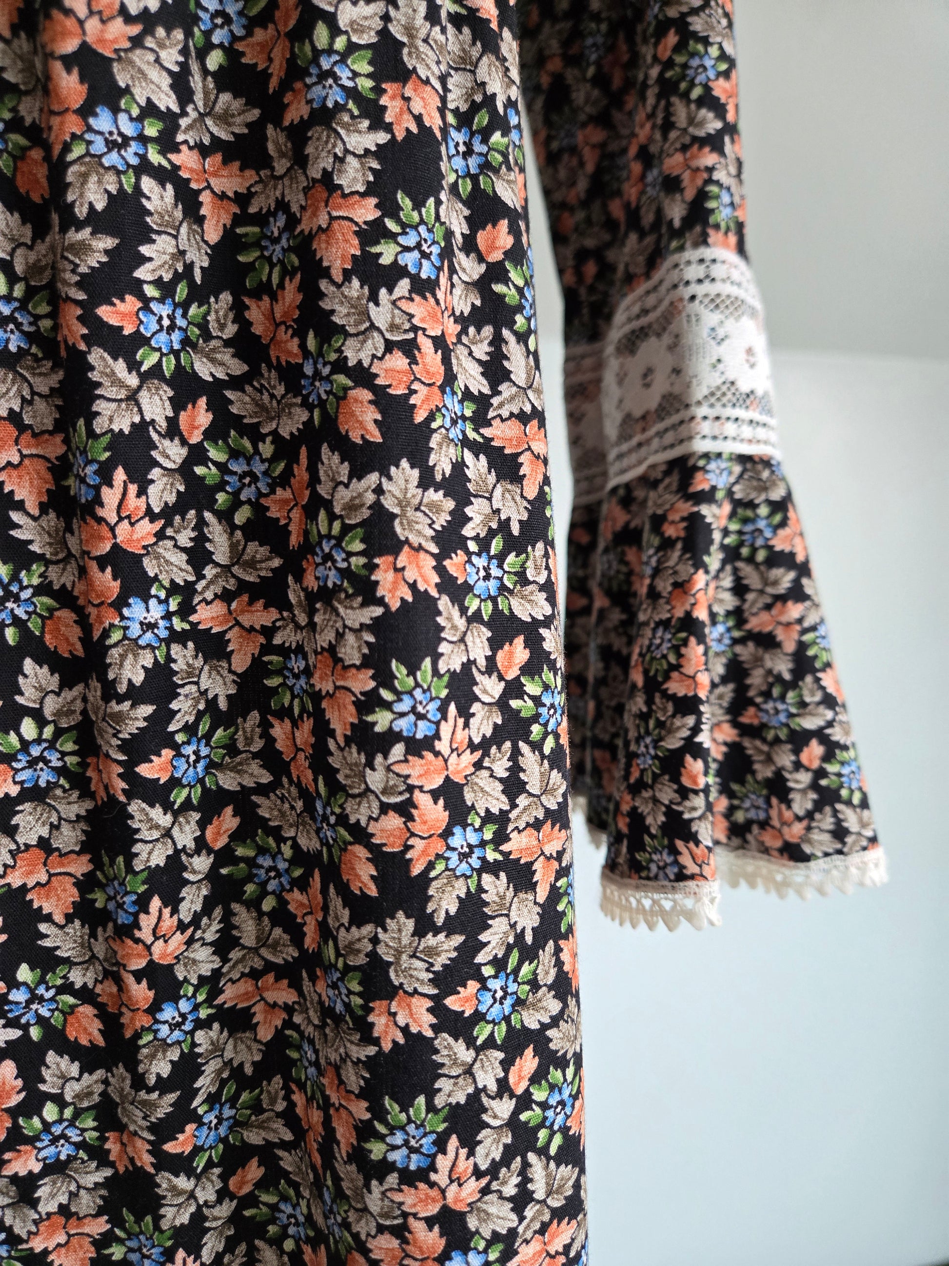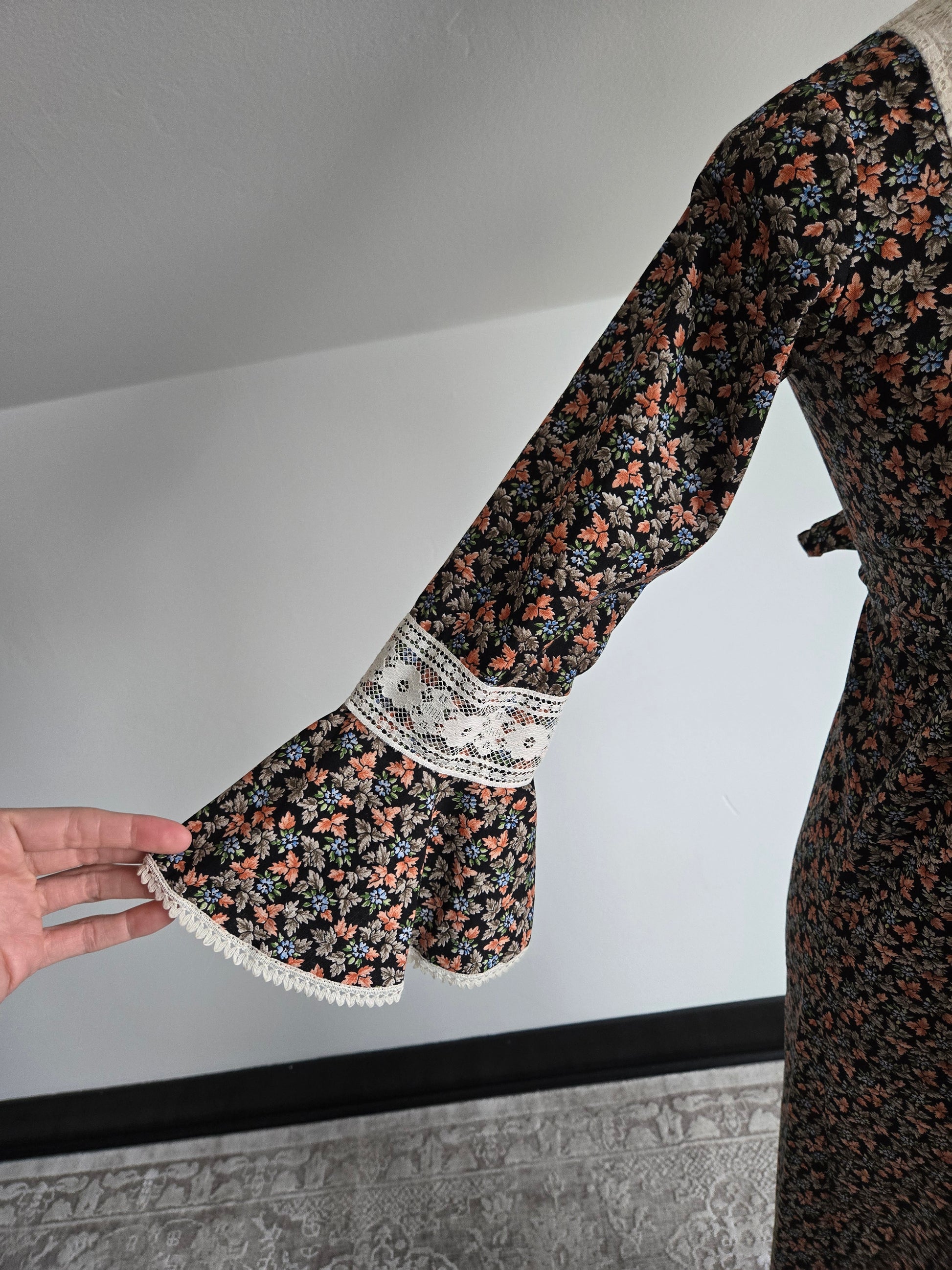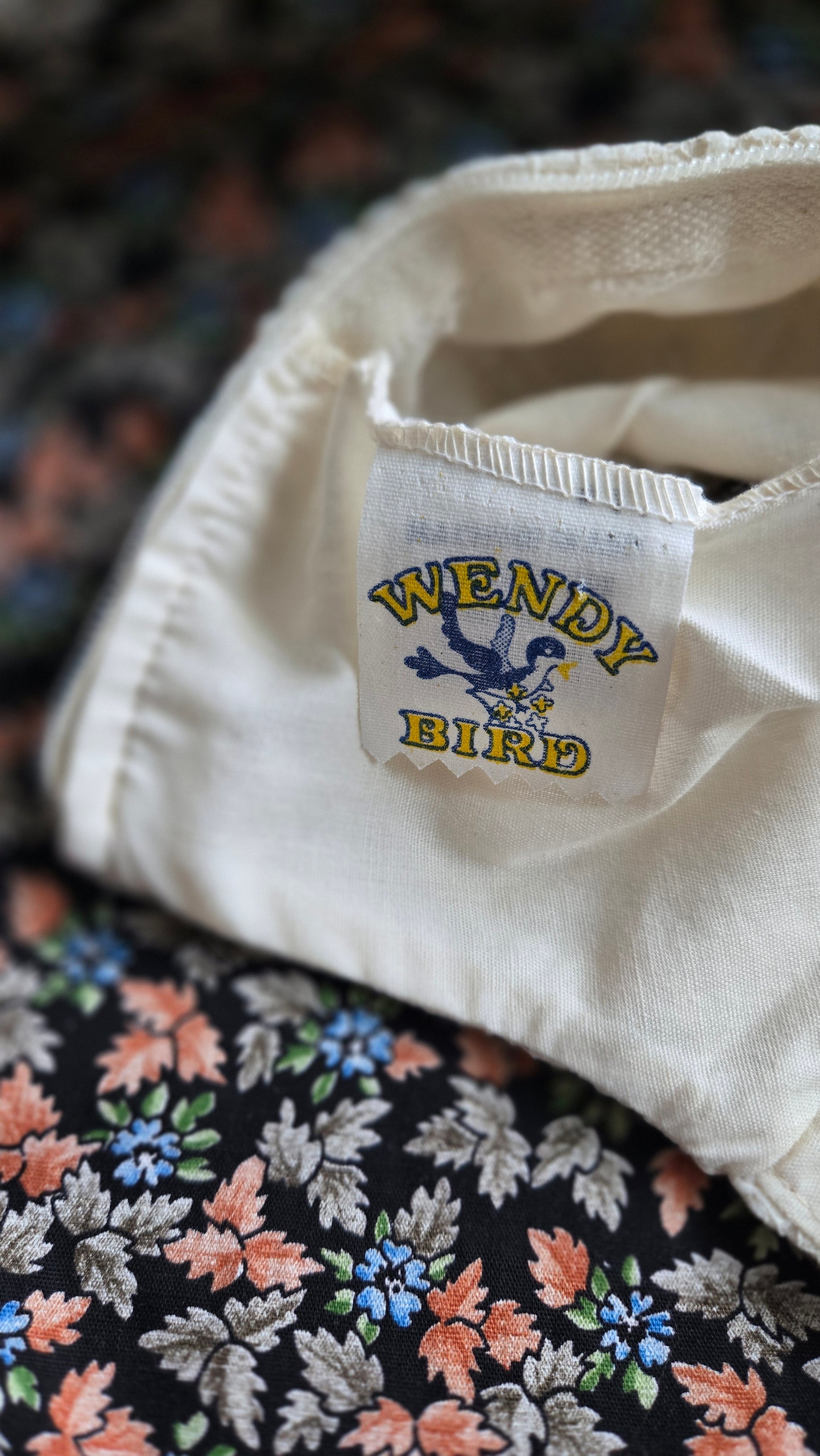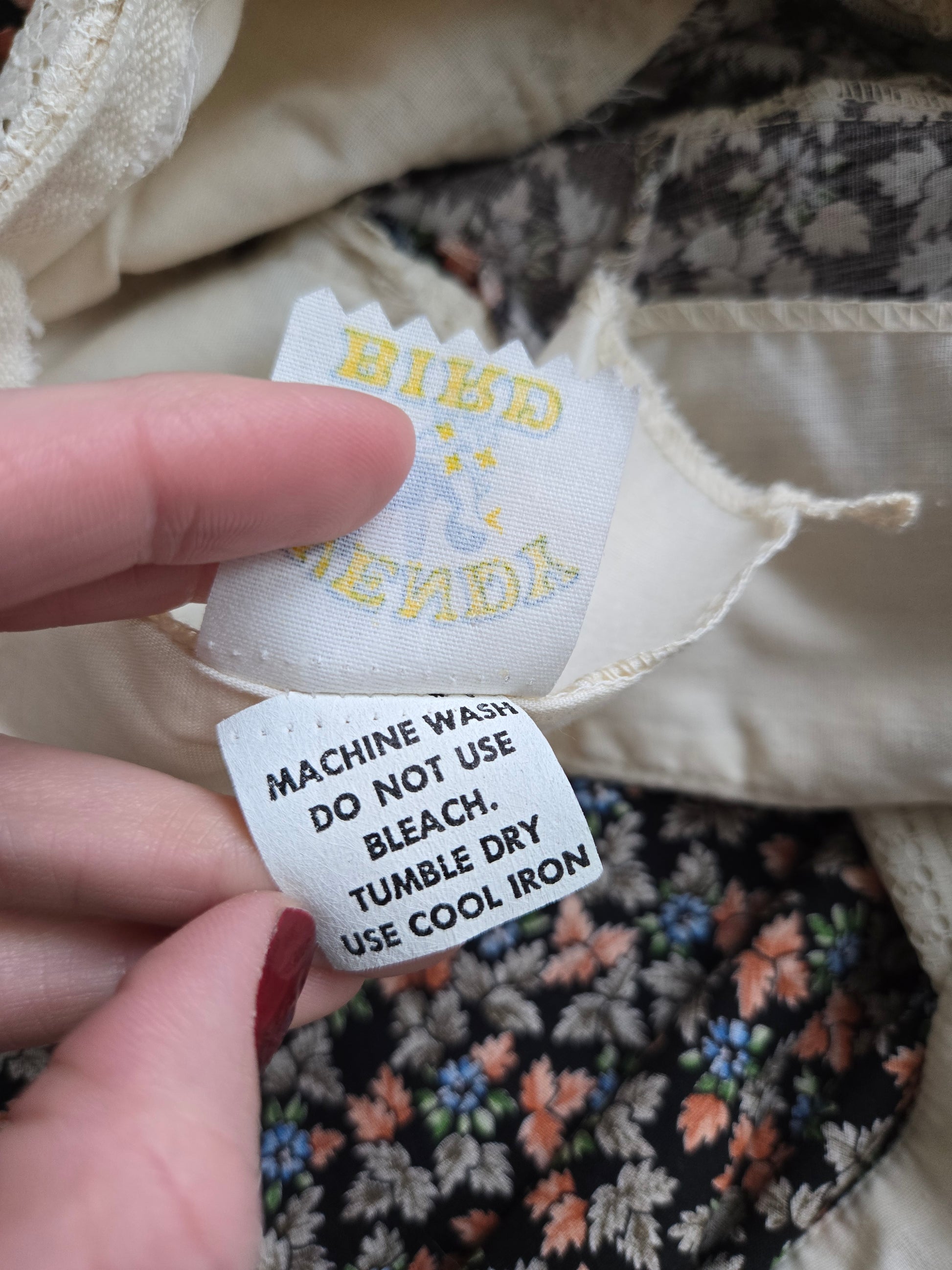 Vintage Wendy Bird 1960s micro floral prairie dress with the lace bib front. It has 3/4 length bell sleeves and button accents down the front. The main fabric is a cotton or cotton blend, but it does not specify.It has a very Gunne Sax style to it. Zips in the back and also has an attached waist tie It is machine washable, and I have already washed and steamed it, so it is ready to wear. Great condition.