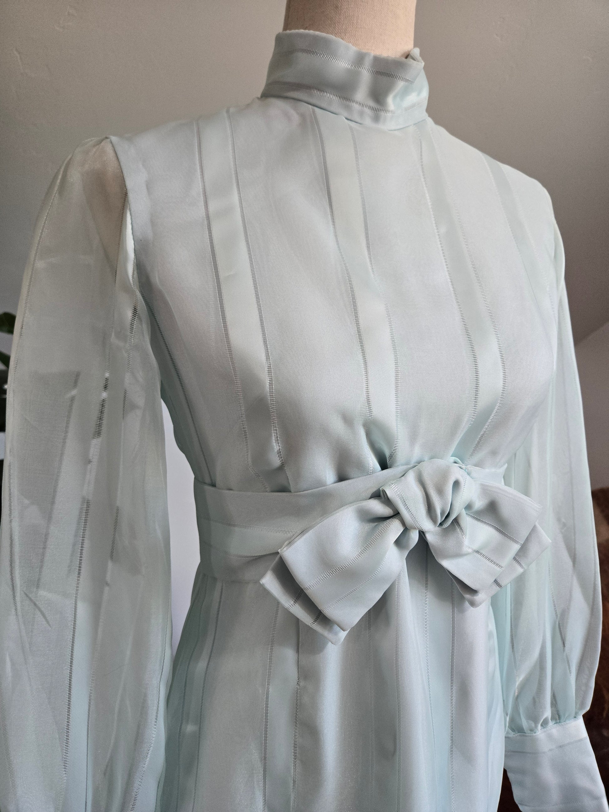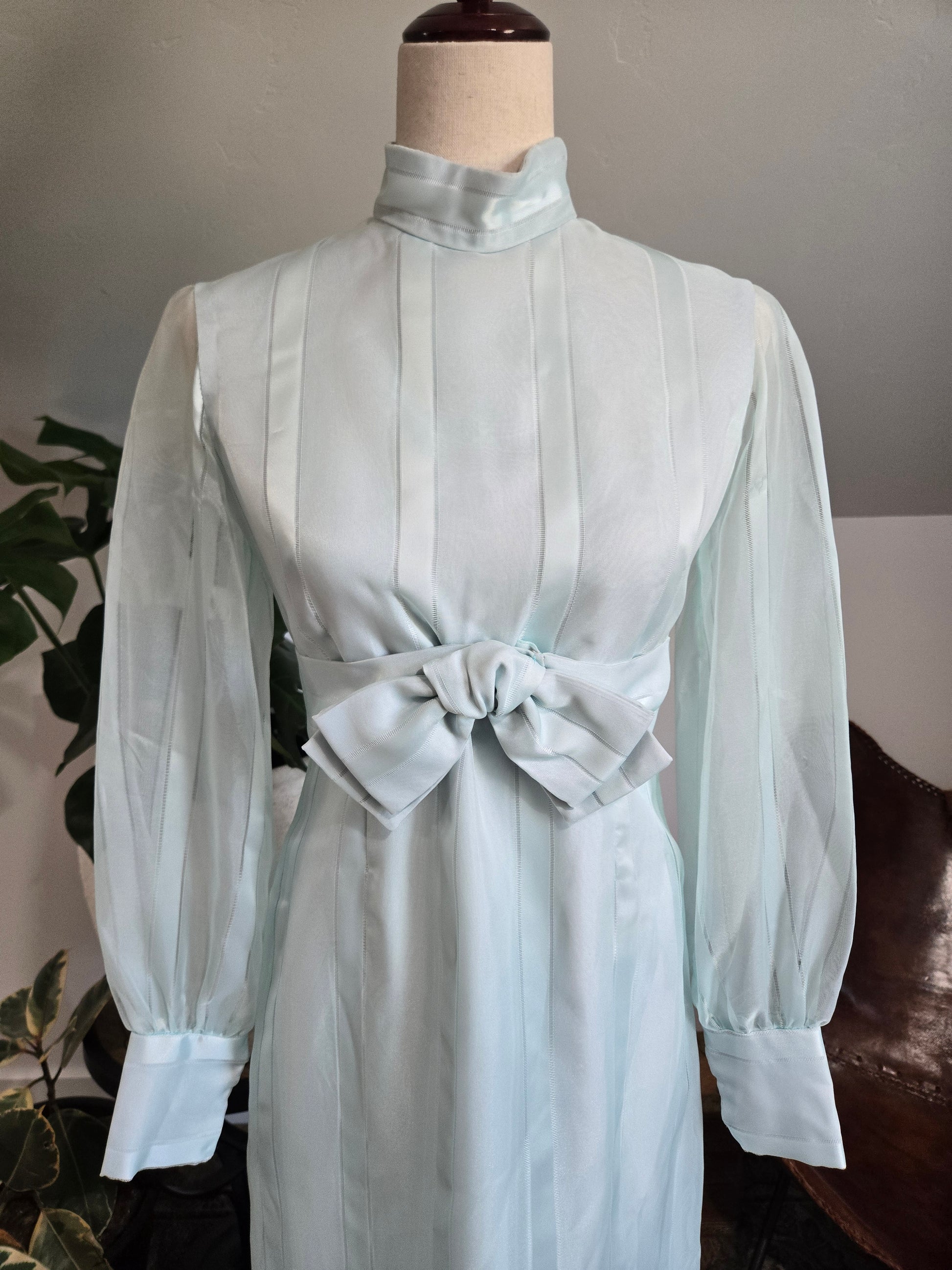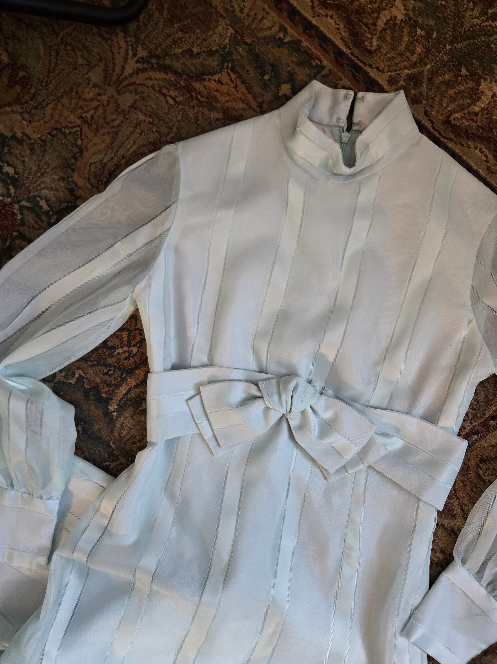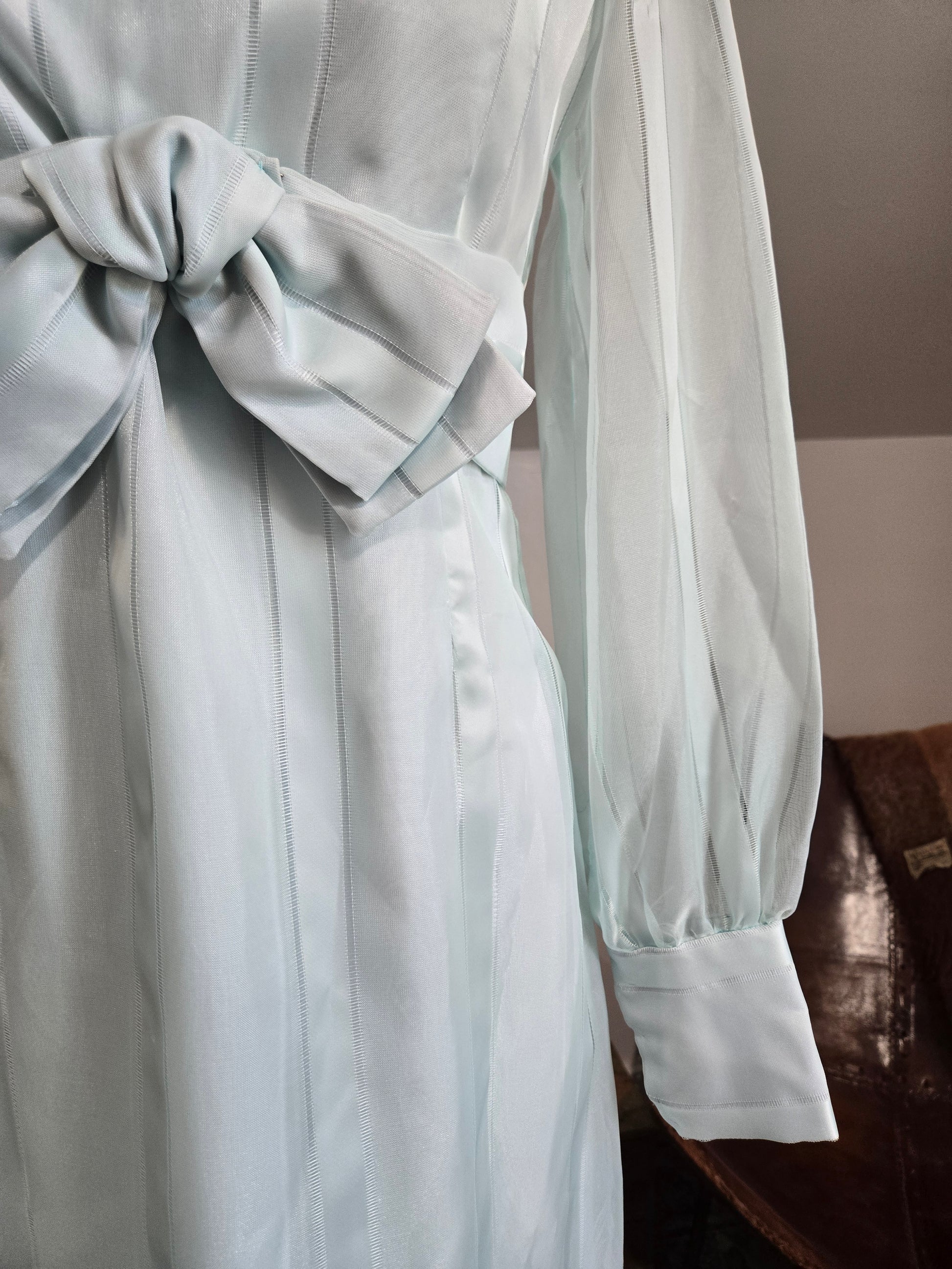 1960s hand tailored blue formal dress with a striped shear chiffon fabric that is lined throughout the whole body and skirt. It is unlined in the sleeve, so the sleeve remains shear. It has small snaps at the cuffs and the back has a zipper and hook closures. The bow waist belt is attached, and it wraps around the back and then hooks and snaps at the front for a seamless belt line in the back. It is in perfect condition and has been freshly dry cleaned by me.