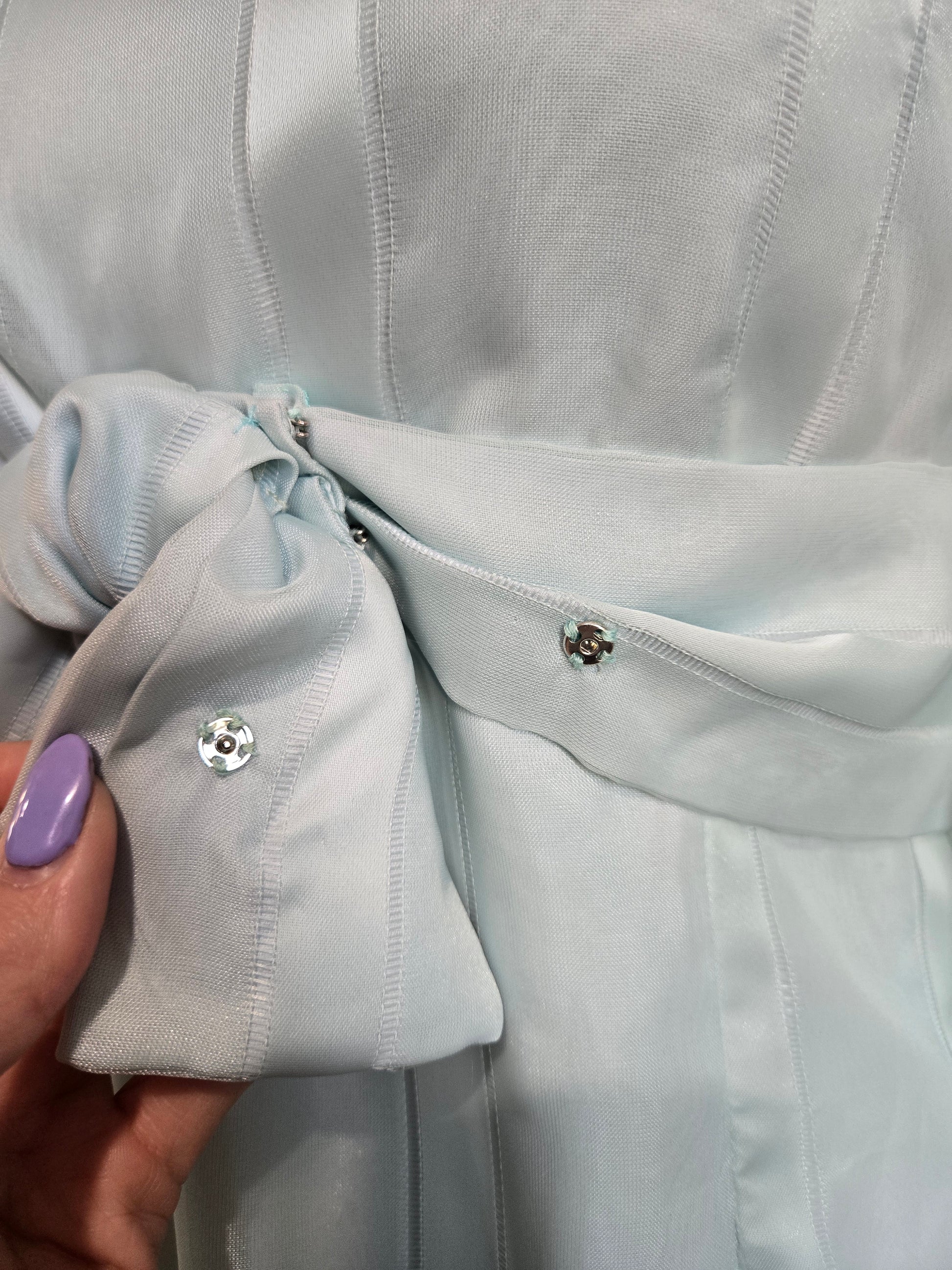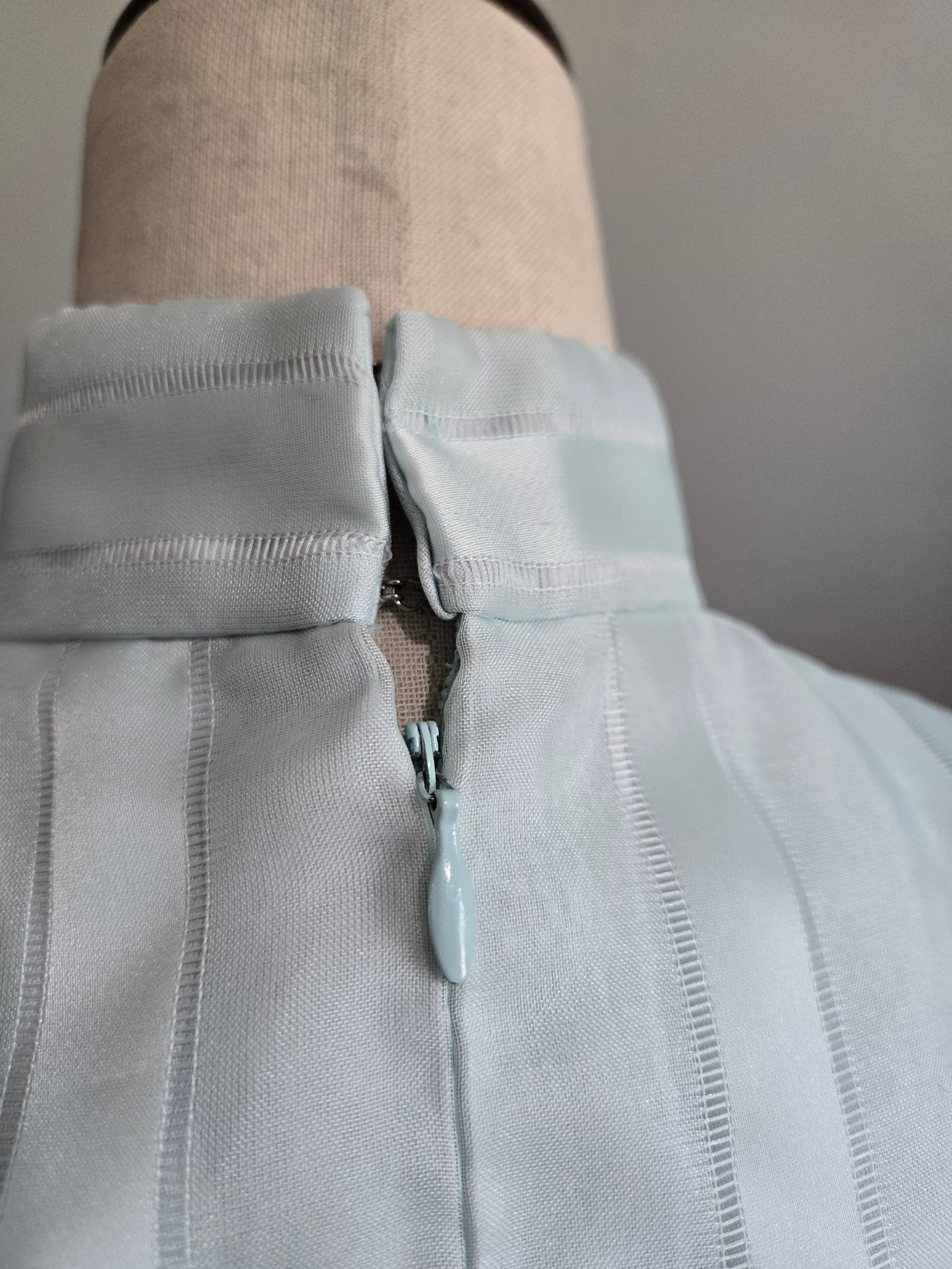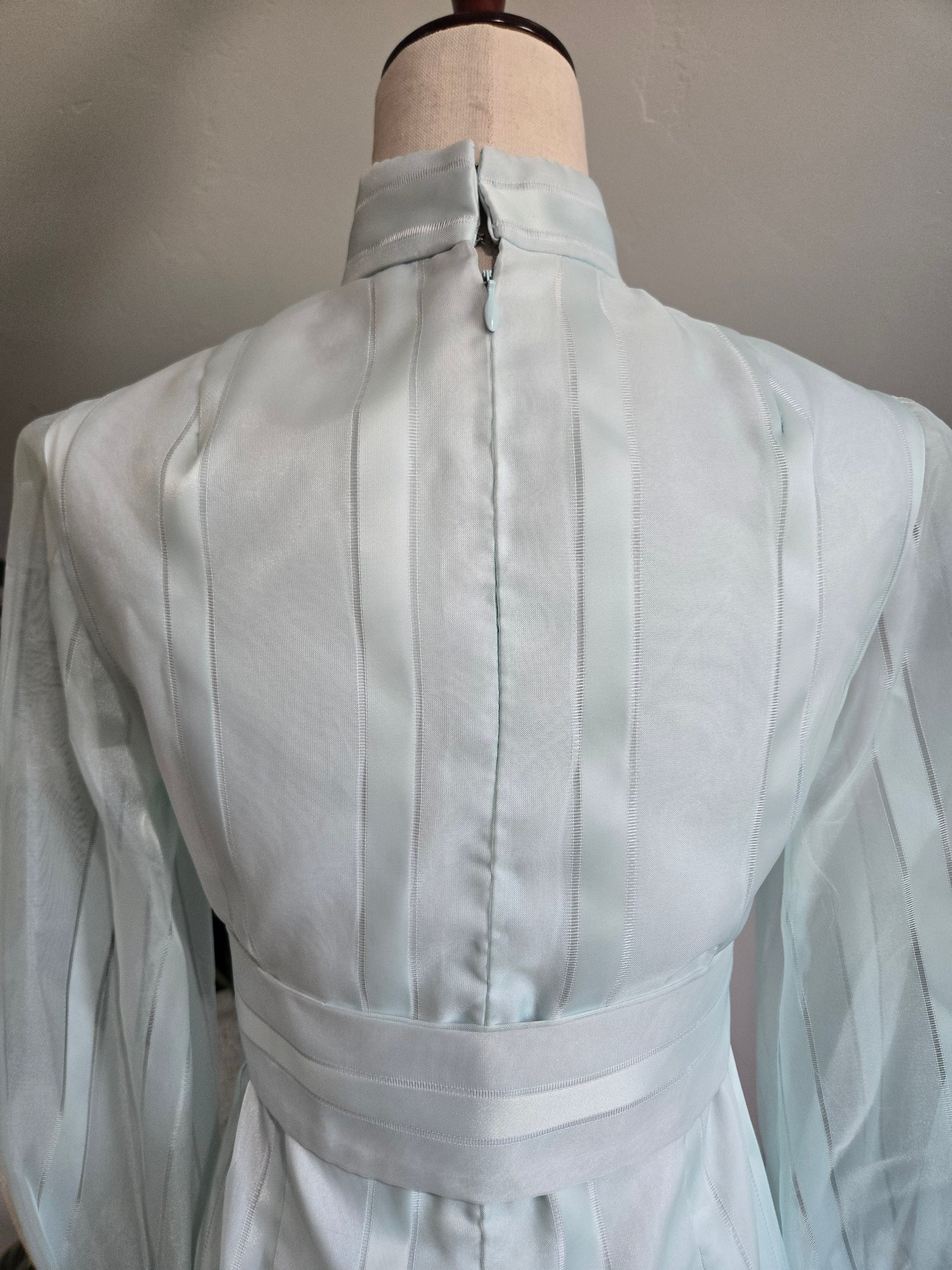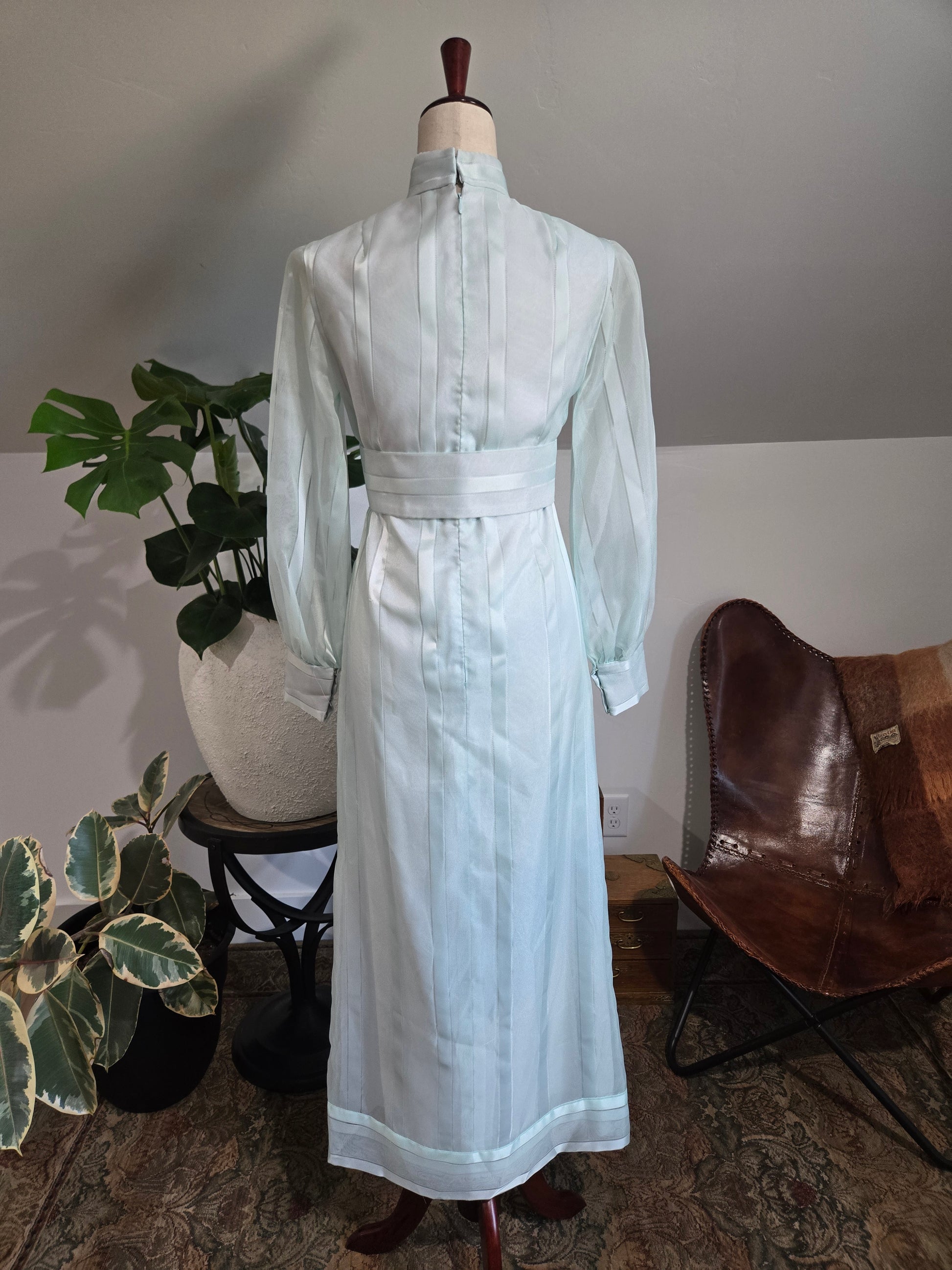 1960s hand tailored blue formal dress with a striped shear chiffon fabric that is lined throughout the whole body and skirt. It is unlined in the sleeve, so the sleeve remains shear. It has small snaps at the cuffs and the back has a zipper and hook closures. The bow waist belt is attached, and it wraps around the back and then hooks and snaps at the front for a seamless belt line in the back. It is in perfect condition and has been freshly dry cleaned by me.