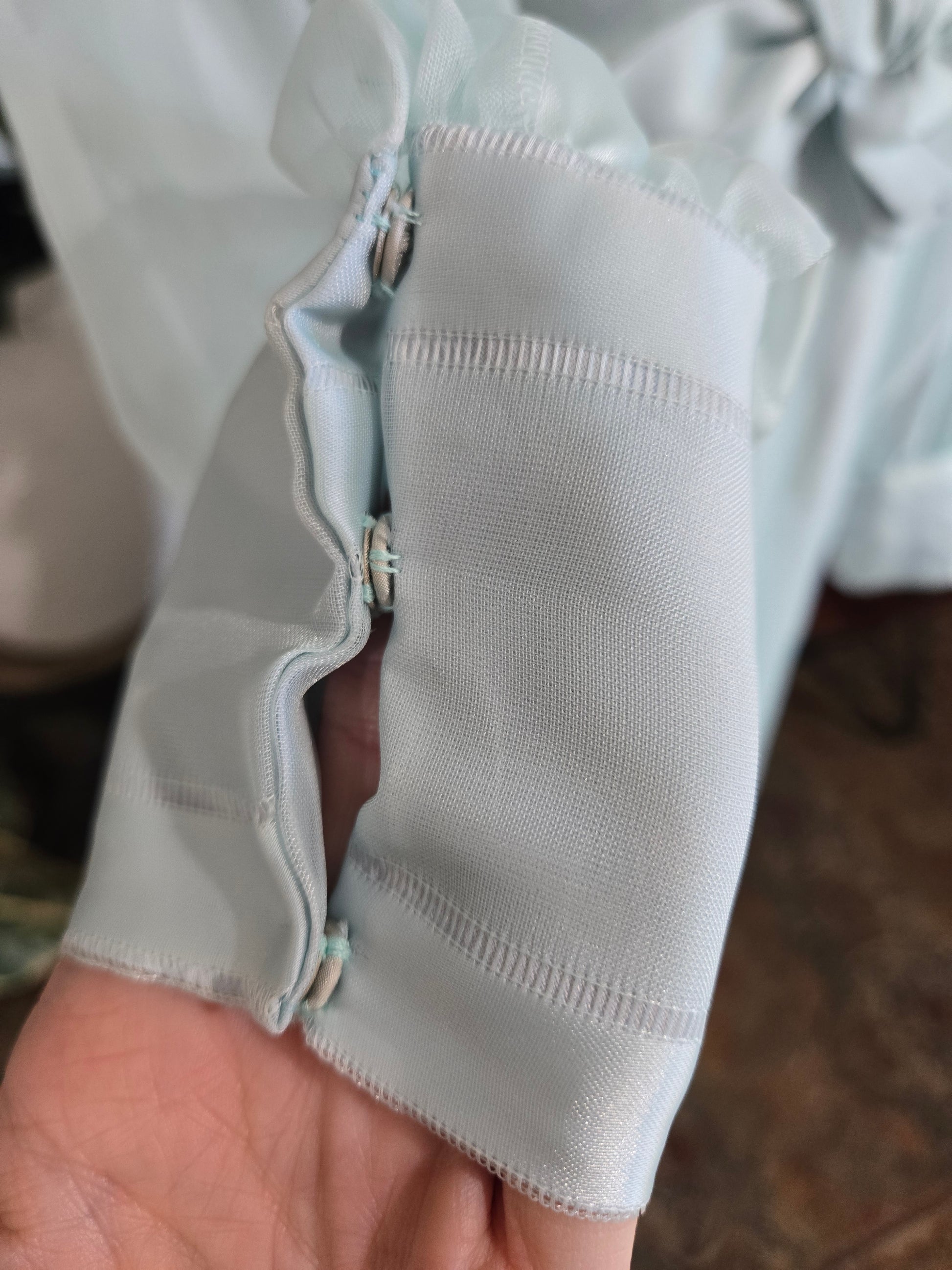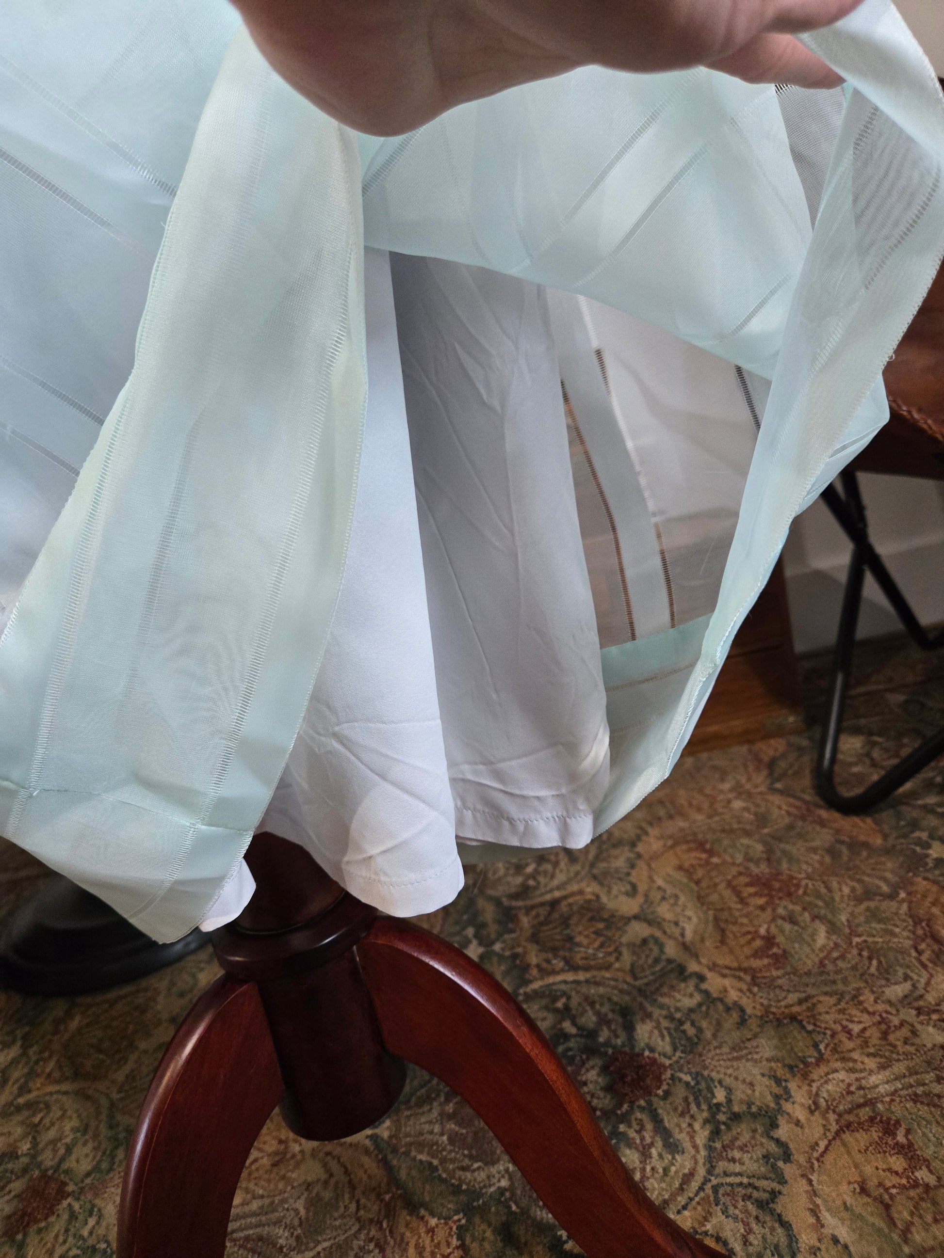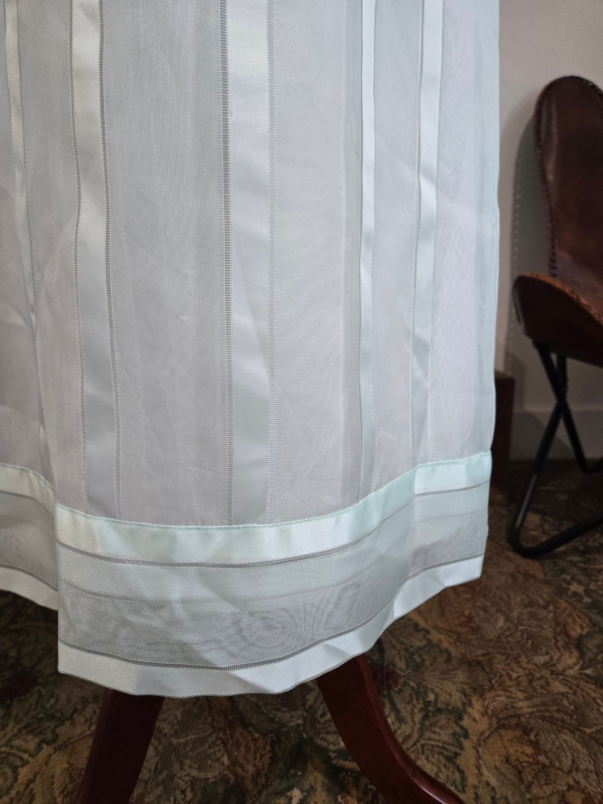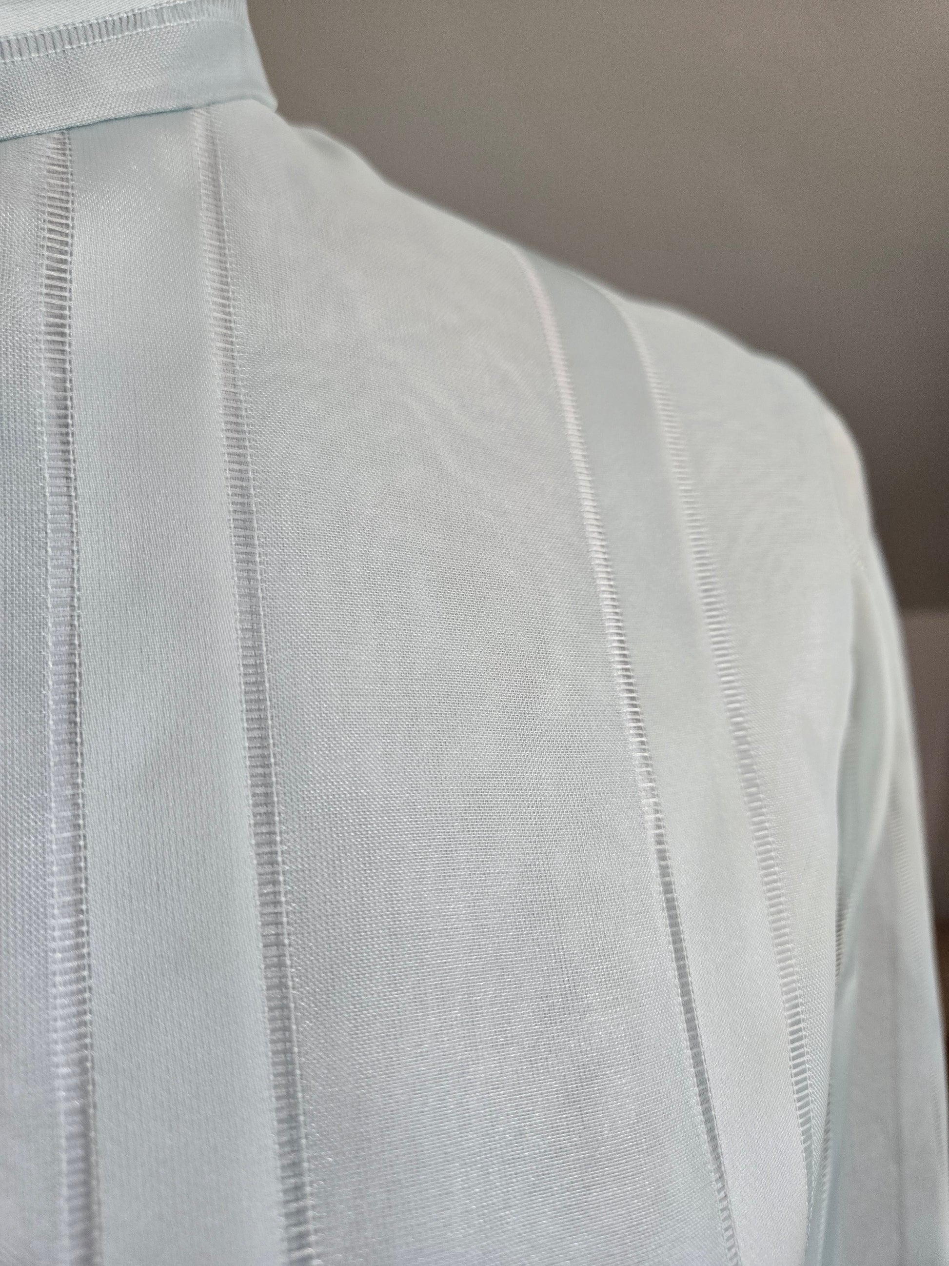 1960s hand tailored blue formal dress with a striped shear chiffon fabric that is lined throughout the whole body and skirt. It is unlined in the sleeve, so the sleeve remains shear. It has small snaps at the cuffs and the back has a zipper and hook closures. The bow waist belt is attached, and it wraps around the back and then hooks and snaps at the front for a seamless belt line in the back. It is in perfect condition and has been freshly dry cleaned by me.