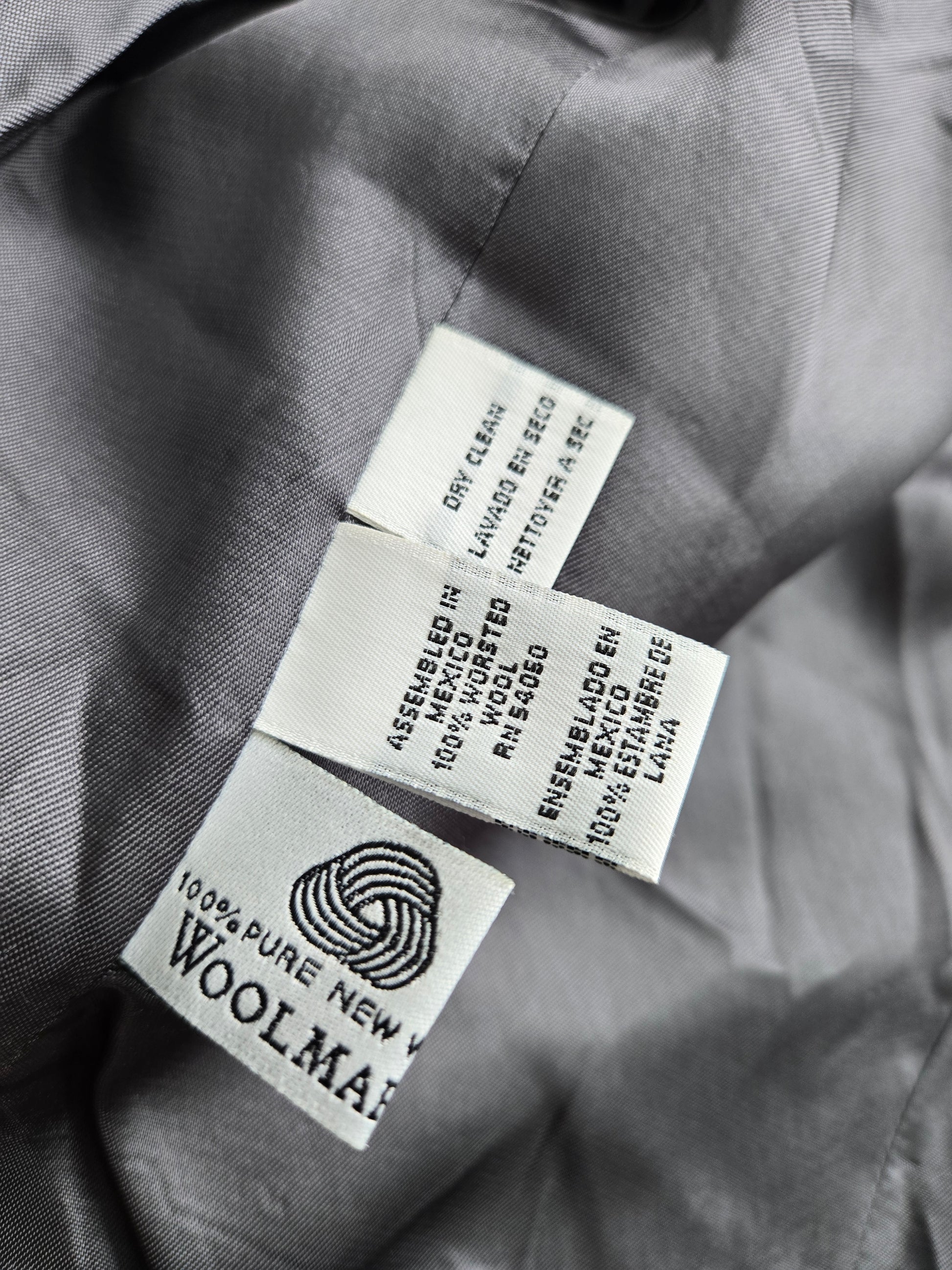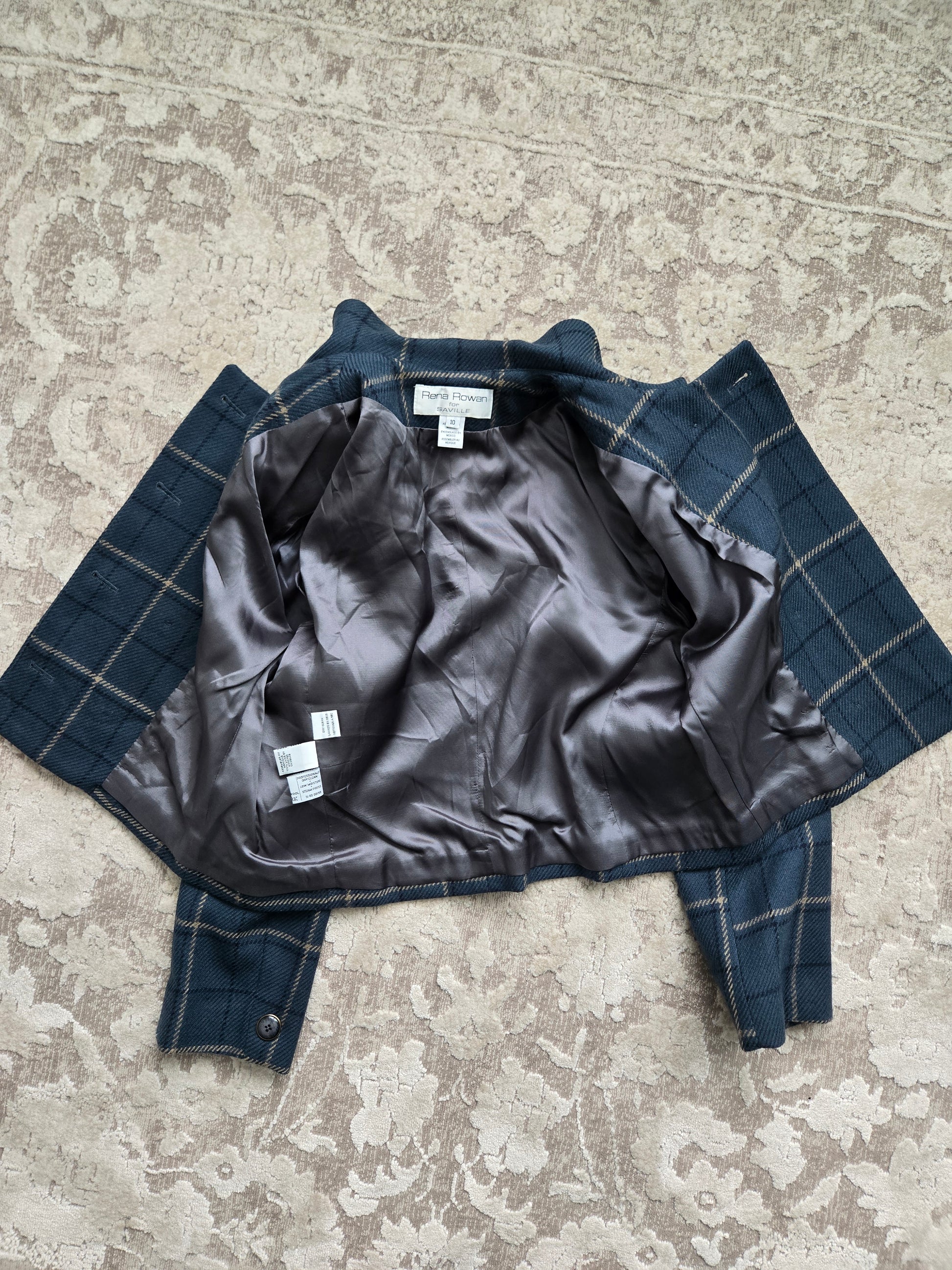 Vintage Rena Rowan for Saville worsted wool plaid cropped blazer. It is a dusty blue base with an ivory and navy plaid and double breasted buttons. An absolutely stunning colorway and in perfect condition! Made in Mexico.