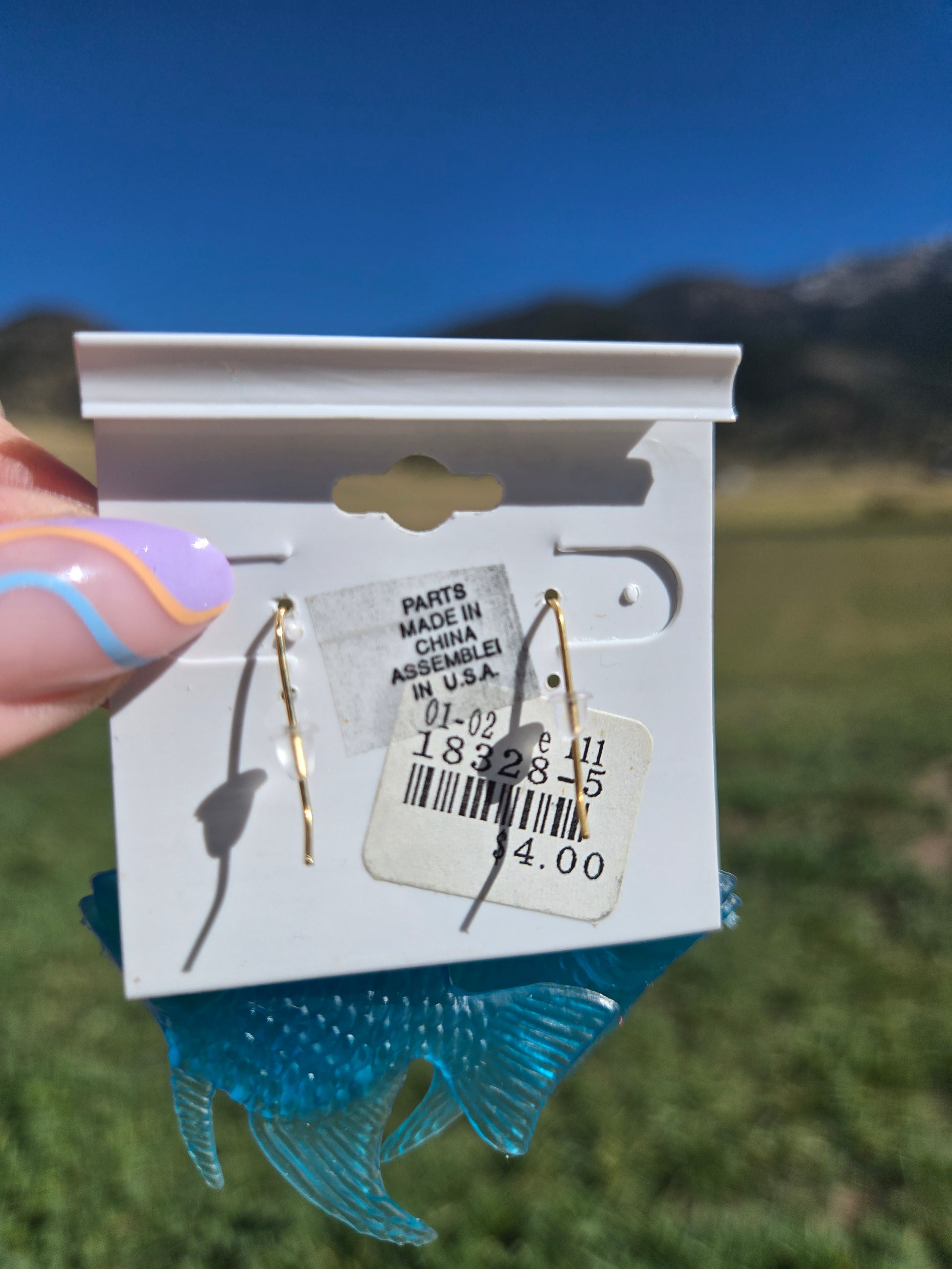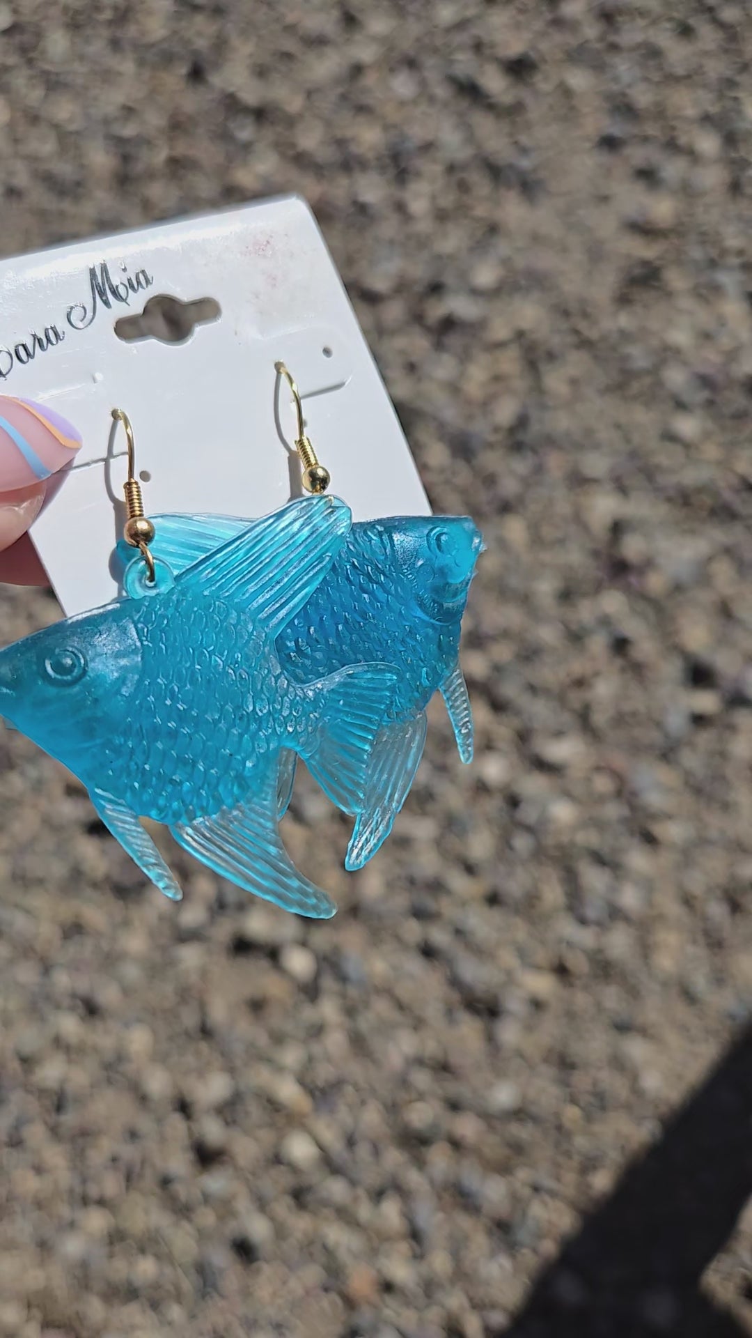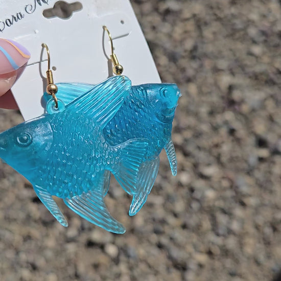 Vintage deadstock small blue tropical fish J hook pierced earrings. They are made of a translucent rubber material, and are pretty lightweight. I have put fresh rubber backs on them. Made in USA.