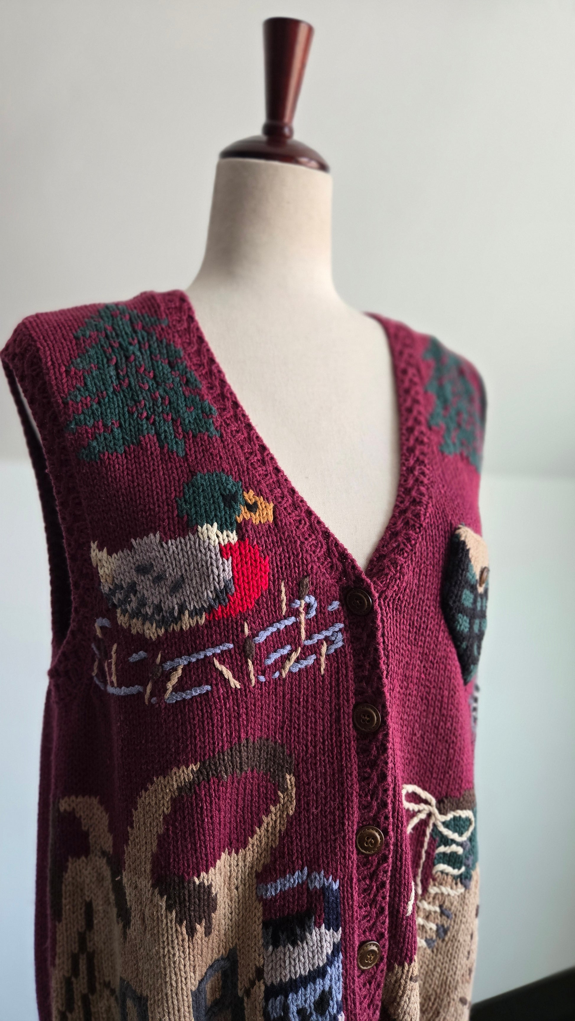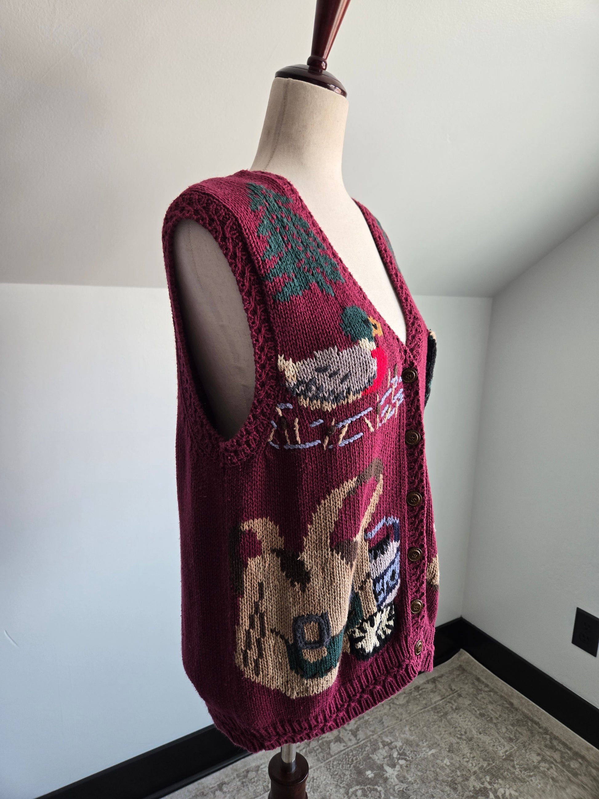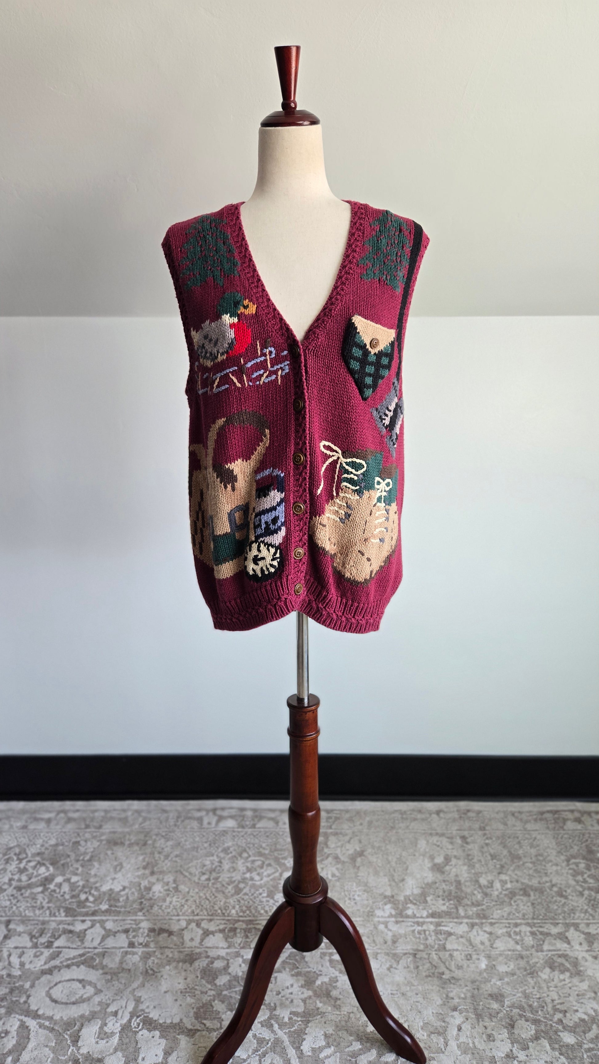 Vintage Cabela's hand knit cotton/ramie blend outdoor themed vest. It buttons down the middle and features some fun motifs such as a swimming duck, pine trees, binoculars, fishing bag, and hiking shoes. It is in great condition with very minor signs of wear.