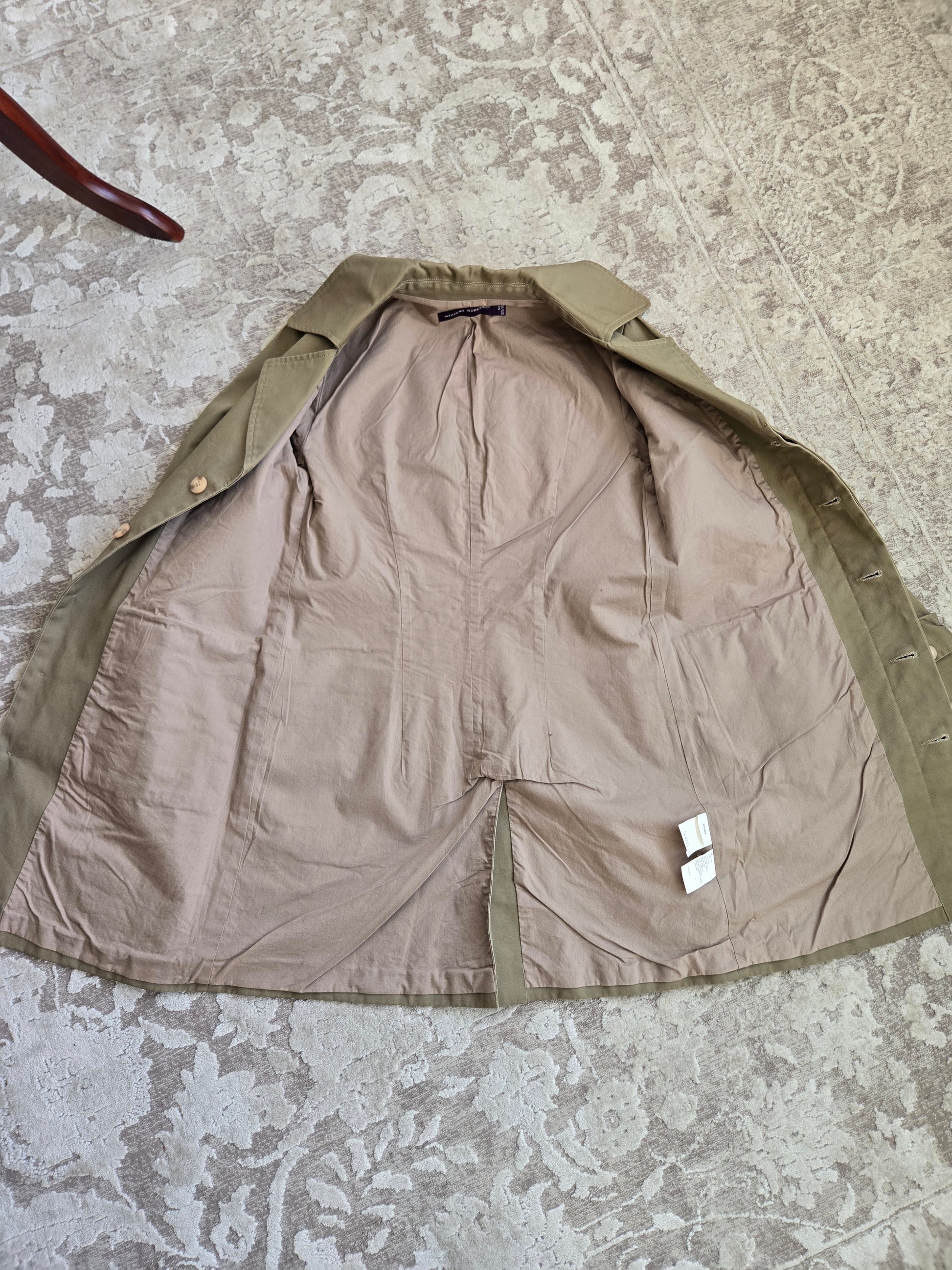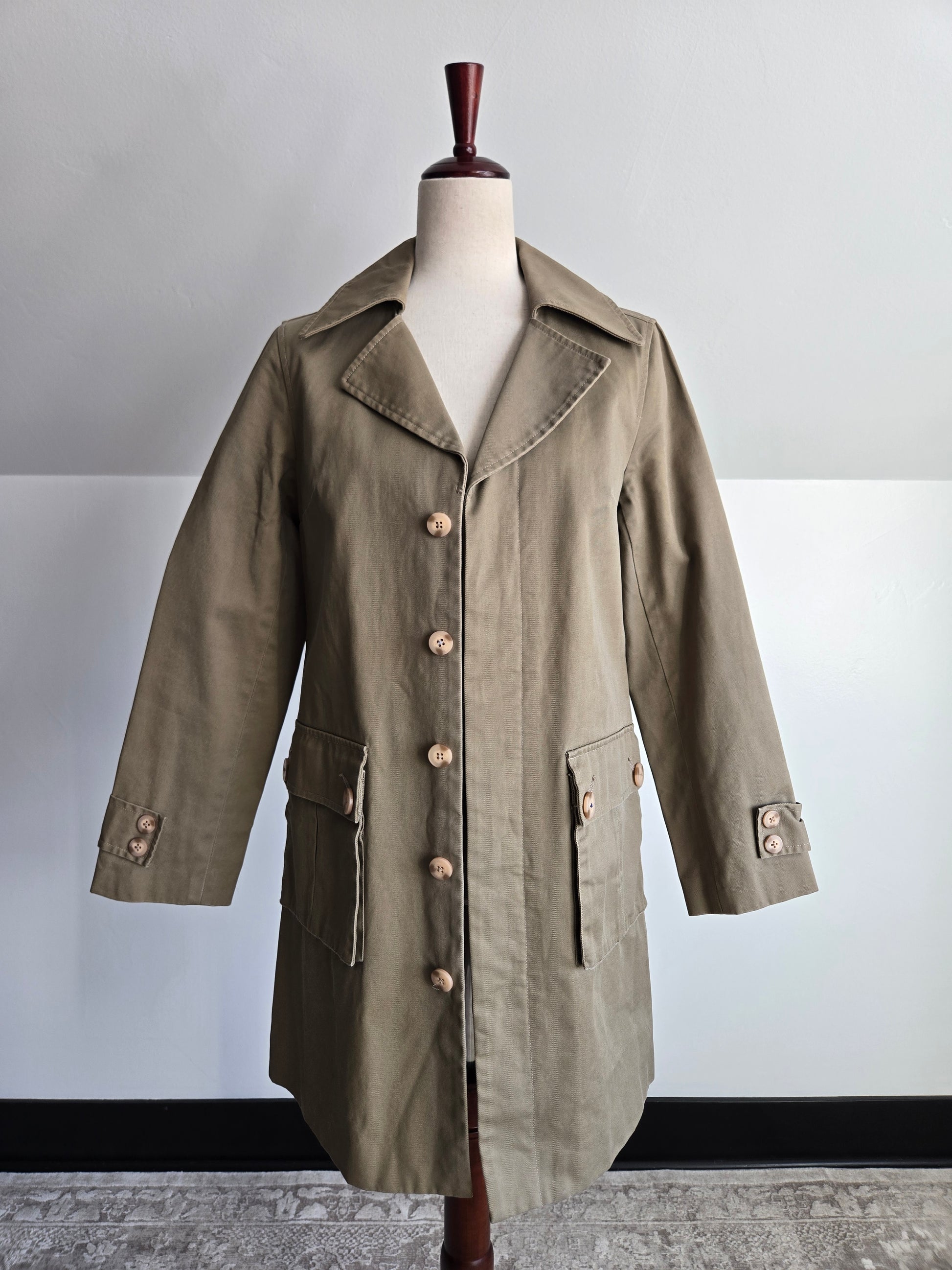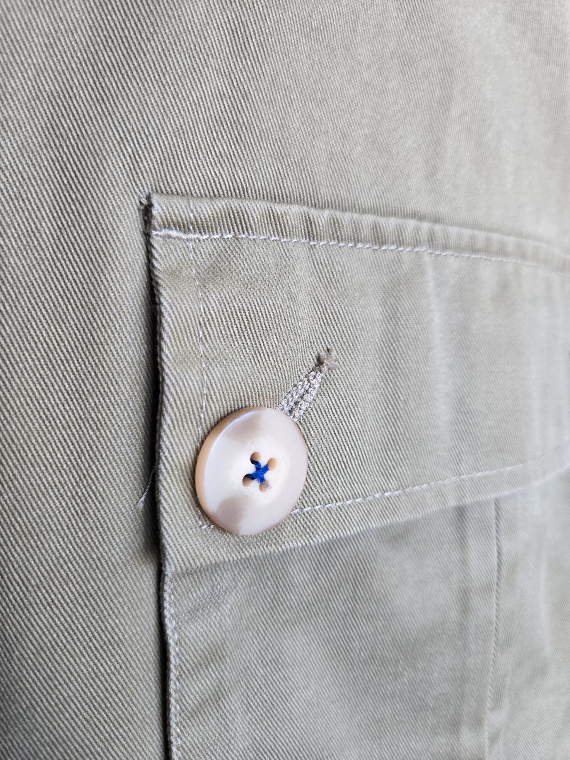 Weekend Workshop 100% cotton barn jacket sourced in Hong Kong. It is a gorgeous structured cotton with trench style cuffs and two safari style cargo pockets. There are hidden buttons down center front and I love the little hit of blue pop stitching on one of the buttons at the pocket. It is tailored beautifully with darts and a kick split in the back. It is in perfect condition.
