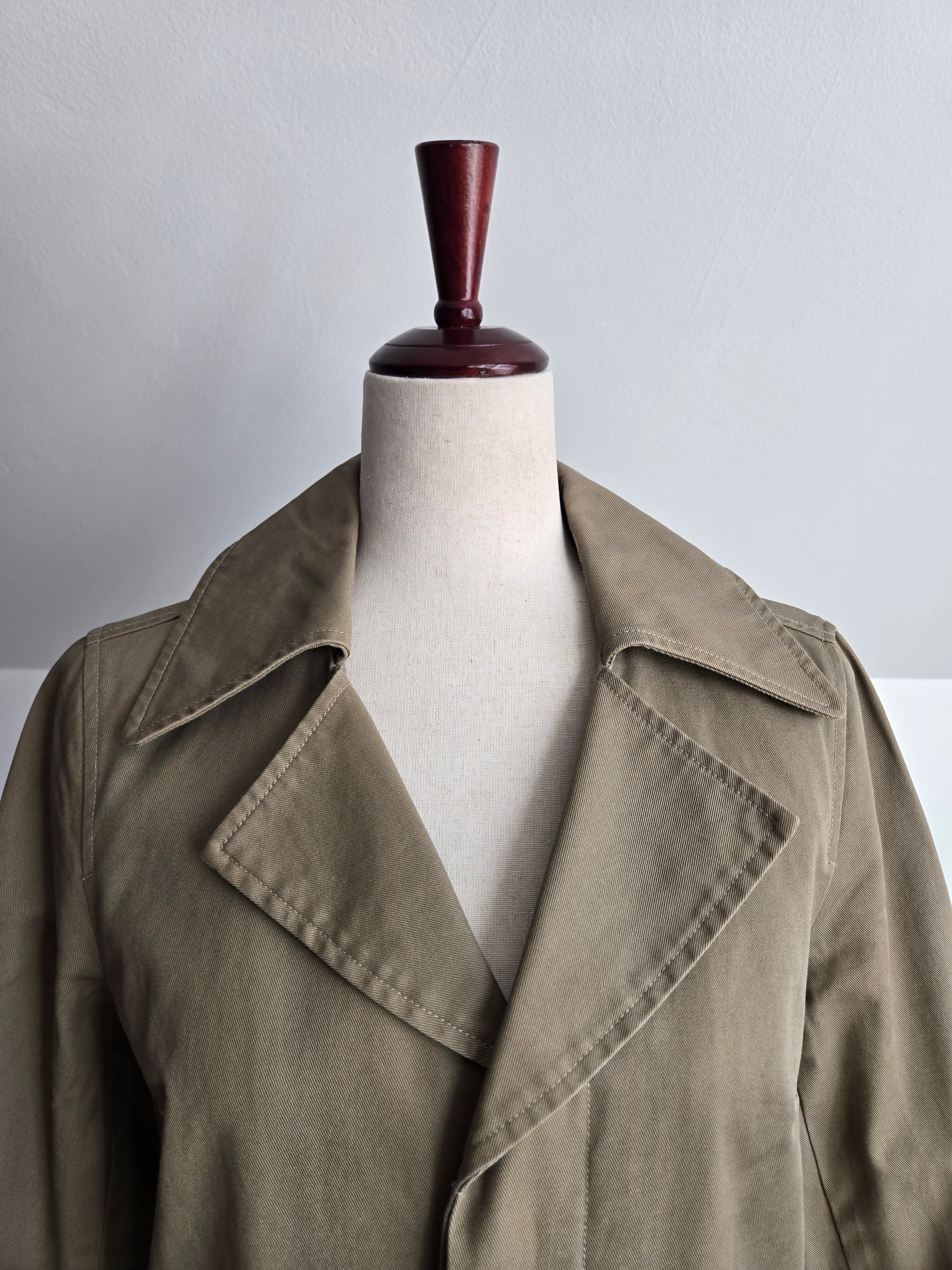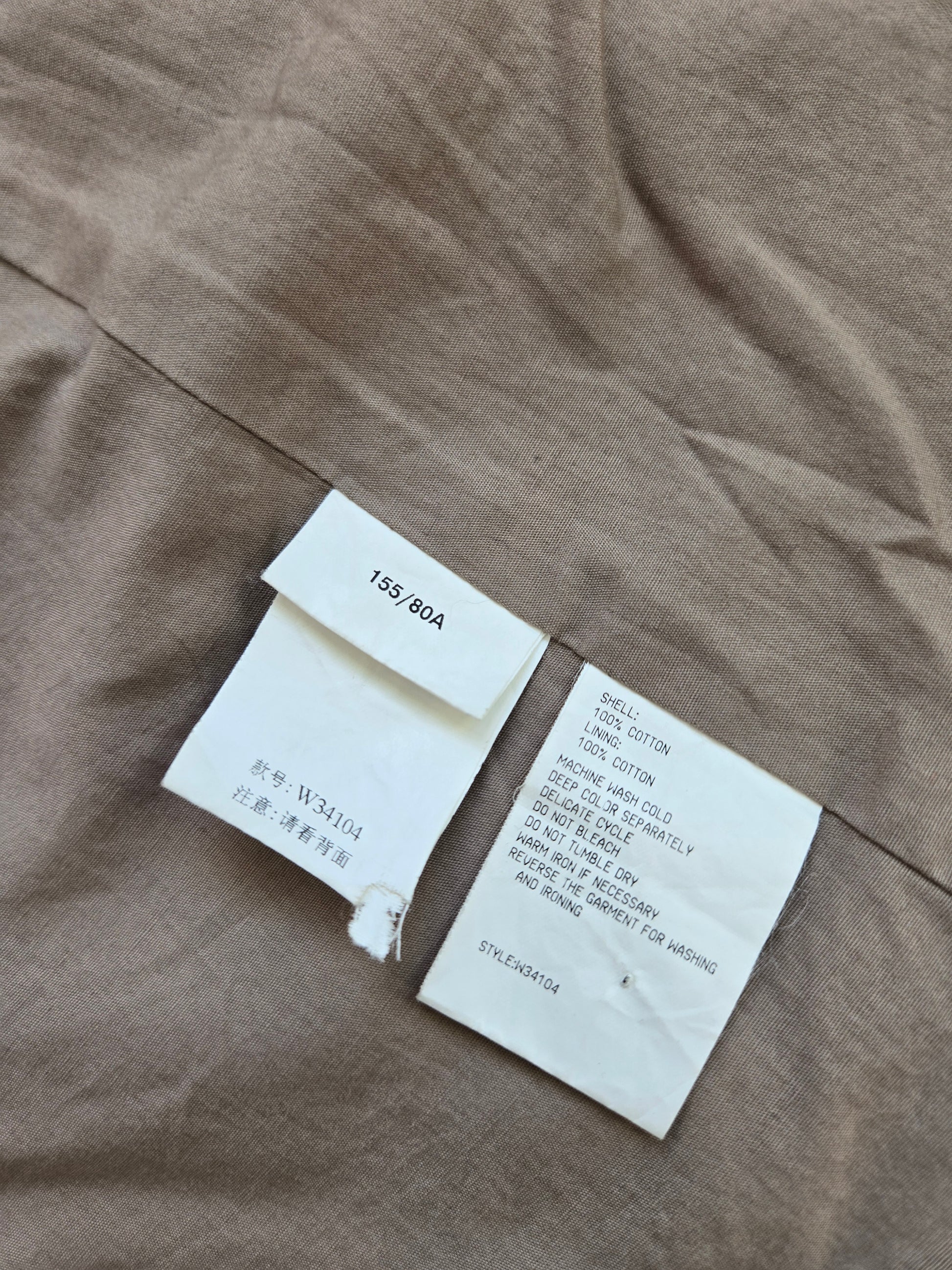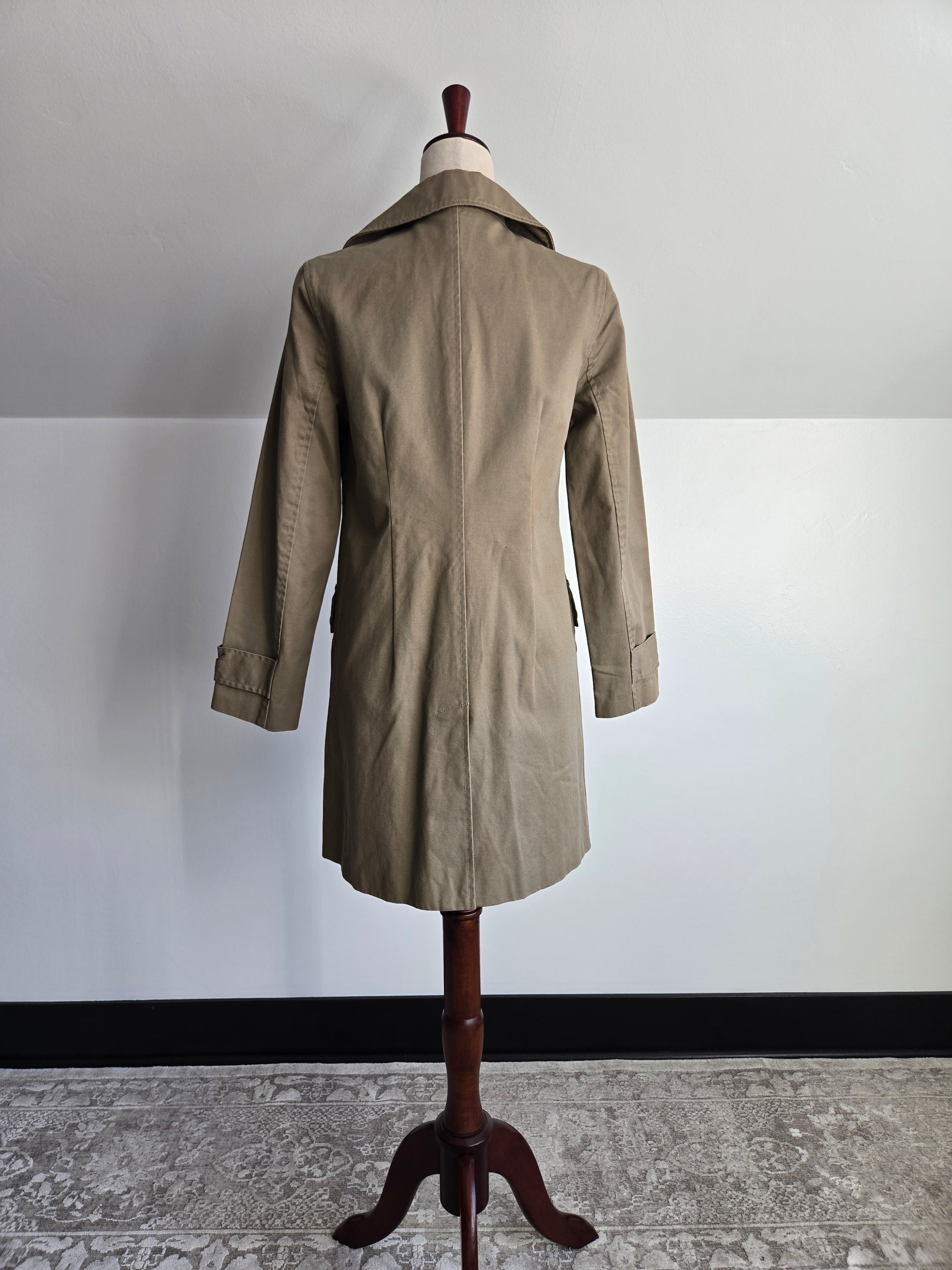 Weekend Workshop 100% cotton barn jacket sourced in Hong Kong. It is a gorgeous structured cotton with trench style cuffs and two safari style cargo pockets. There are hidden buttons down center front and I love the little hit of blue pop stitching on one of the buttons at the pocket. It is tailored beautifully with darts and a kick split in the back. It is in perfect condition.