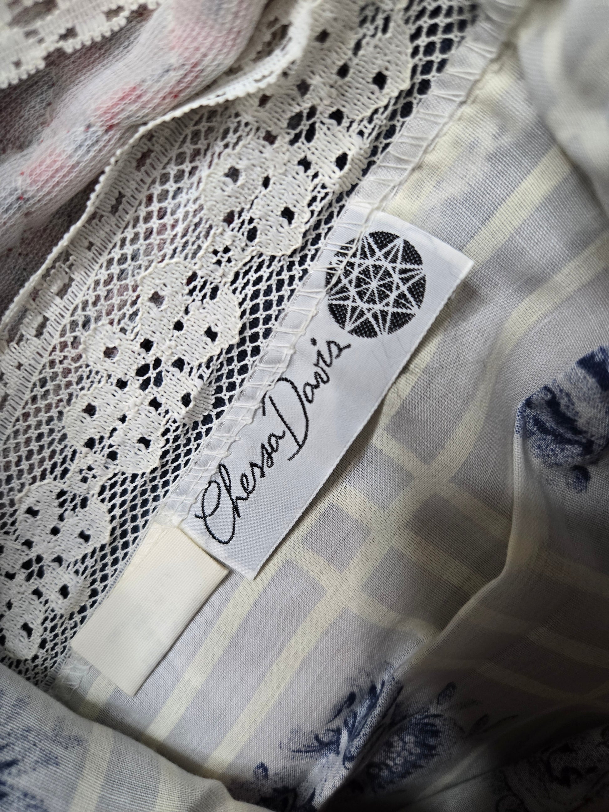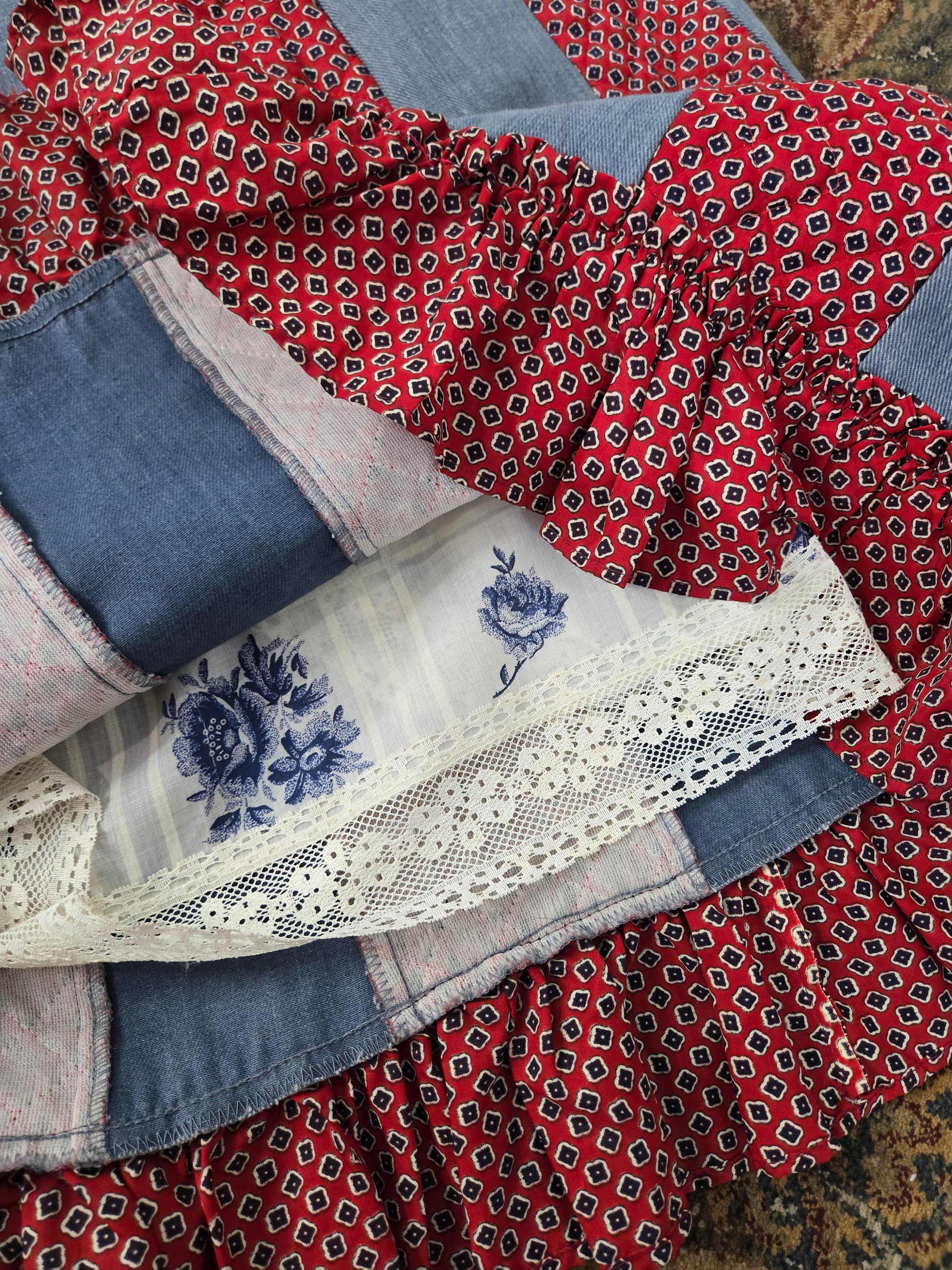 Vintage Chessa Davis patchwork panel skirt of denim and red cotton with a ruffle at the bottom. It has elastic in the waistband and is fully lined with a floral cotton liner trimmed in lace. The elastic is healthy, there just isn't a LOT of stretch. It is in amazing condition and the fabrics are all 100% cotton!