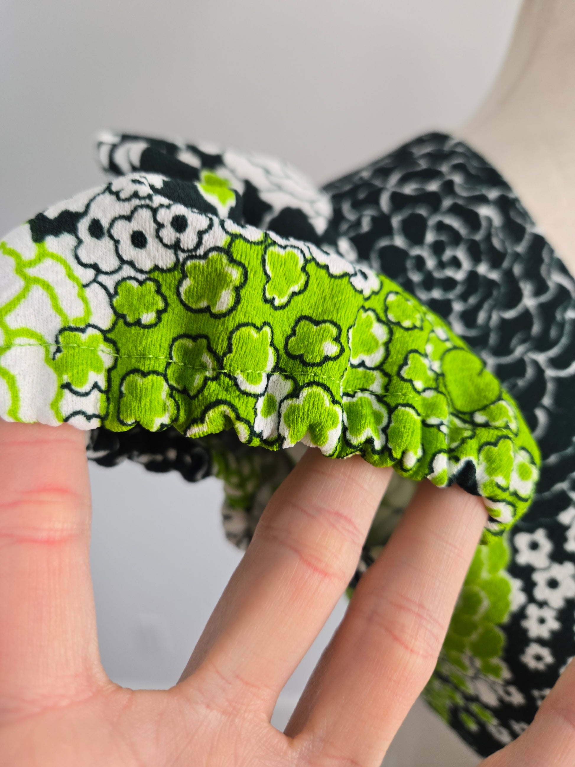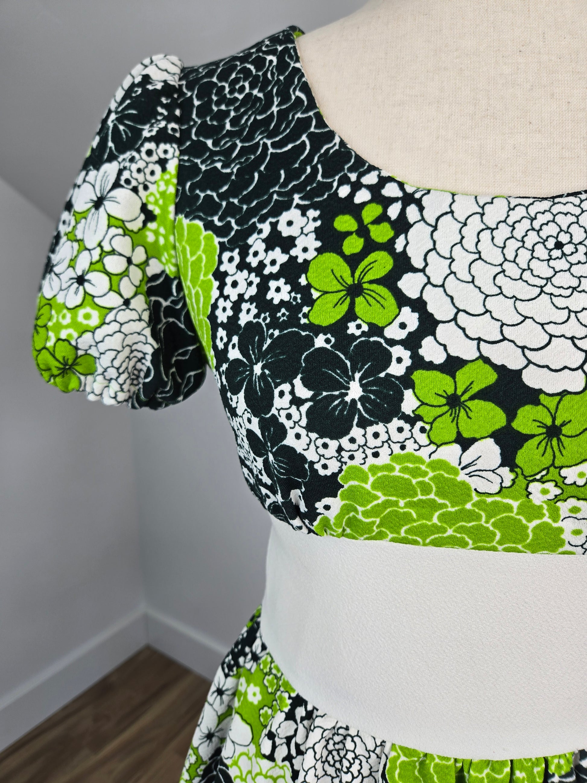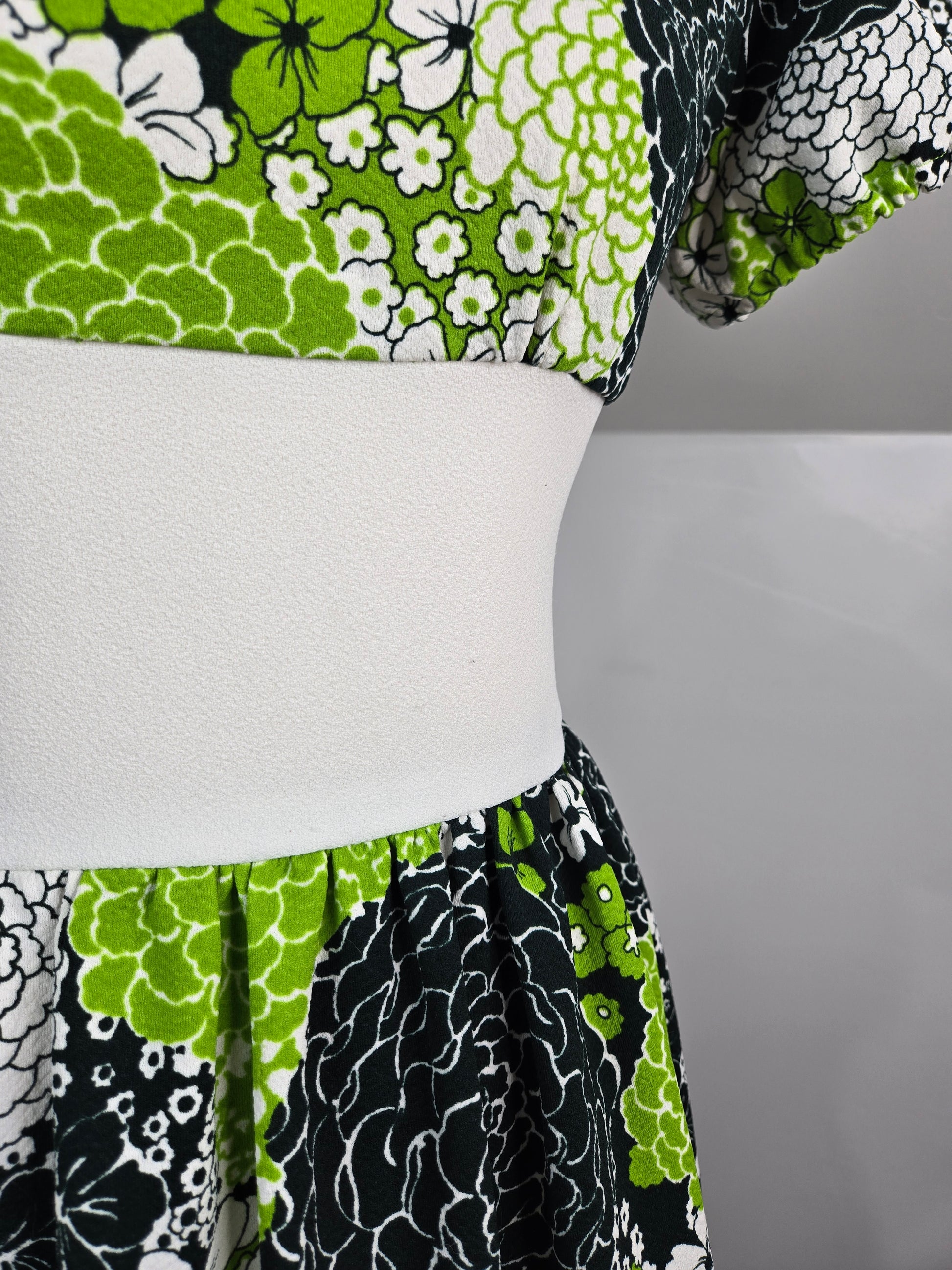 Vintage 1960s barkcloth mini dress in a dayglo green flower power print with a large white torso band. It has a short puff sleeve that gathers at the edge, but does not stretch and is not meant to. It features a Talon center back zipper closure and is in perfect condition! The most fun summer dress!!