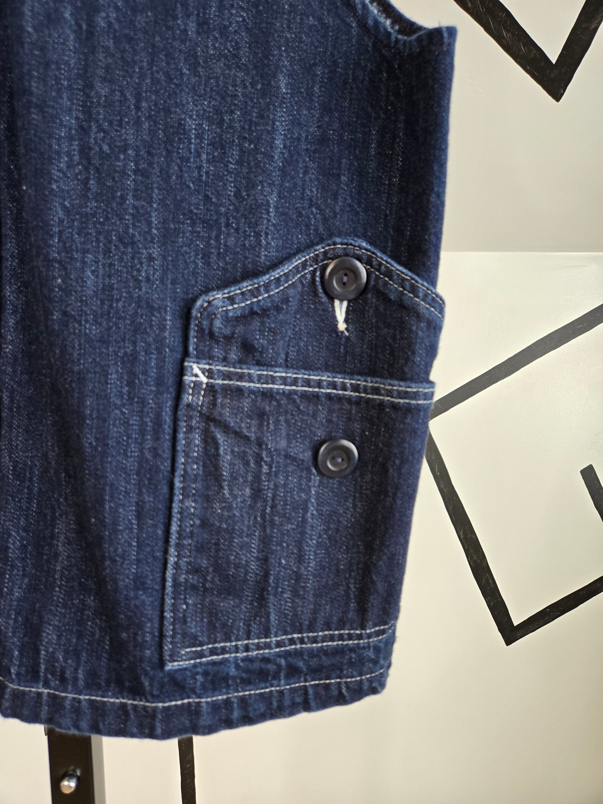 Dehen vintage dark denim vest with white contrast stitching for a very cool carpenter style look. It has the embroidery of a factory worker on the right chest, so this vest belonged to Huong and their job was on the sewing line! I'm in love with the styling and the history on this one. It is a thick, yet soft, gorgeous quality denim material. Made in Portland, Oregon and in perfect condition. Dehen is an expensive brand, so if you are unfamiliar, I encourage you to look it up. Their vest run around $350 retail and it is rare to find this one with the embroidered name!