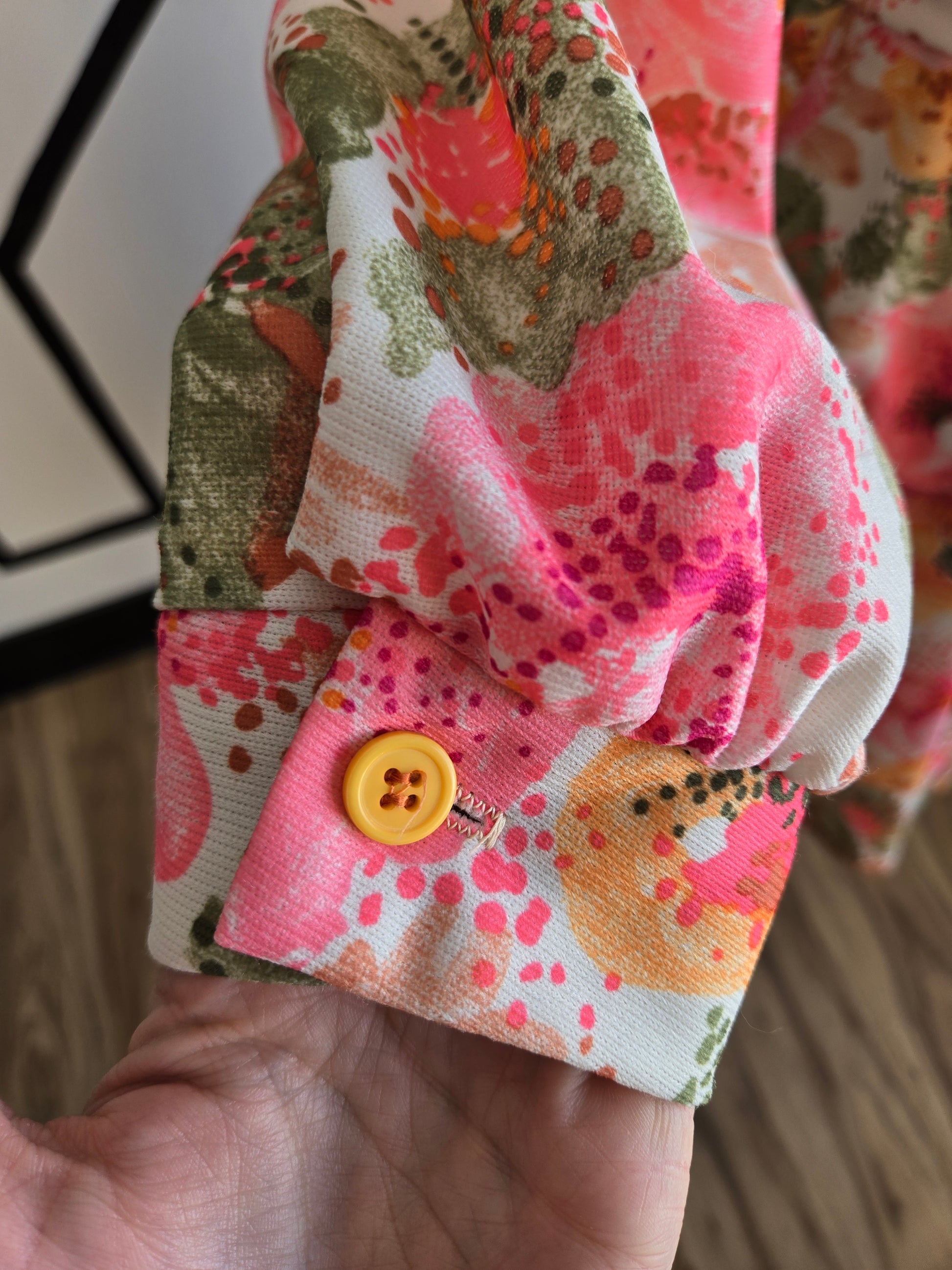 Vintage Dyanne Dallas 70s wrap front long sleeve dress in a gorgeous bright floral with a matching tie belt. I love the big dramatic collar and lapel that wraps around the back shoulders as well. This dress has snap closures to hold the front closed and a small zipper in center front down from the waist. It also comes with its matching tie belt that would be so pretty used in your hair as well! This dress is in perfect condition!
