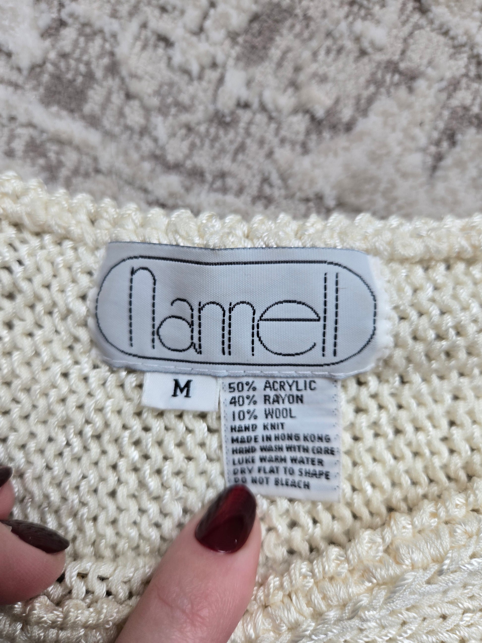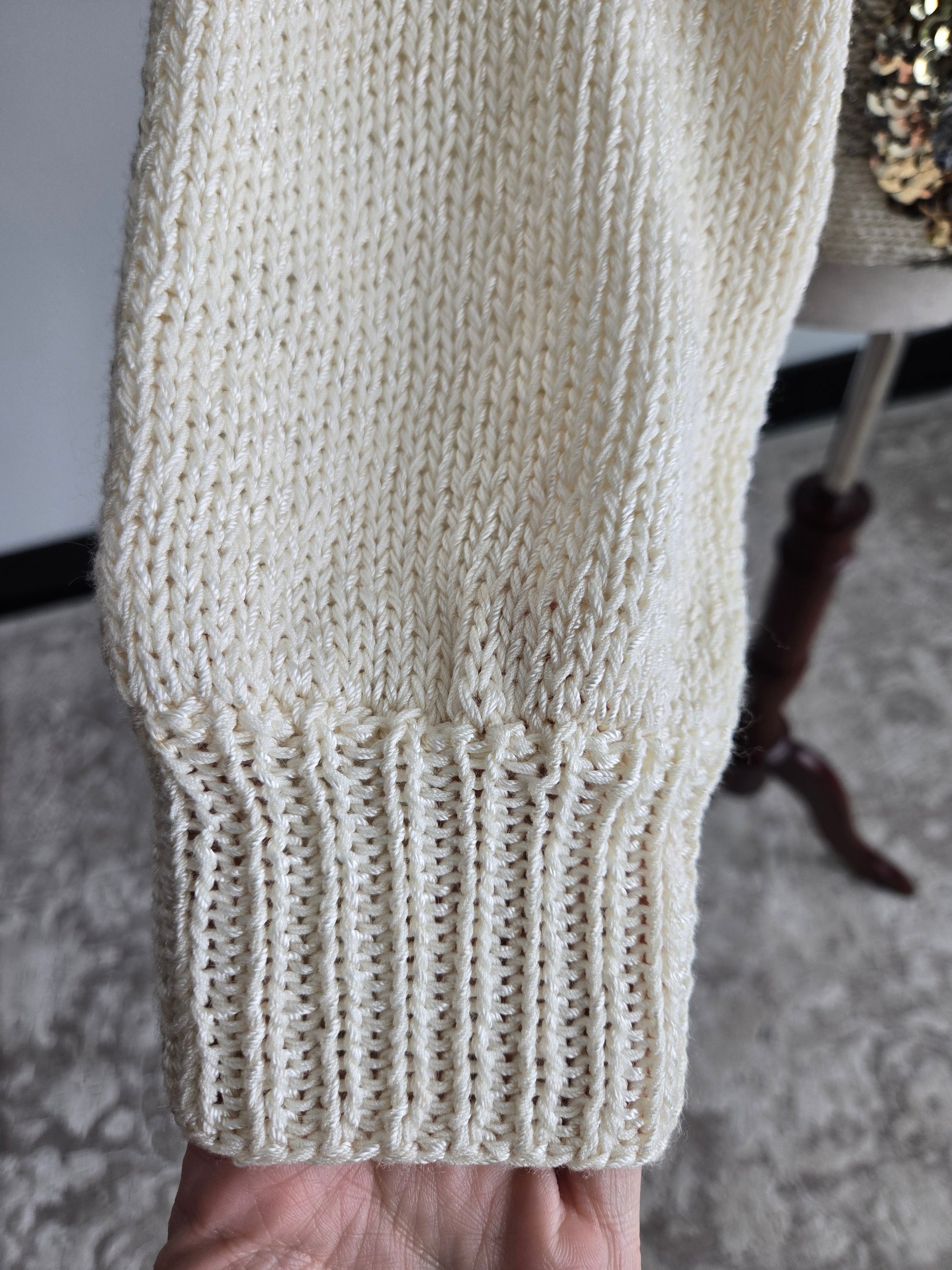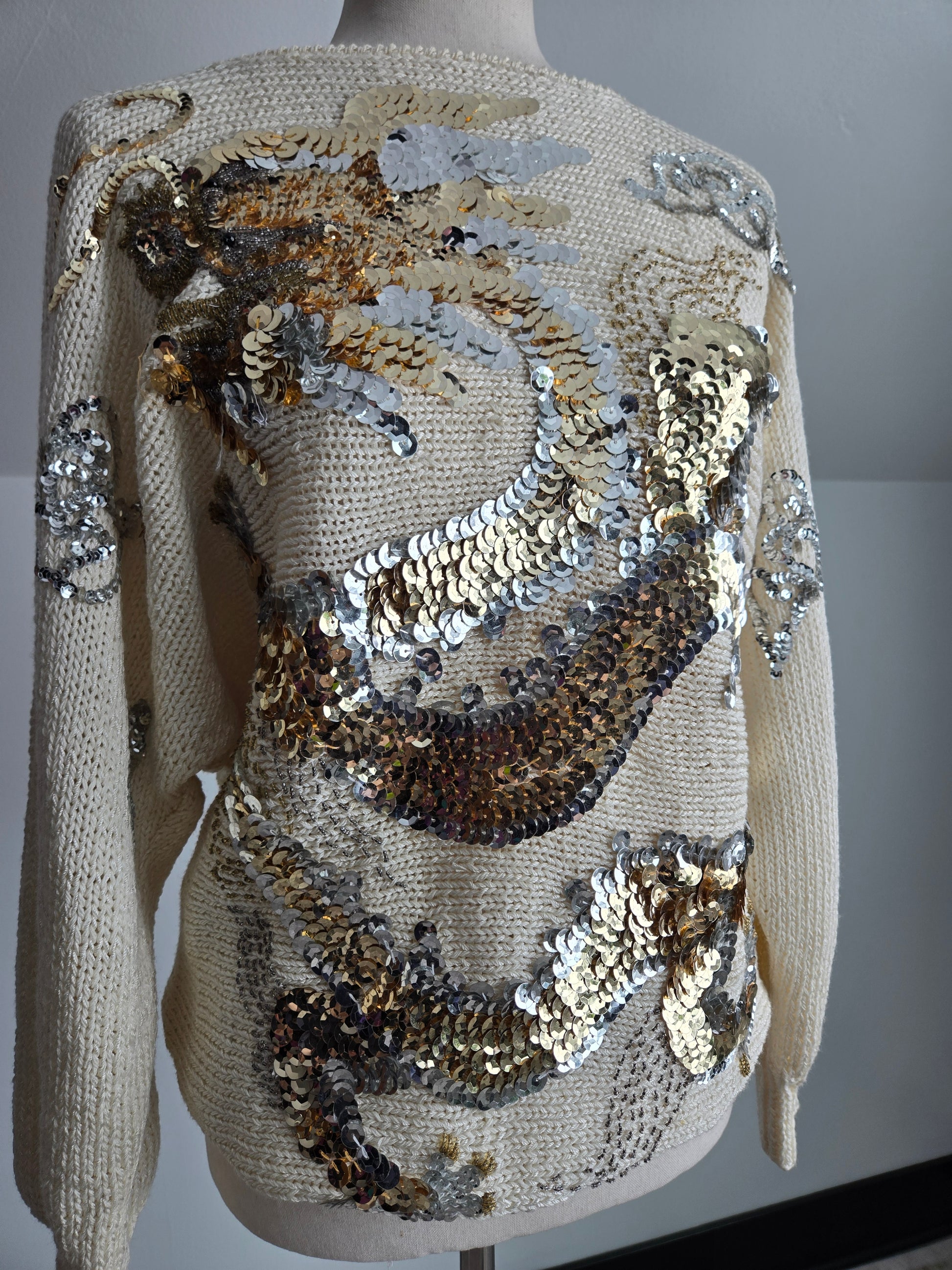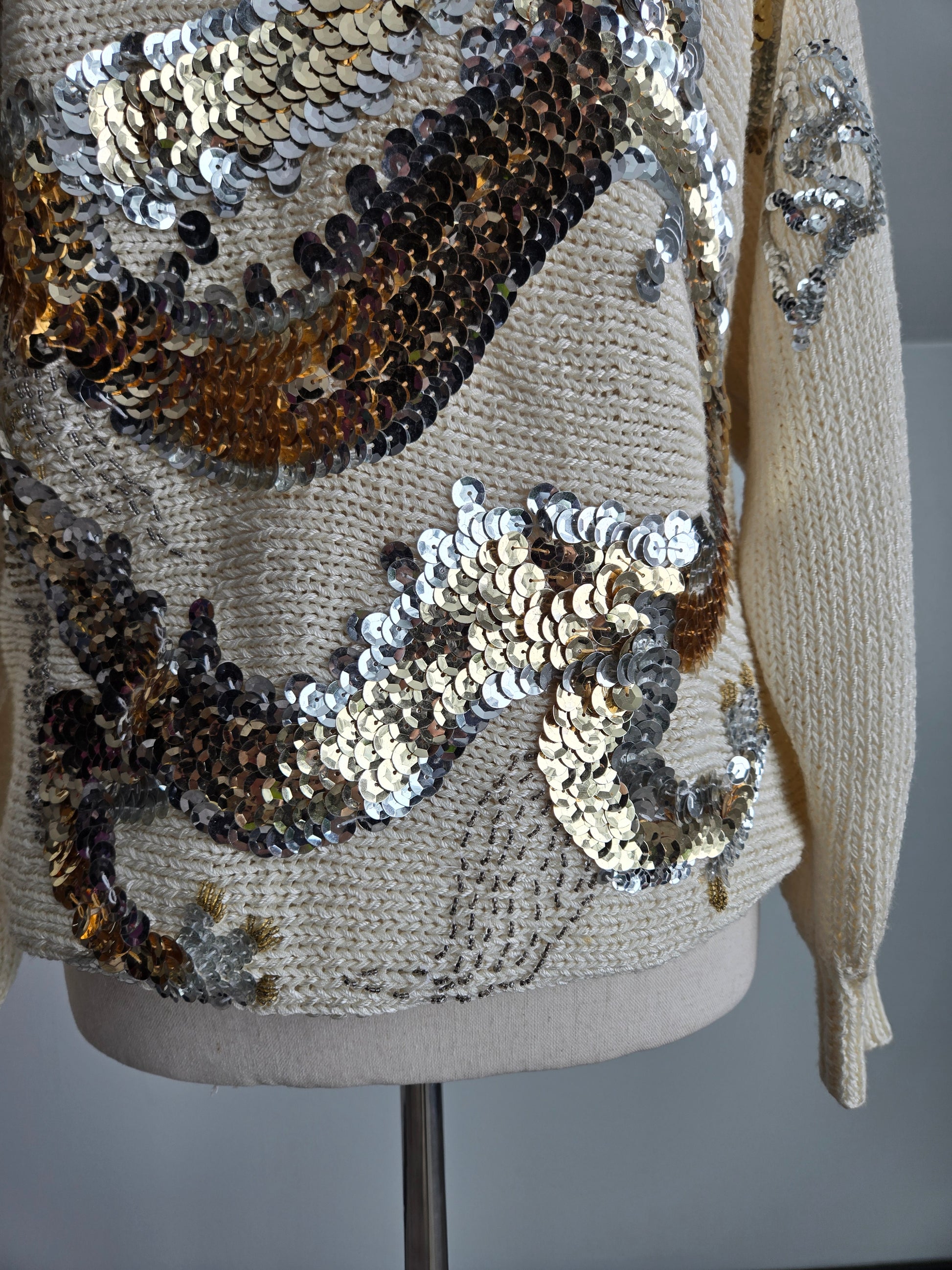 Vintage 80s Nannell knit sweater with a large sequin dragon on the front. The sequins are both gold and silver and the sequin details go to the back as well. 80s dolmain sleeve style. Nice heavy knit and in great condition. No major sections of sequins missing.