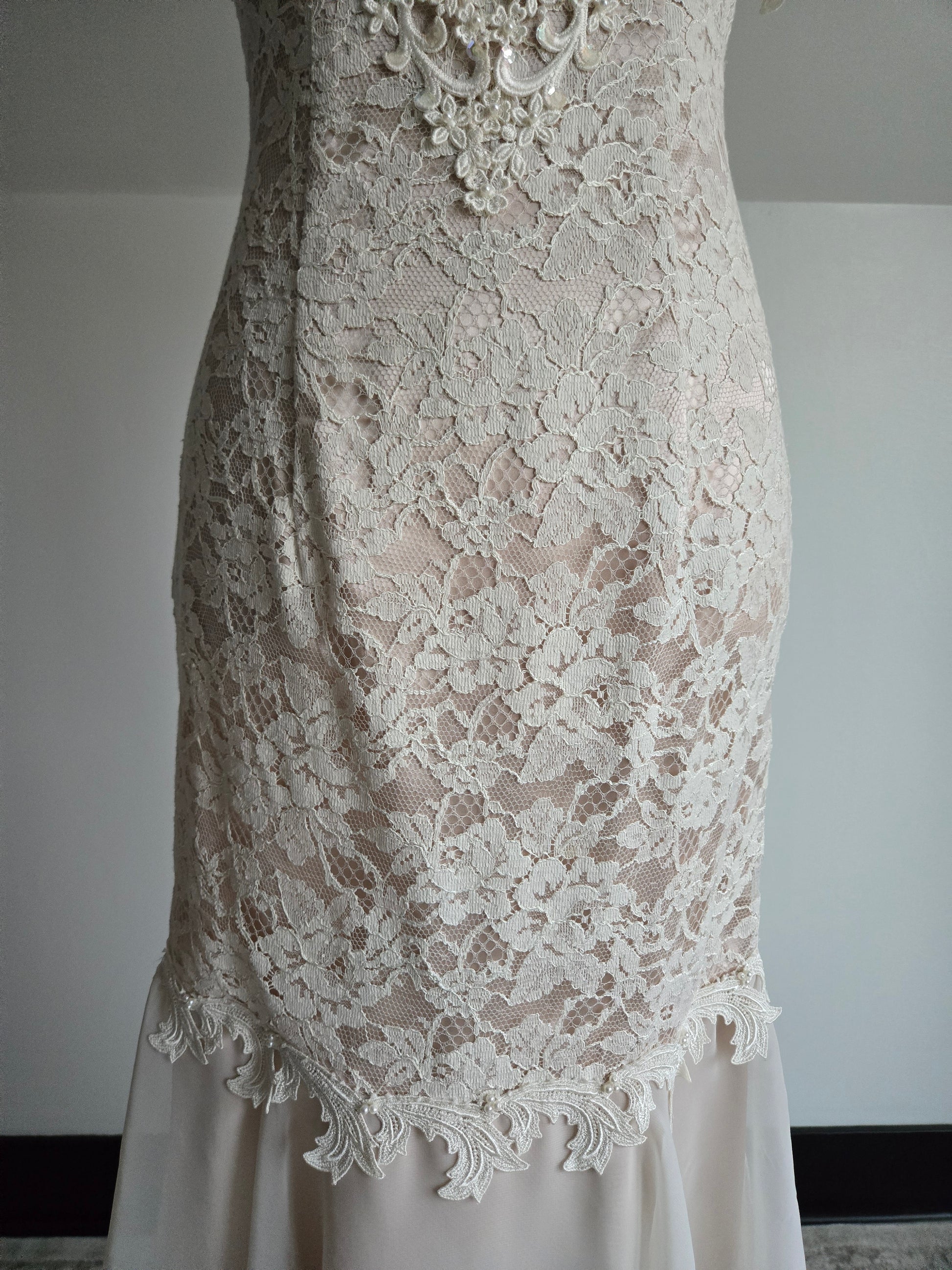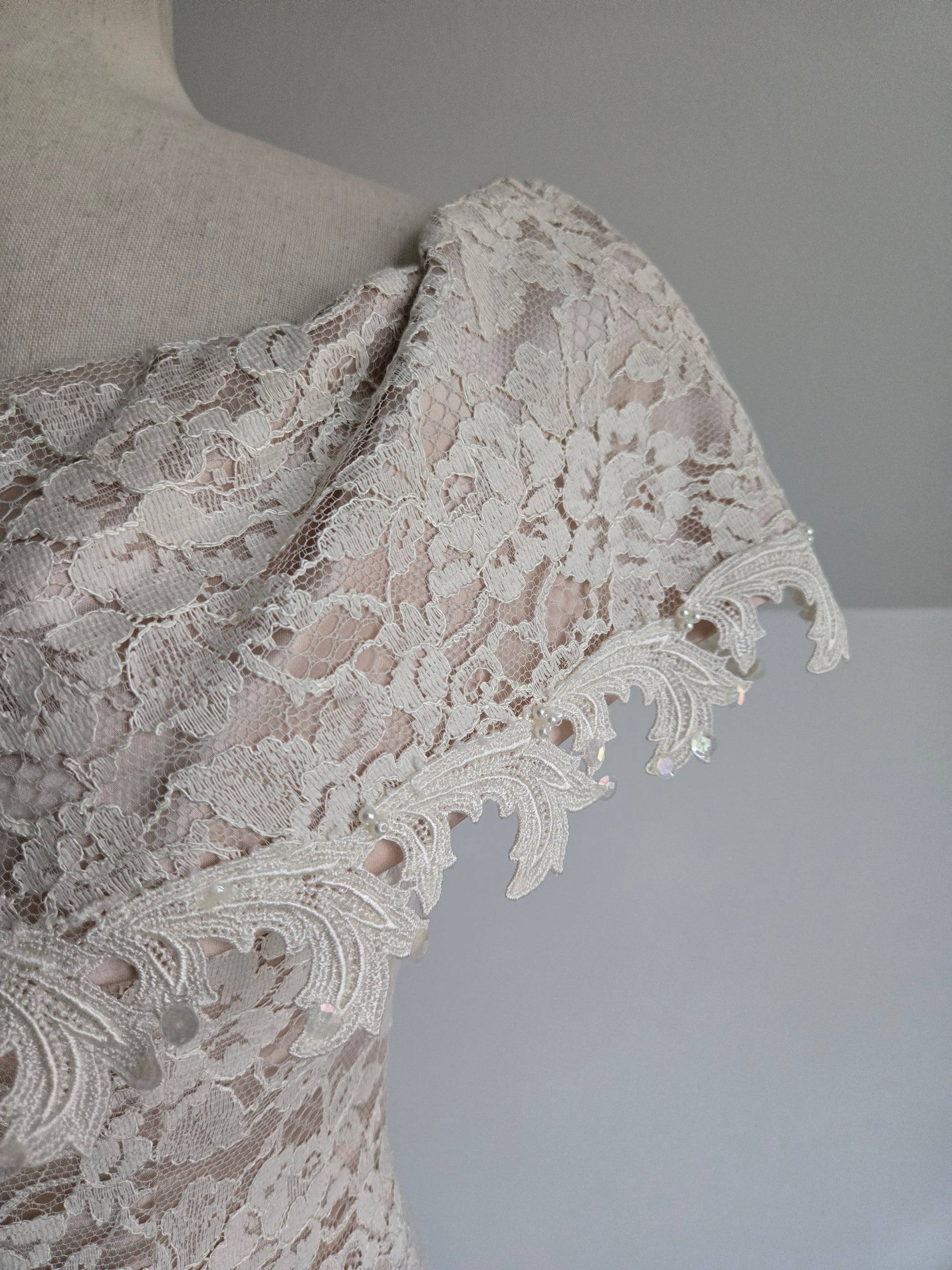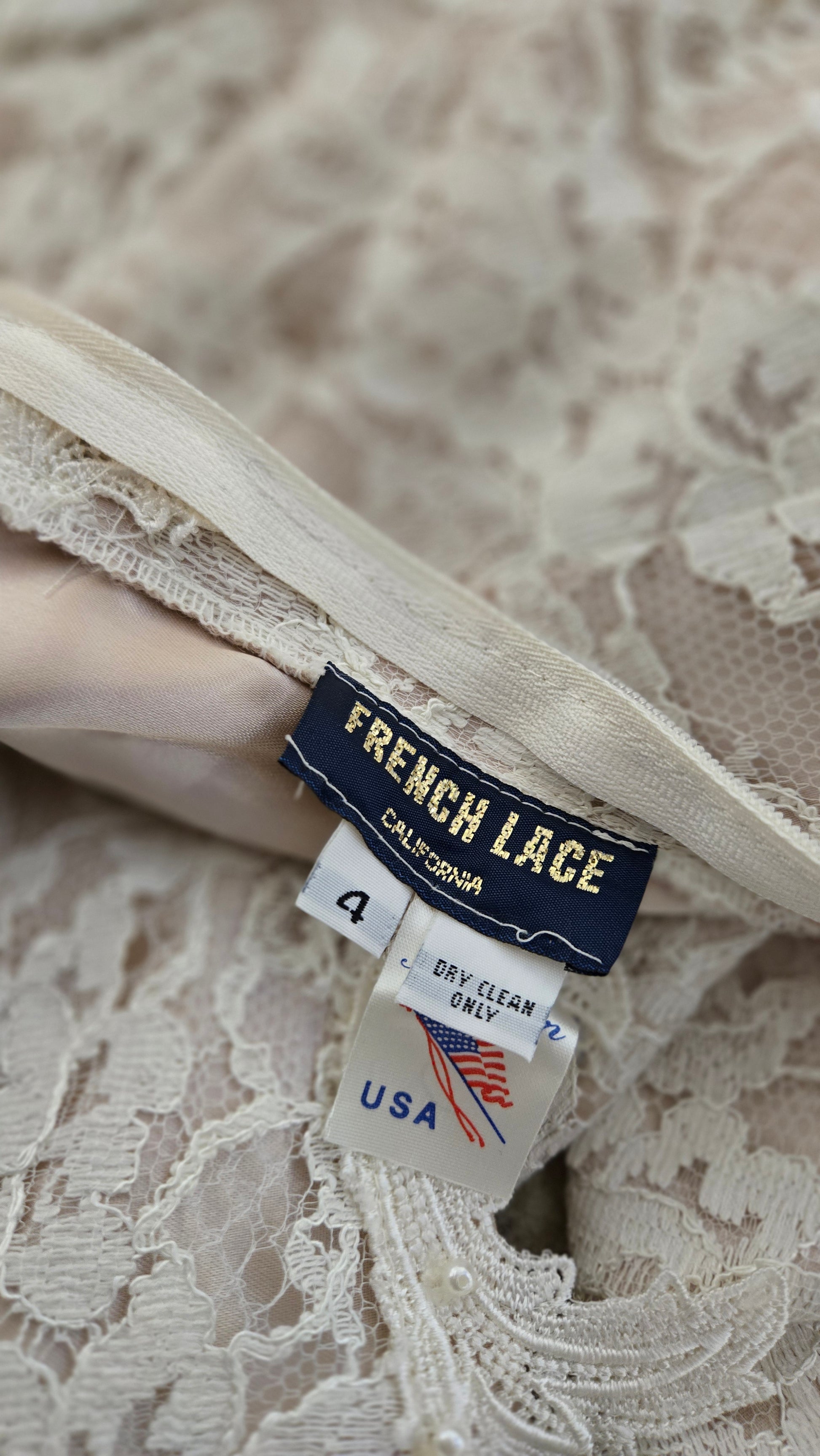 French Lace California formal dress with a pinkish nude color liner and a creamy white lace over top. It has a cape like off the shoulder silhouette and a chiffon handkerchief edge bottom to the skirt. Zips in the back and in great condition. There is a small bit of elastic at the top of the shoulder to help hold the dress in place, and it is in healthy condition.