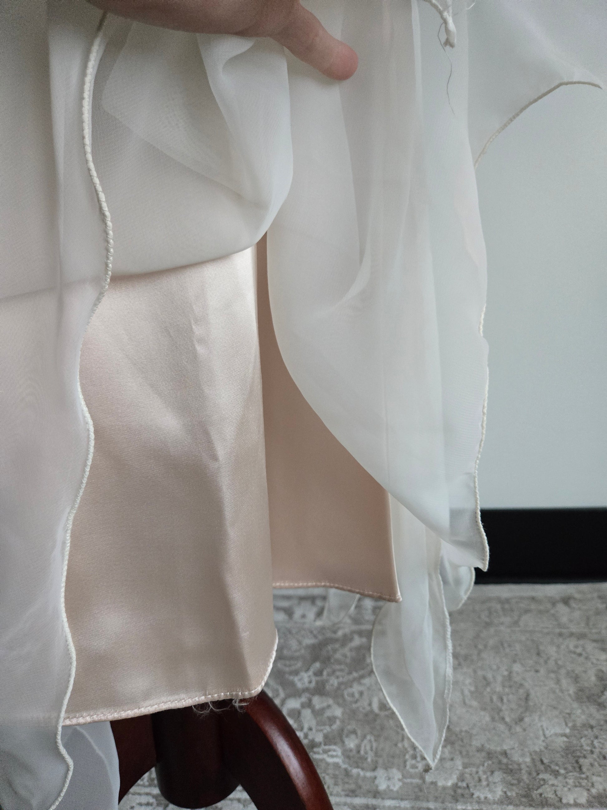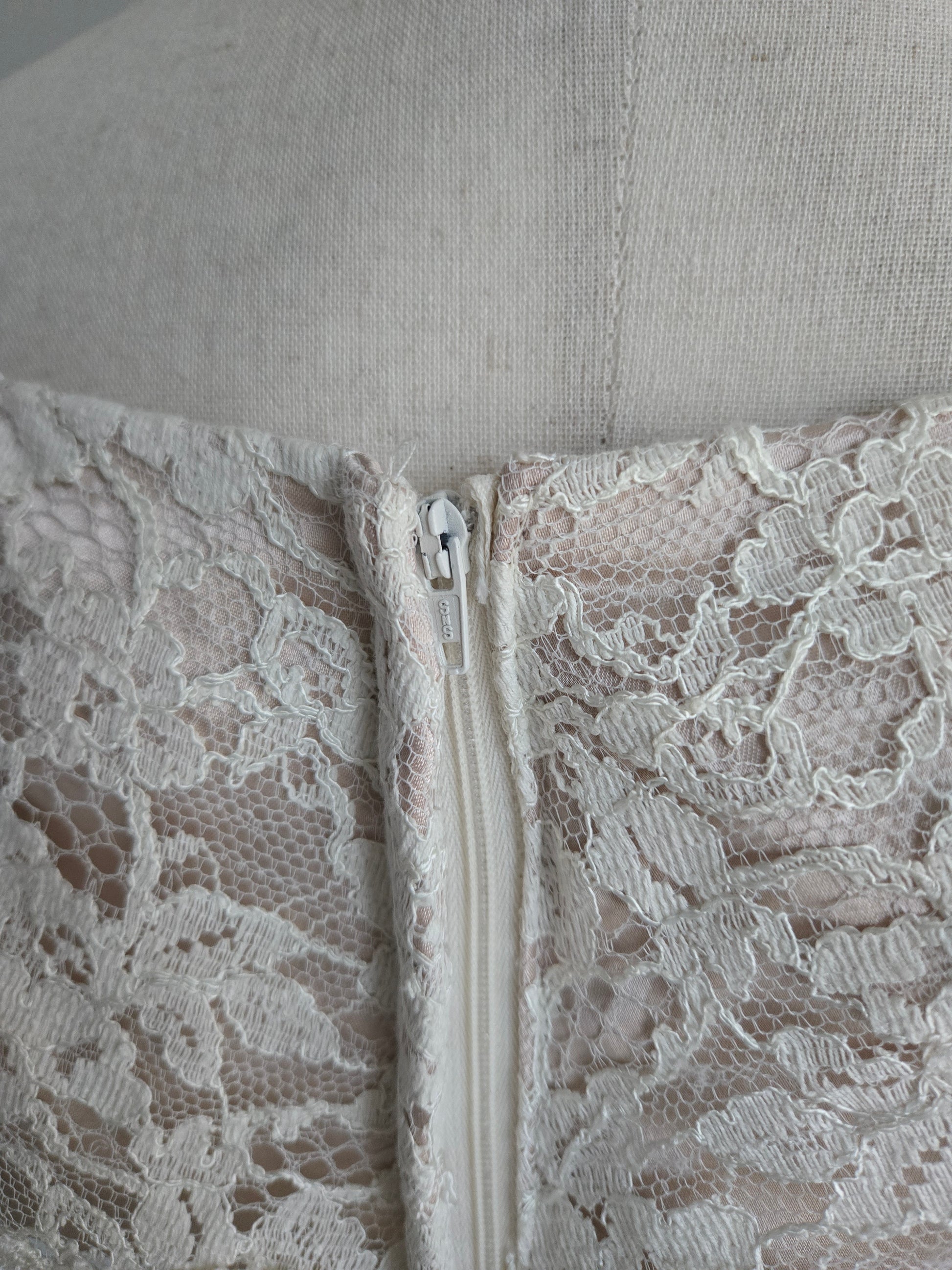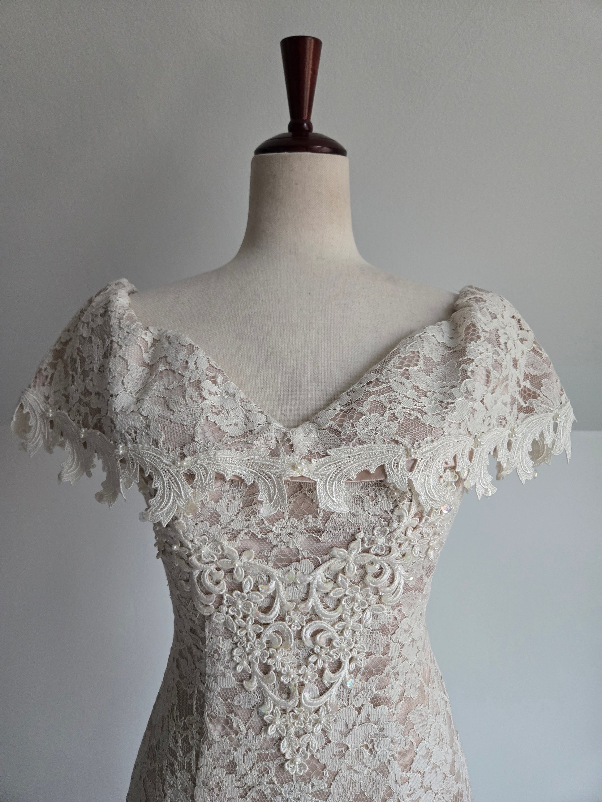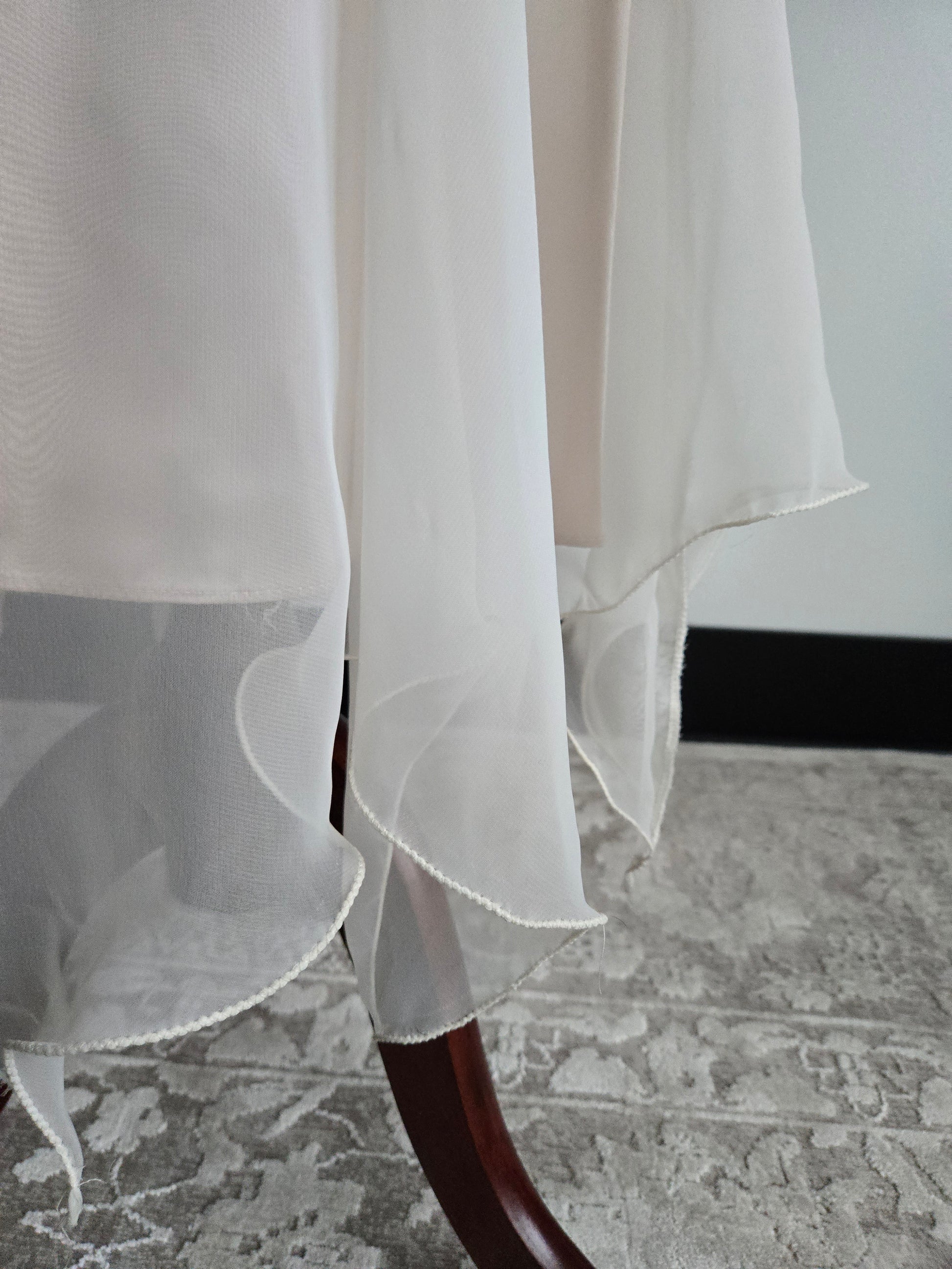 French Lace California formal dress with a pinkish nude color liner and a creamy white lace over top. It has a cape like off the shoulder silhouette and a chiffon handkerchief edge bottom to the skirt. Zips in the back and in great condition. There is a small bit of elastic at the top of the shoulder to help hold the dress in place, and it is in healthy condition.