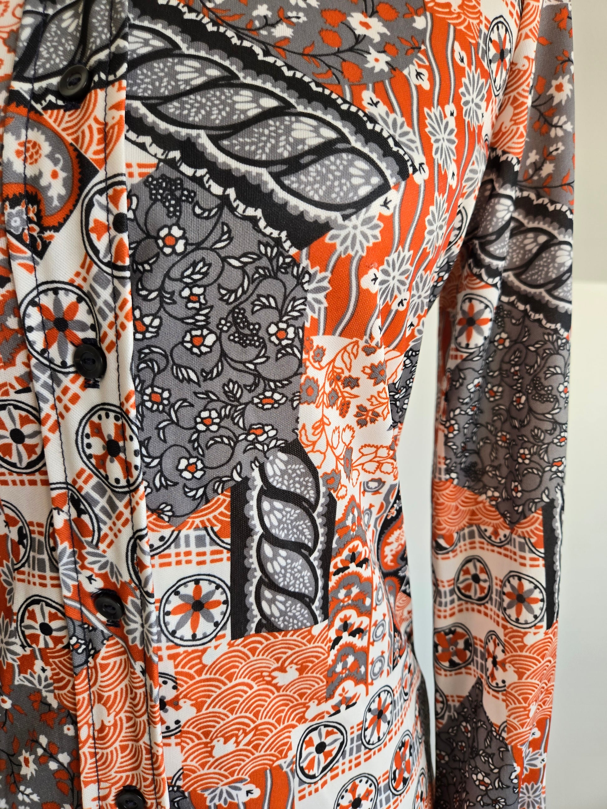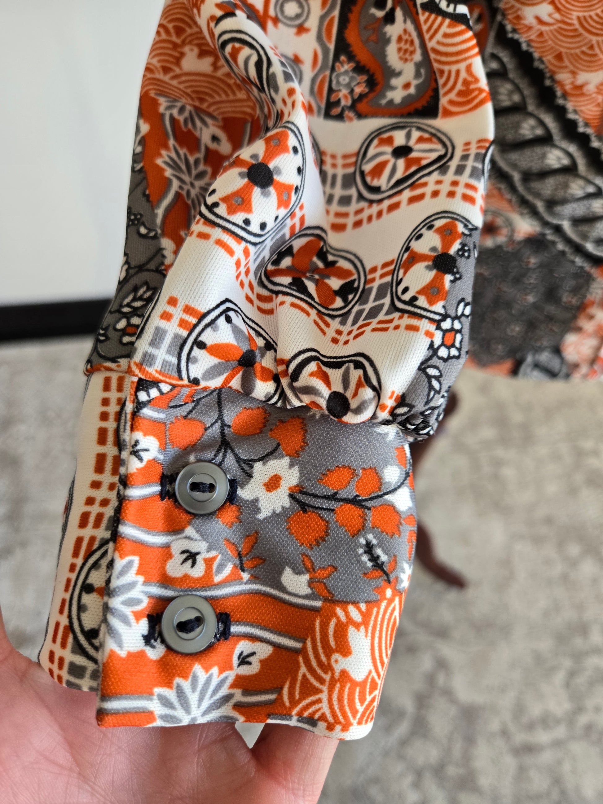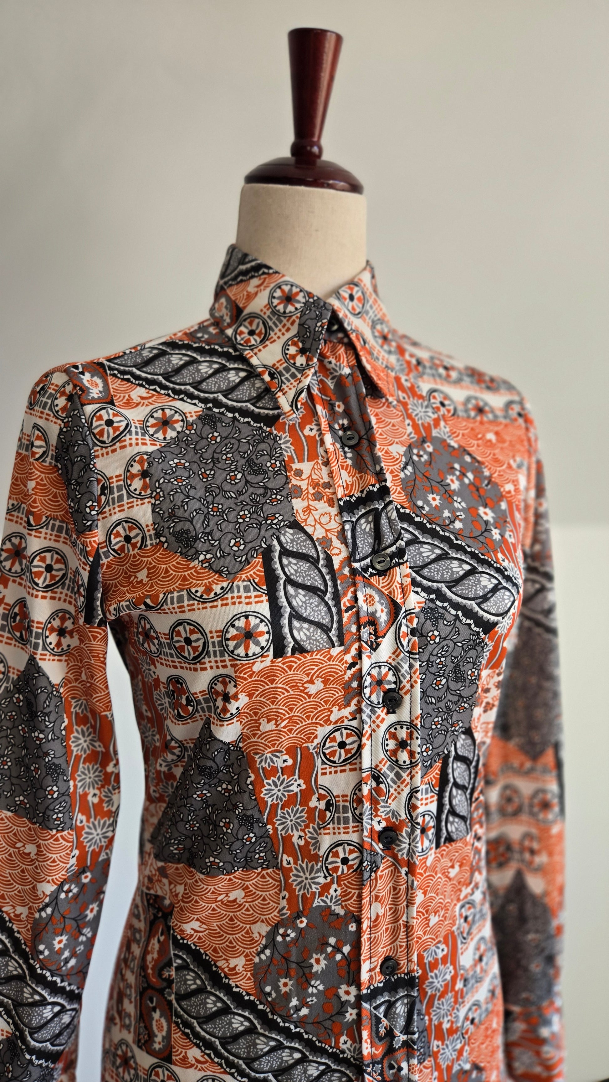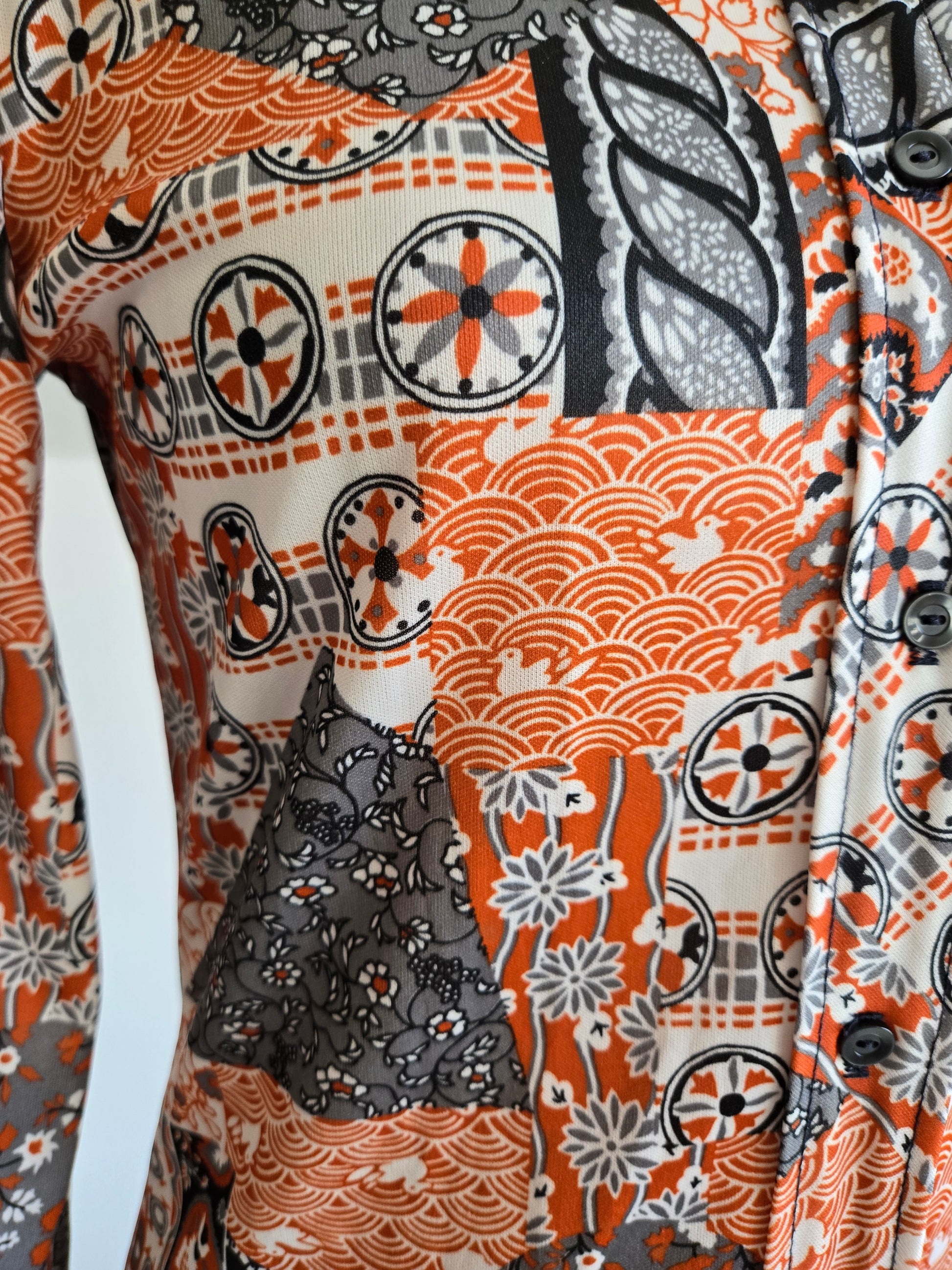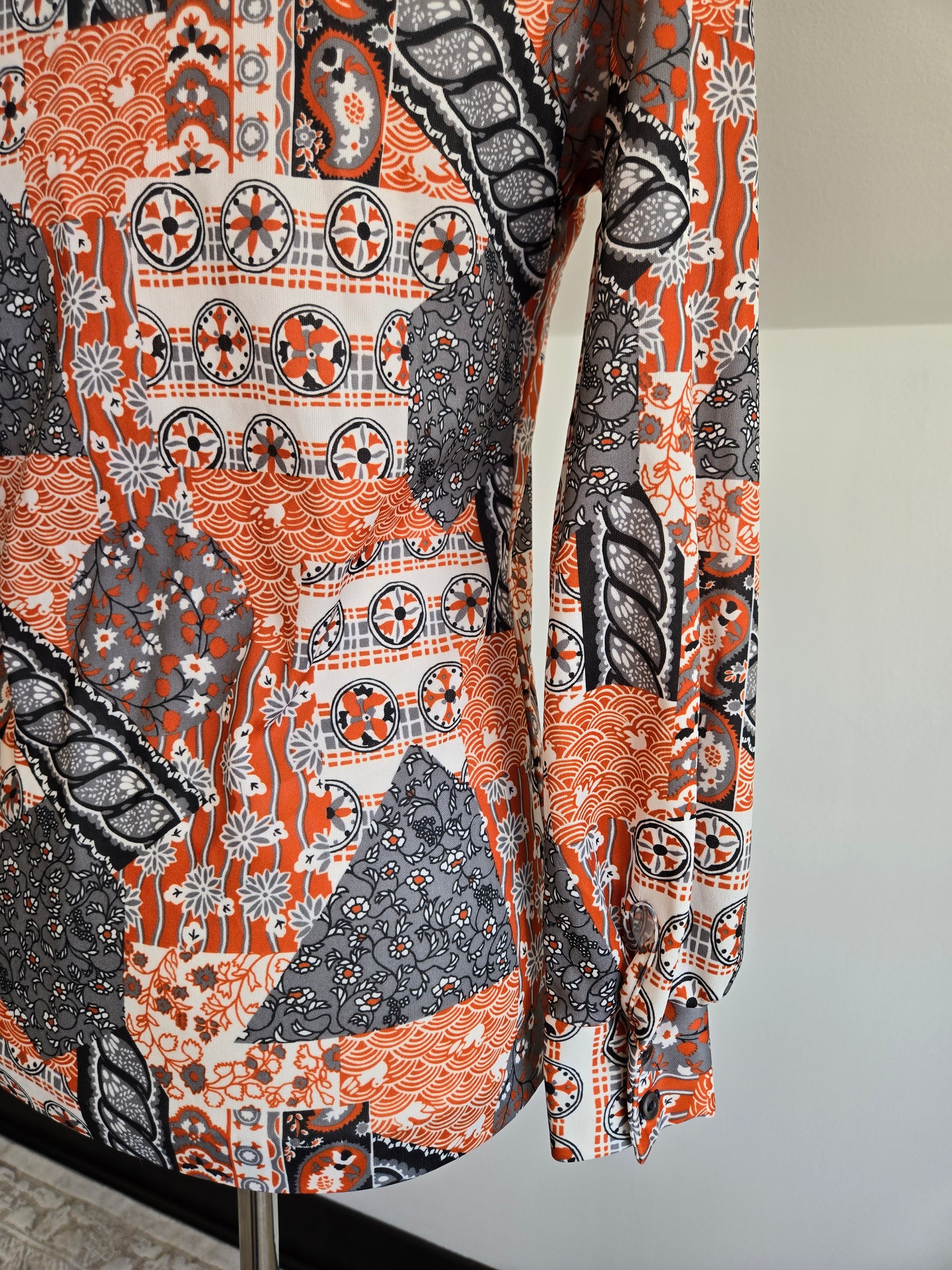 Vintage 70s orange and gray duck pond novelty print button down long sleeve top. It is a mixture of a lot of different types of print and is so fun! It is in amazing condition and has been washed and steamed.