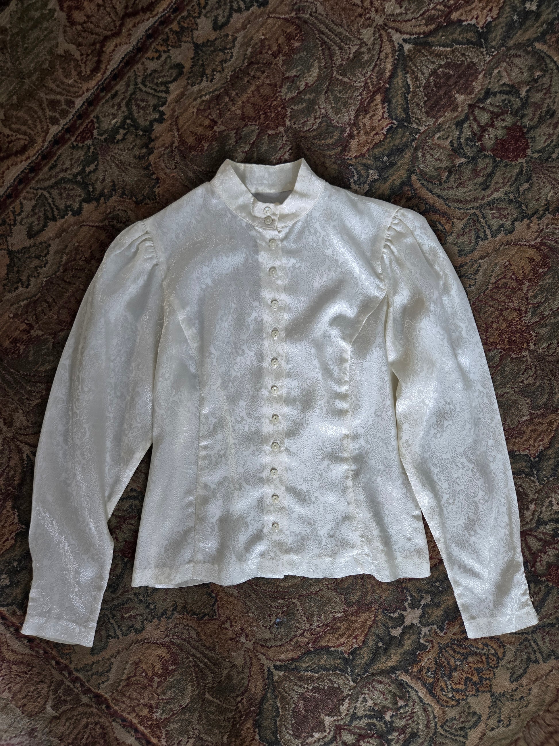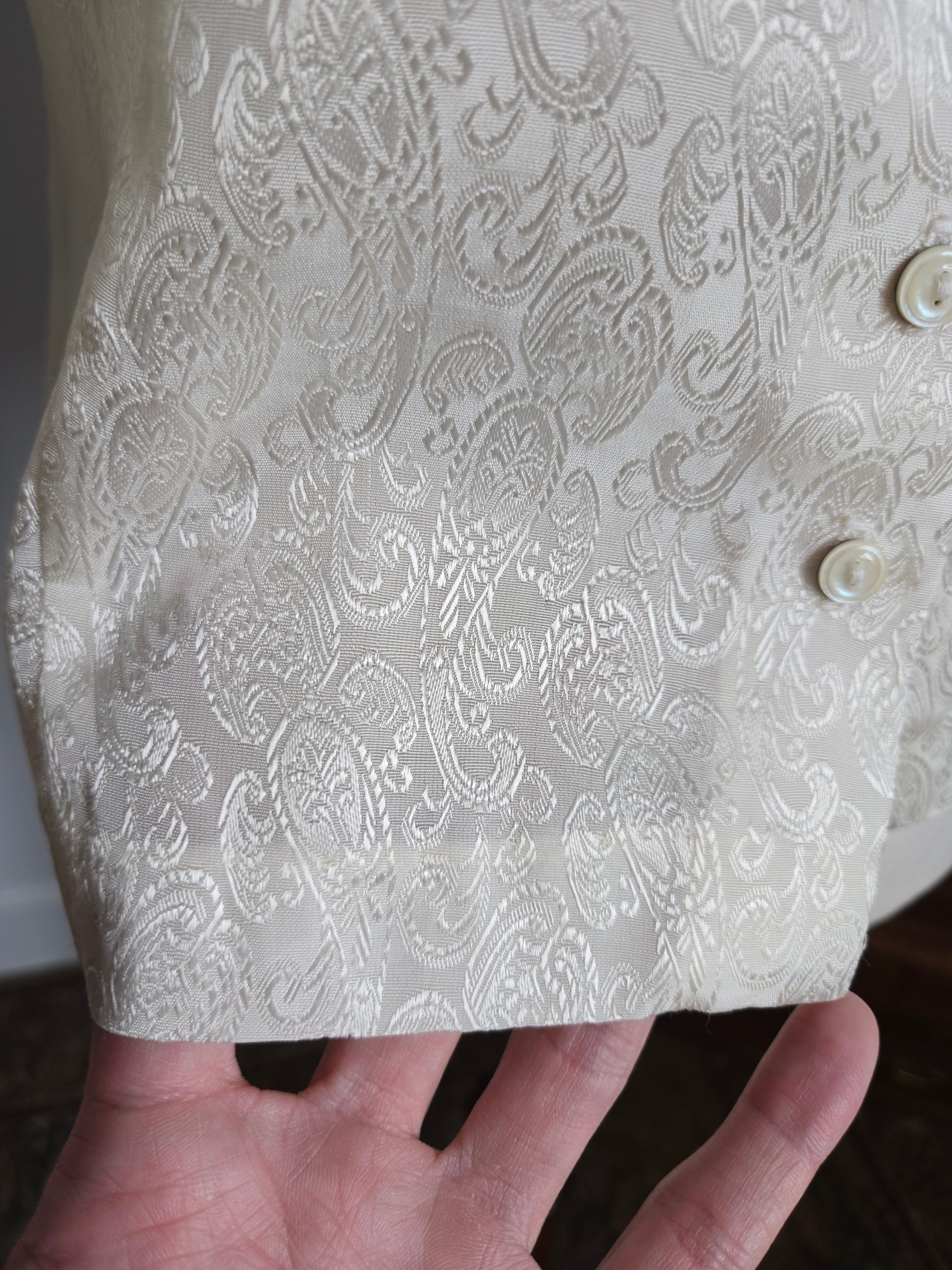 Vintage Edwardian style off white paisley jacquard button down long sleeve top. I love how many buttons there are and how close together they land. The details are stunning. It is in amazing condition with no imperfections to note.