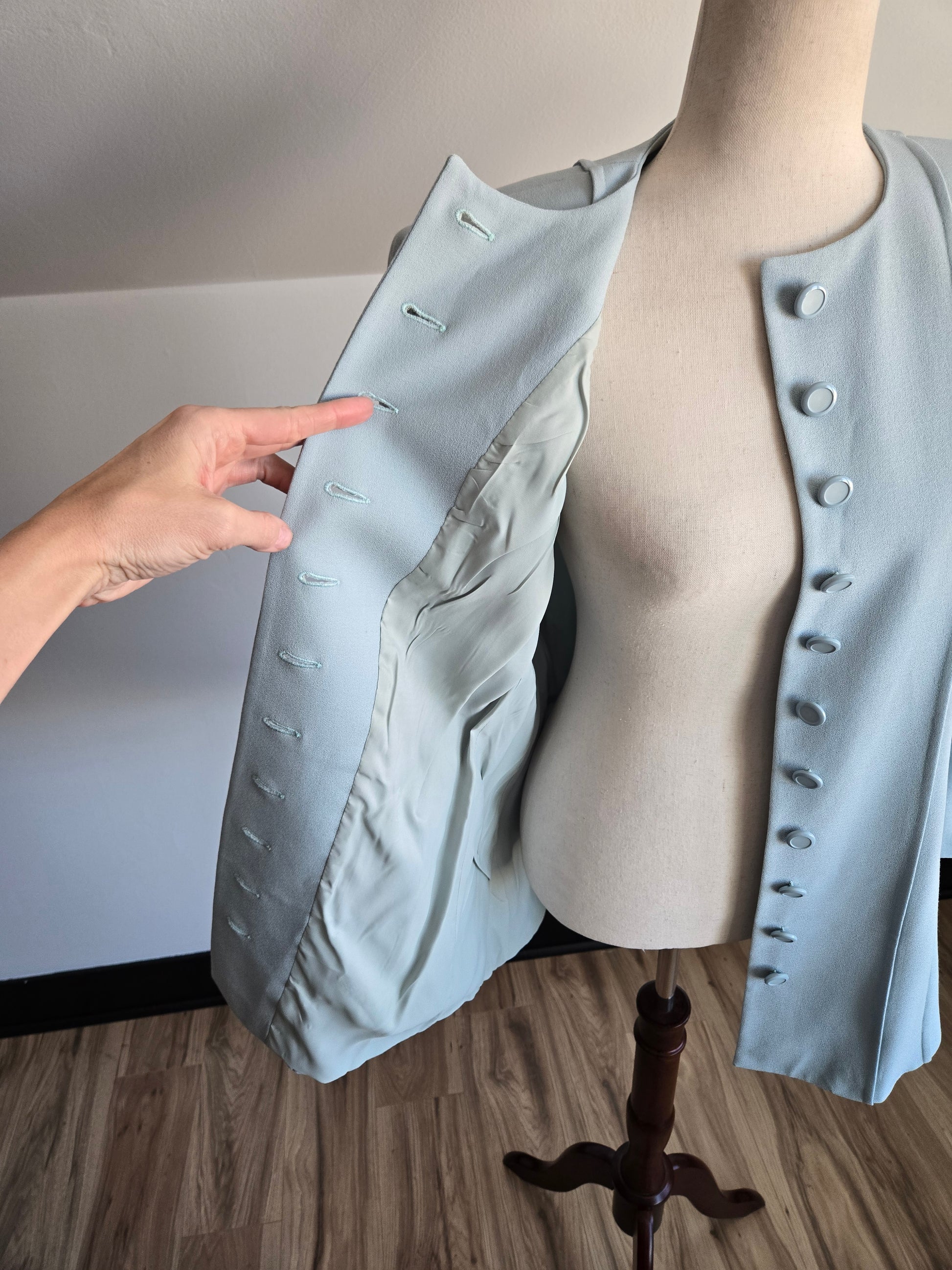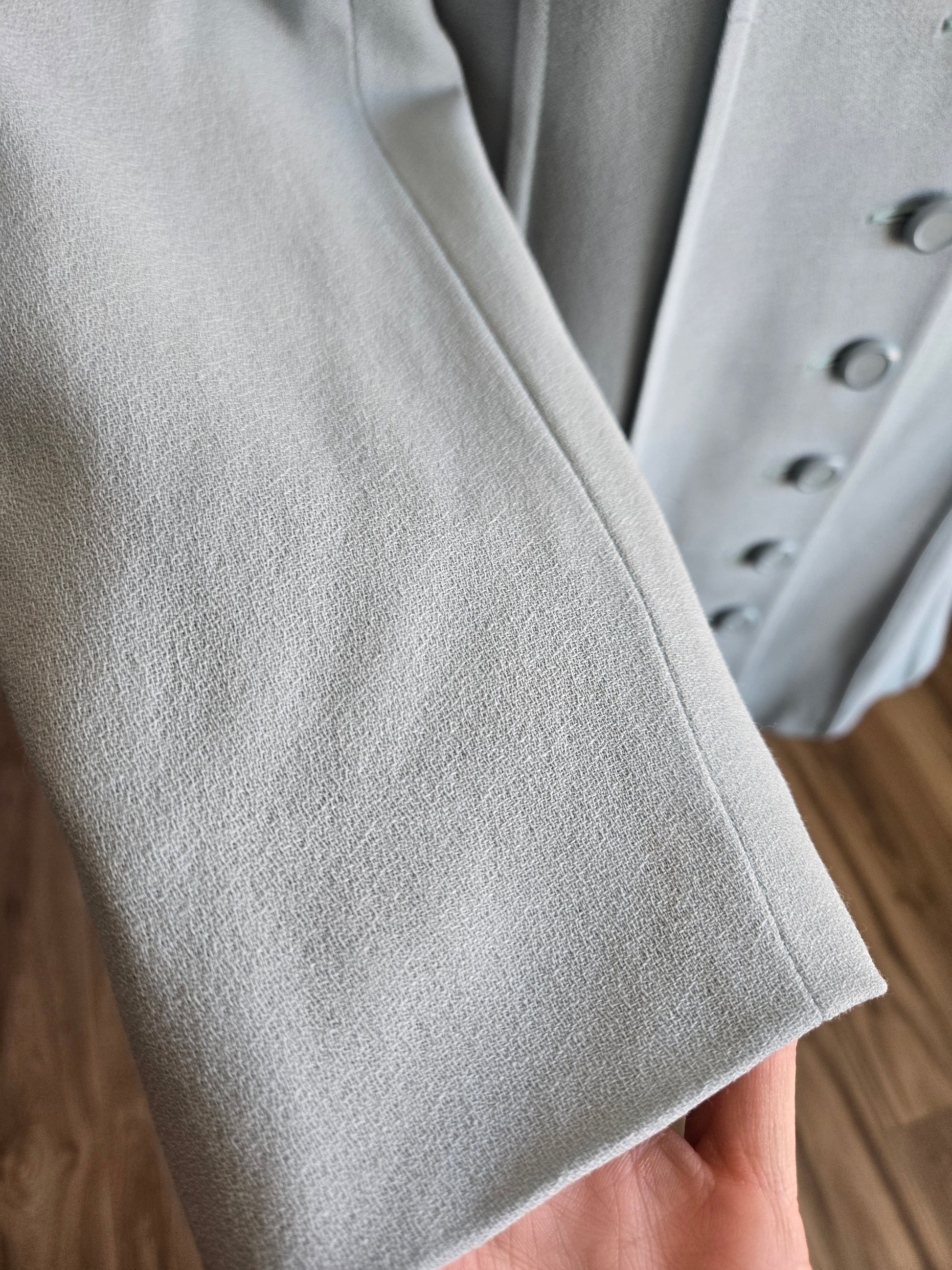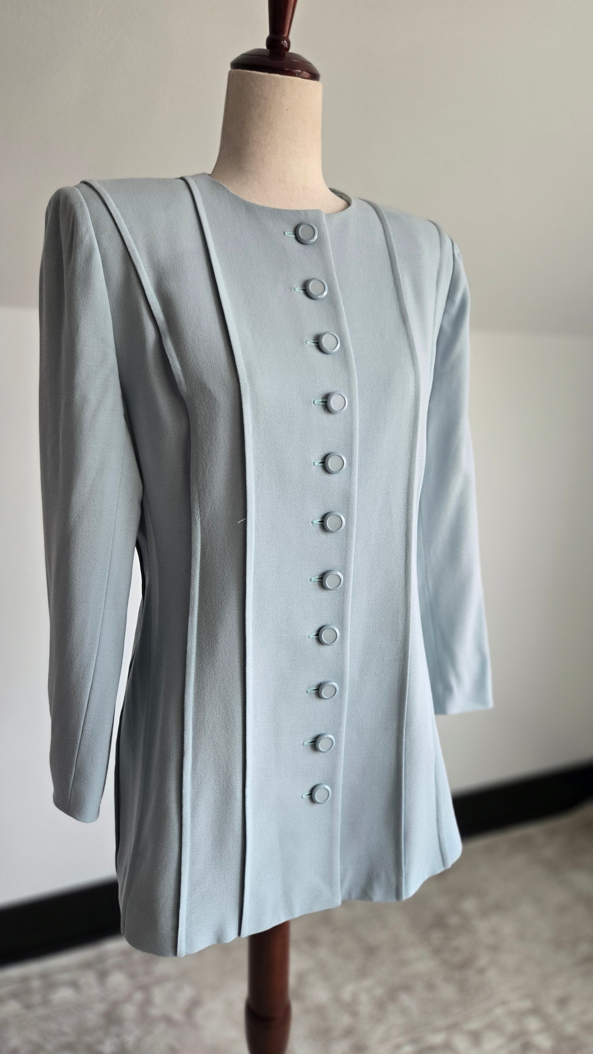 Ilie Wacs designer vintage dusty blue blazer with gorgeous tailoring and many center front buttons. I love this look! So chic. It does not have a fabric tag, but I would say she is a high quality tightly woven wool. Very high end piece.