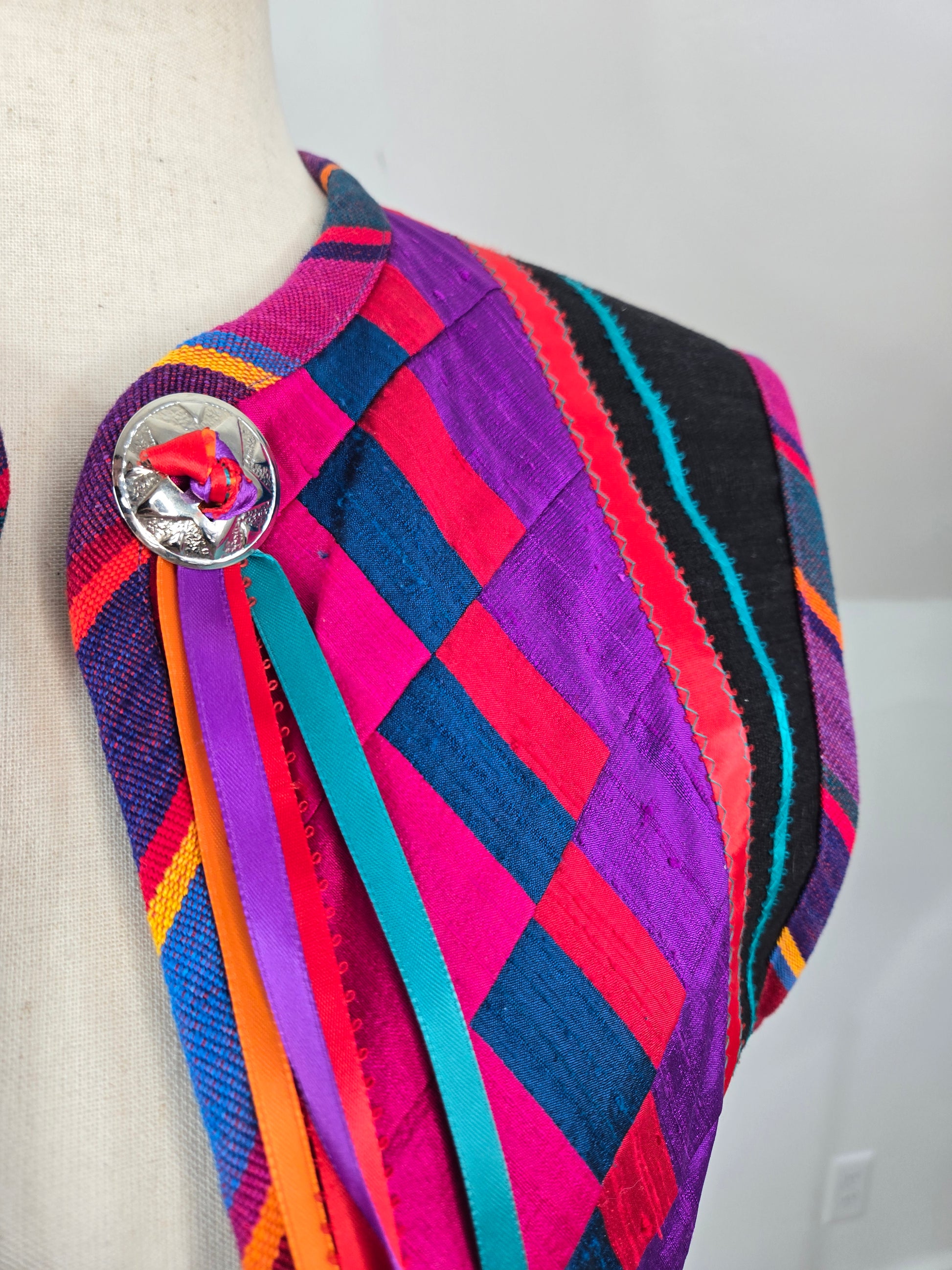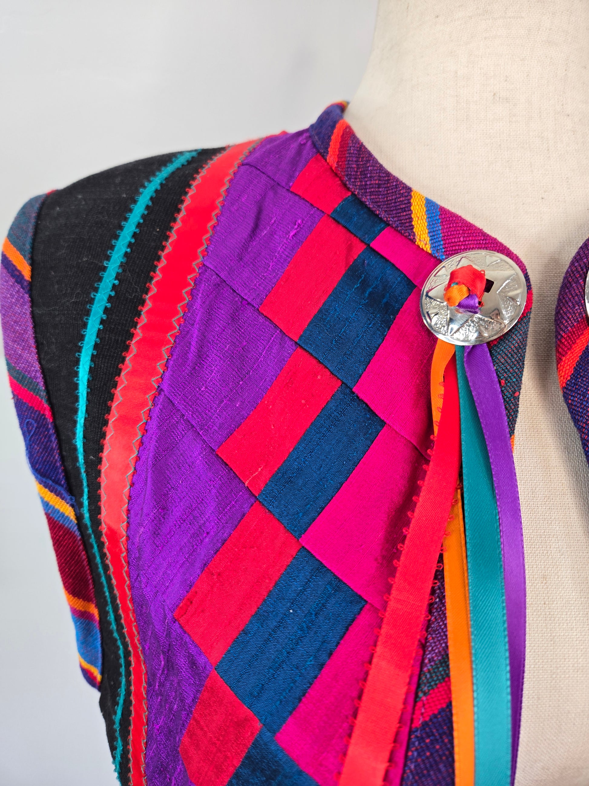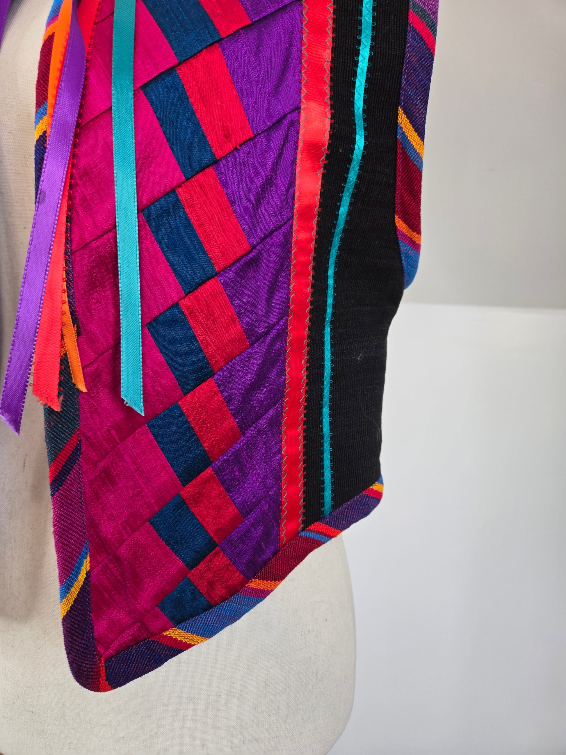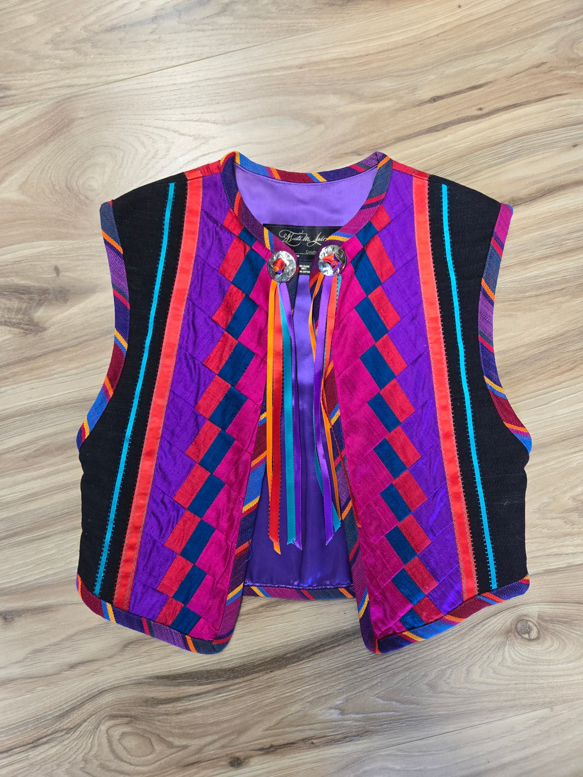 Gorgeous hand made colorful quilted southwest design vest. It is made out of a variety of fabrics and textures and has a silver concho and colorful ribbon fringe detail at the front collar. All the satin mixed with the serape cotton and a cotton based material make this vest feel very high quality. Amazing condition and seriously beautiful in person!