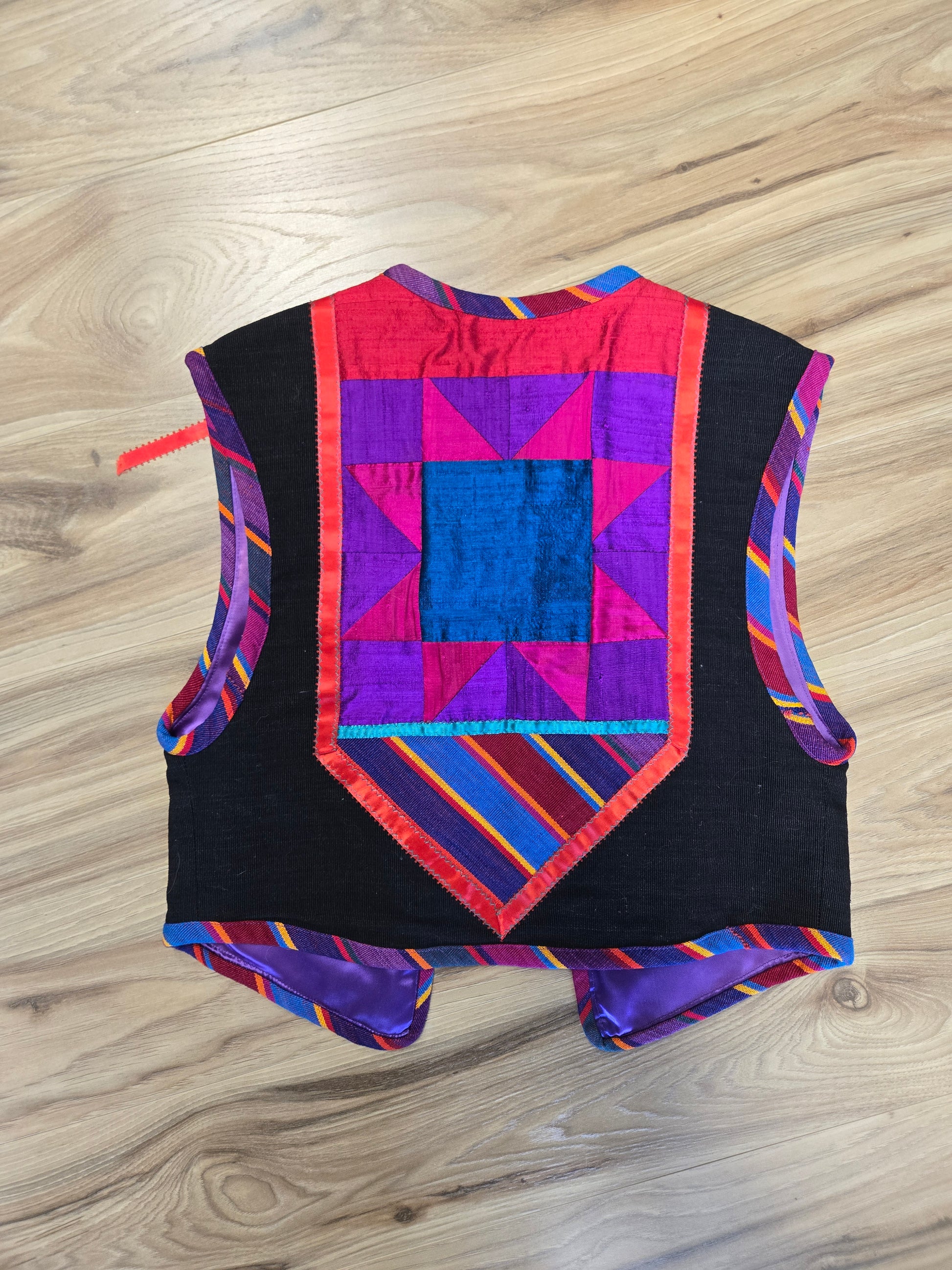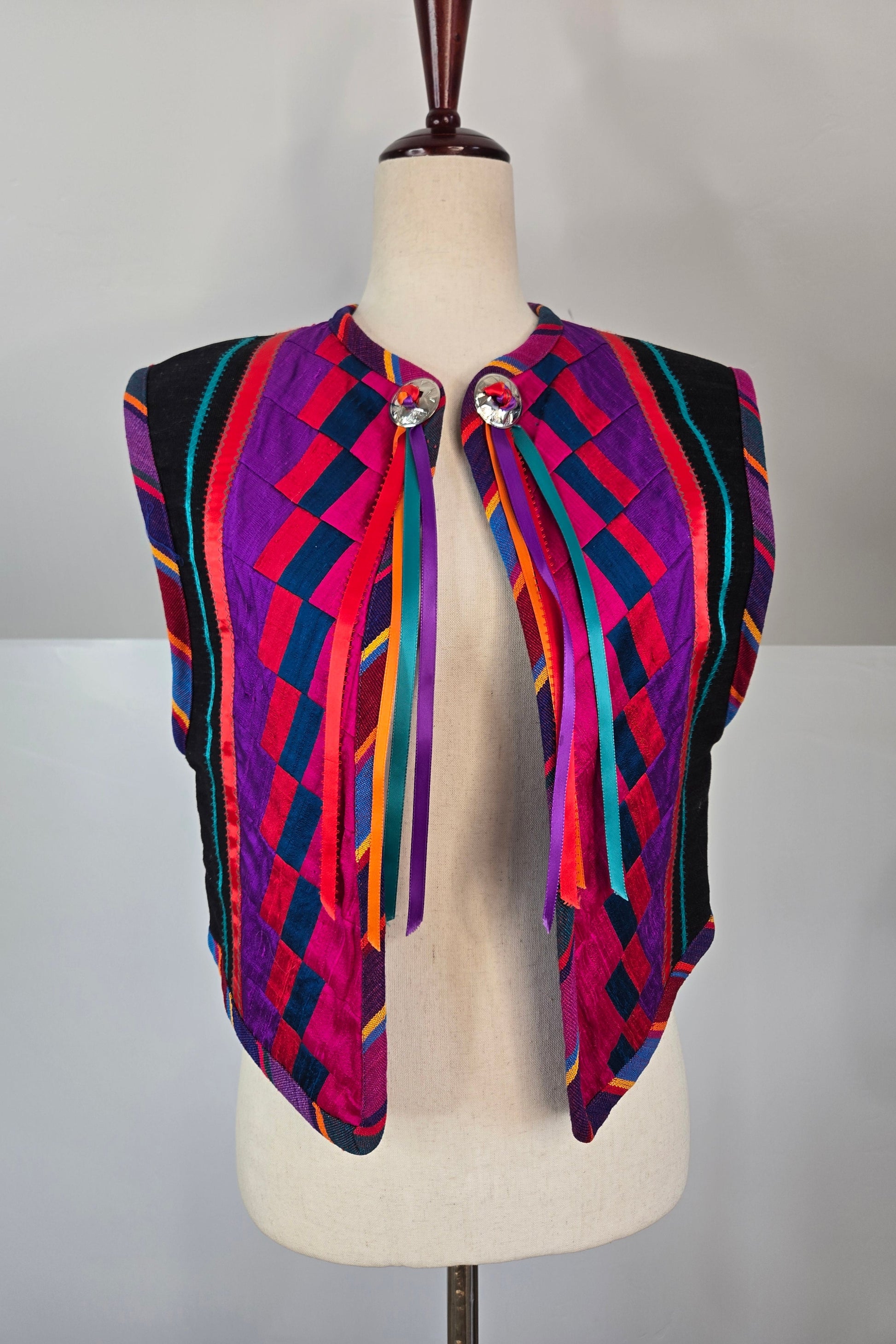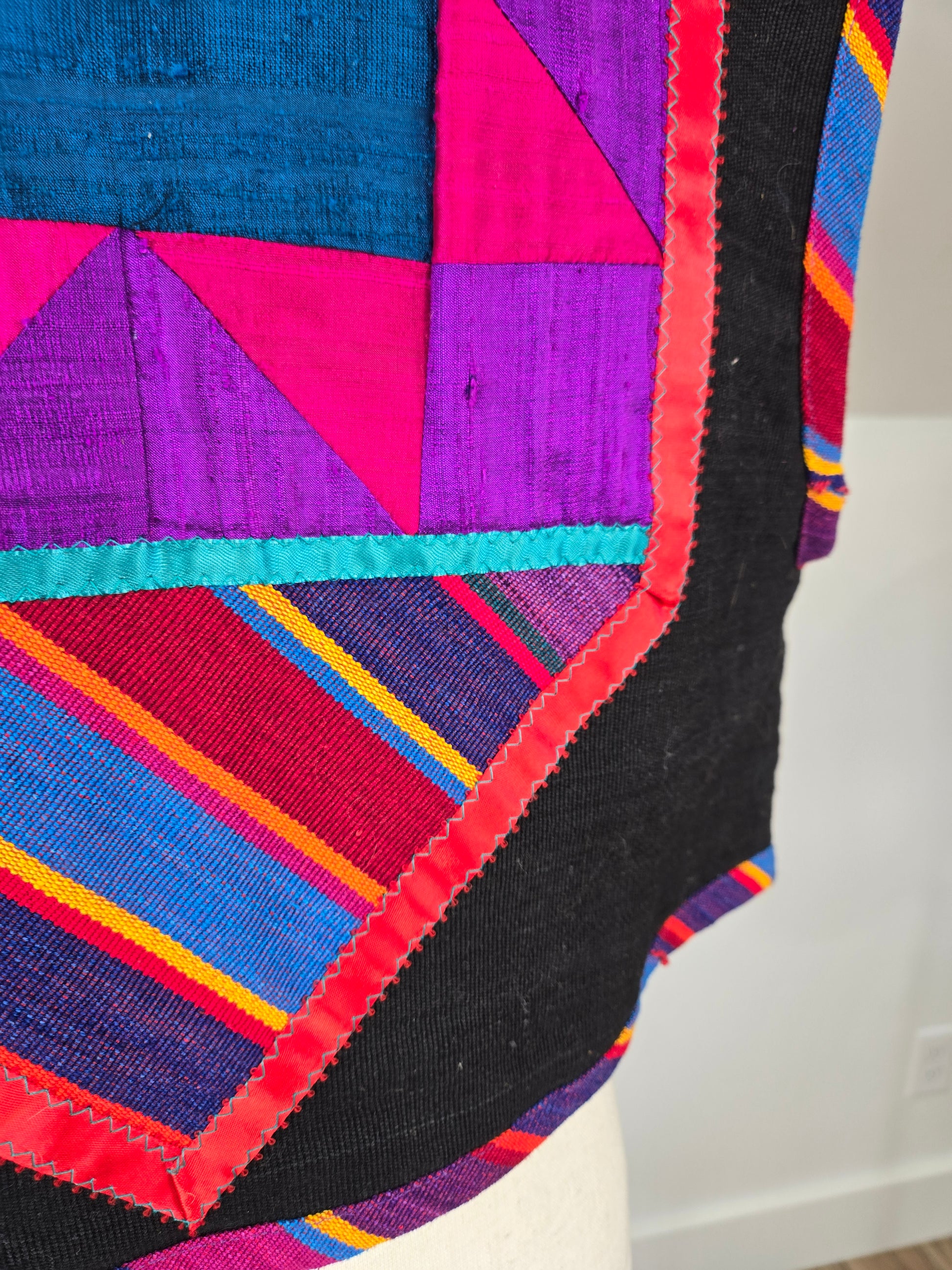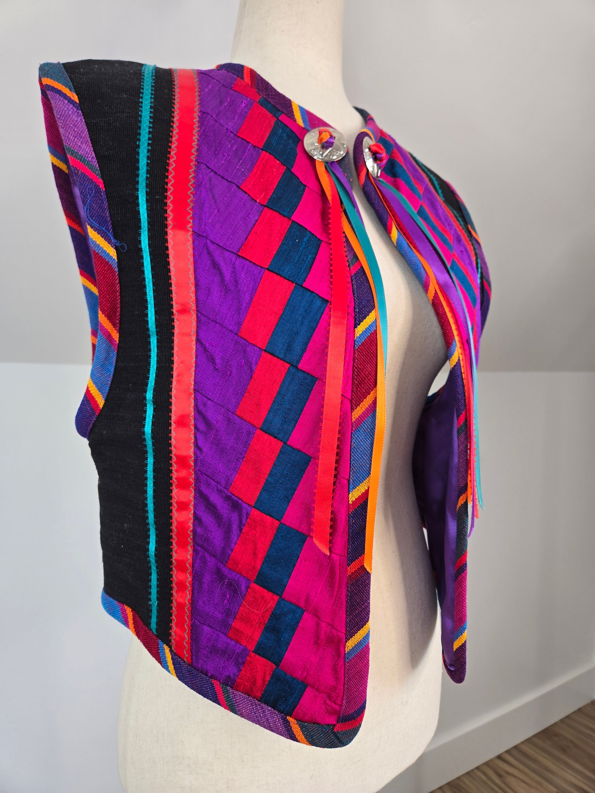 Gorgeous hand made colorful quilted southwest design vest. It is made out of a variety of fabrics and textures and has a silver concho and colorful ribbon fringe detail at the front collar. All the satin mixed with the serape cotton and a cotton based material make this vest feel very high quality. Amazing condition and seriously beautiful in person!