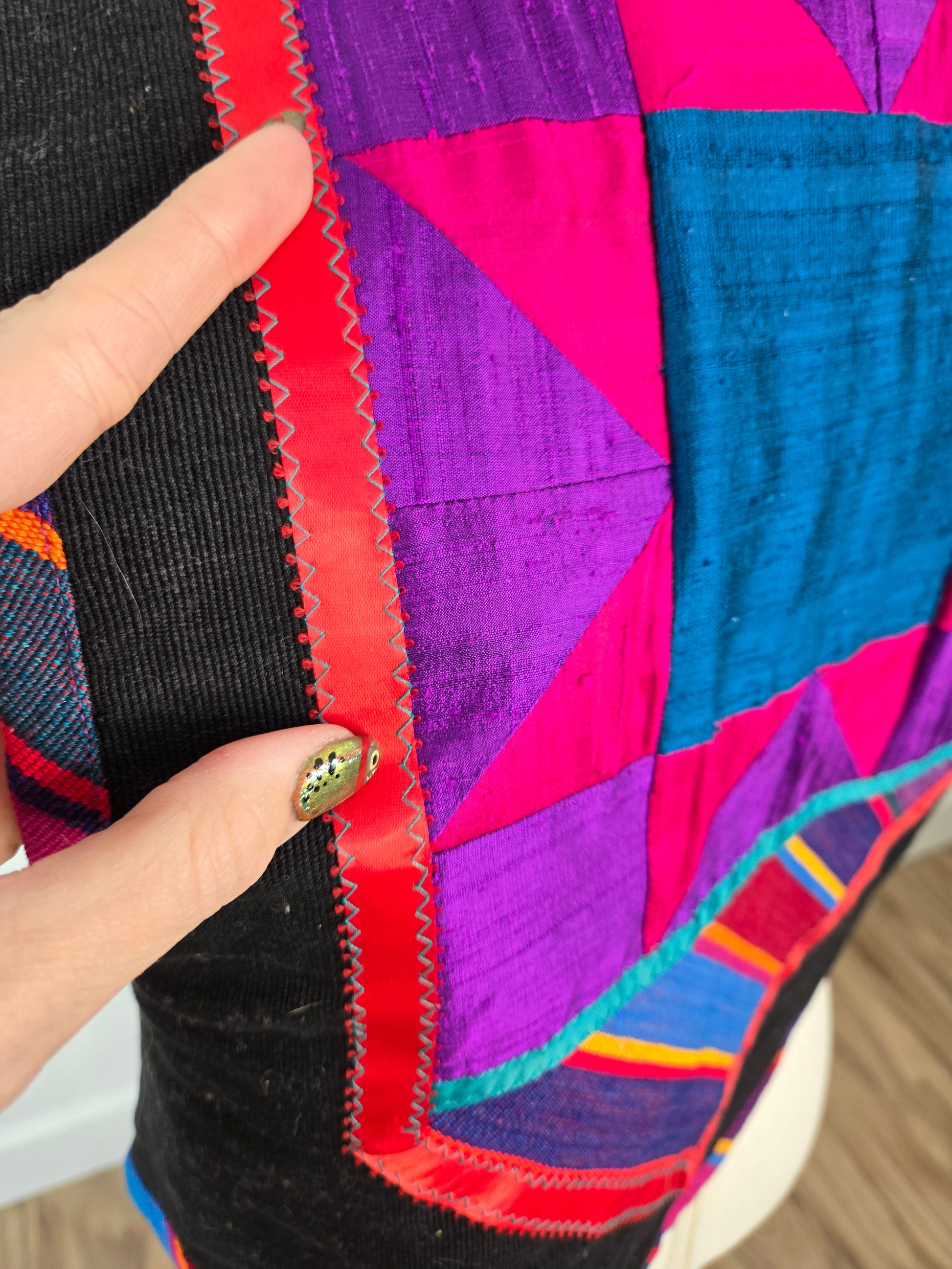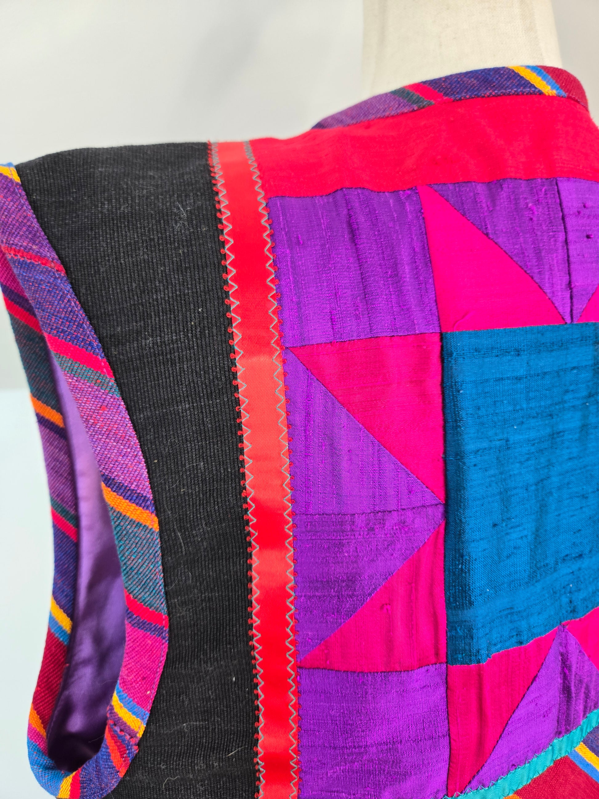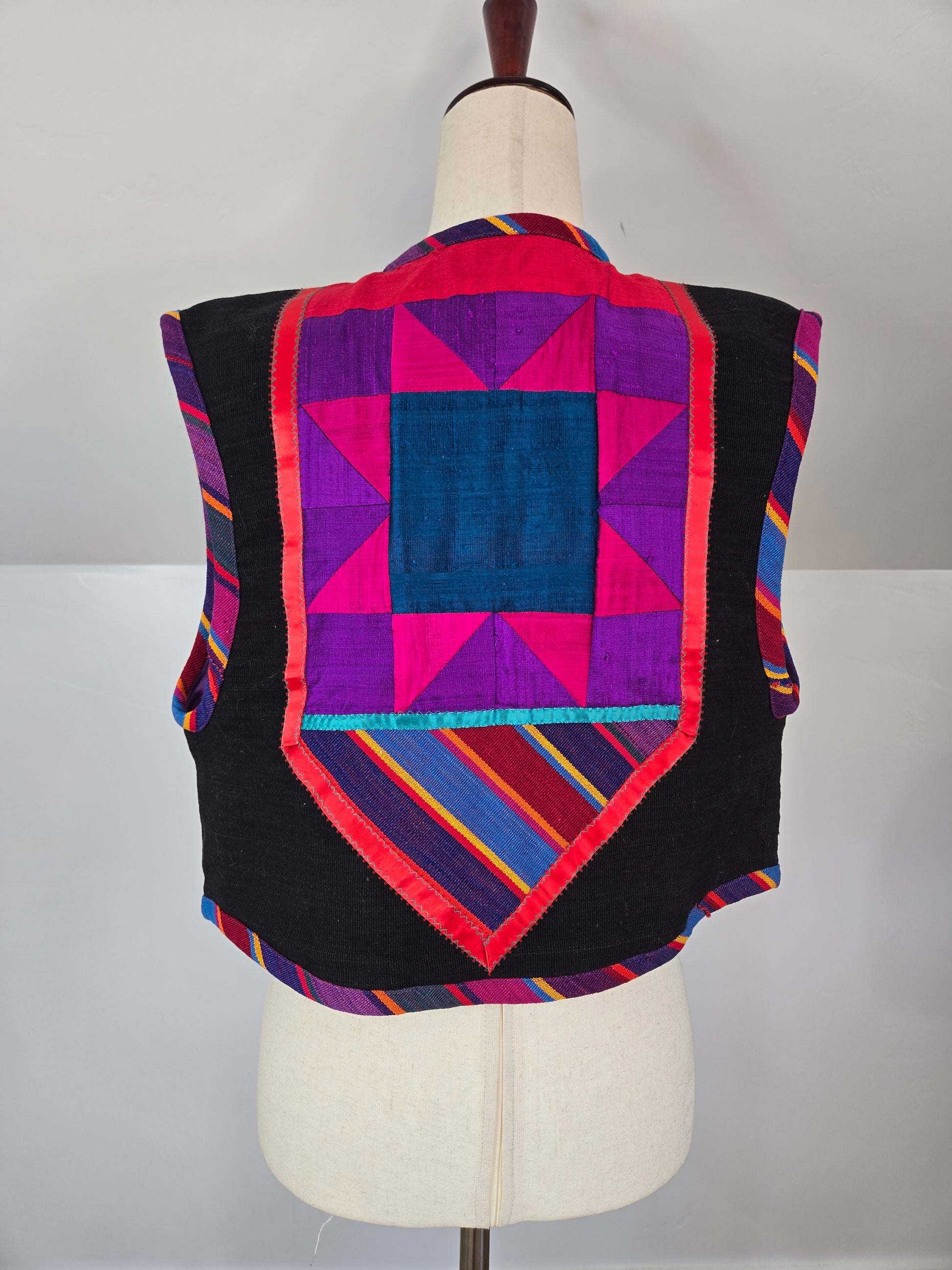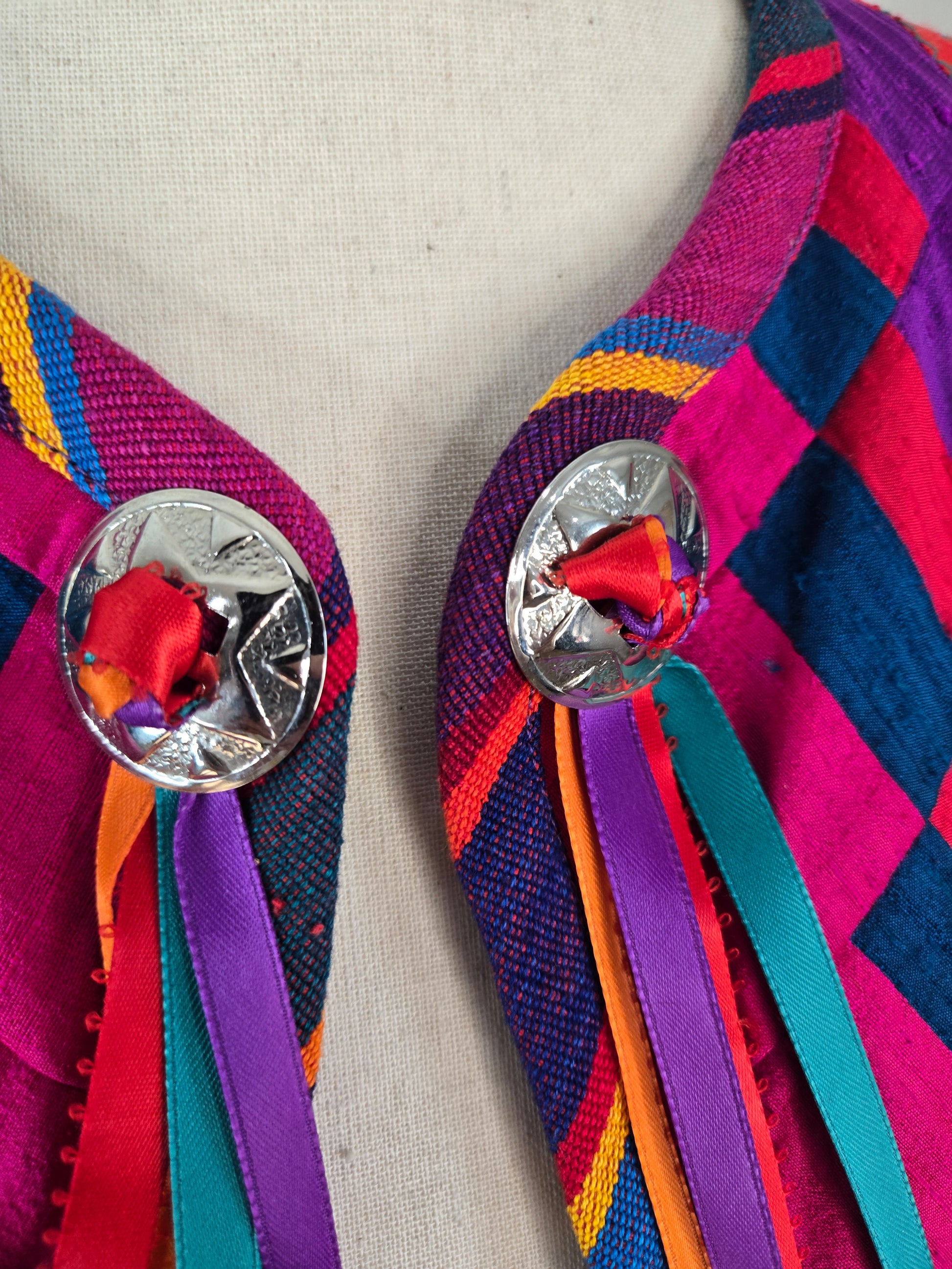 Gorgeous hand made colorful quilted southwest design vest. It is made out of a variety of fabrics and textures and has a silver concho and colorful ribbon fringe detail at the front collar. All the satin mixed with the serape cotton and a cotton based material make this vest feel very high quality. Amazing condition and seriously beautiful in person!