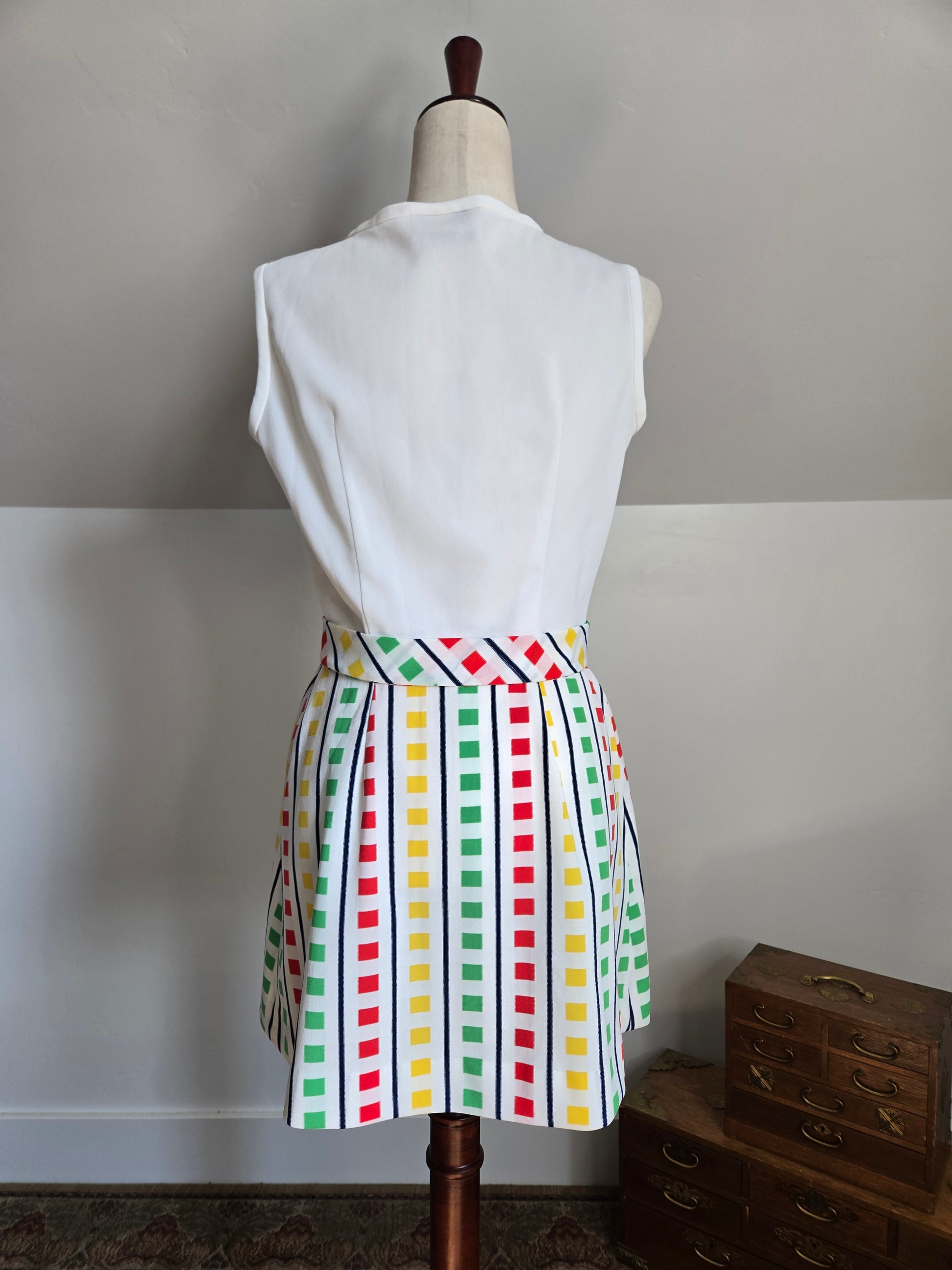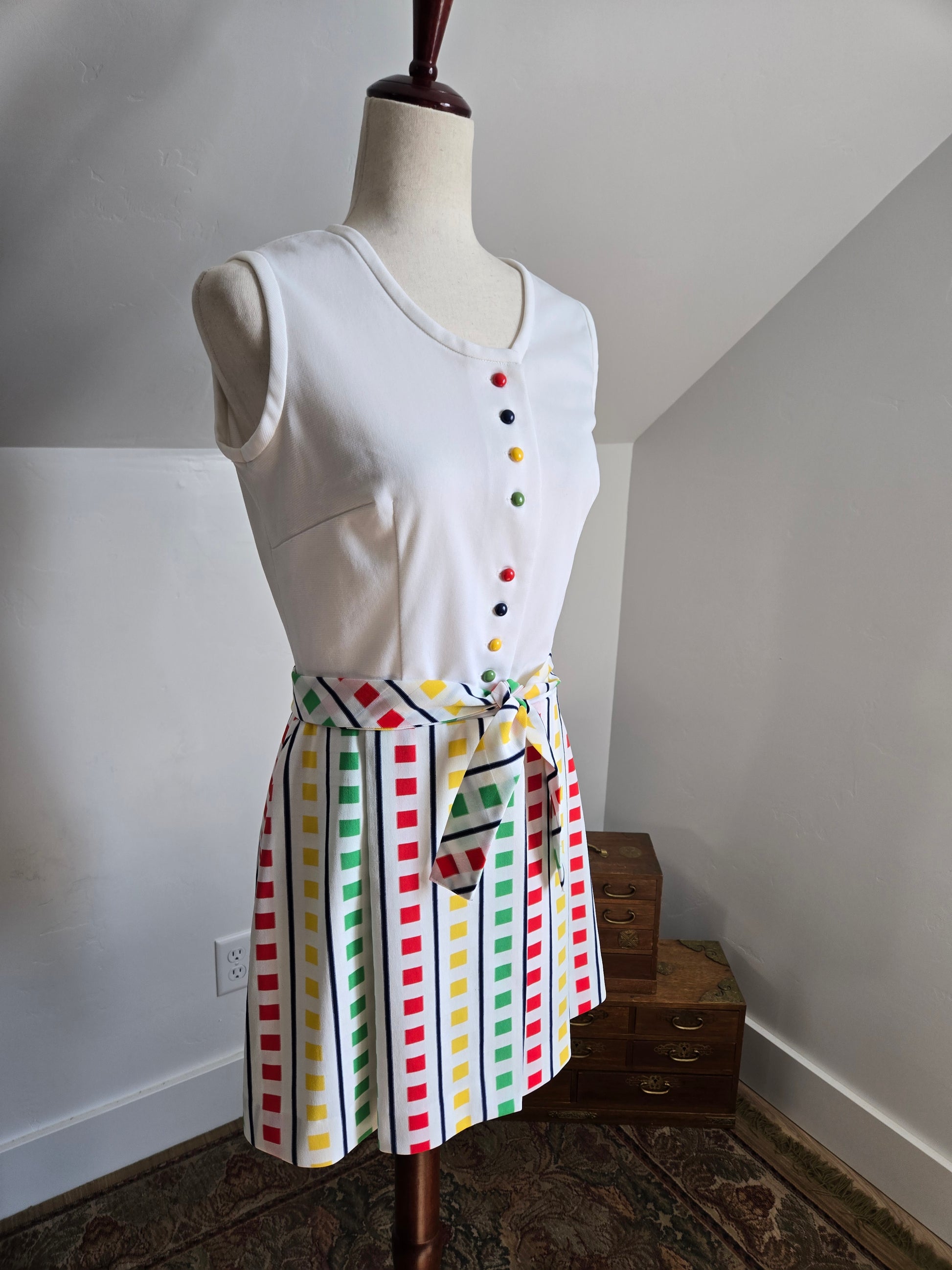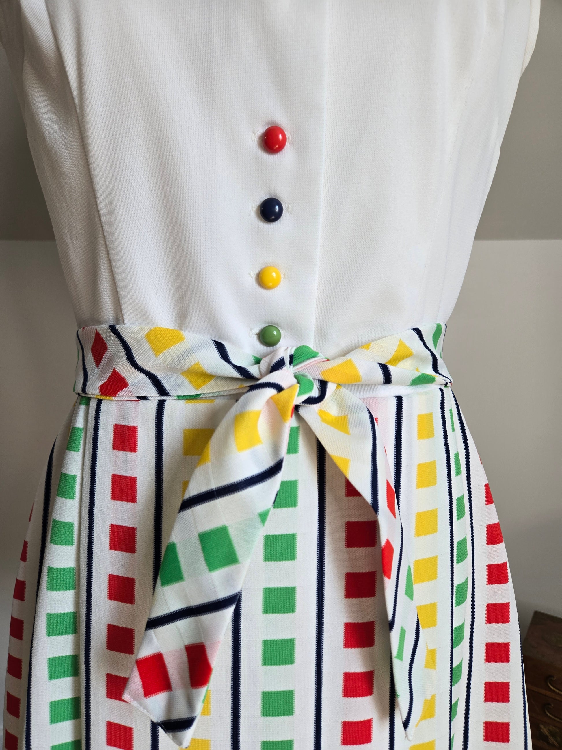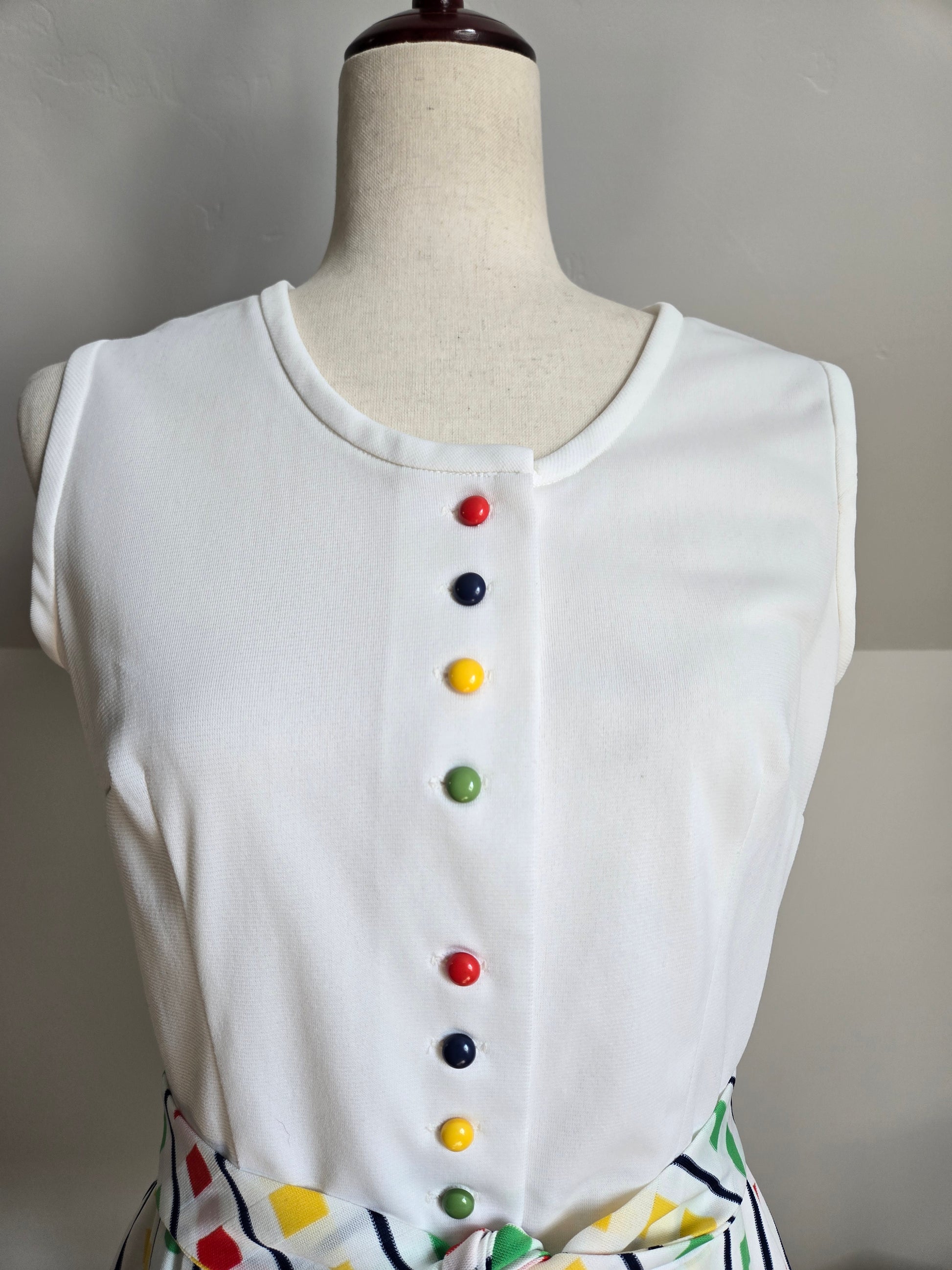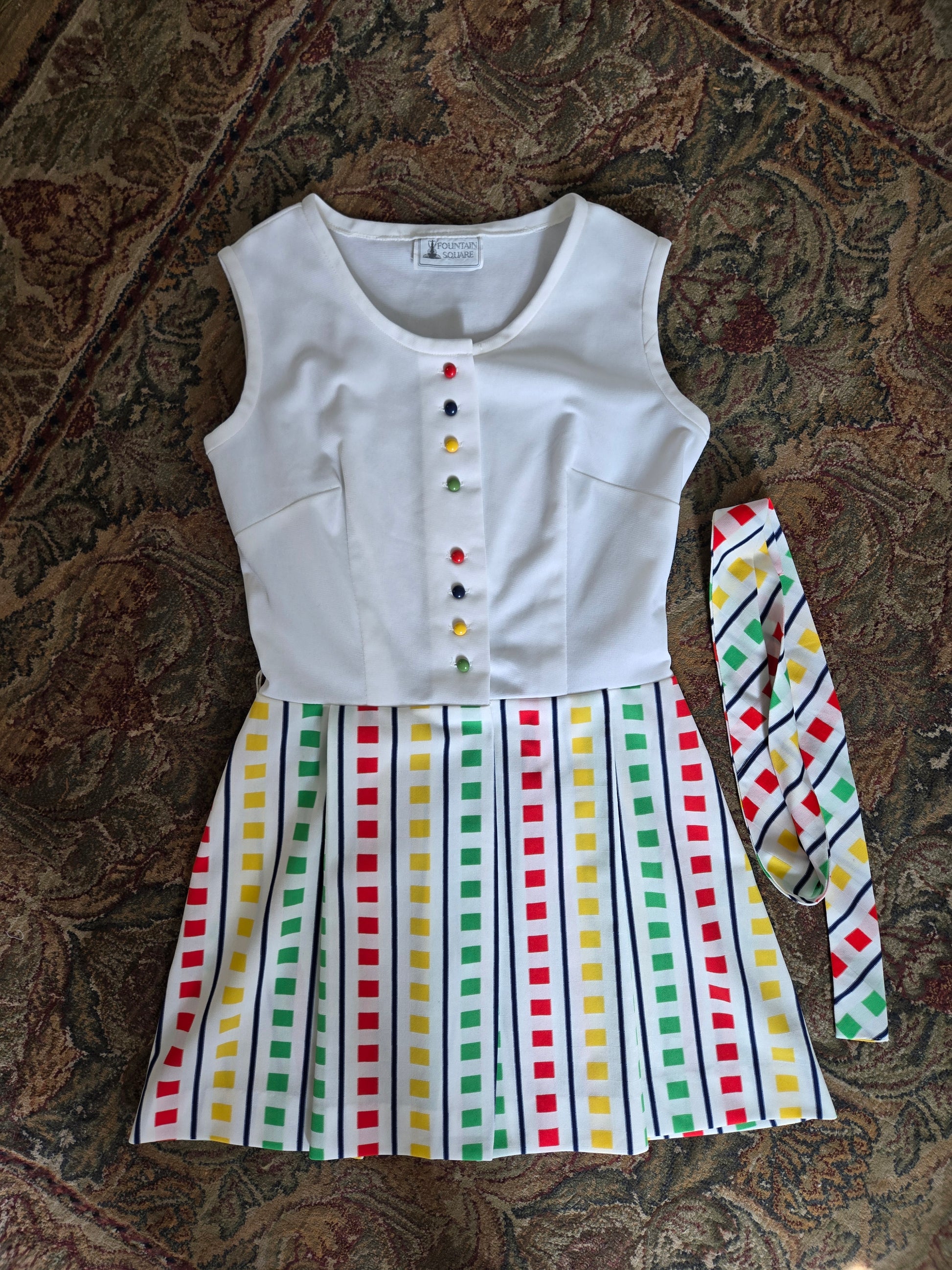 Fountain Square vintage 70s little stop light inspired sleeveless dress. It buttons down the front of the top and then is one with a slight wrap around from the waist down. It has a matching waist belt that is removable. It has been washed and ready to wear, and is in amazing condition with no imperfections to note.