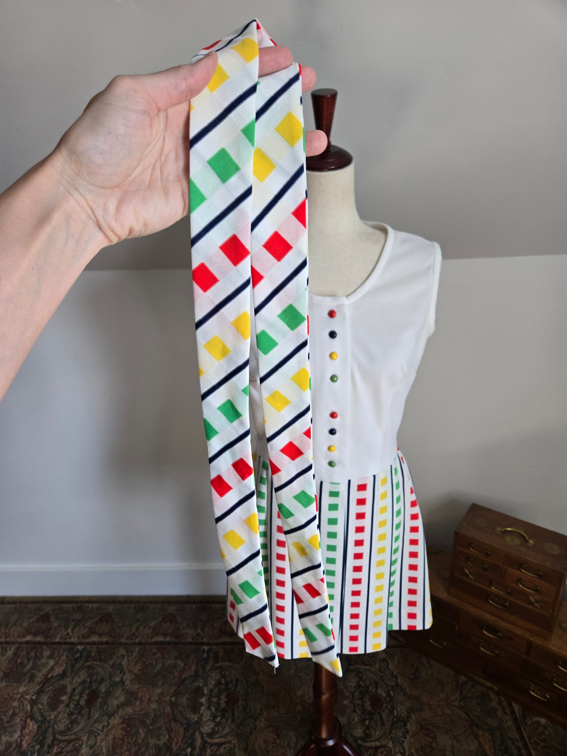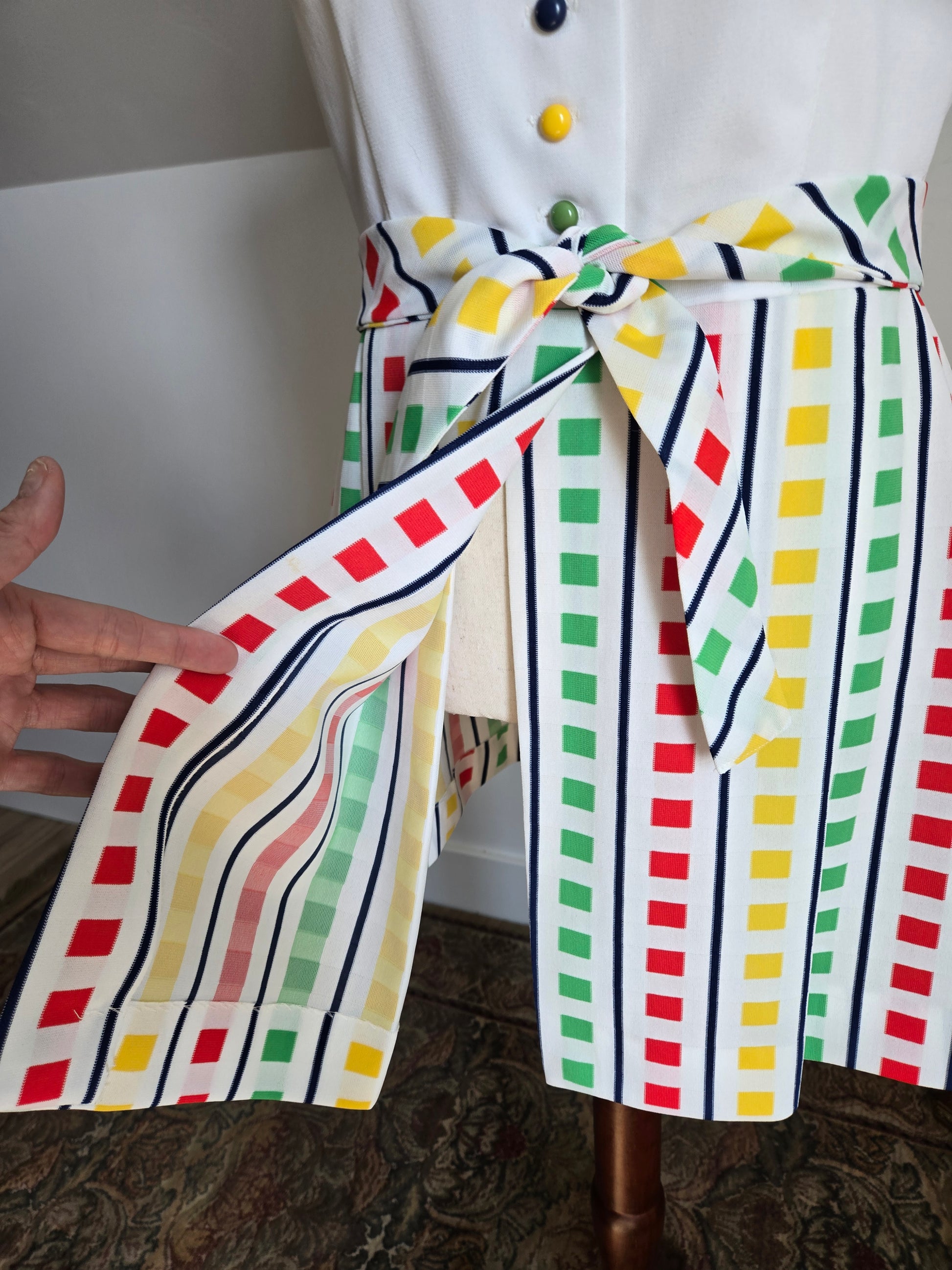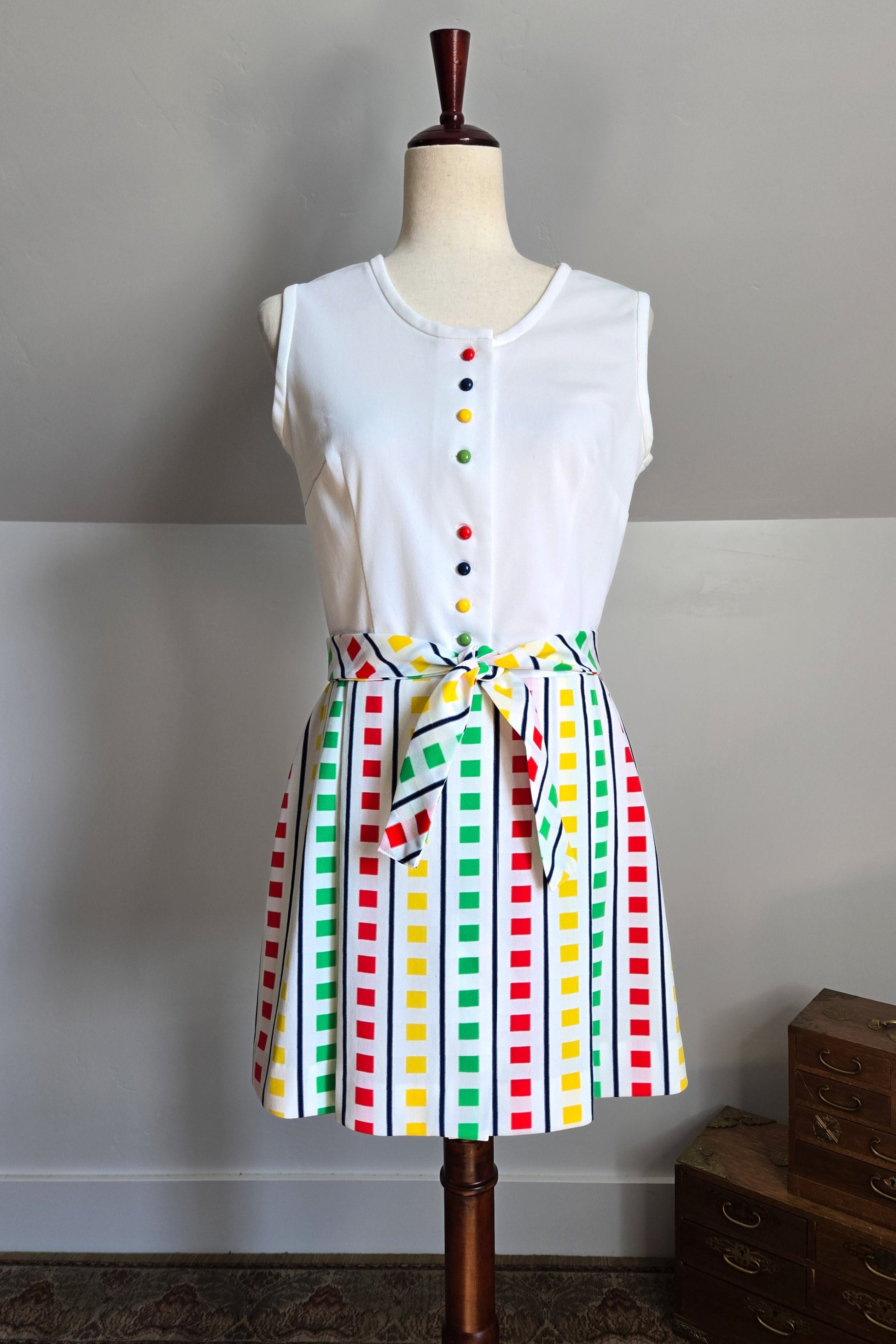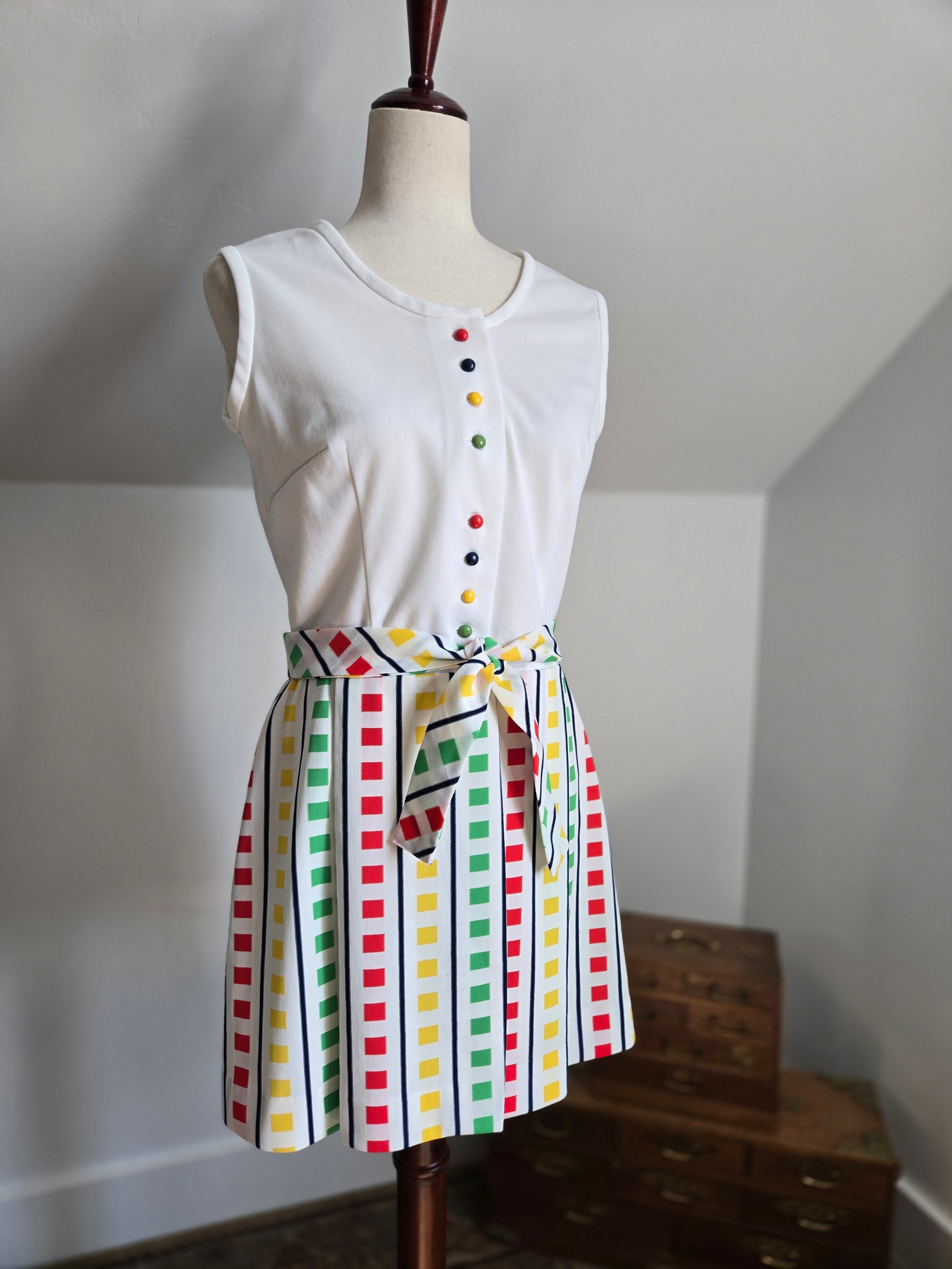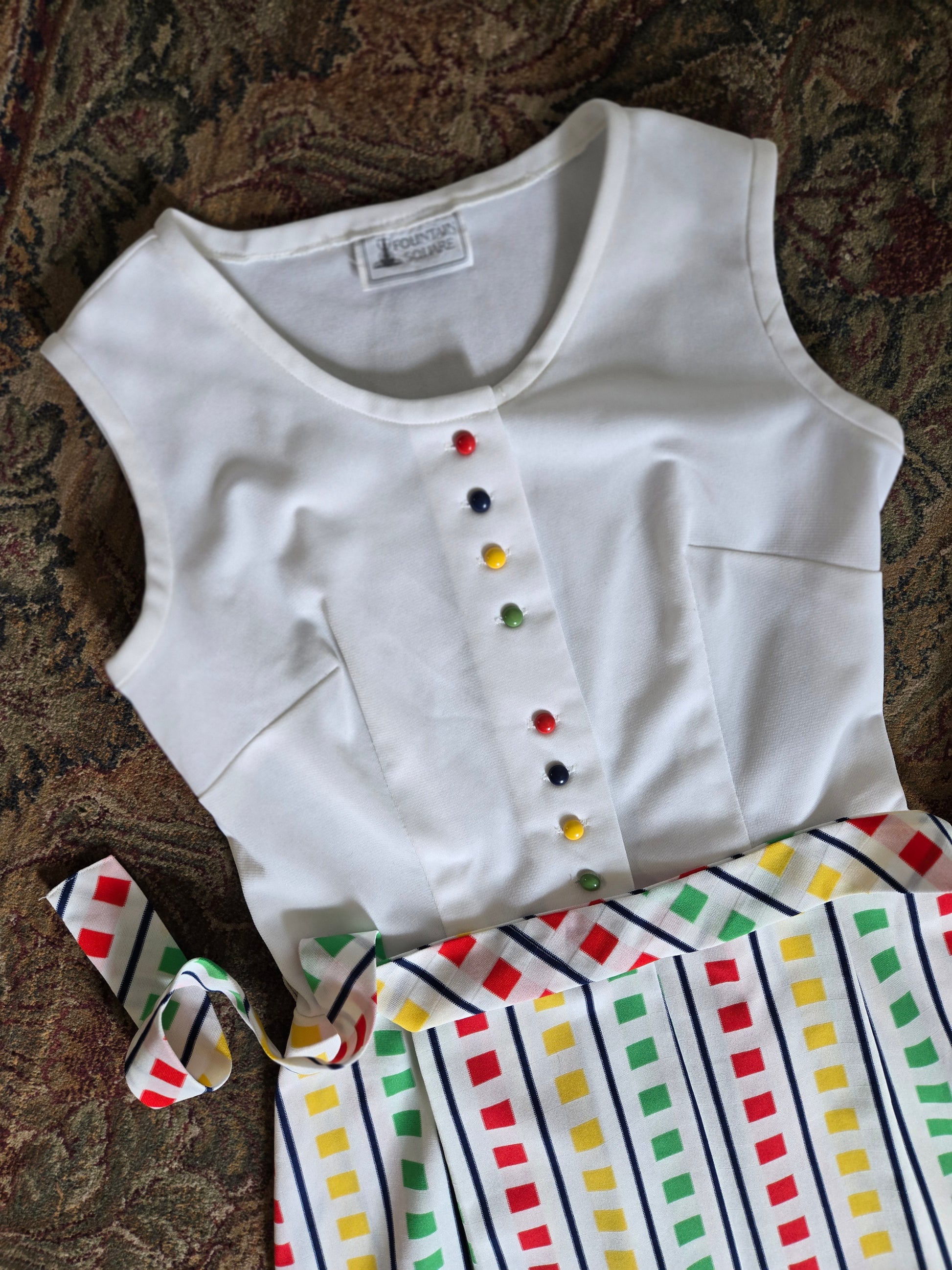 Fountain Square vintage 70s little stop light inspired sleeveless dress. It buttons down the front of the top and then is one with a slight wrap around from the waist down. It has a matching waist belt that is removable. It has been washed and ready to wear, and is in amazing condition with no imperfections to note.