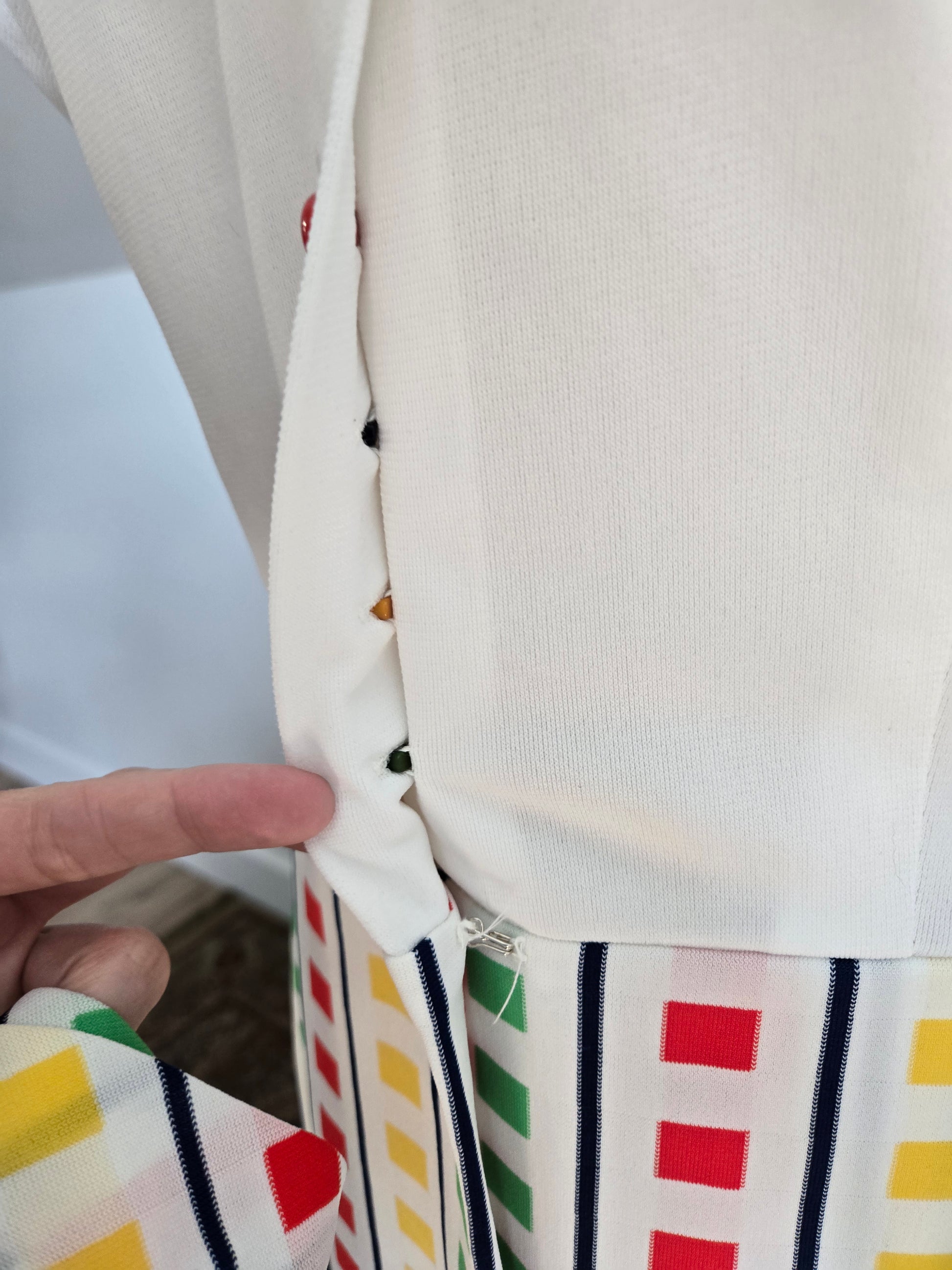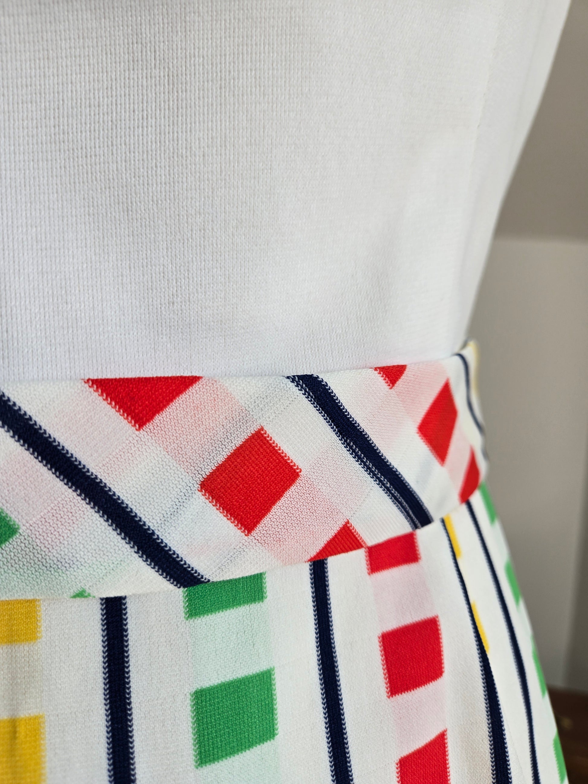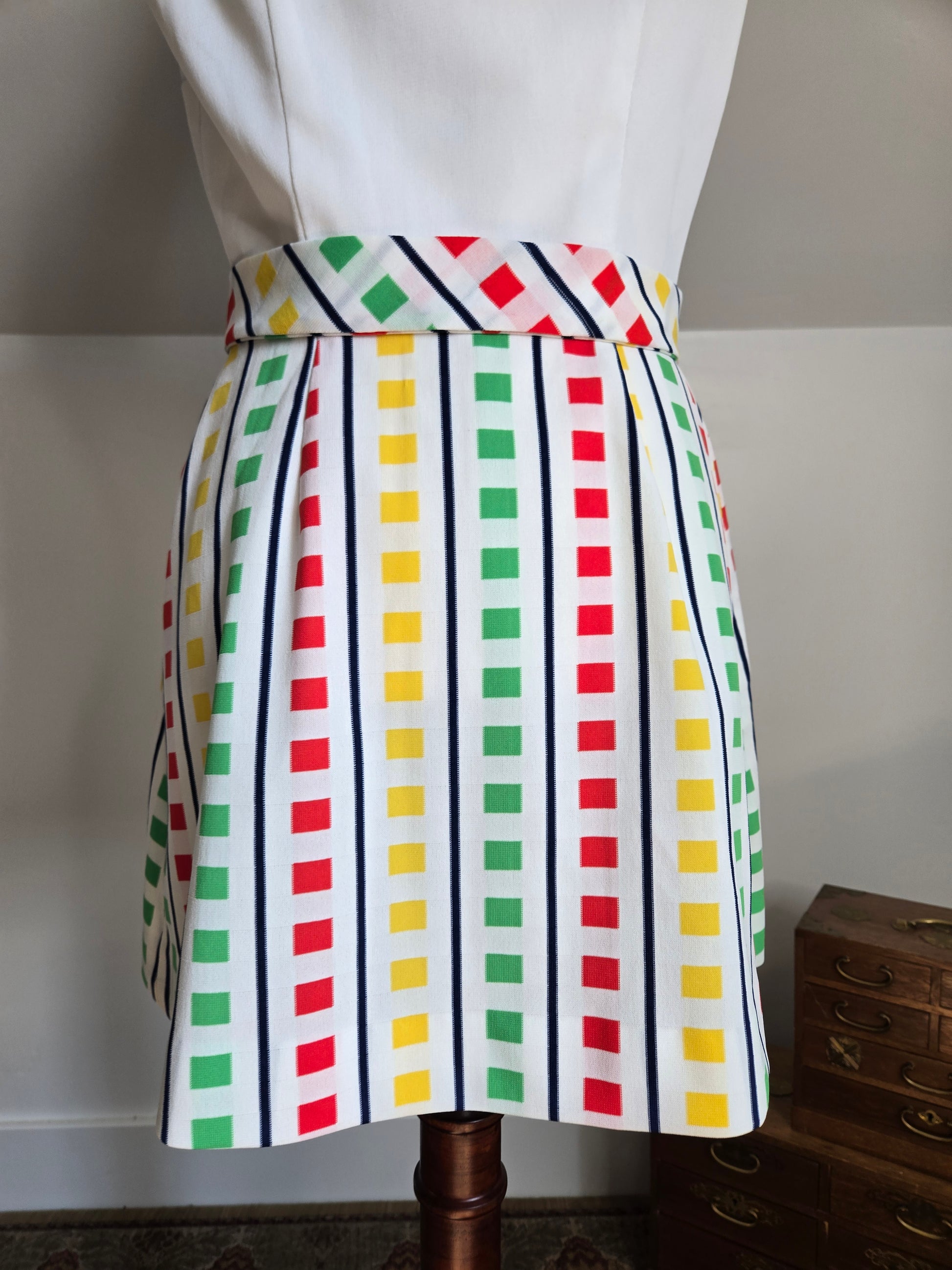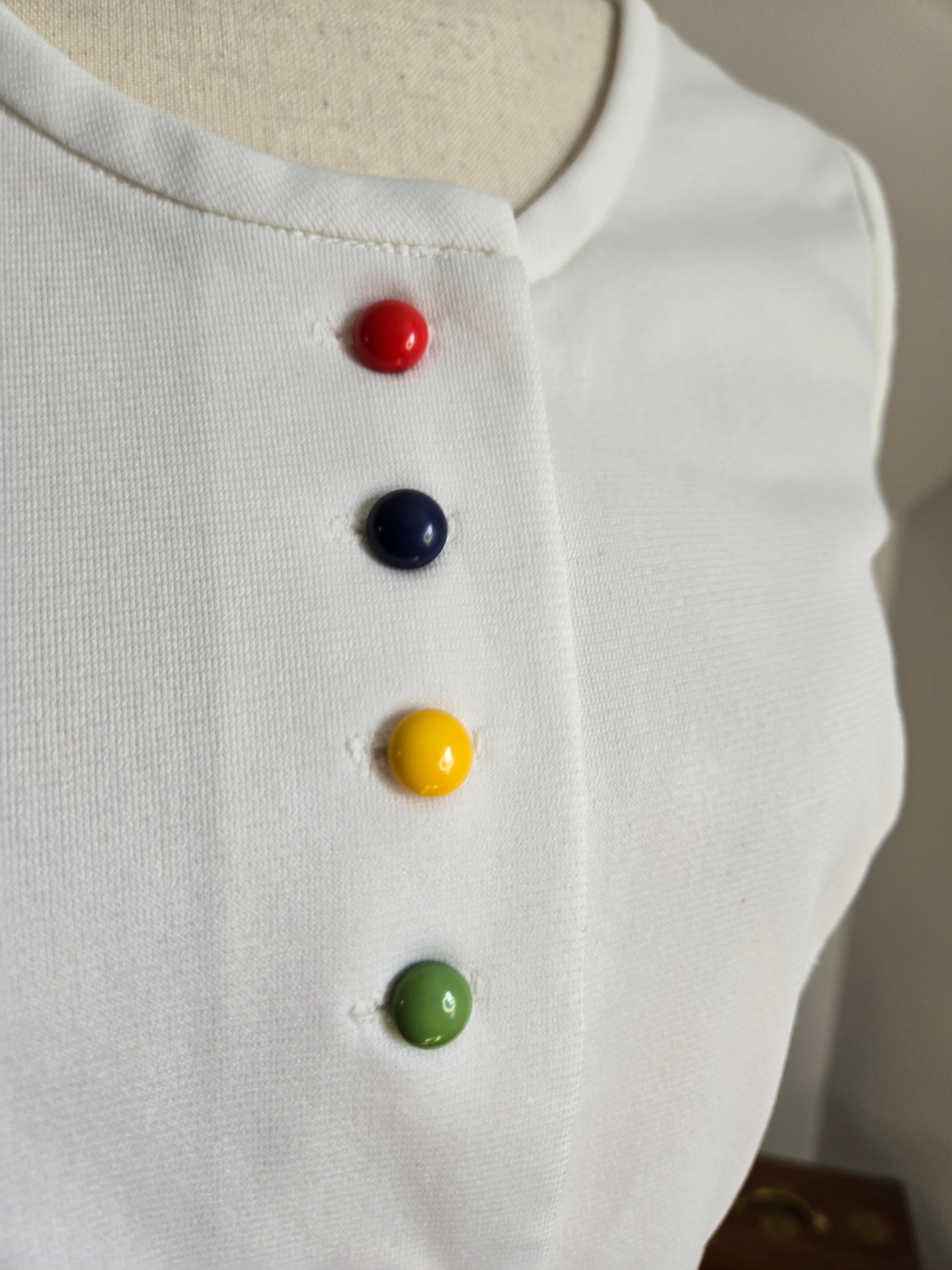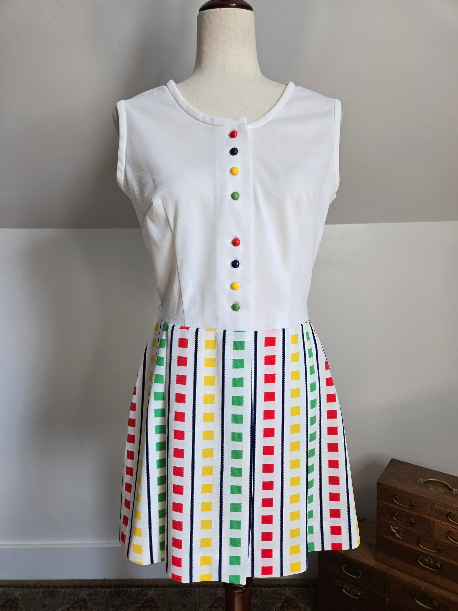 Fountain Square vintage 70s little stop light inspired sleeveless dress. It buttons down the front of the top and then is one with a slight wrap around from the waist down. It has a matching waist belt that is removable. It has been washed and ready to wear, and is in amazing condition with no imperfections to note.