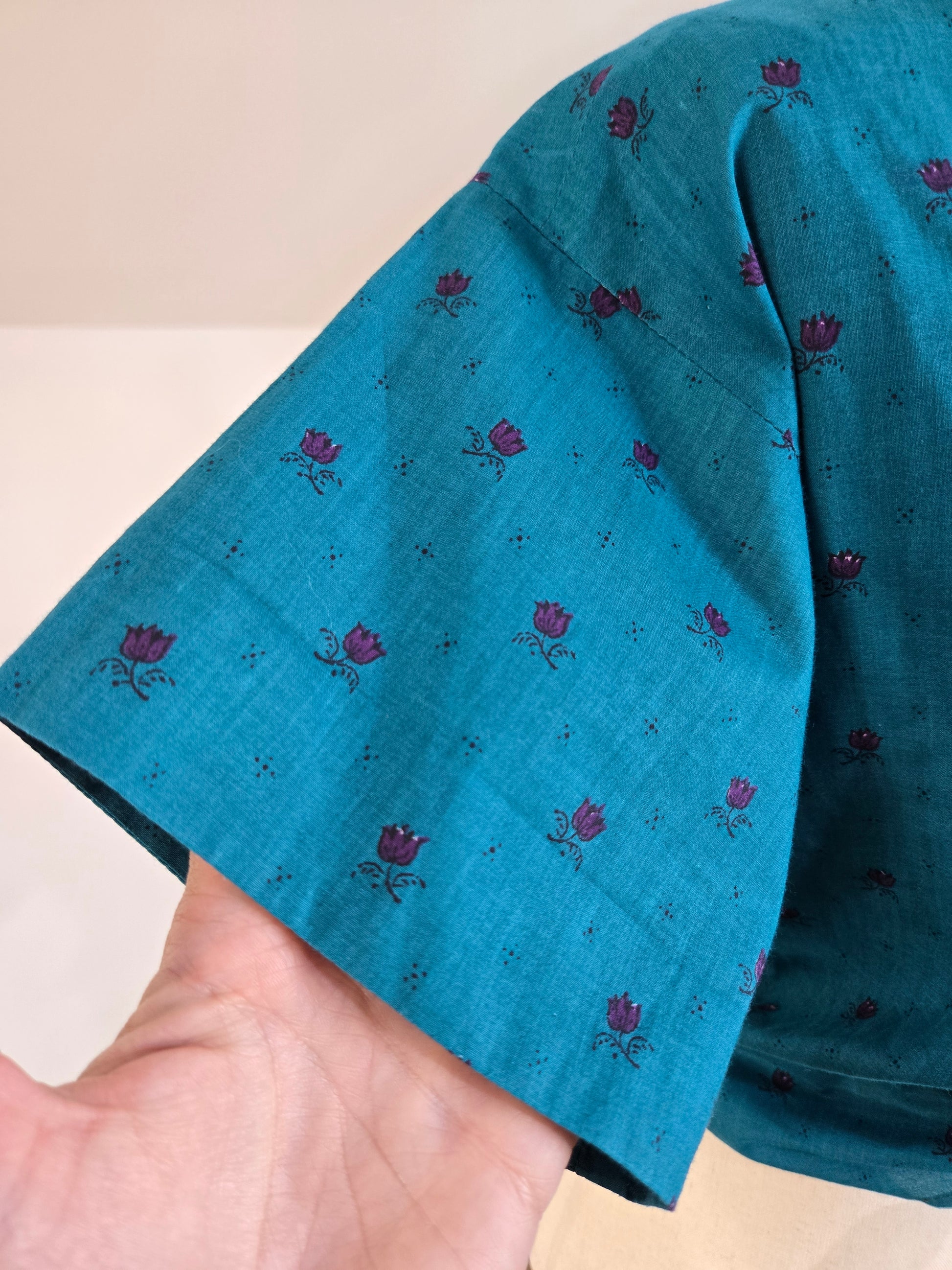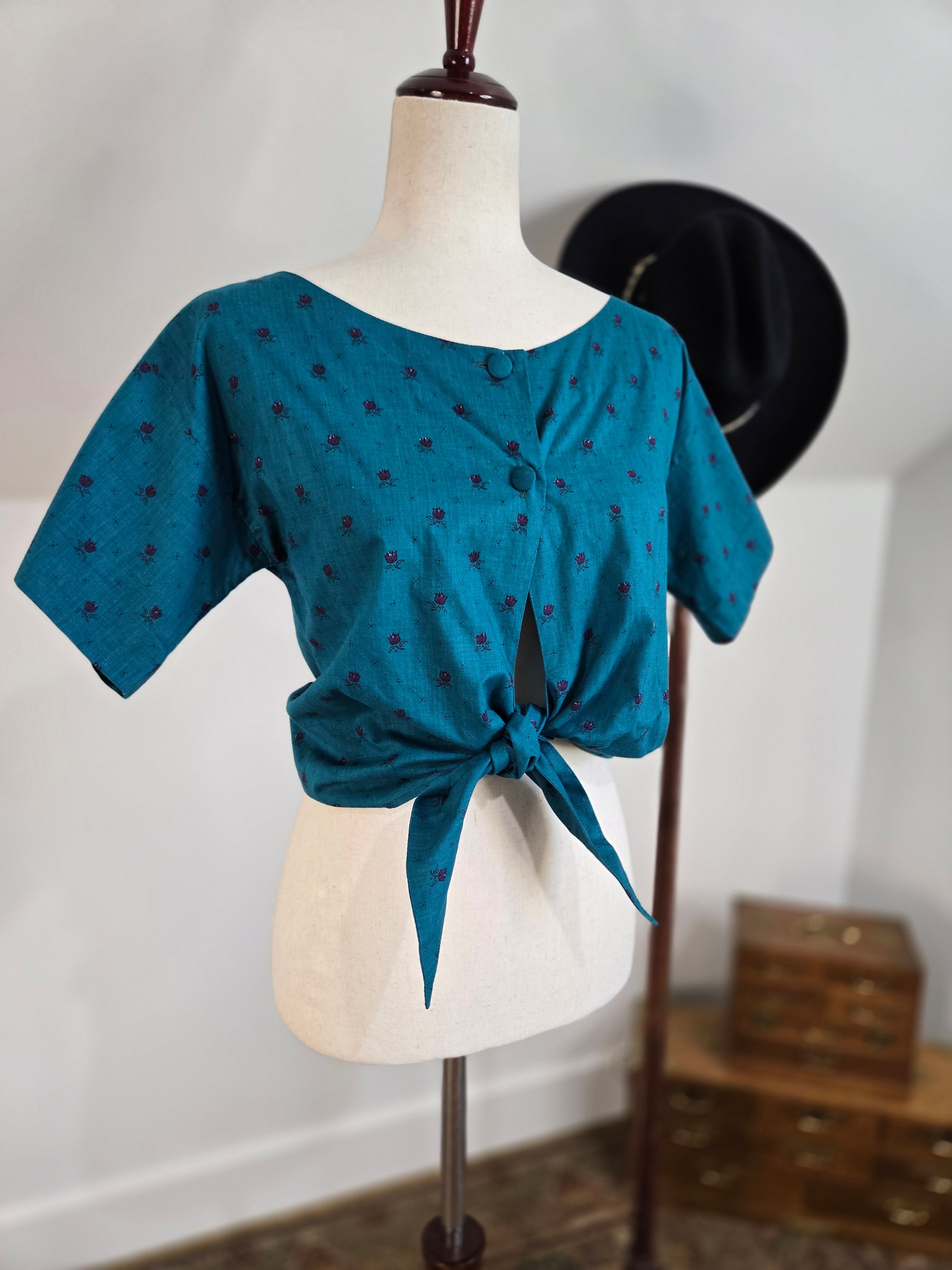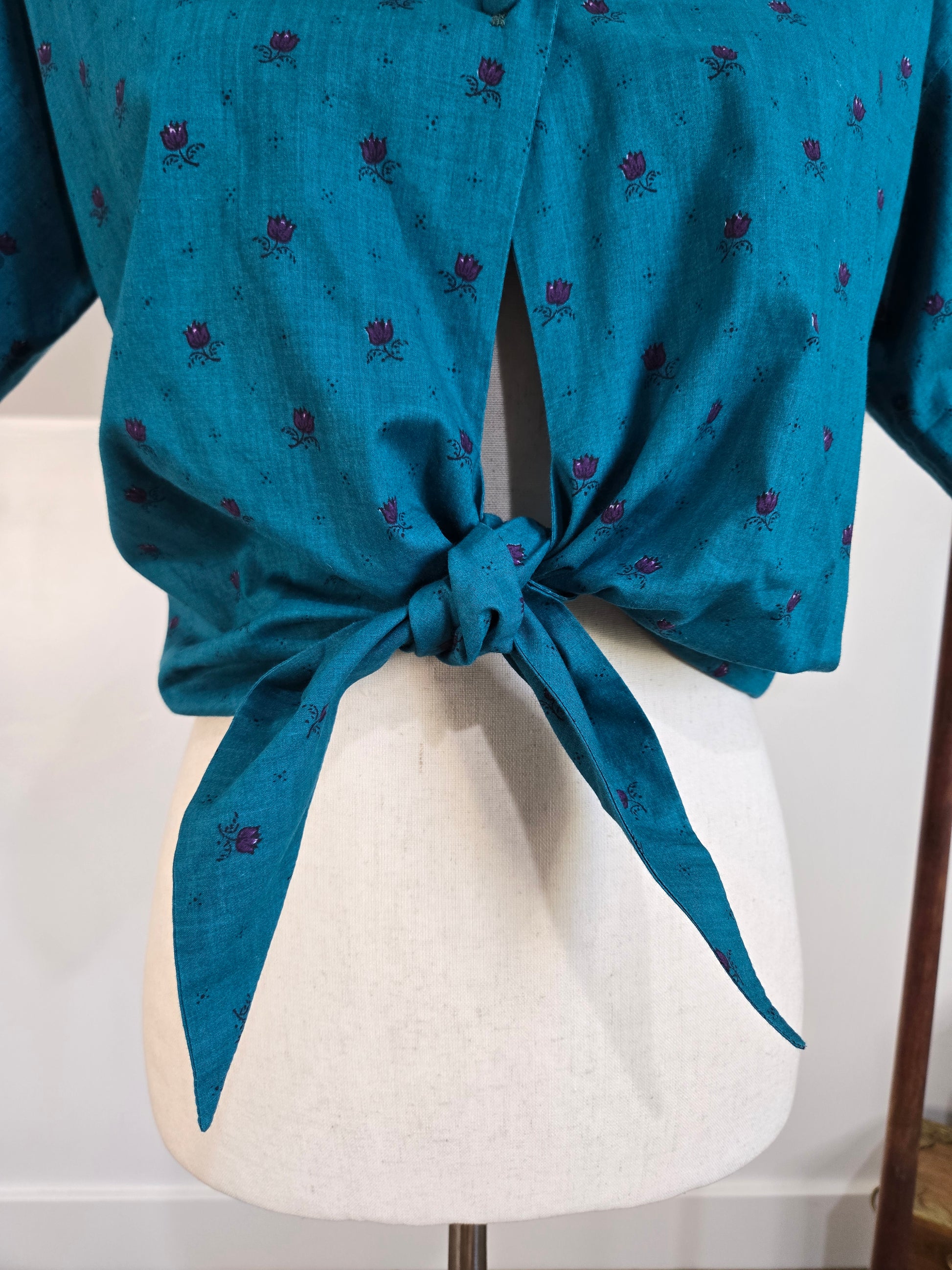 Charles Demery vintage luxury french designer cotton crop top in a deep teal color with small purple florals. Buttons and ties in the front in a true crop style. Perfect condition, rare piece. Based on research, I believe this one is from the 1970s, even though there is a long history to this designer.
