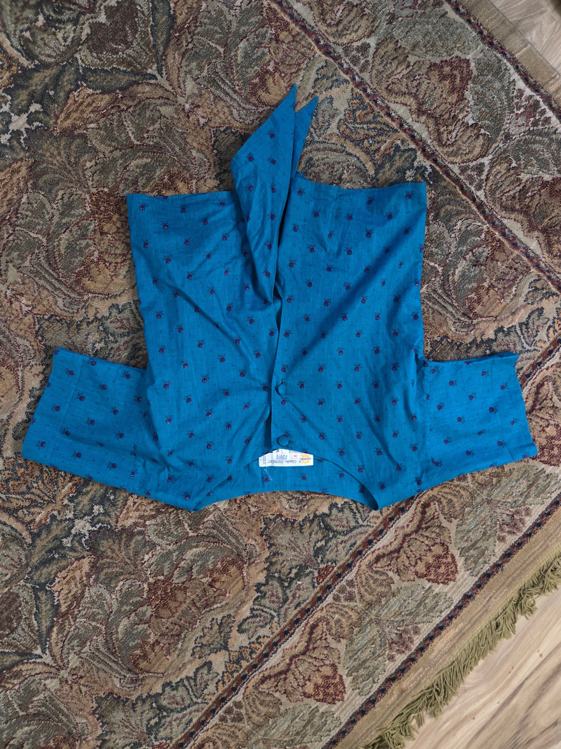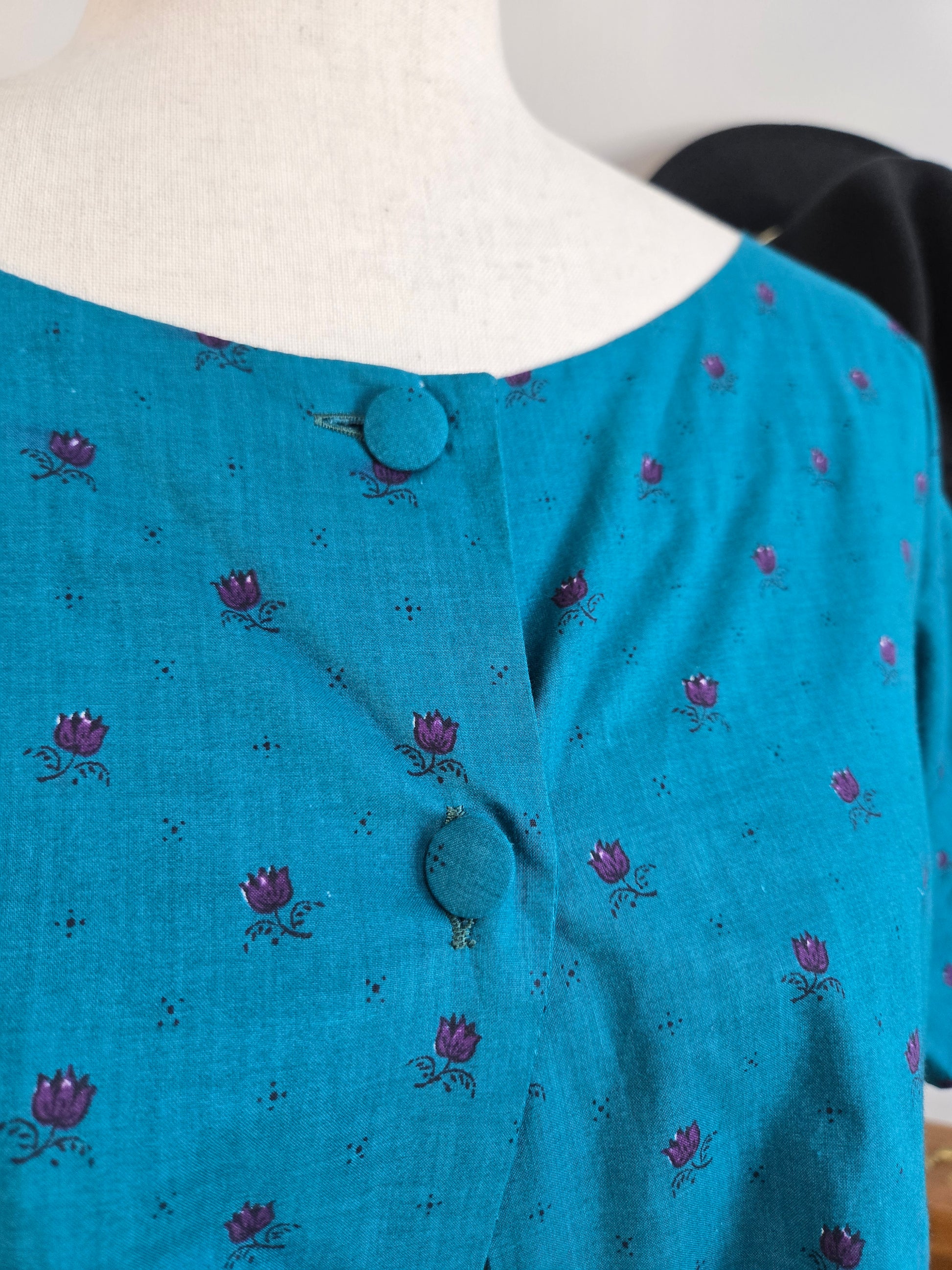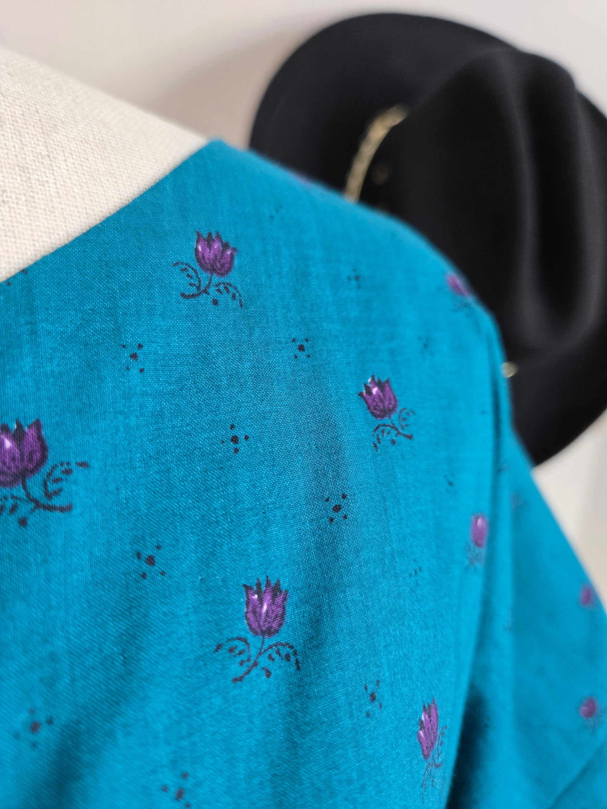 Charles Demery vintage luxury french designer cotton crop top in a deep teal color with small purple florals. Buttons and ties in the front in a true crop style. Perfect condition, rare piece. Based on research, I believe this one is from the 1970s, even though there is a long history to this designer.