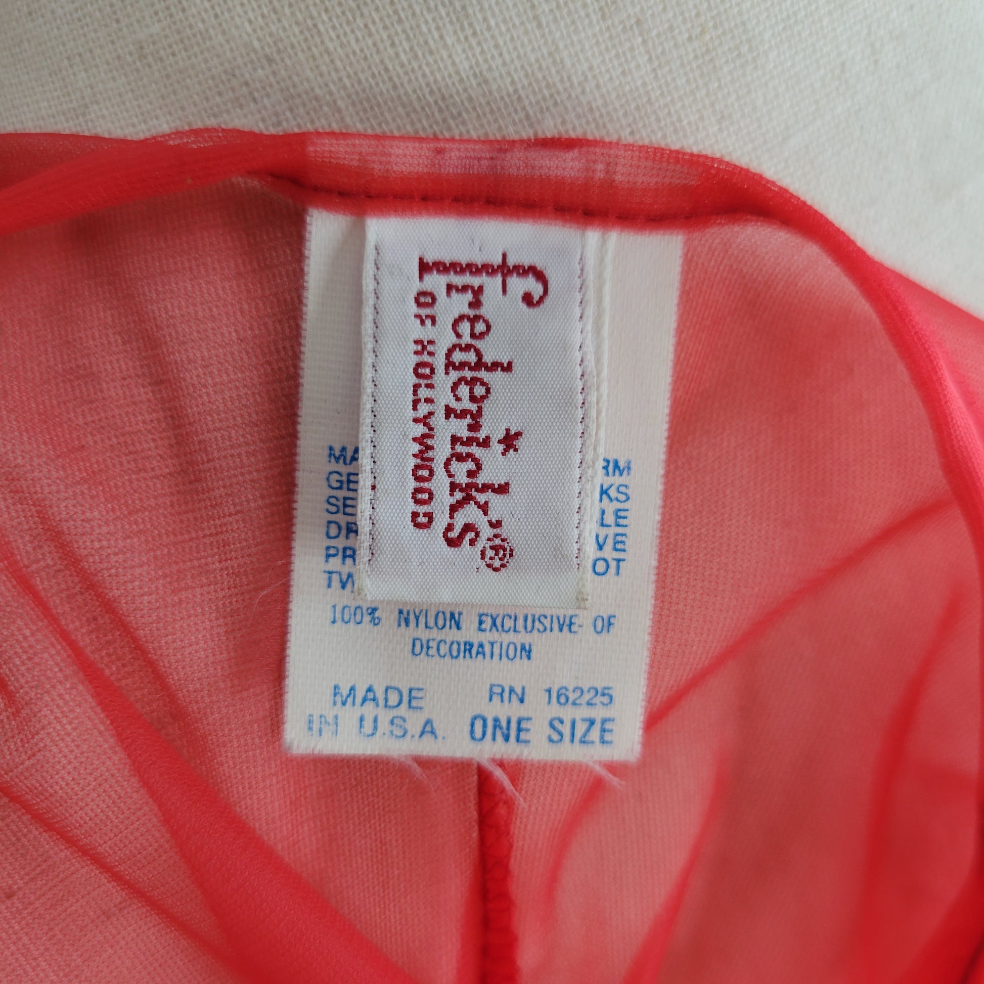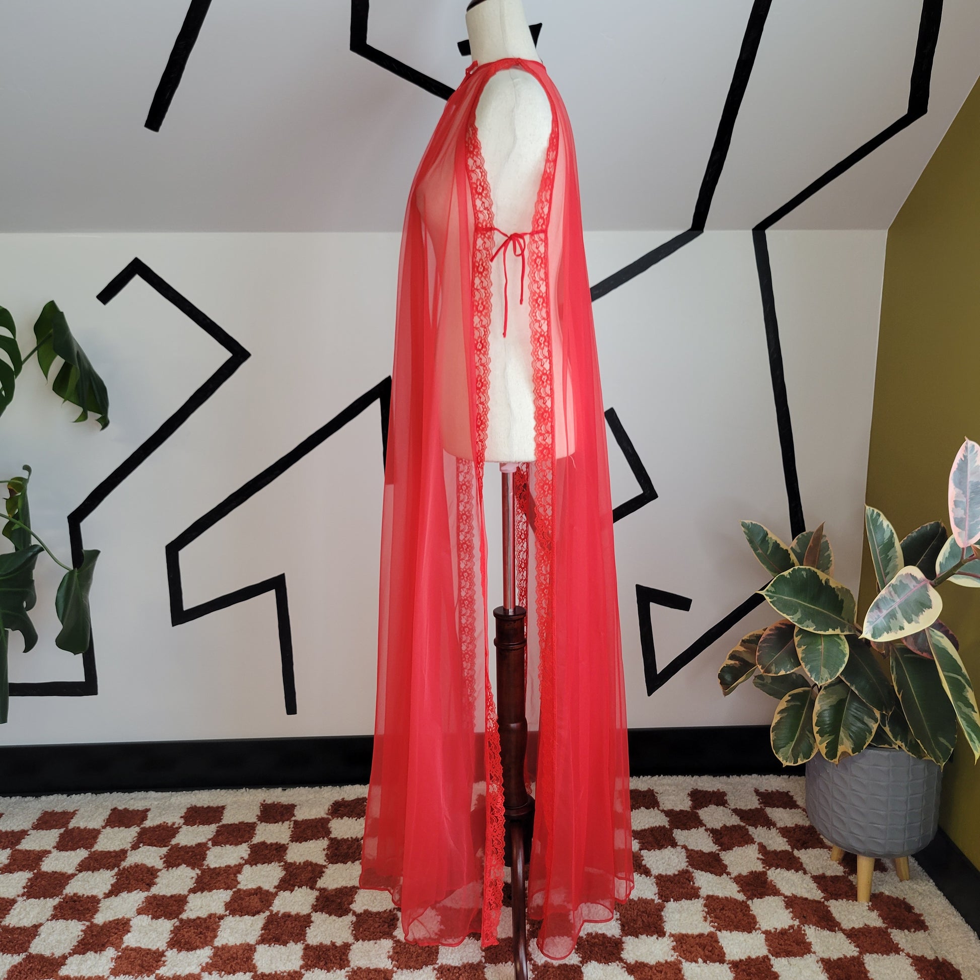 Vintage Fredrick's of Hollywood bright red sheer open side dress. It has a high cut neckline that ties in the center and lace detail that runs all the way from the collarbone to the floor, and then ties again at the side to create an armhole. Whether it is worn as lingerie or as a statement piece in a styled outfit, this piece is a head turner!! It is in immaculate condition, with no tears, snags, spots, or smells. It is a beauty!!
